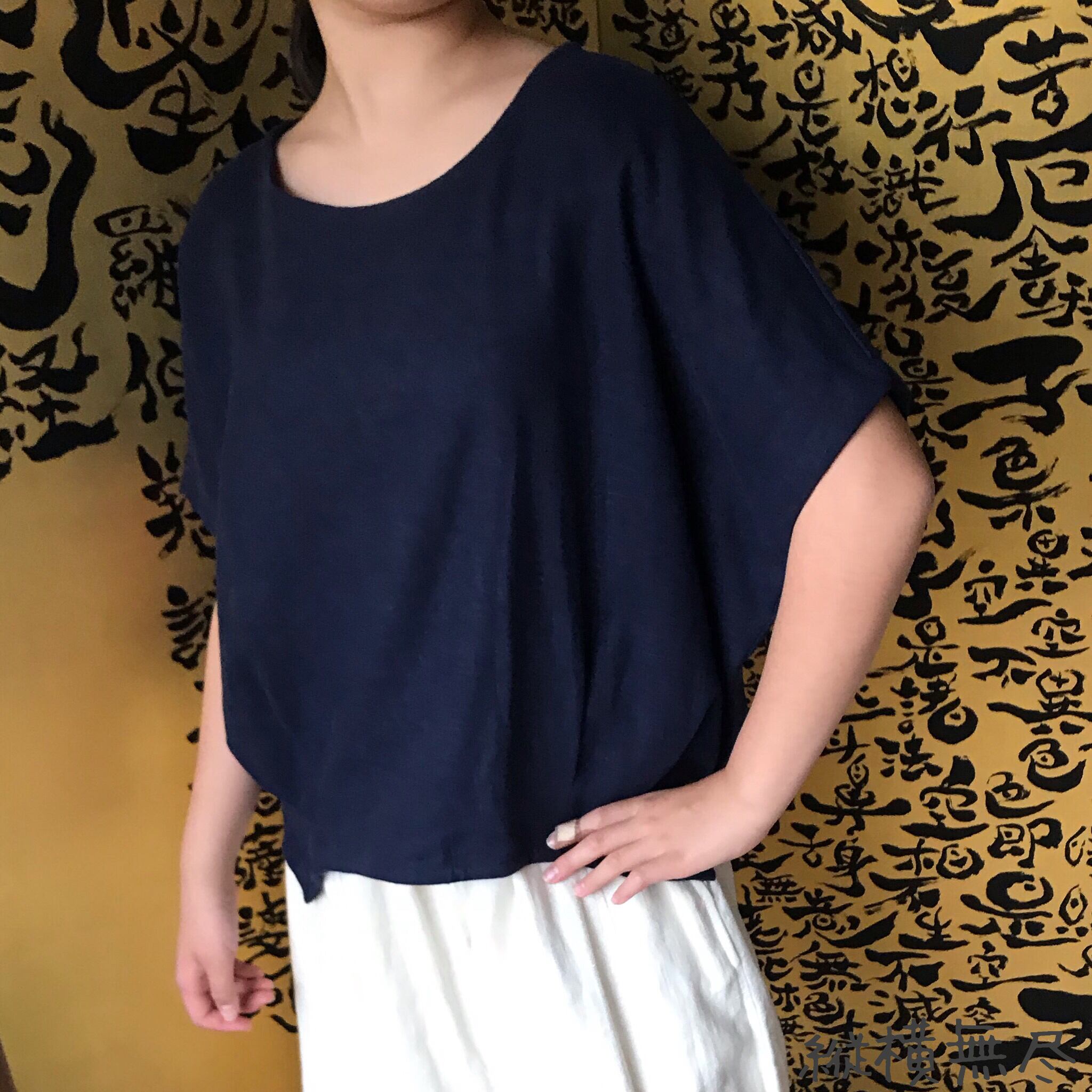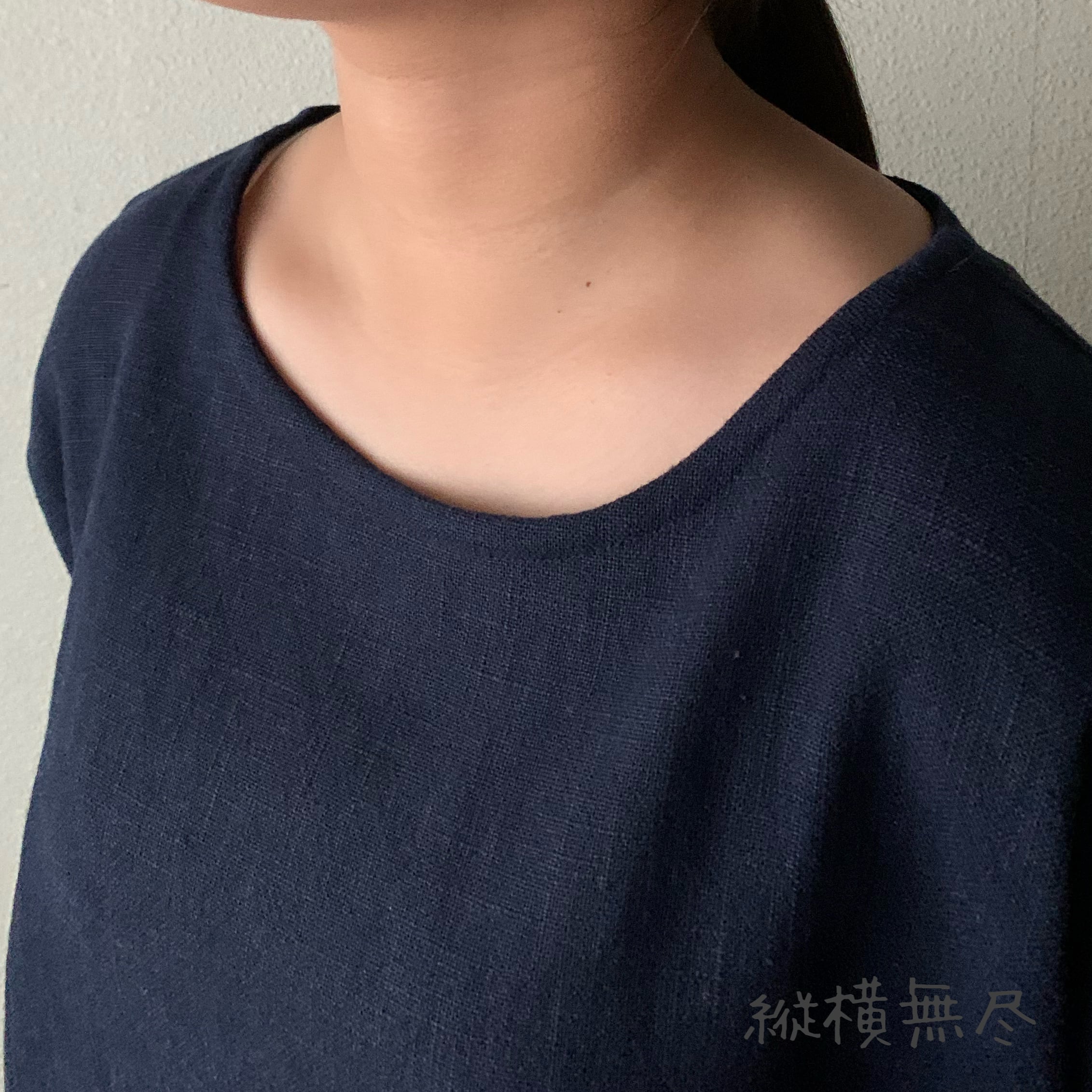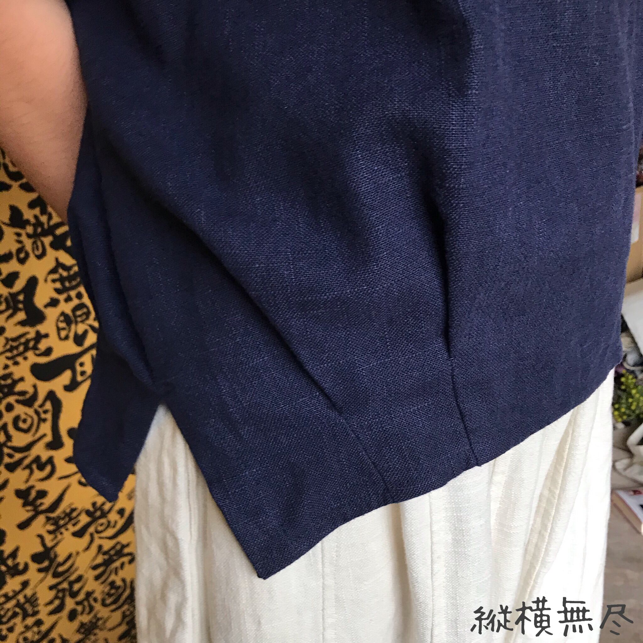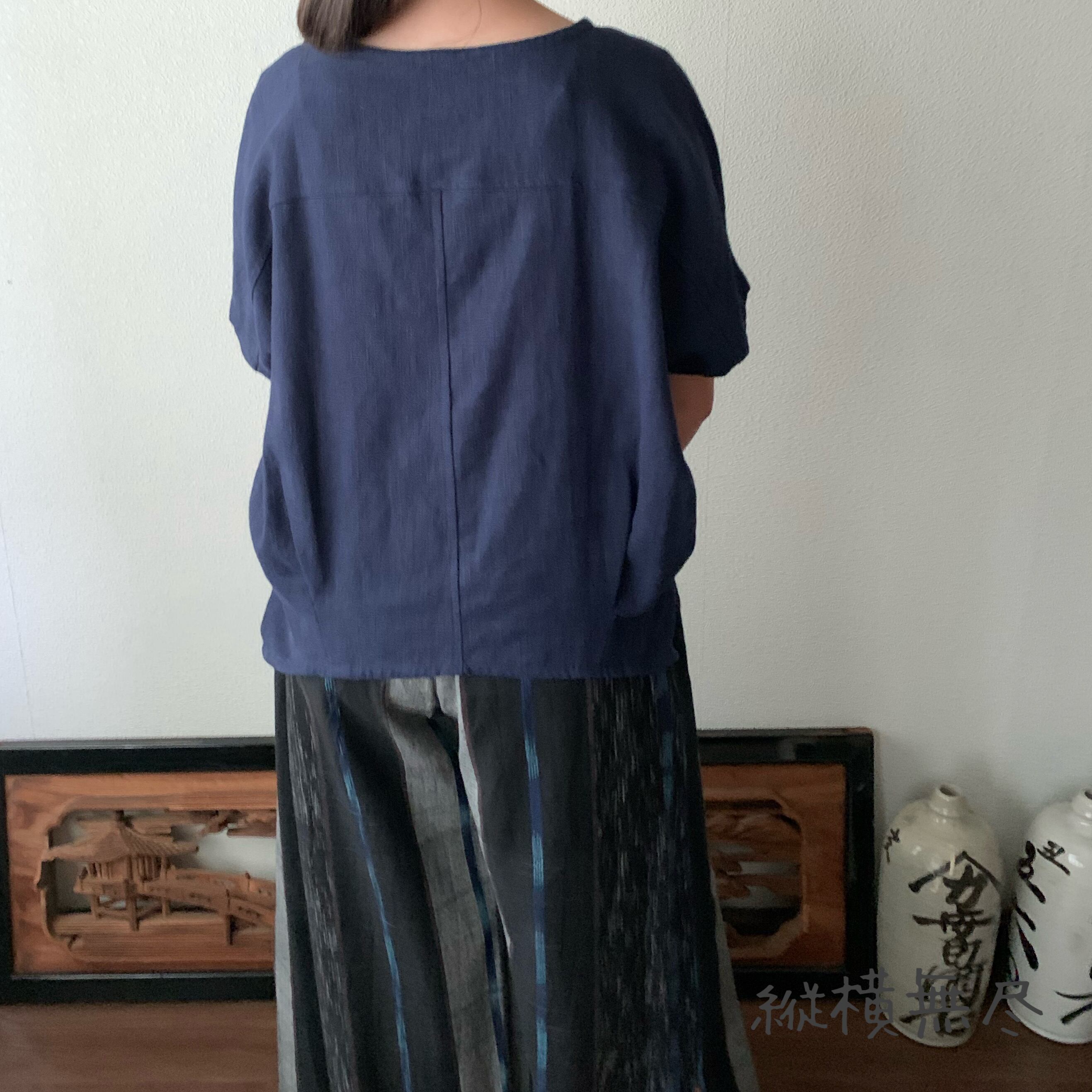 シンプルなラインにみえてドルマン袖、裾カーブ等楽しさいっぱいのヘンプブラウス 紺