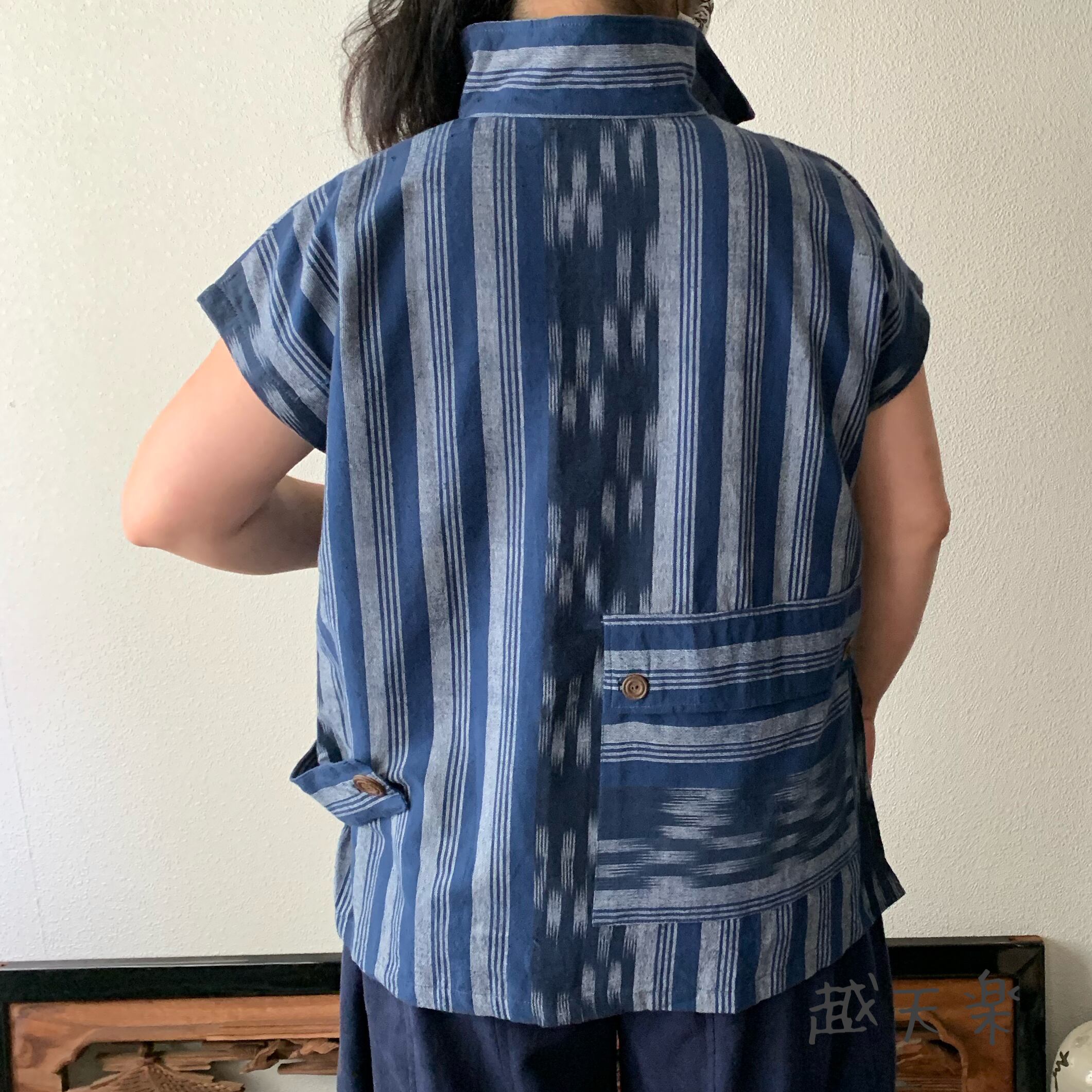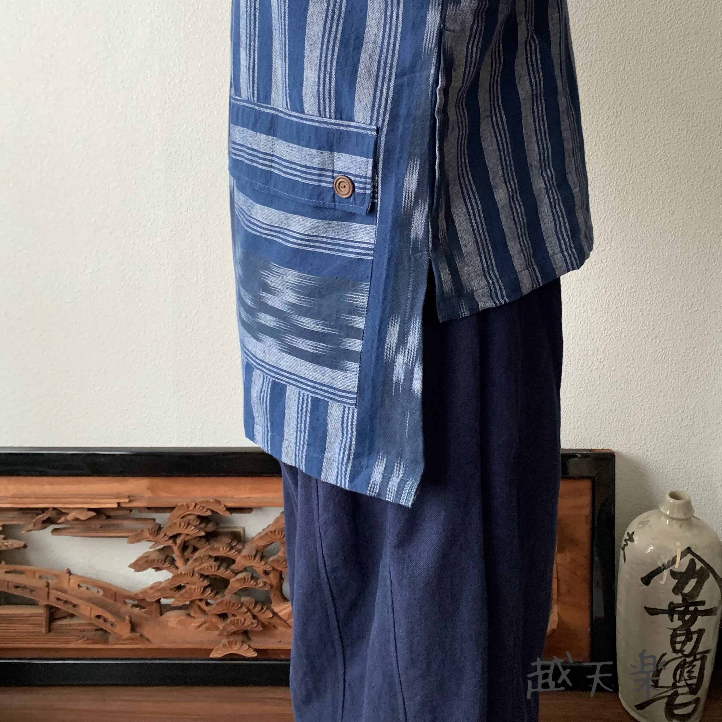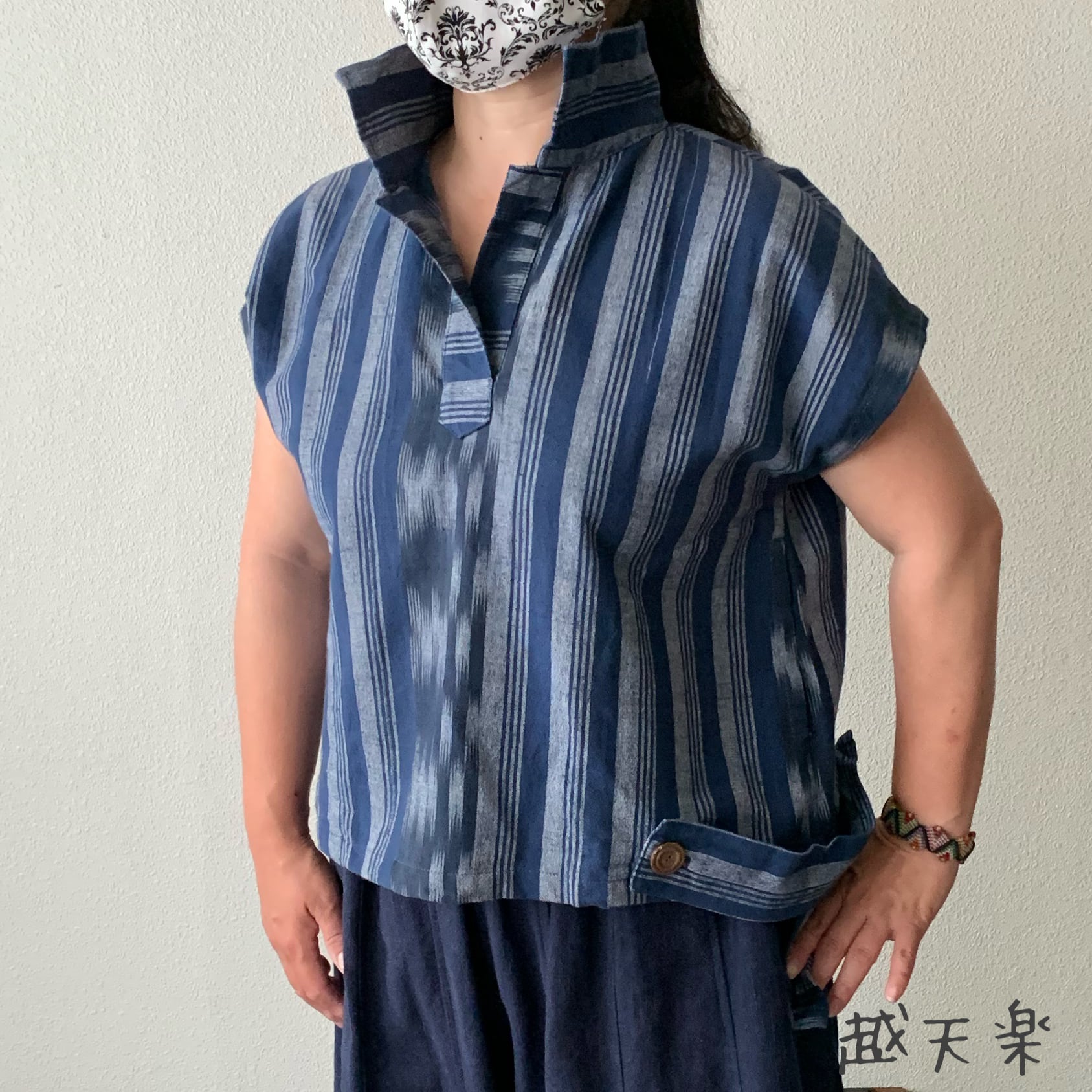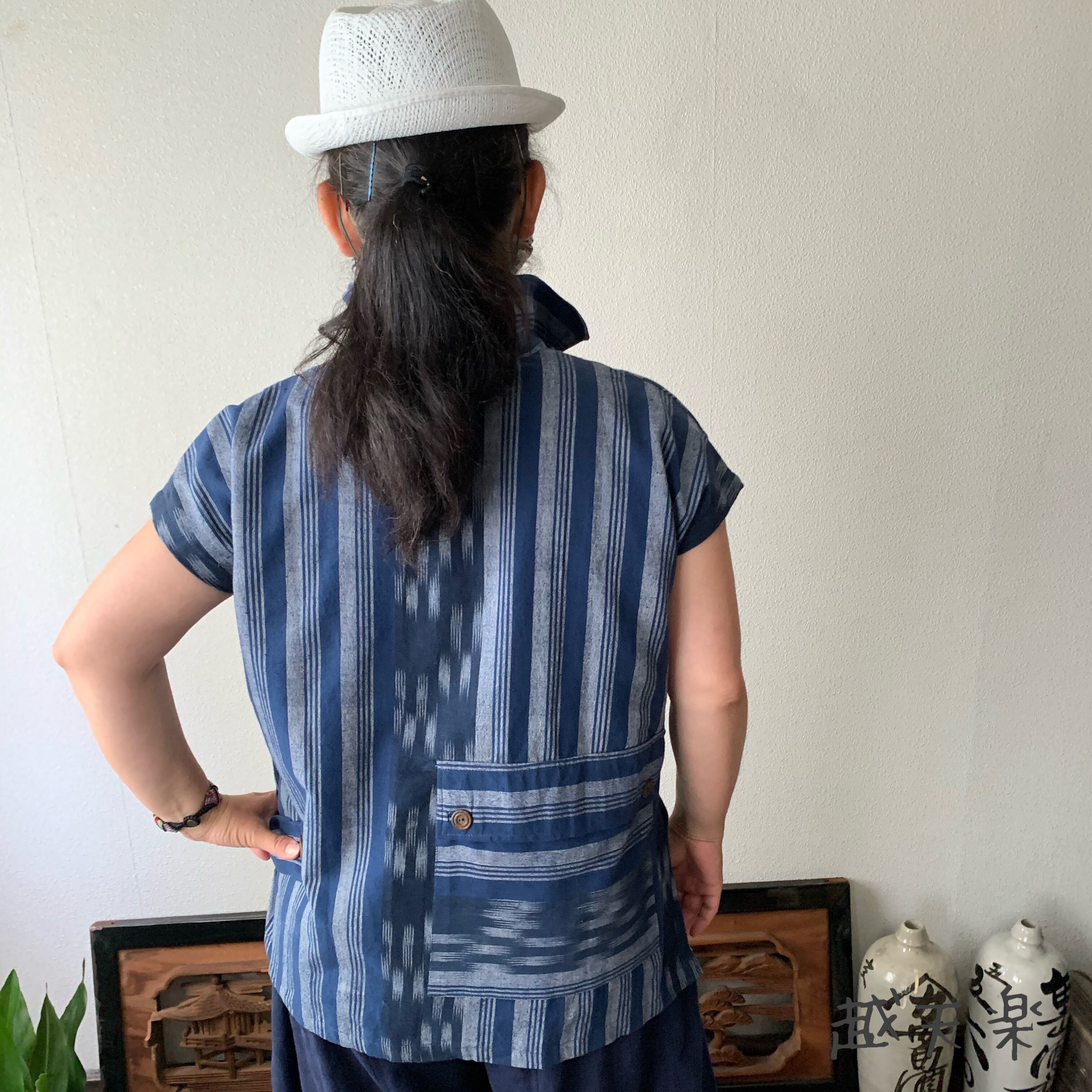 バックテールですっきりみせるハイカラー手織り綿ベストブラウス 後ろ裾のポケットとサイドベルトもアクセントに 青絣