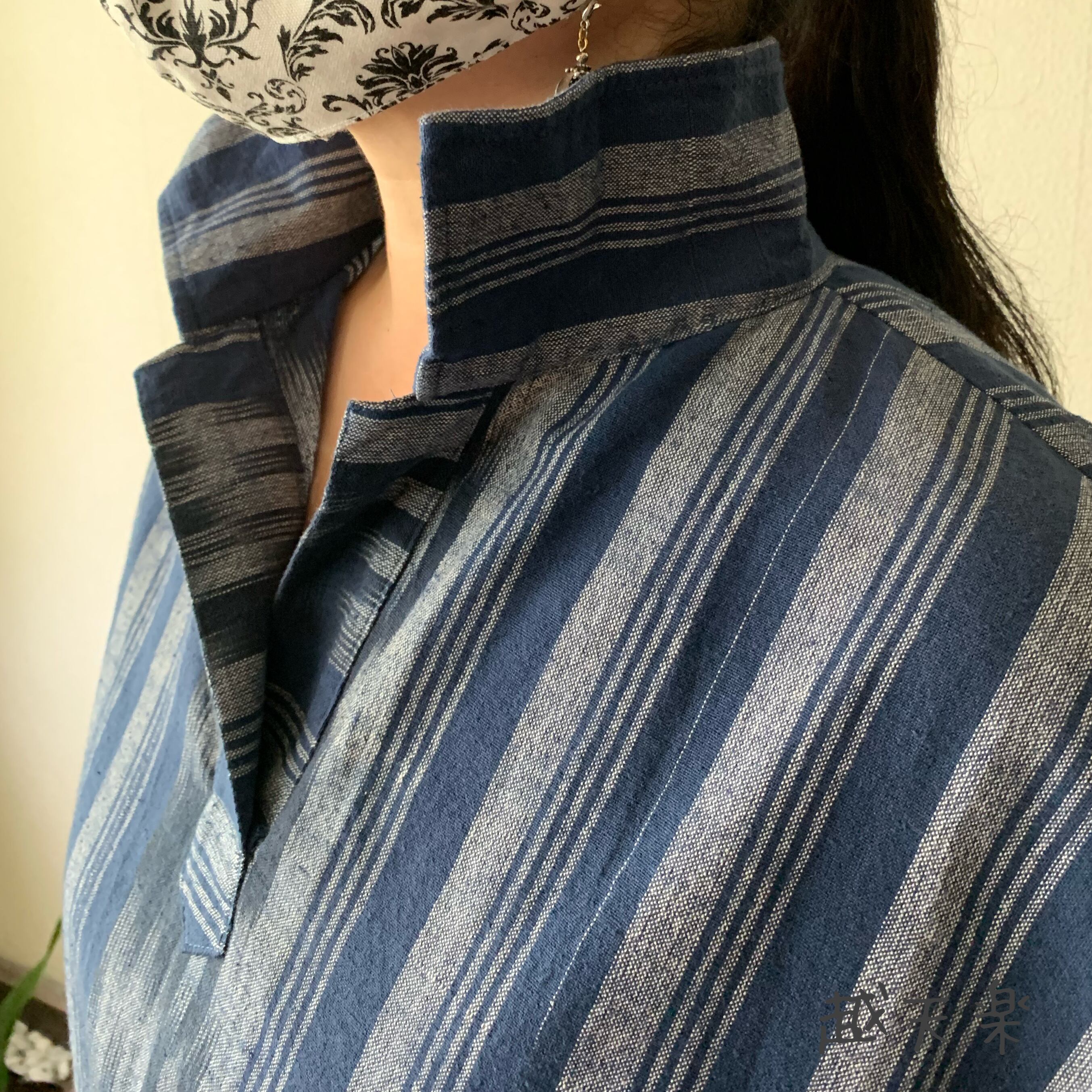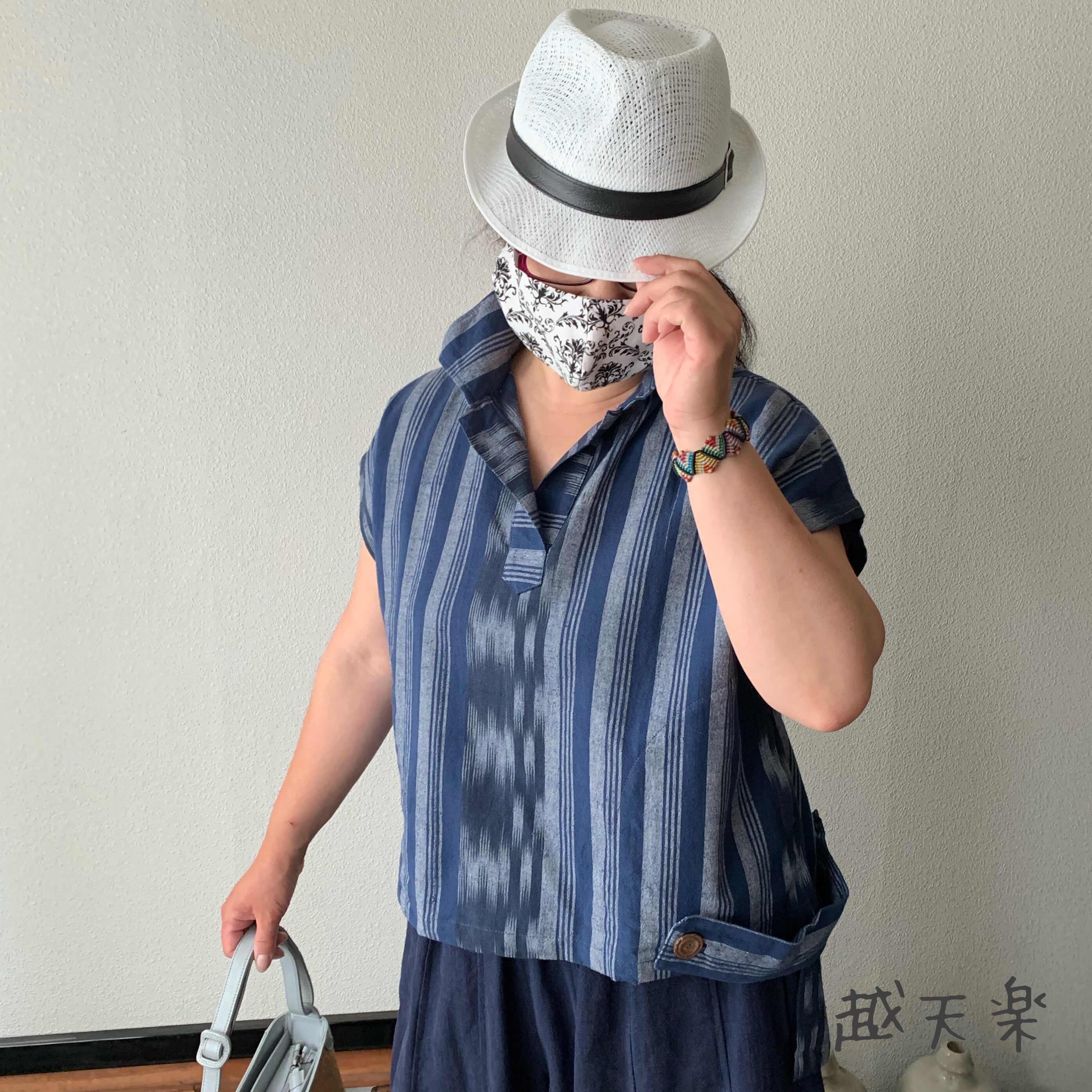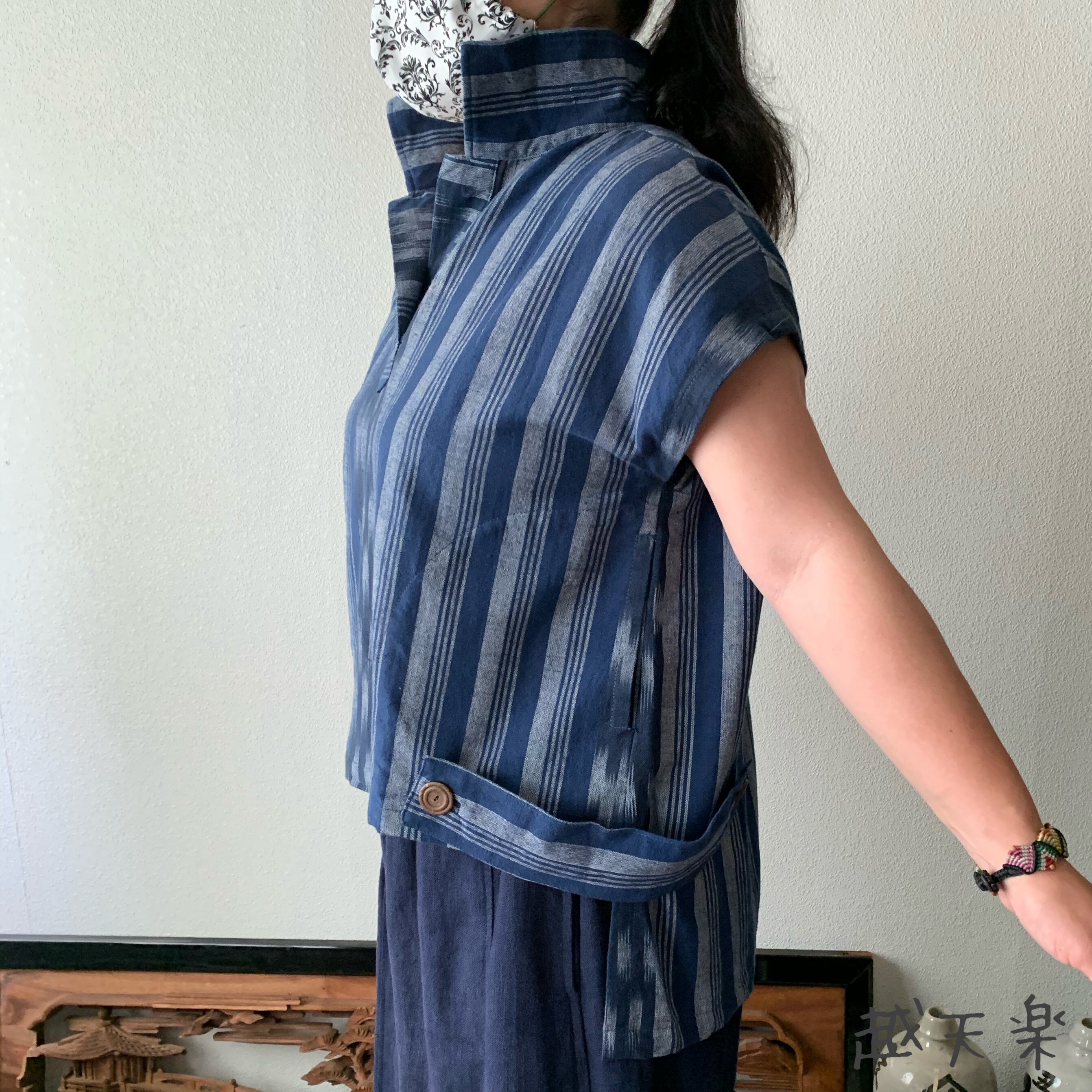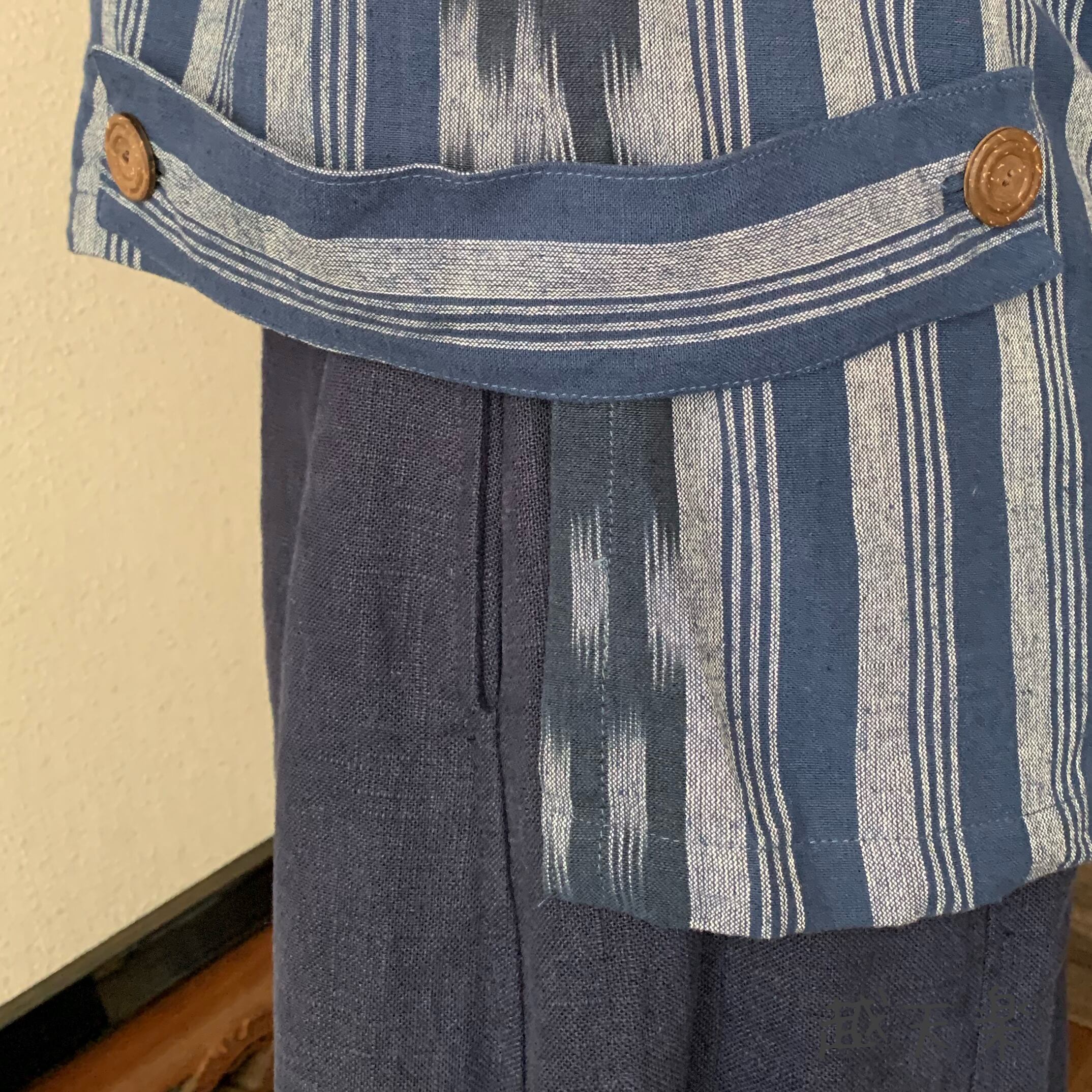バックテールですっきりみせるハイカラー手織り綿ベストブラウス 後ろ裾のポケットとサイドベルトもアクセントに 青絣