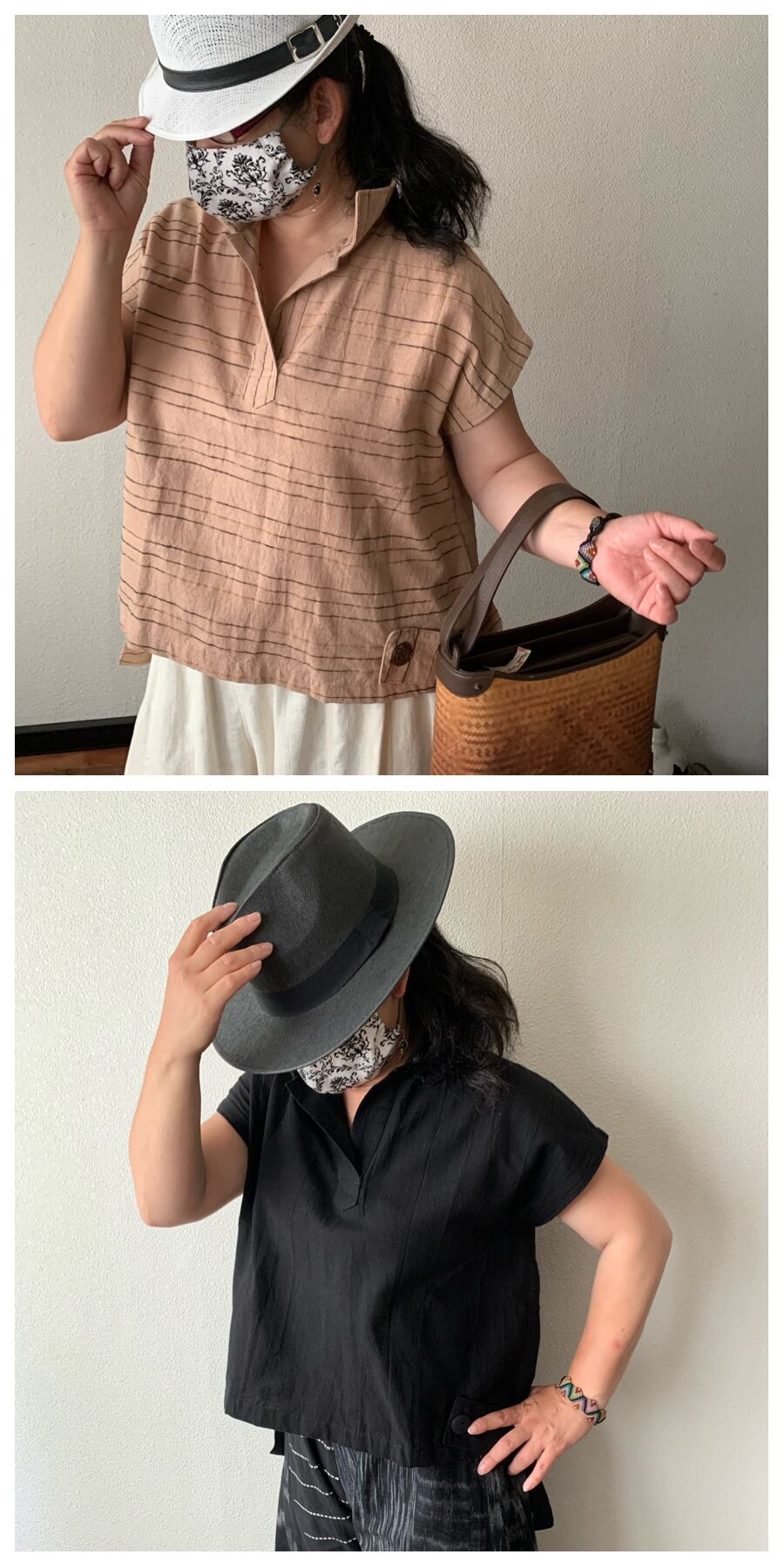 『バックテールですっきりみせるハイカラー手織り綿ベストブラウス 後ろ裾のポケットとサイドベルトもアクセントに』