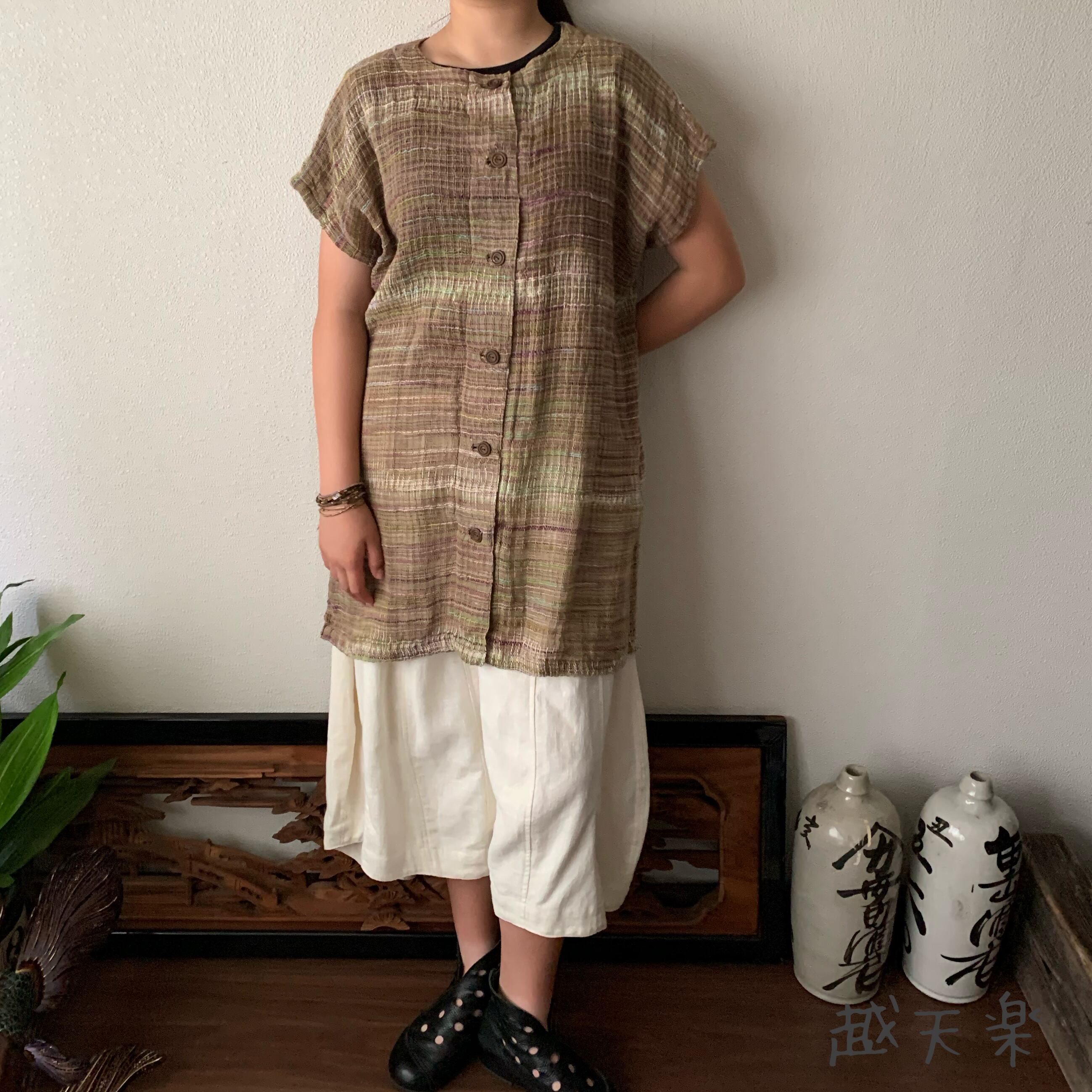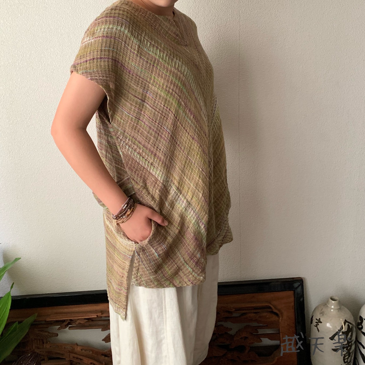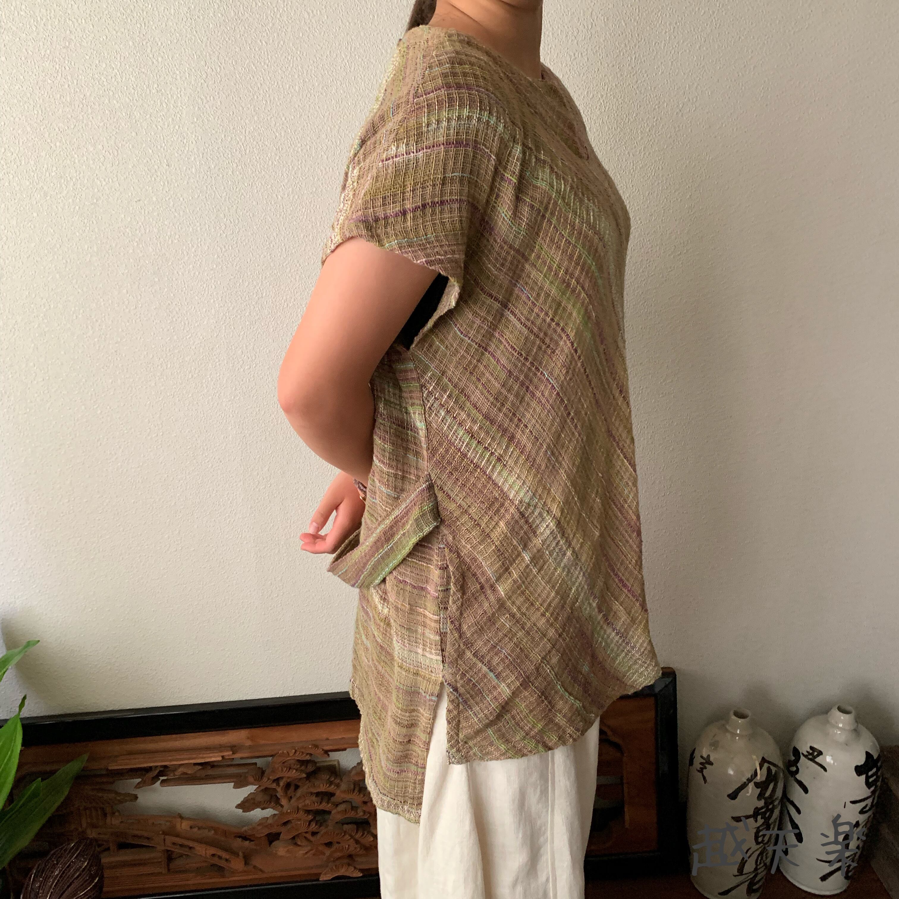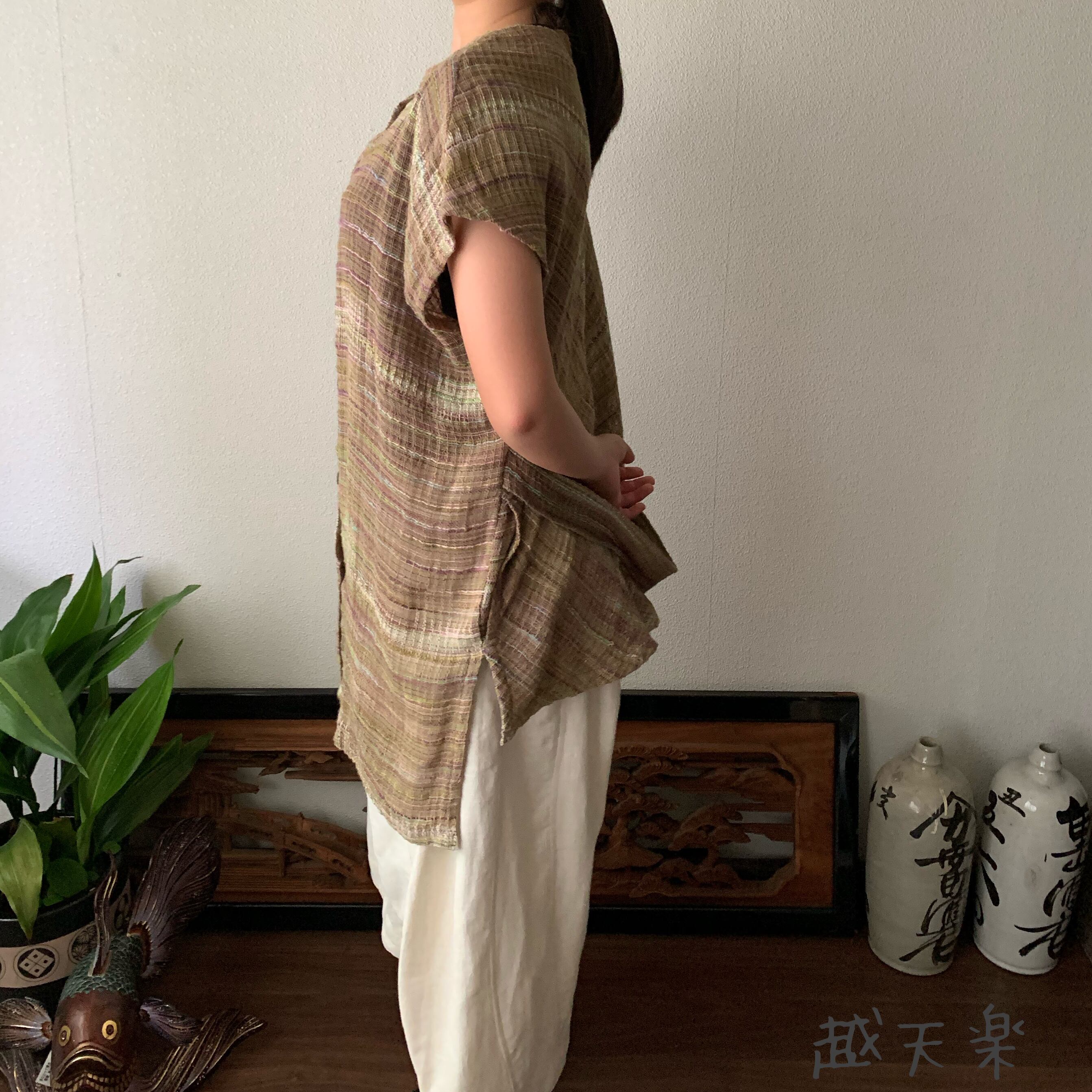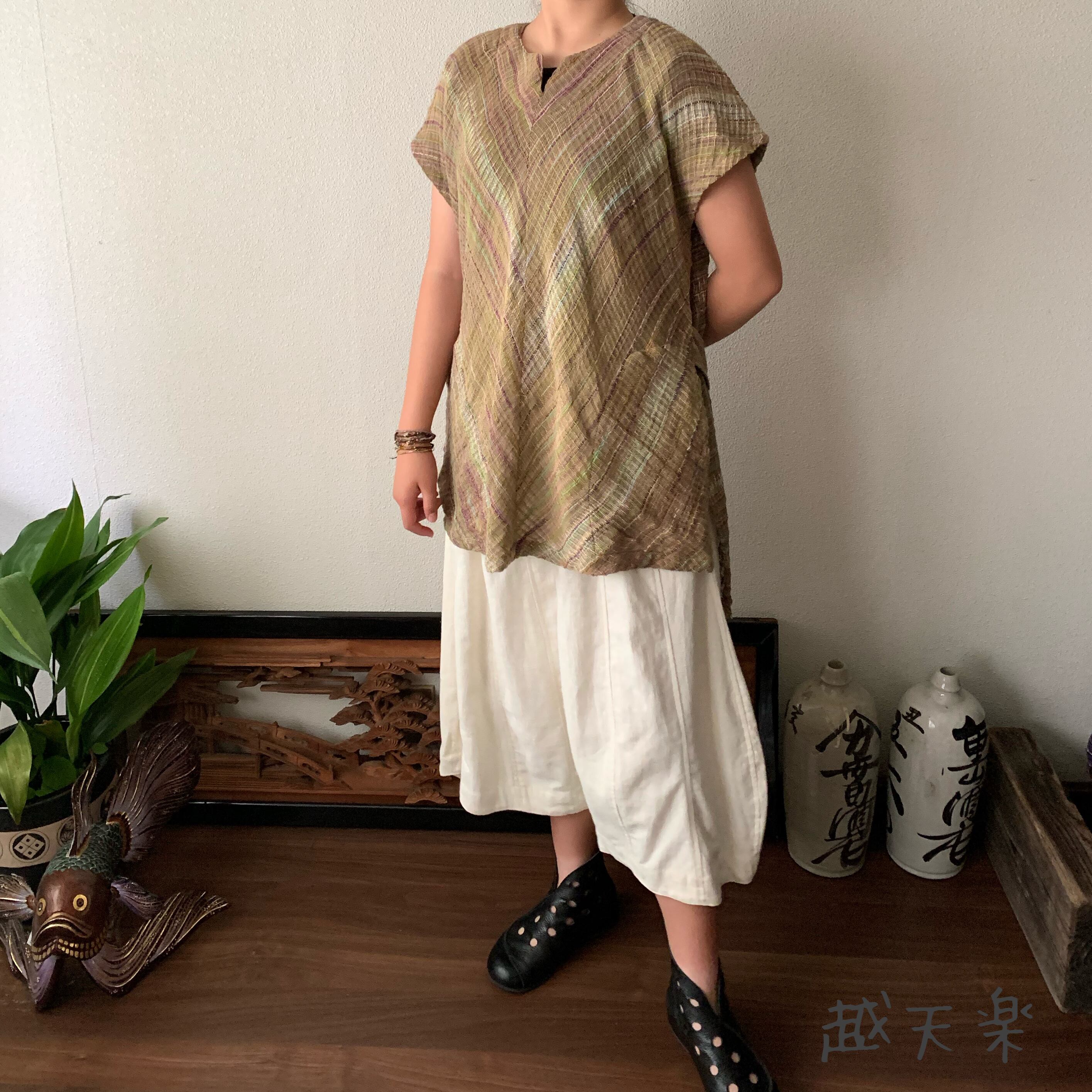 チュニック使いでもよし、ベスト使いでもよし、自由自在に着こなせる手織り綿のベストブラウスです。インナーさえ変えていただければオールシーズン活躍してくれます。