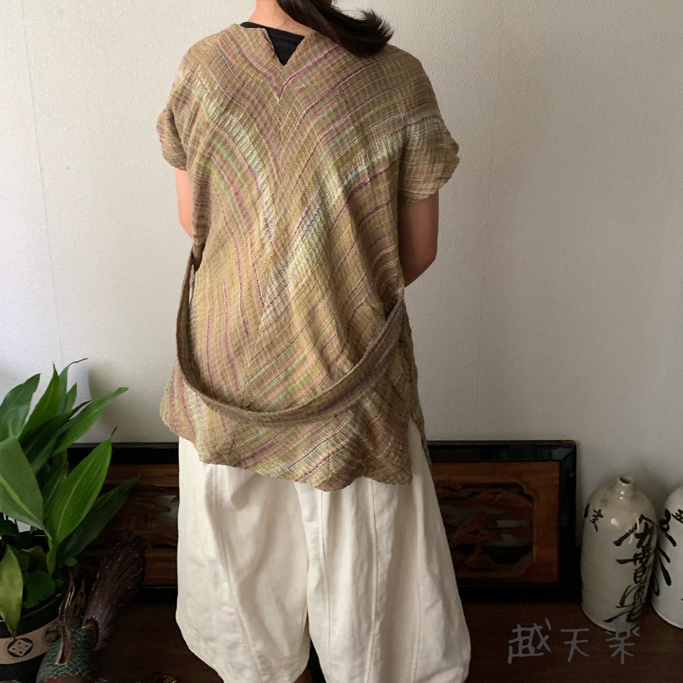前身頃で着ても後ろ身頃で着ても楽しめる手織り綿のベストです。