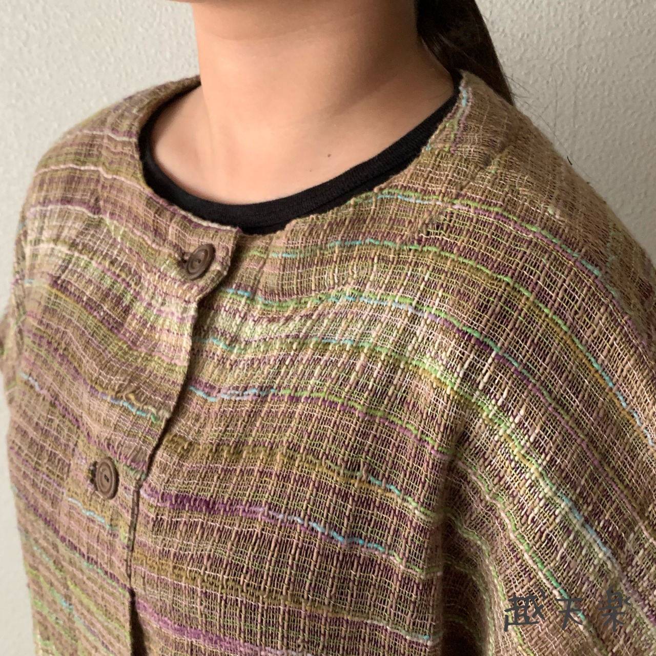ただ、モデルが着用しているように前後ろ逆に着ていただいても全く違った雰囲気が楽しめ越天楽らしい遊べるデザインになっています。