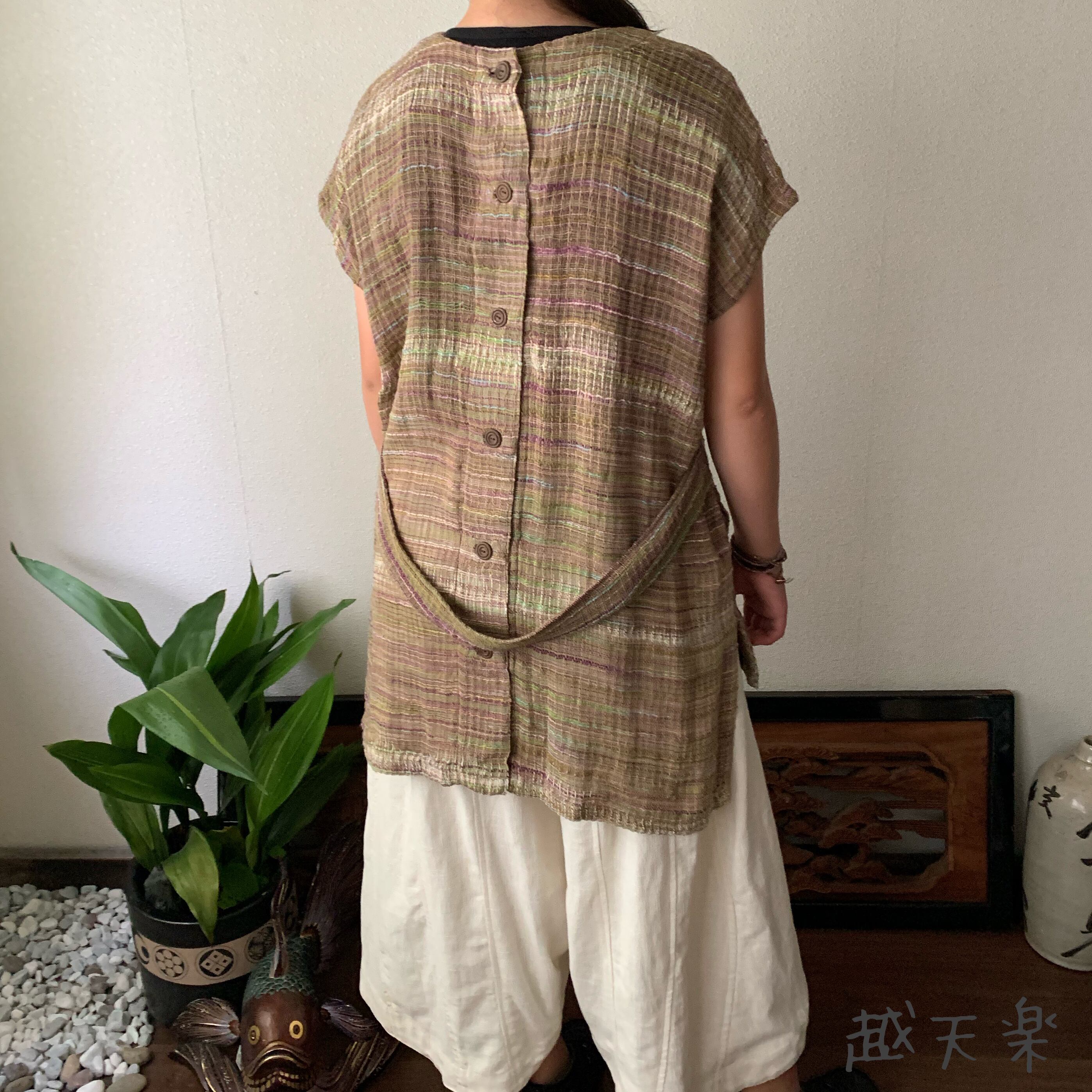 『前でも後でも楽しめる後ろベルト付き手織り綿ベスト さりげなくバックテールも嬉しい』