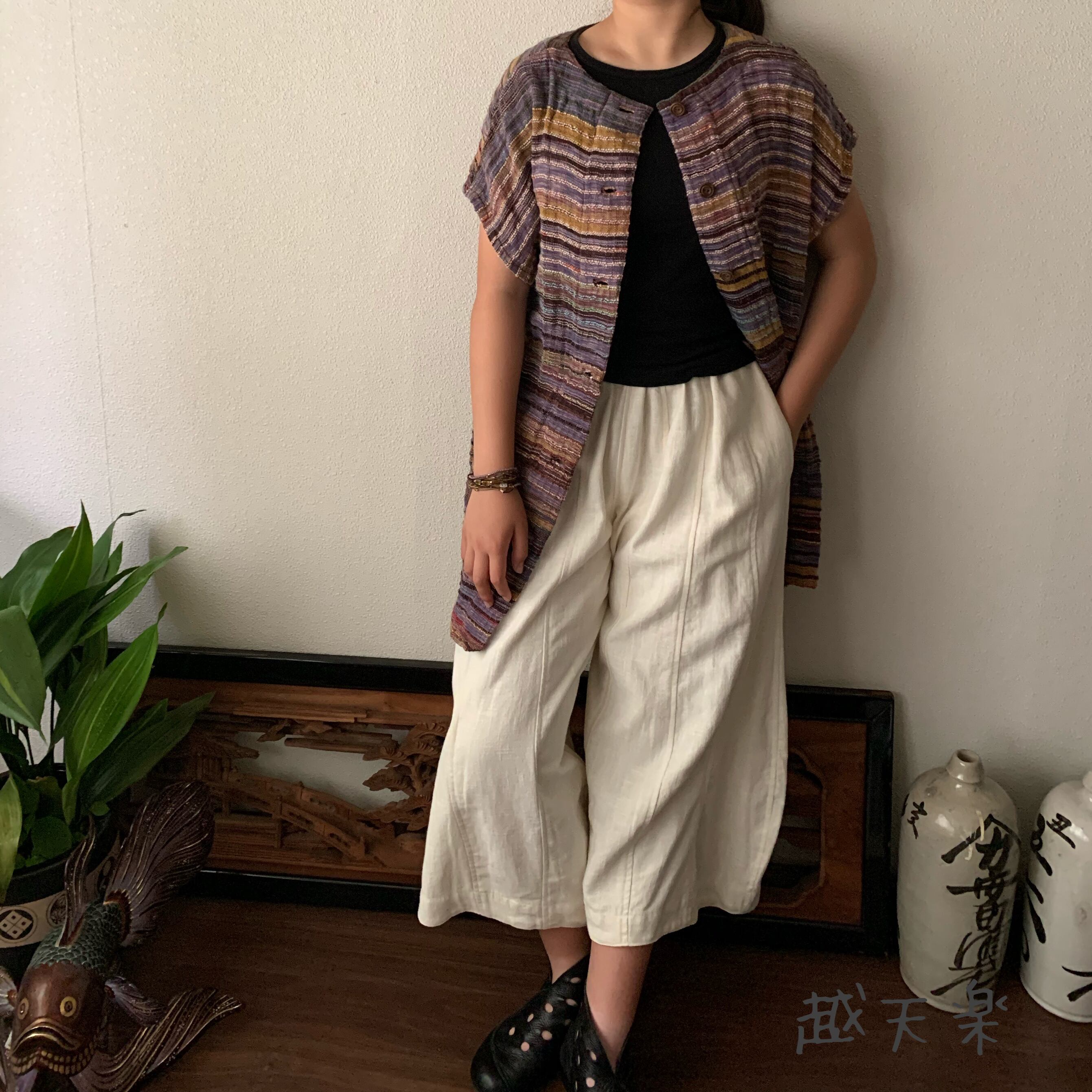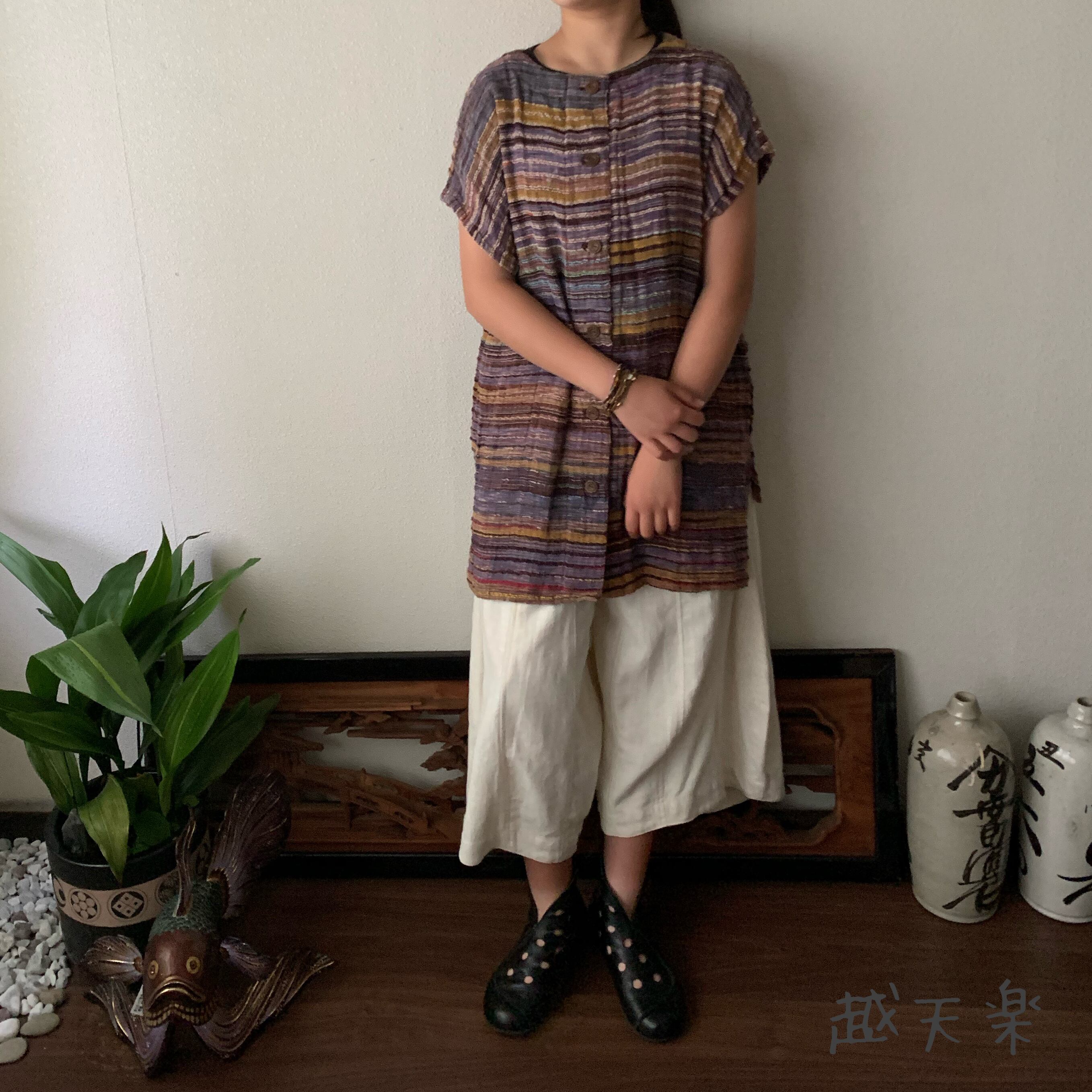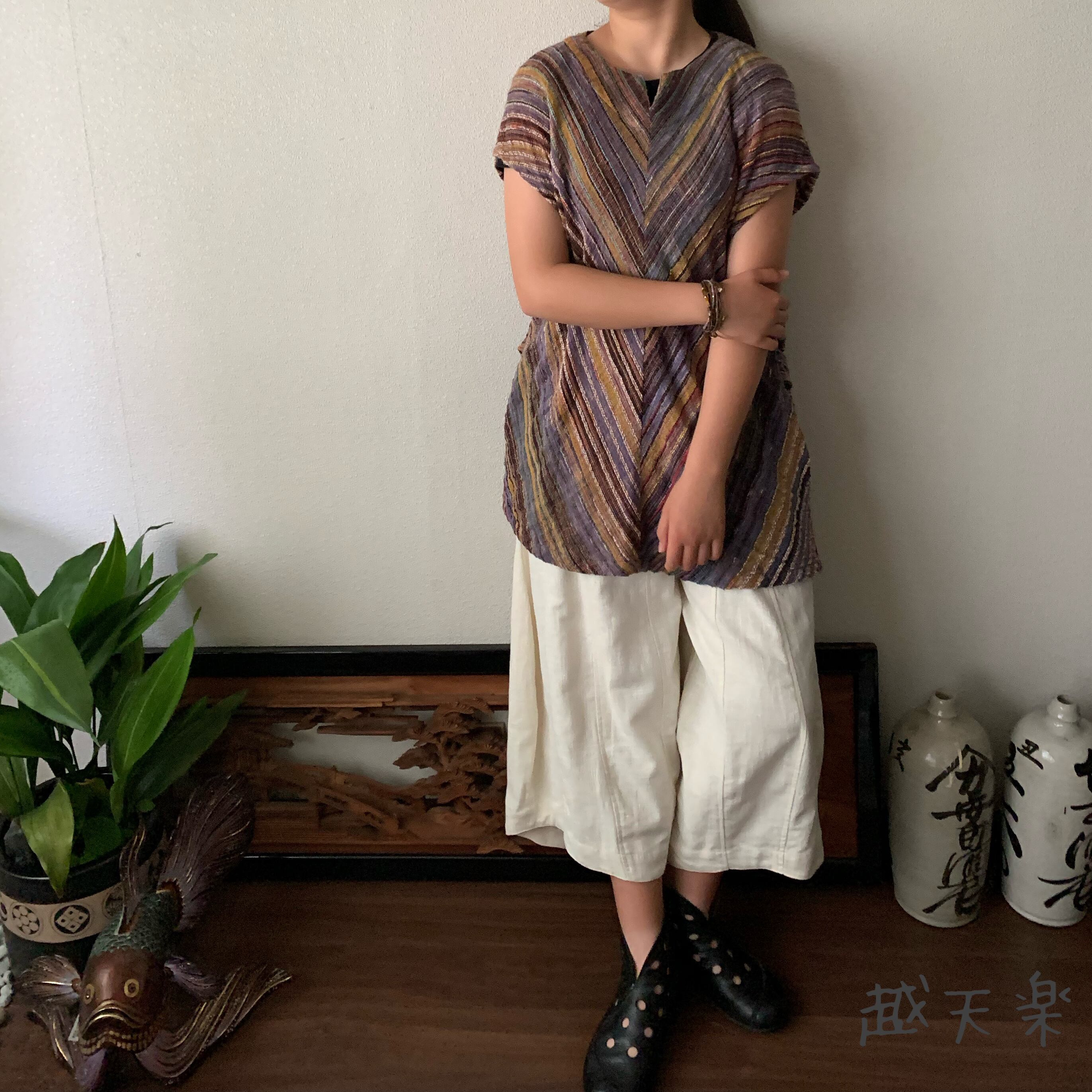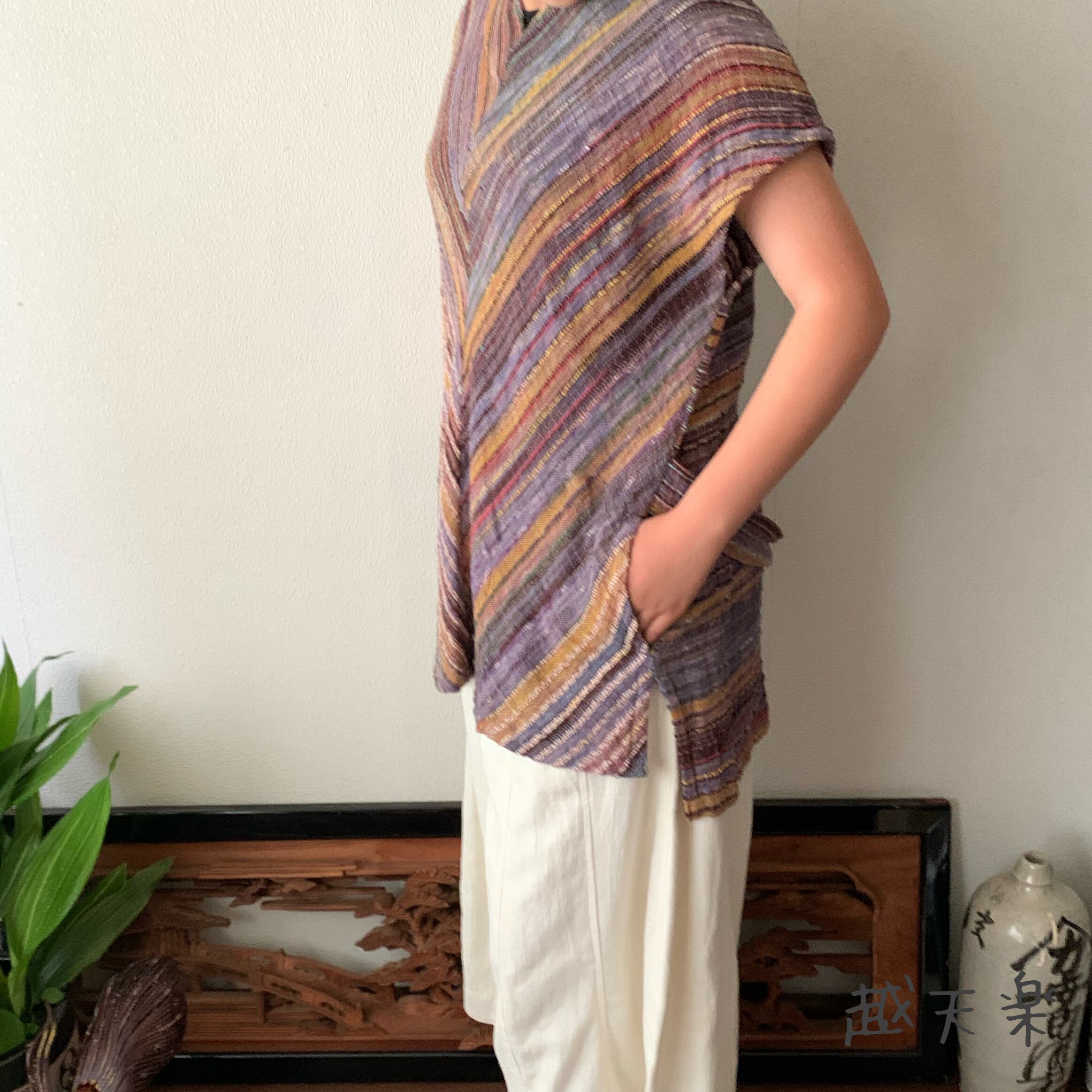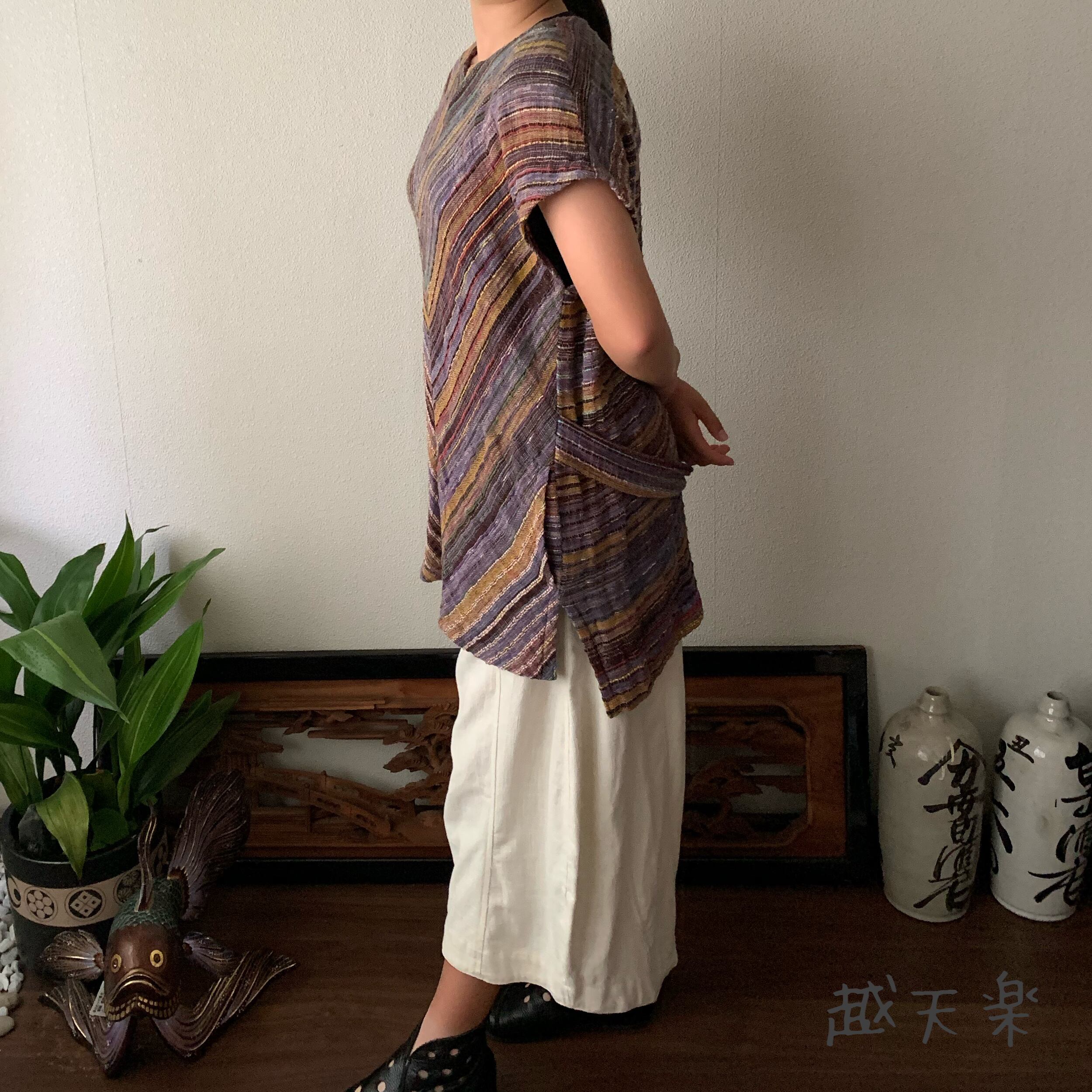 チュニック使いでもよし、ベスト使いでもよし、自由自在に着こなせる手織り綿のベストブラウスです。インナーさえ変えていただければオールシーズン活躍してくれます。