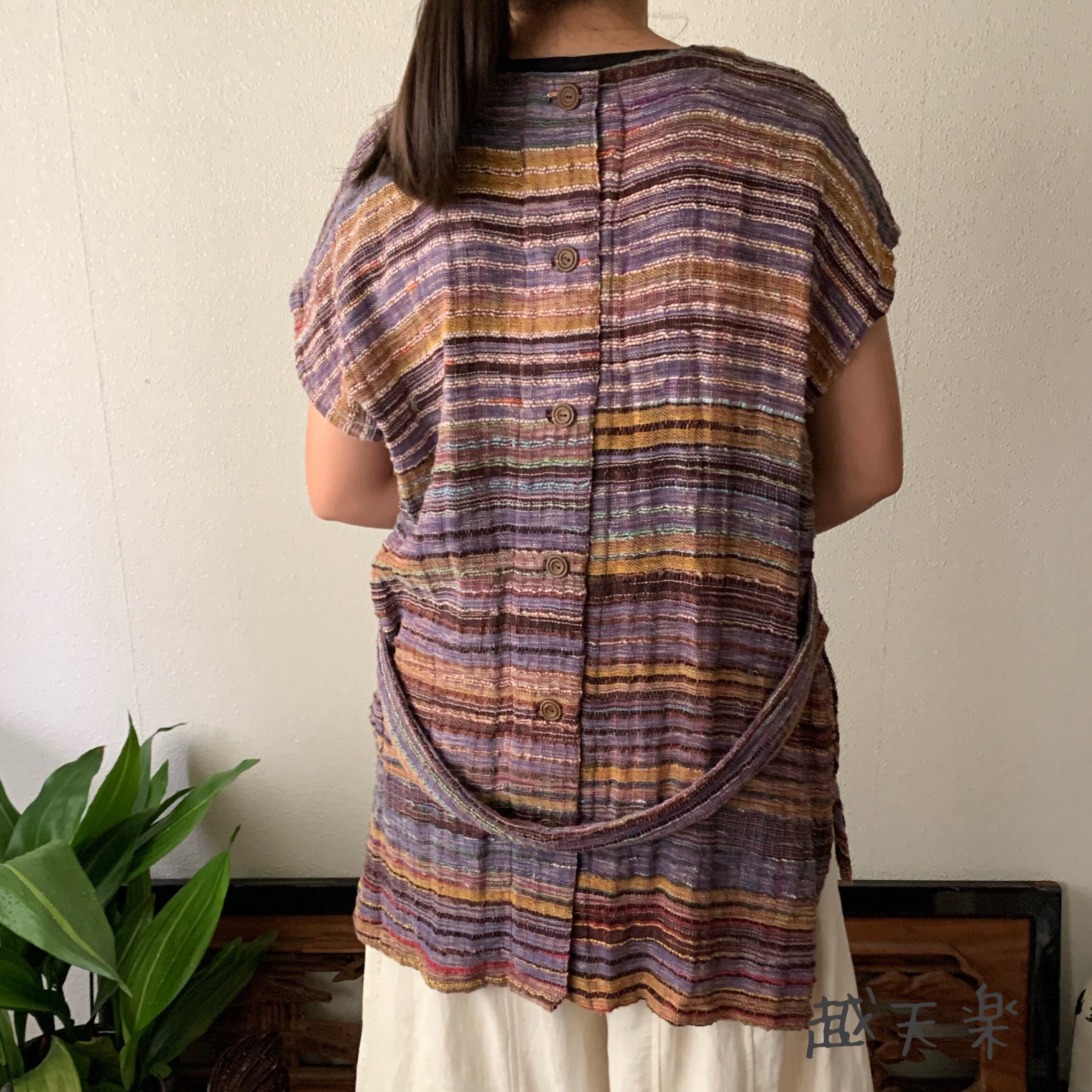 『前でも後でも楽しめる後ろベルト付き手織り綿ベスト さりげなくバックテールも嬉しい』