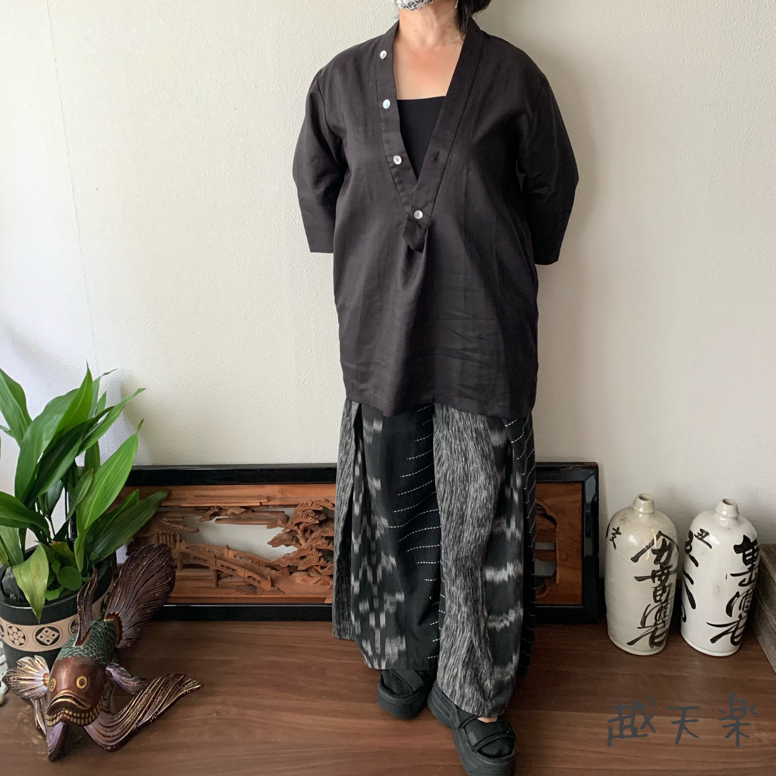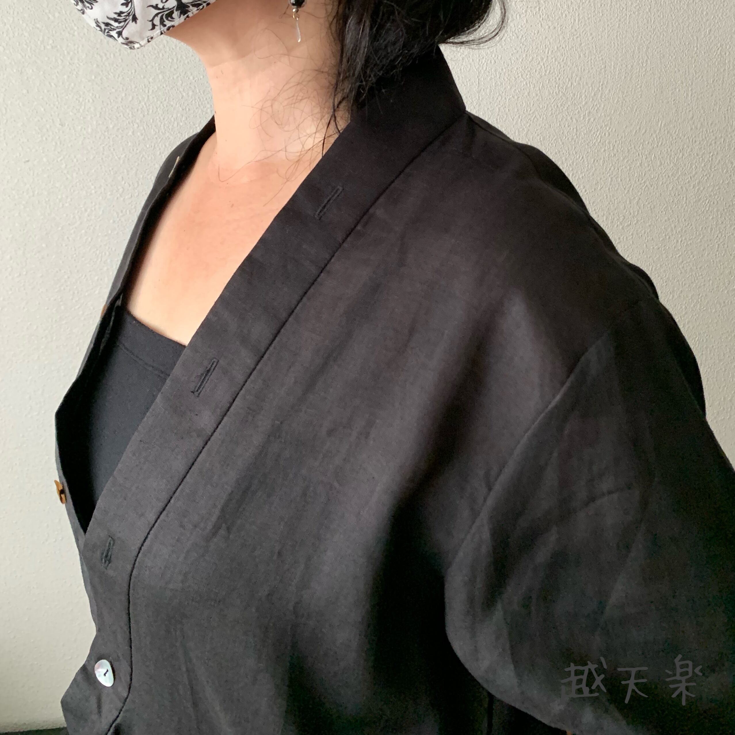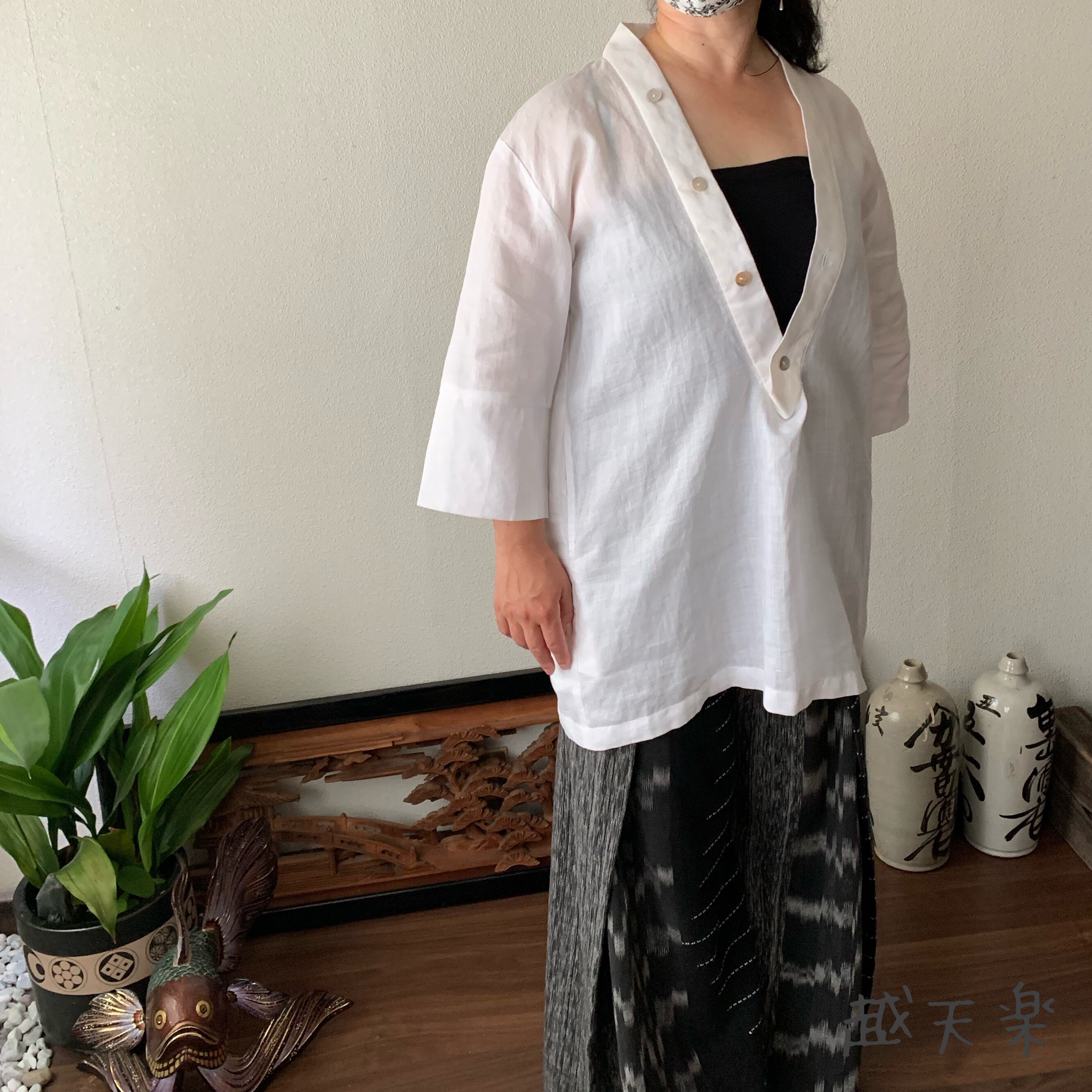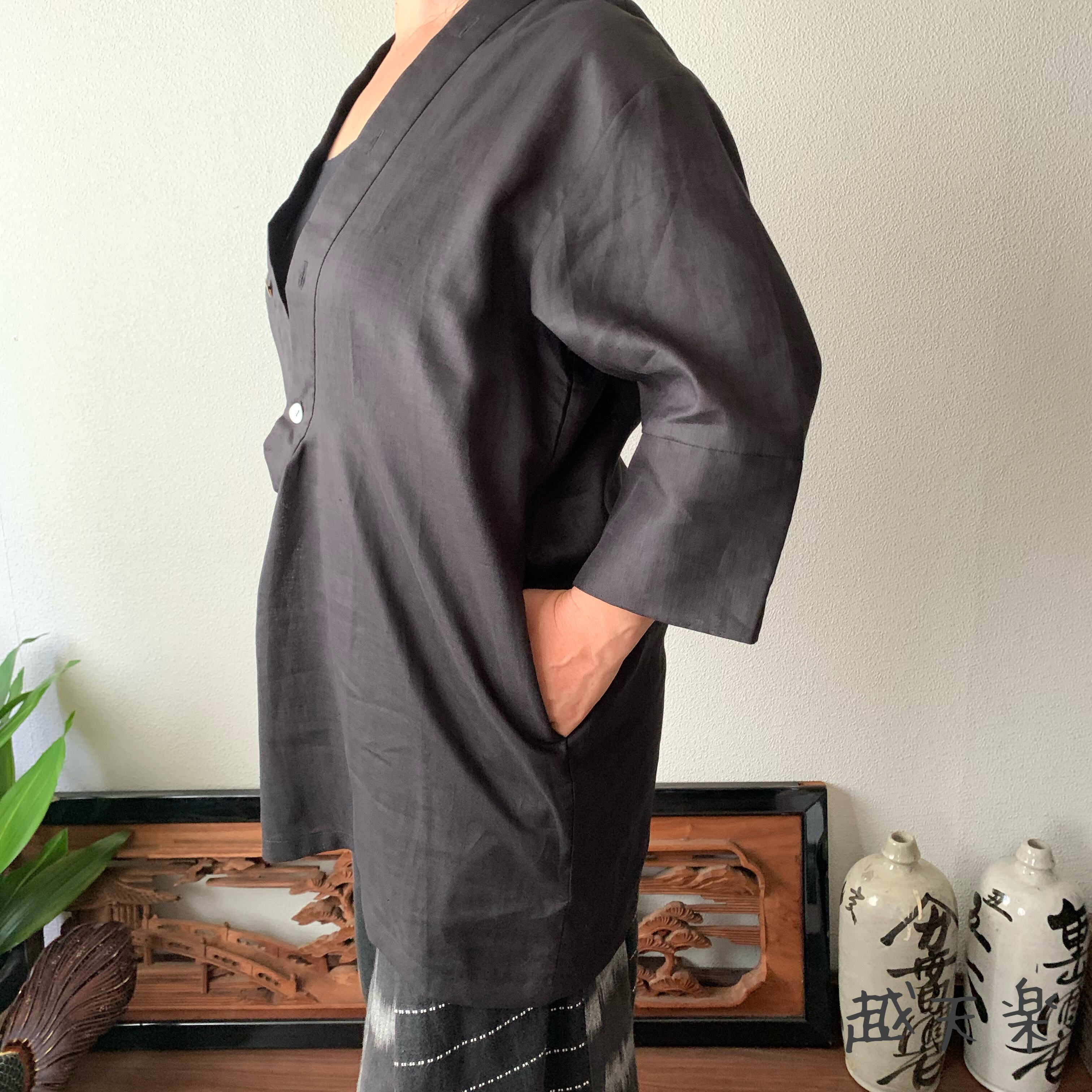 『ビックオープンカラーで個性的なリネンのチュニック7分袖ブラウス 袖切り返しボタンもアクセントに』