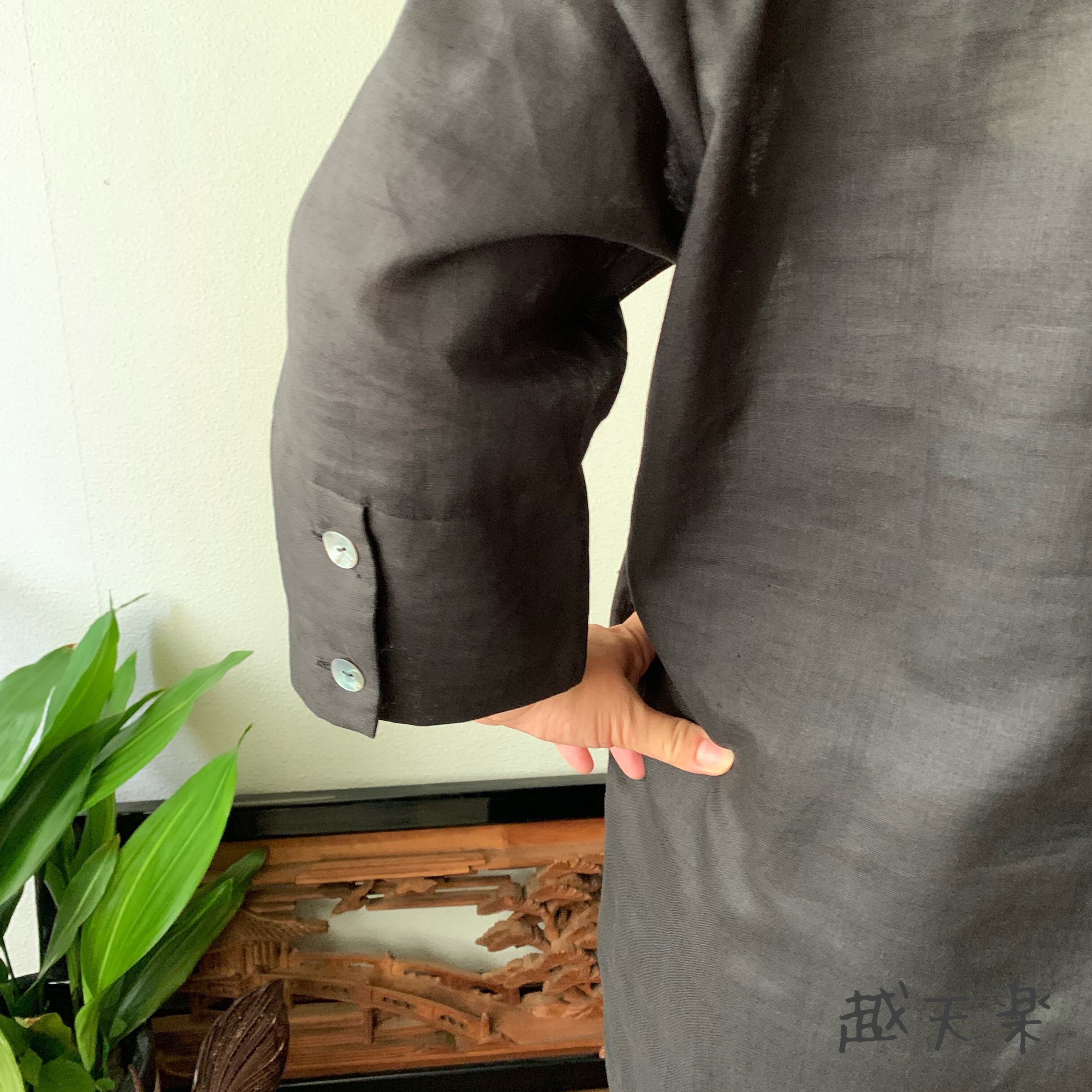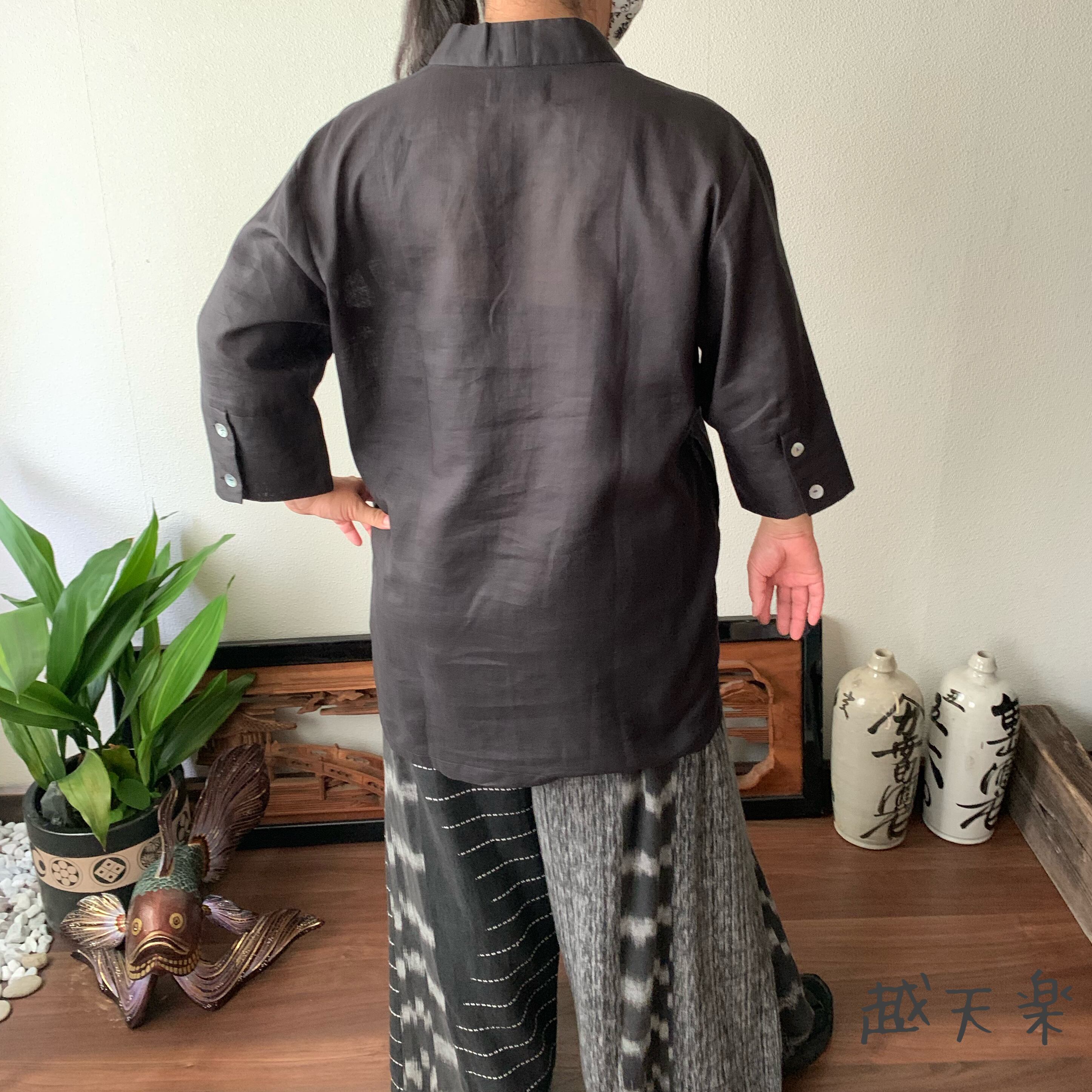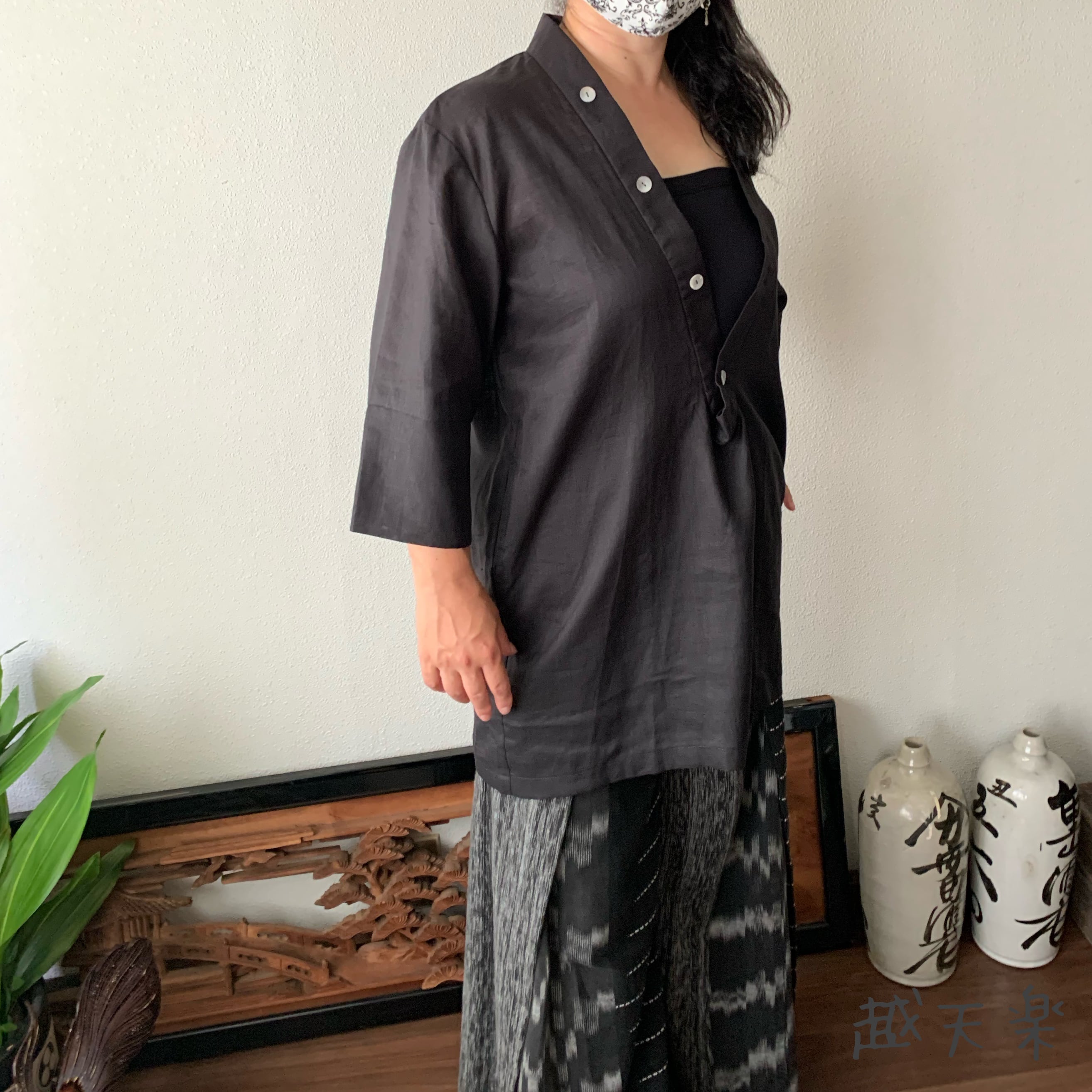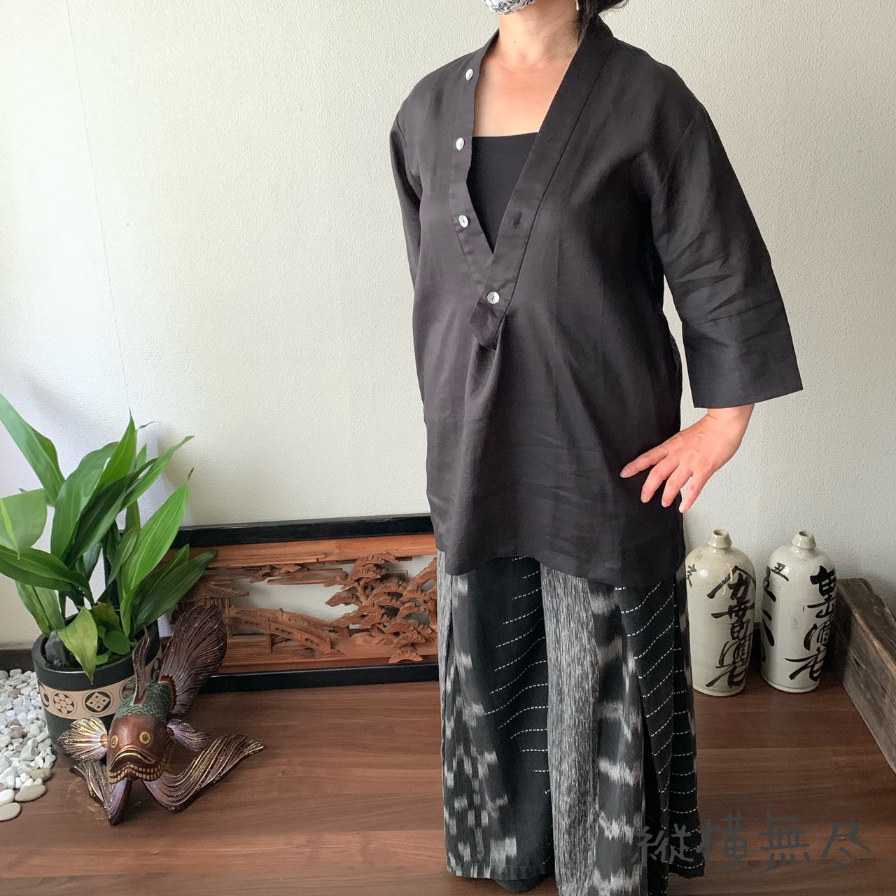 『ビックオープンカラーで個性的なリネンのチュニック7分袖ブラウス 袖切り返しボタンもアクセントに』