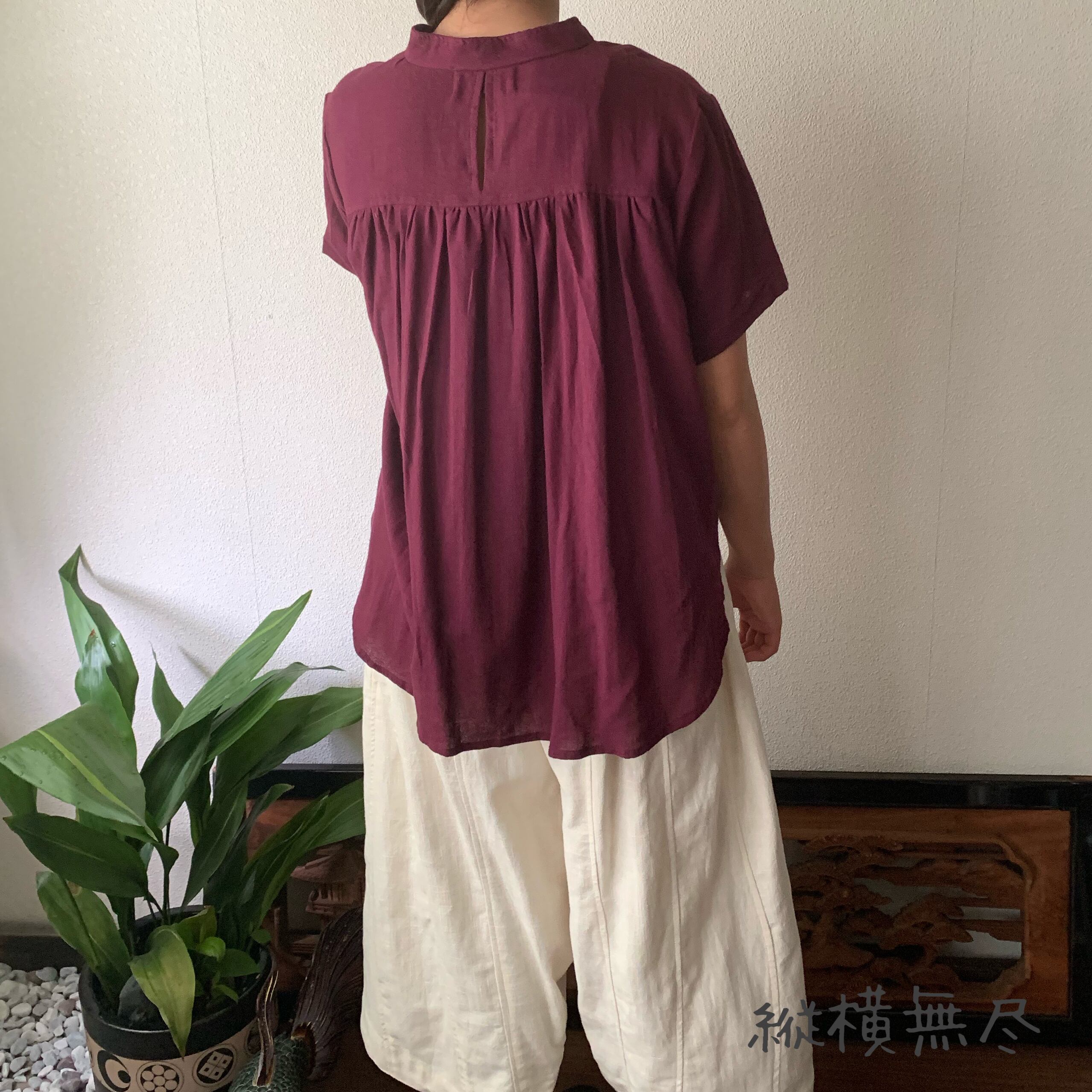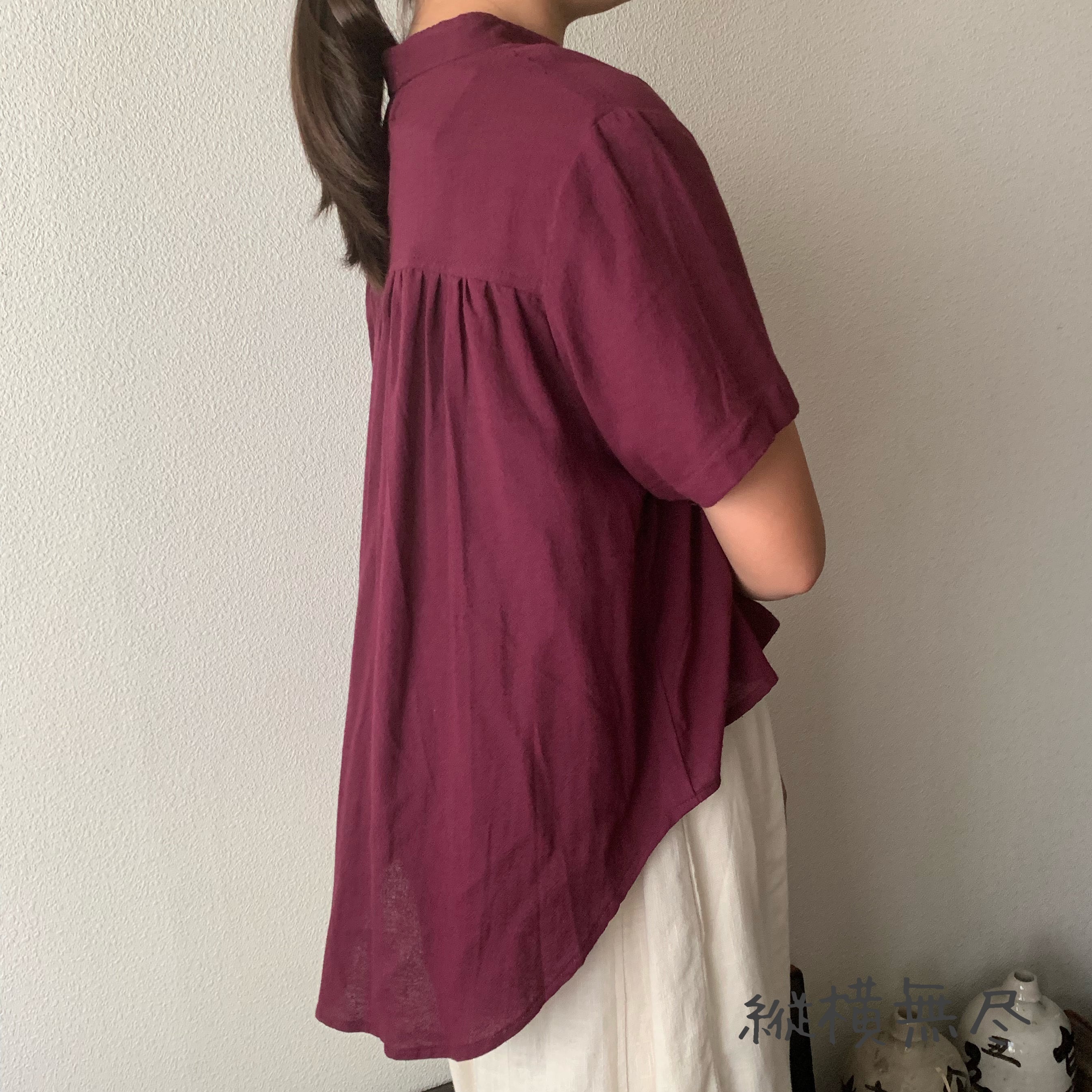 『前開き後ろシャーリングが大人可愛いコットンブラウス バックテールと後ろ襟スリットホールもポイント』