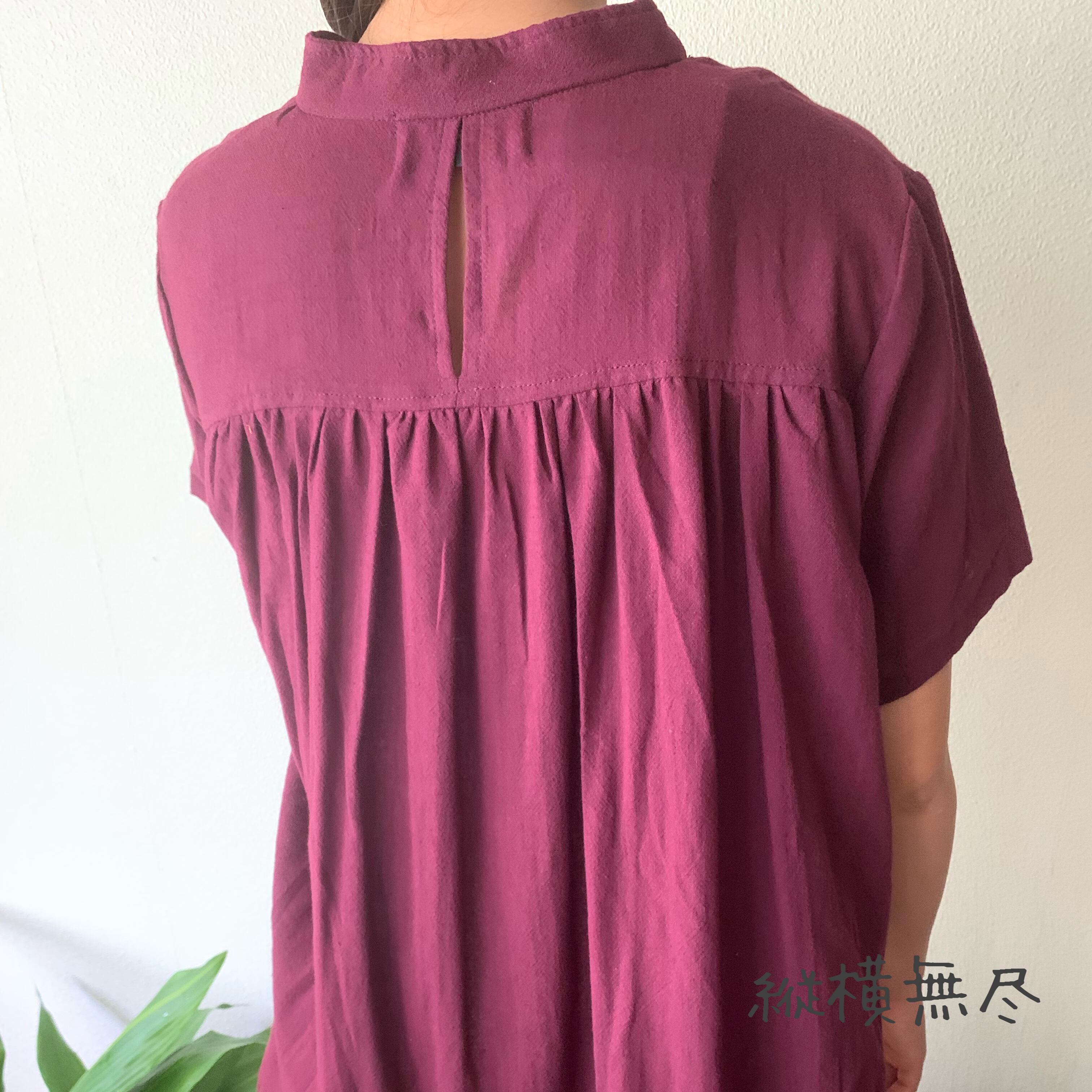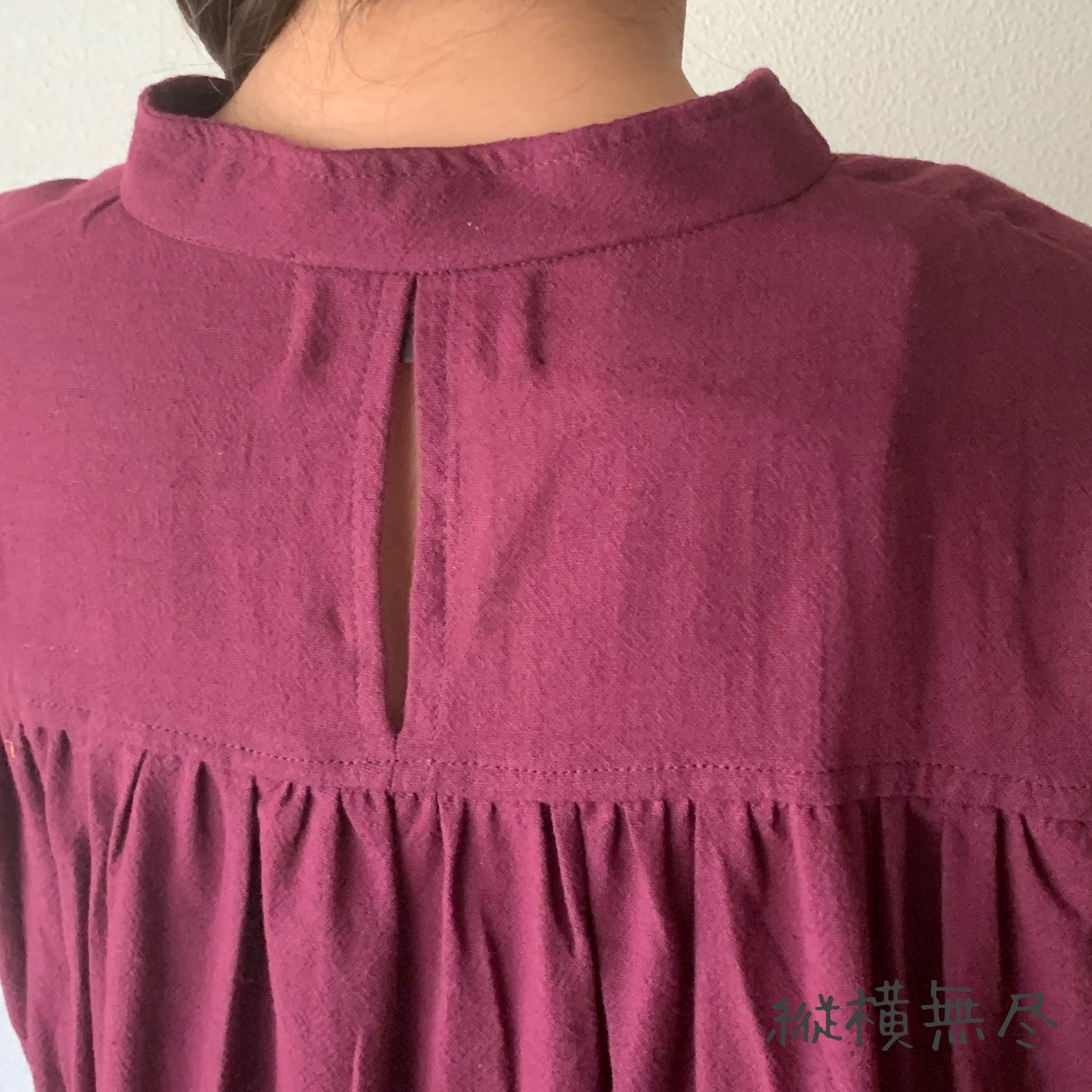 前から見るとシンプルだけど背中にたっぷりのシャーリングがとても可愛いブラウスですが、背中上部にいれたスリットホールが大人っぽさも演出してくれます。