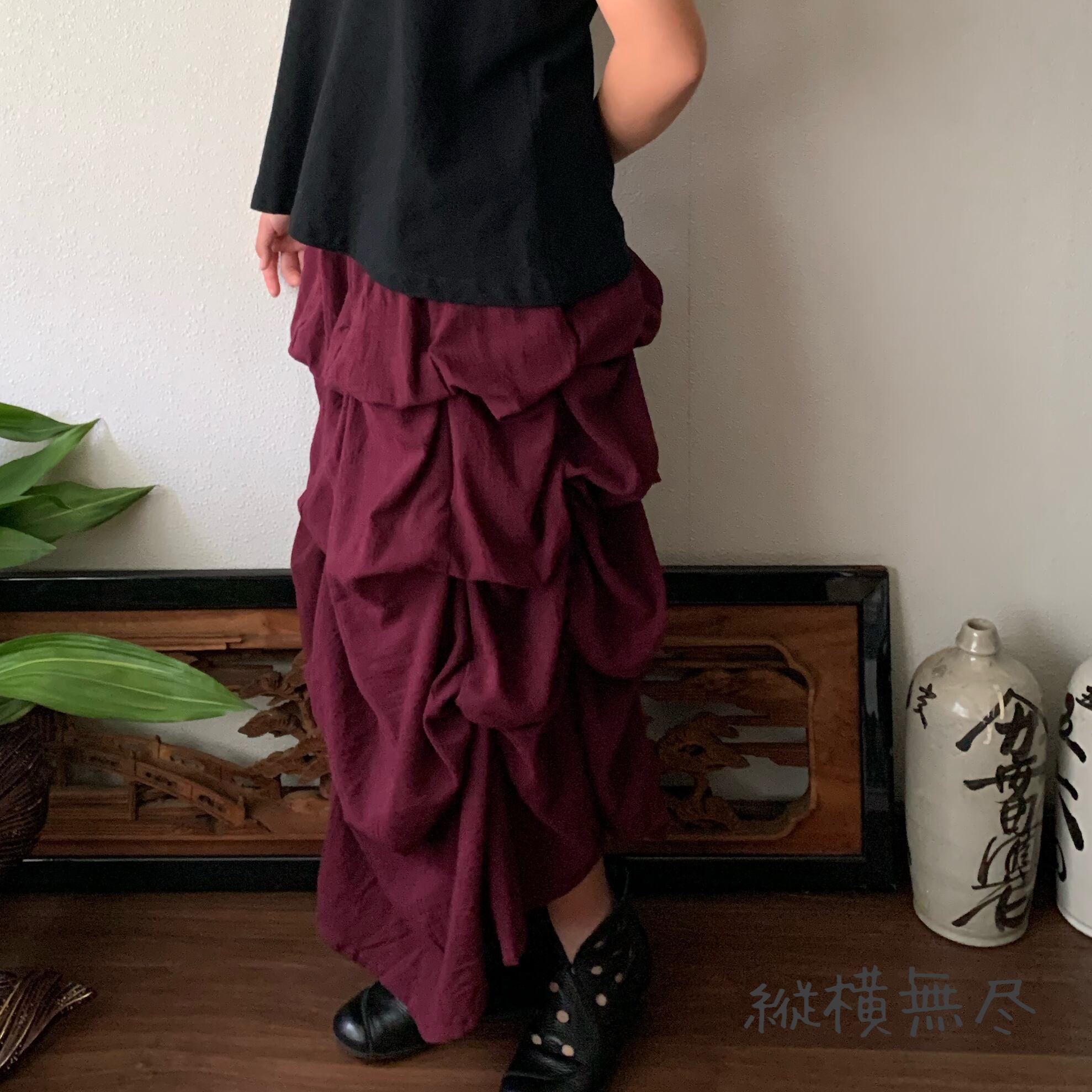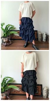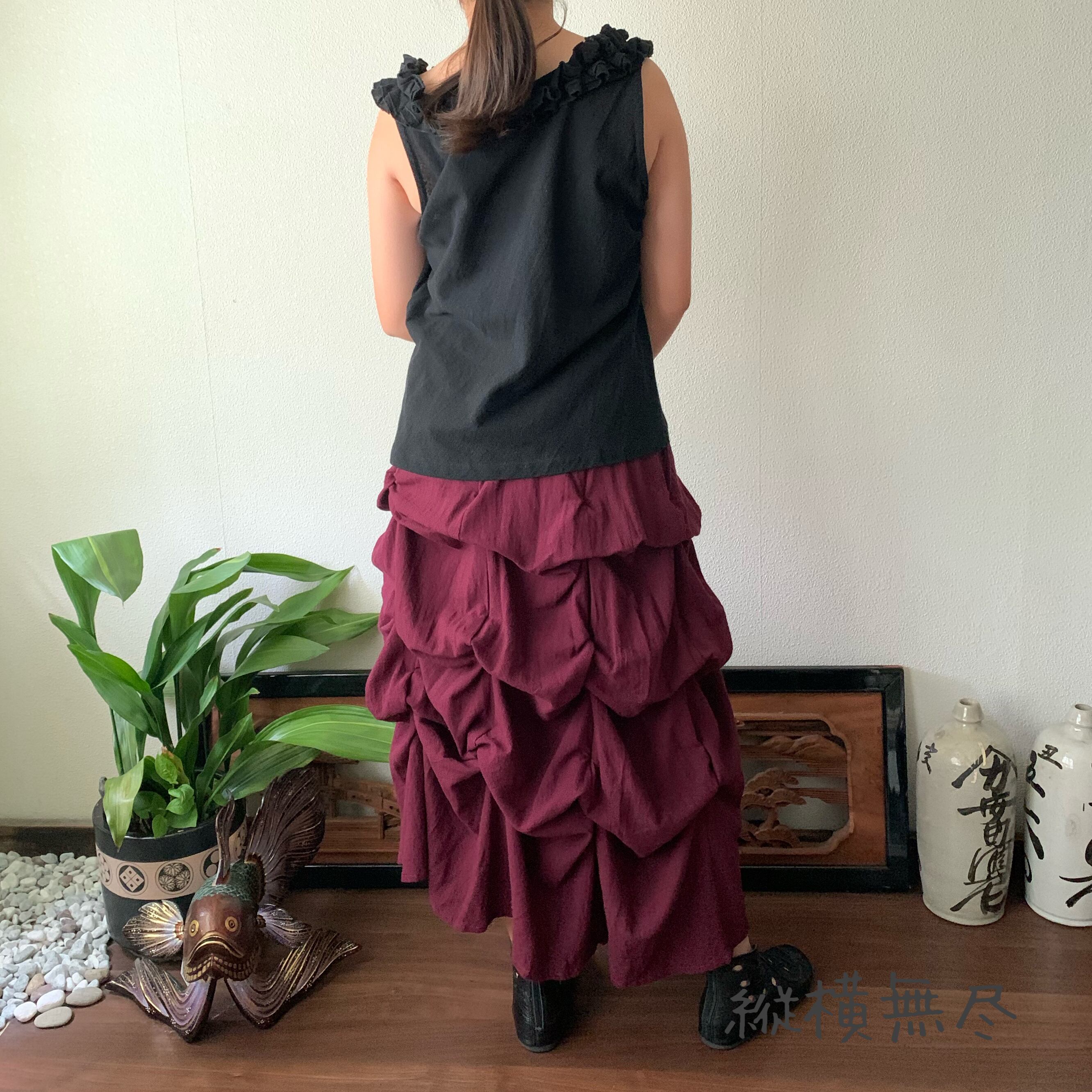 内側に27か所も留めリボンがあり、結ぶ箇所によりシルエットが変わるので、自身で自由にデザインできるスカートです。
