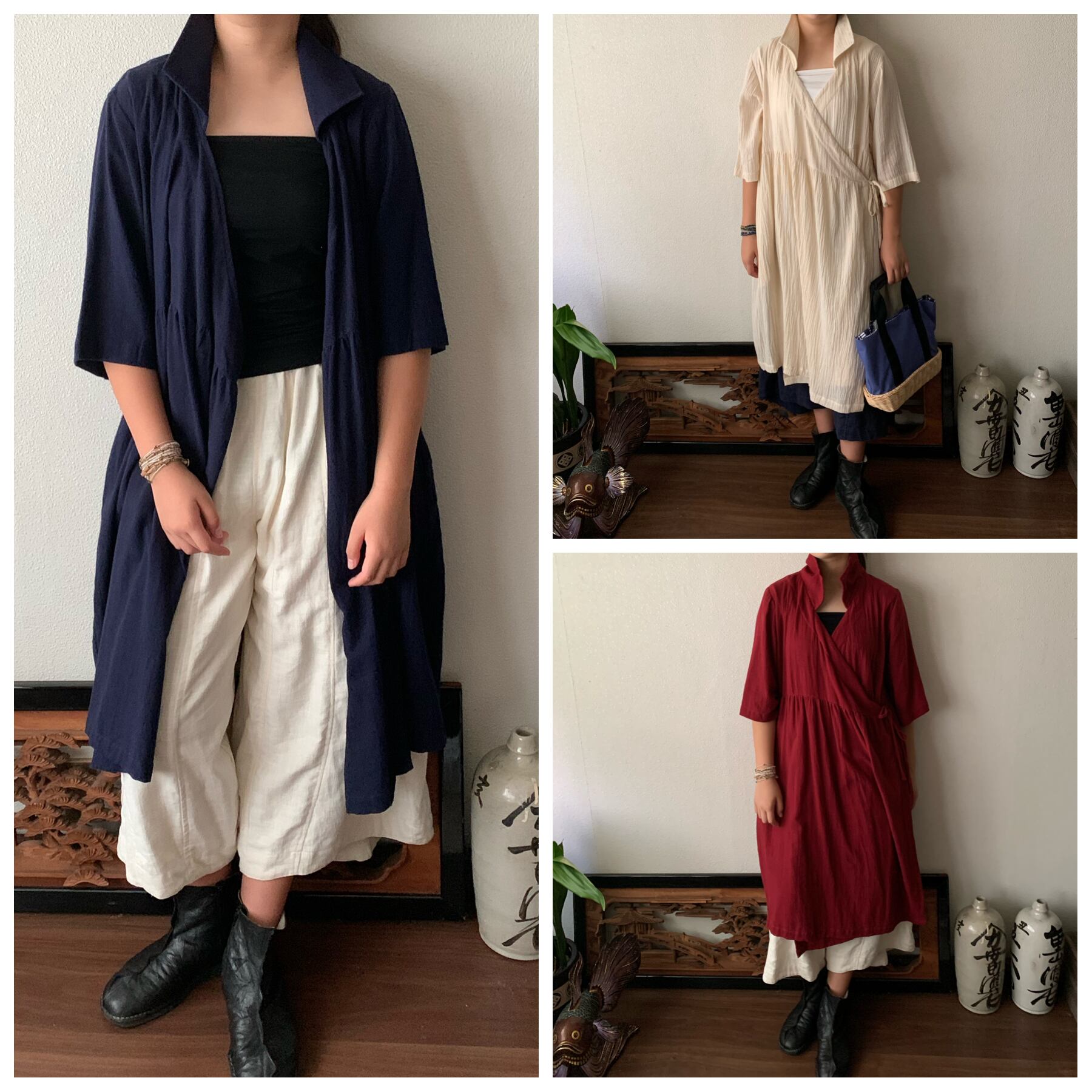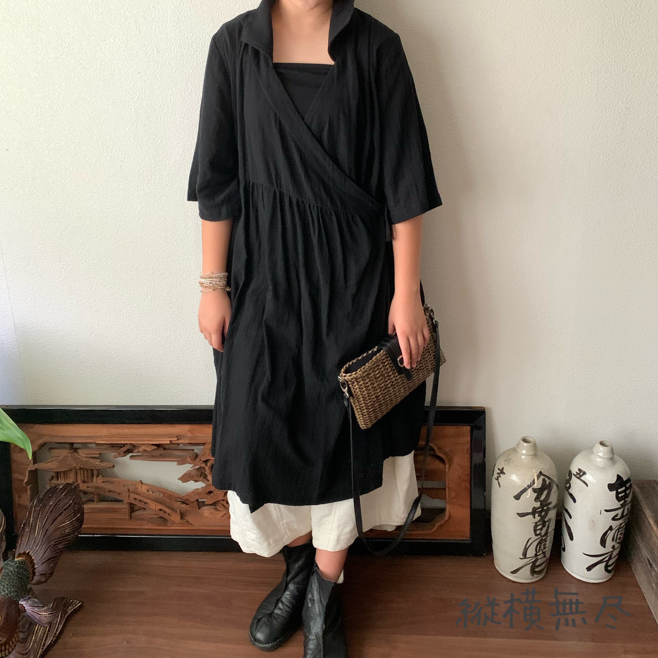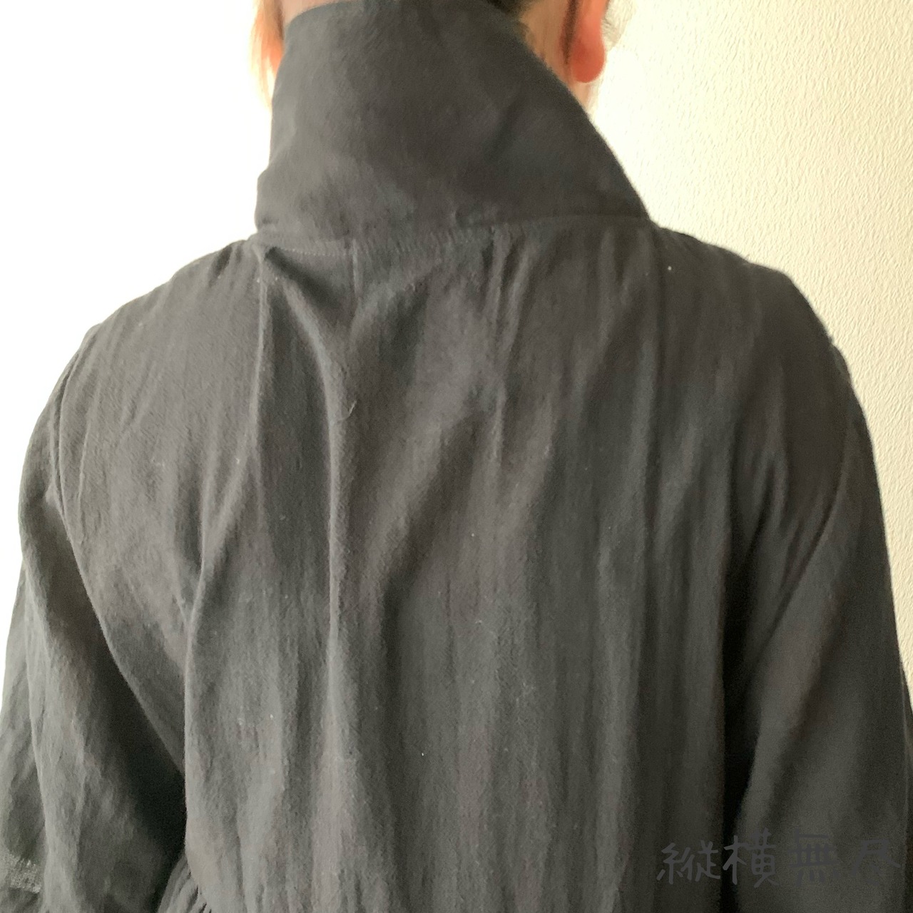 『ハイカラーがかっこいい カシュクール前開きワンピース丈コットンブラウス』