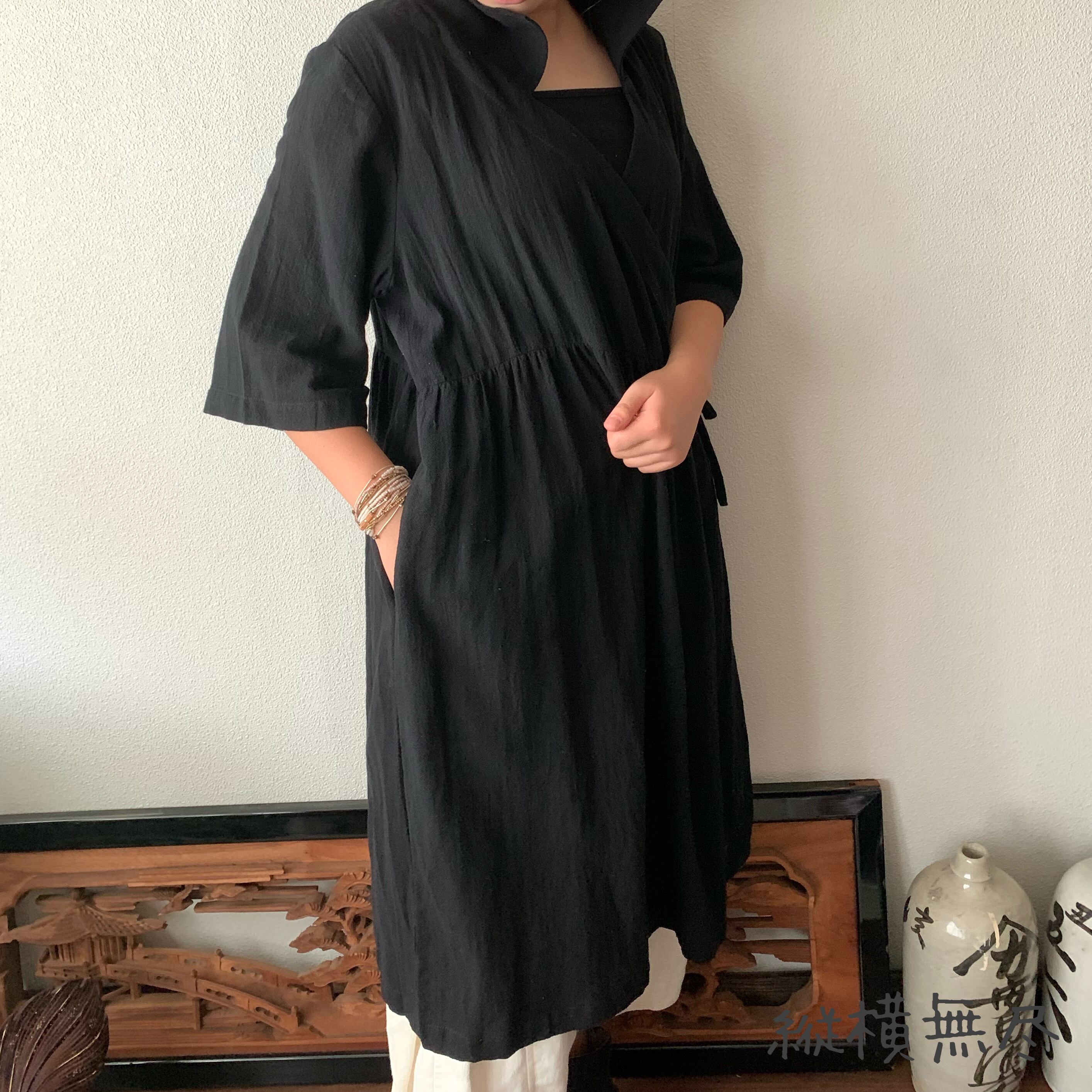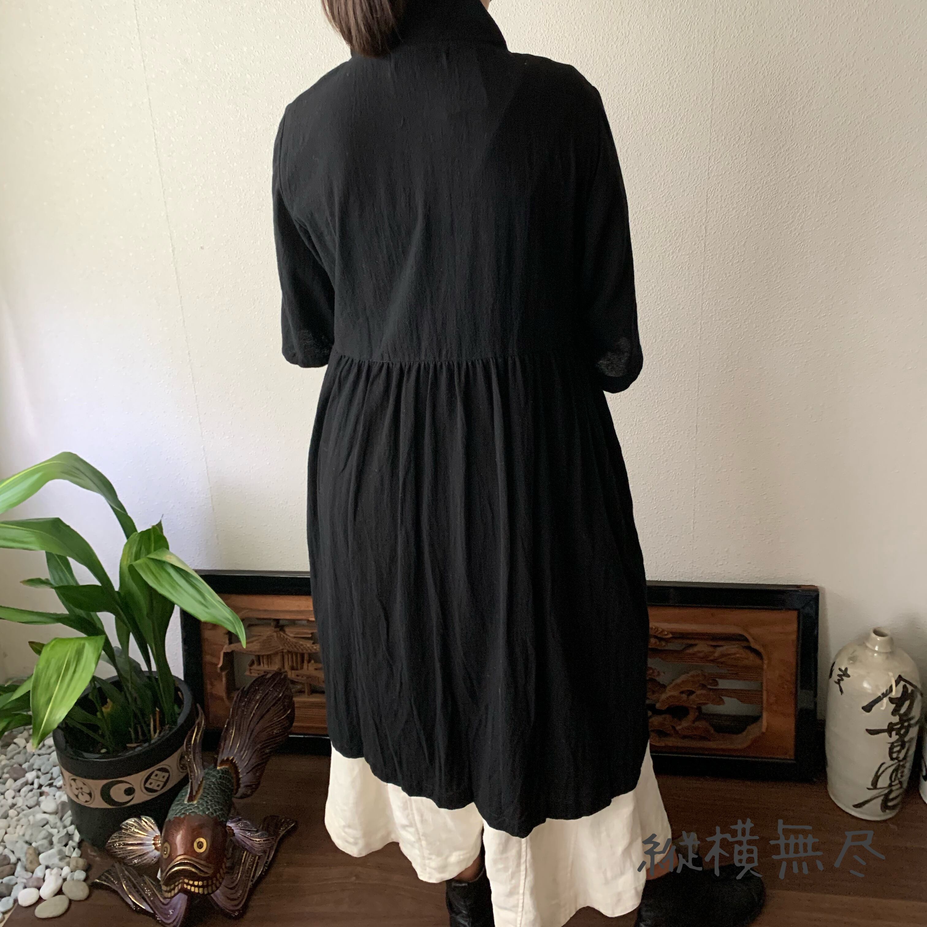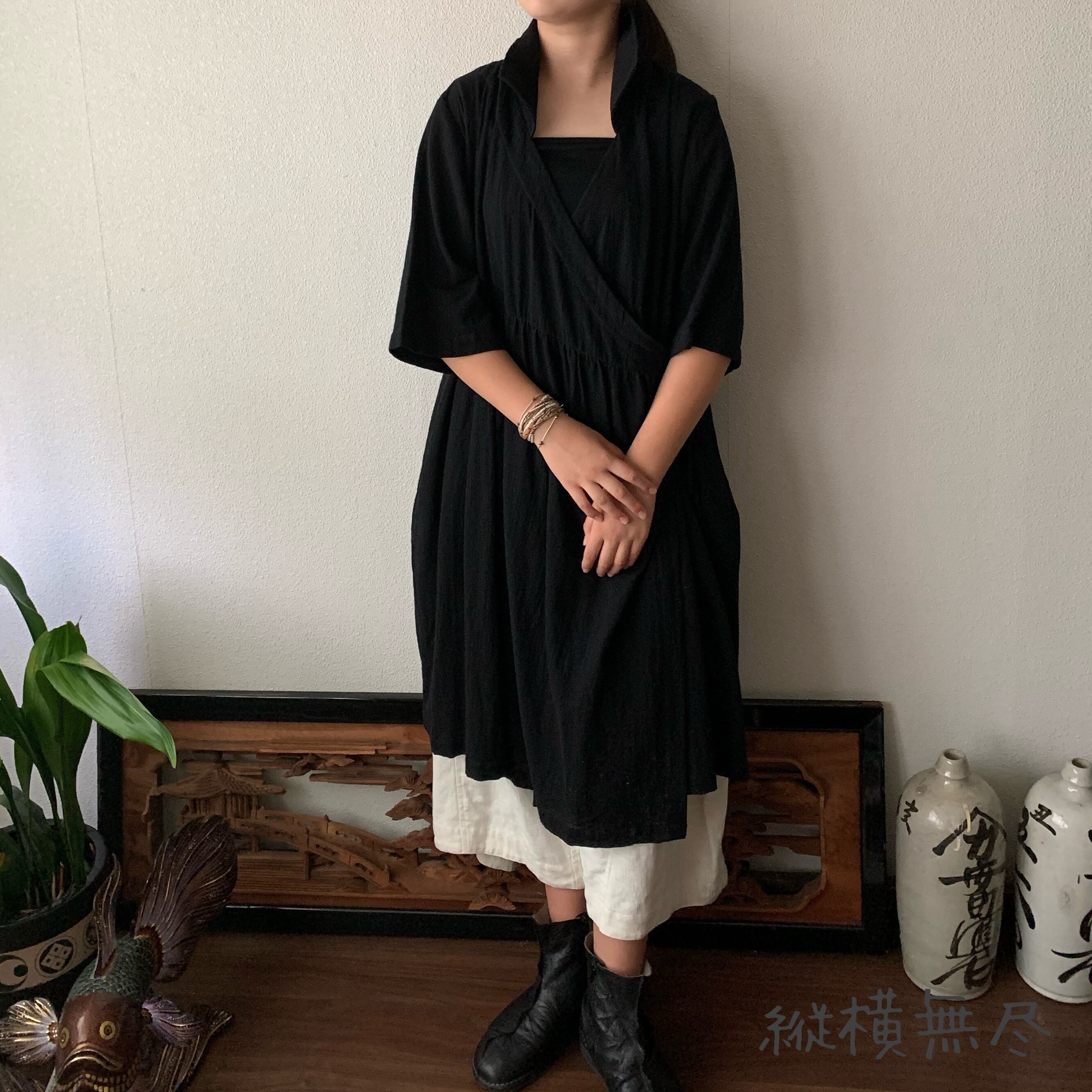 『ハイカラーがかっこいい カシュクール前開きワンピース丈コットンブラウス』