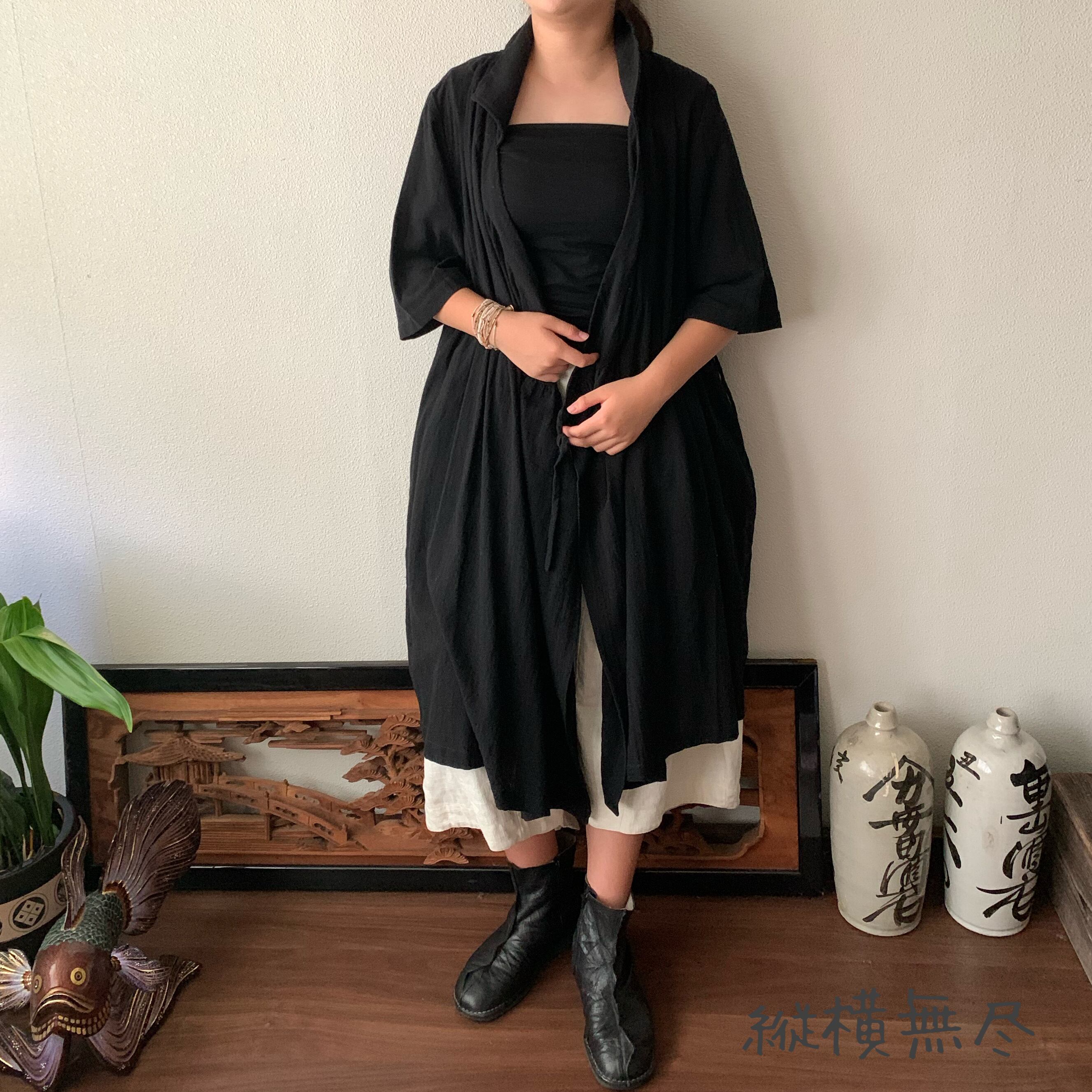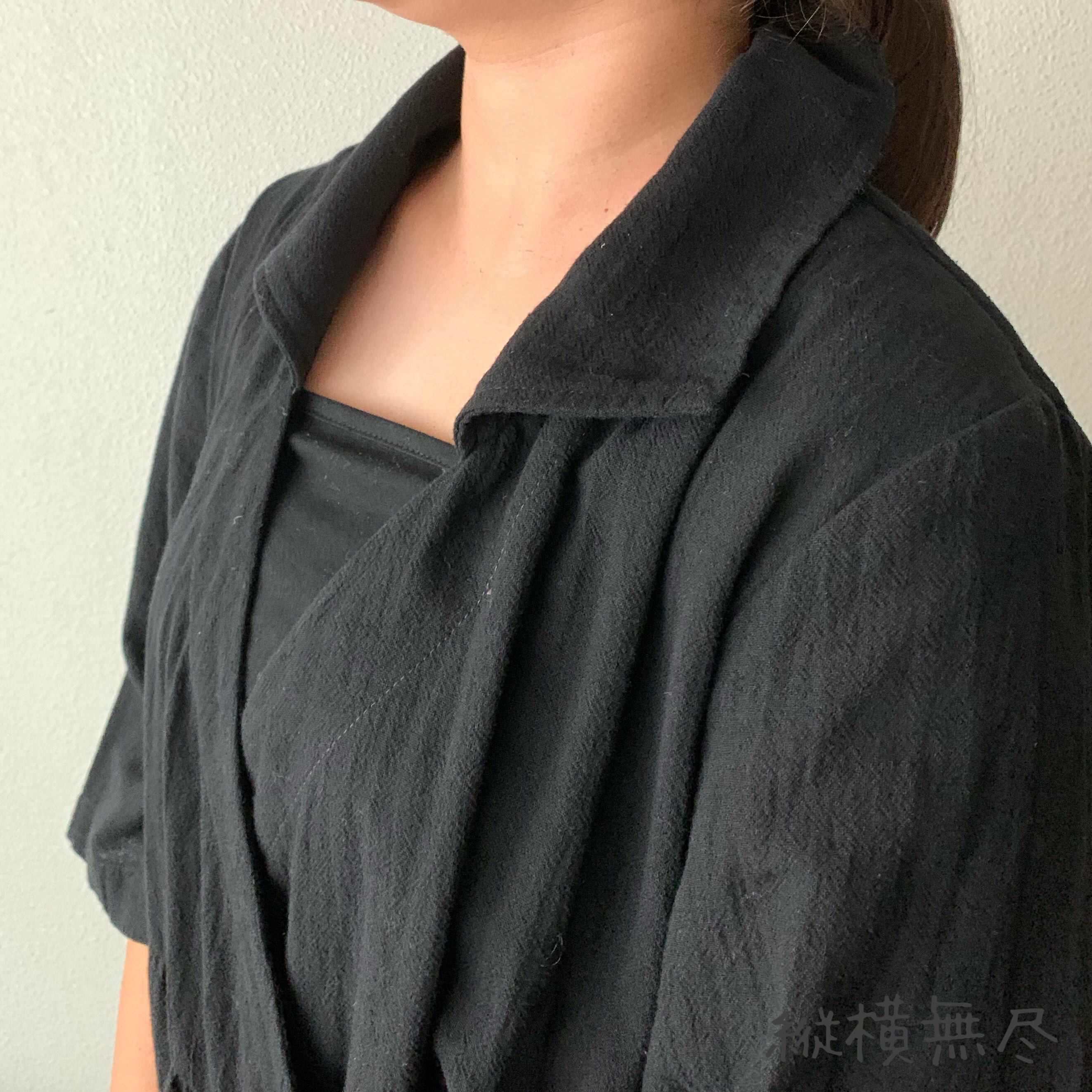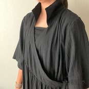 カシュクール風前開きです。ウエスト部分に2か所紐で結べるポイントがあり結んでブラウスにしても、外して羽織風に着ても個性的に着こなせます。