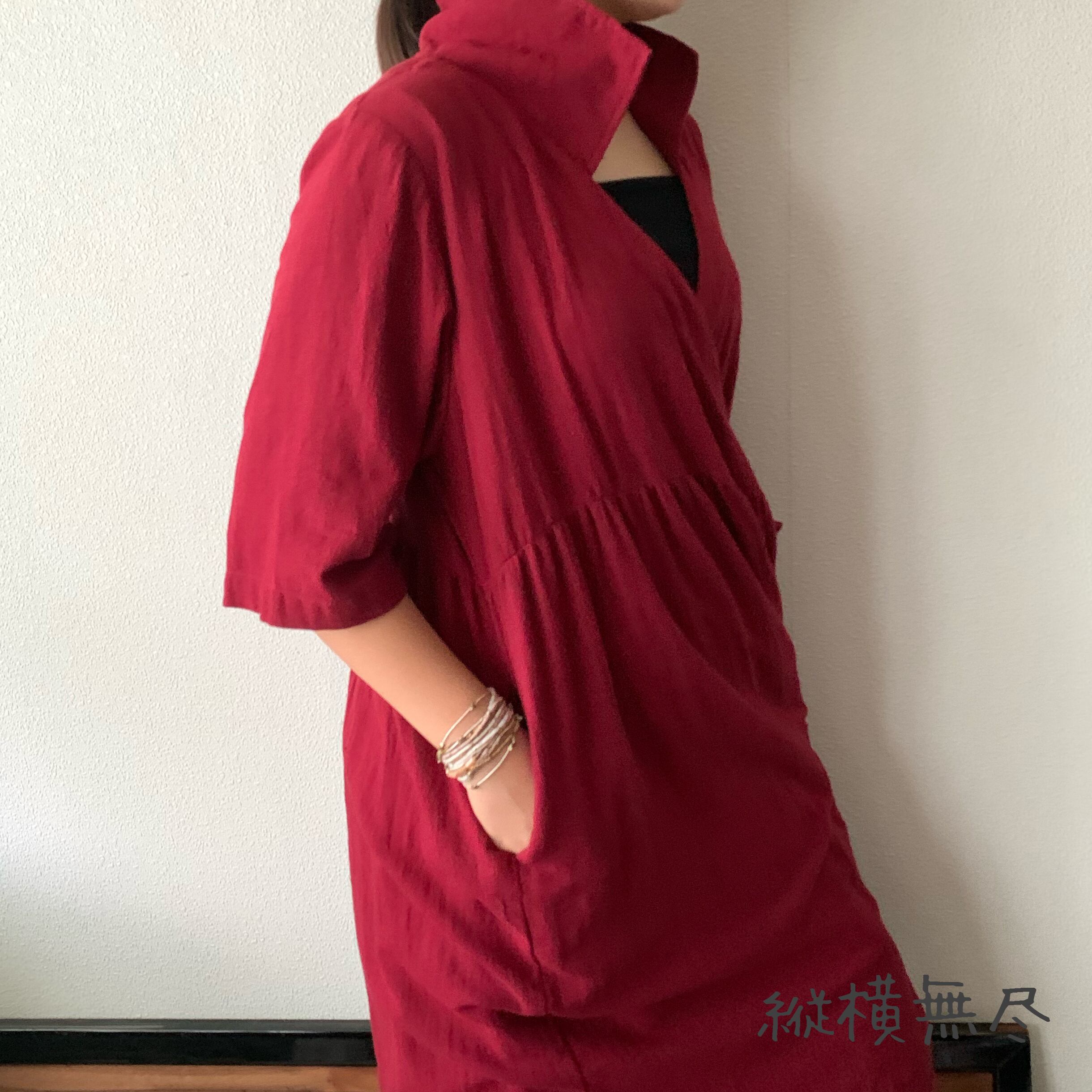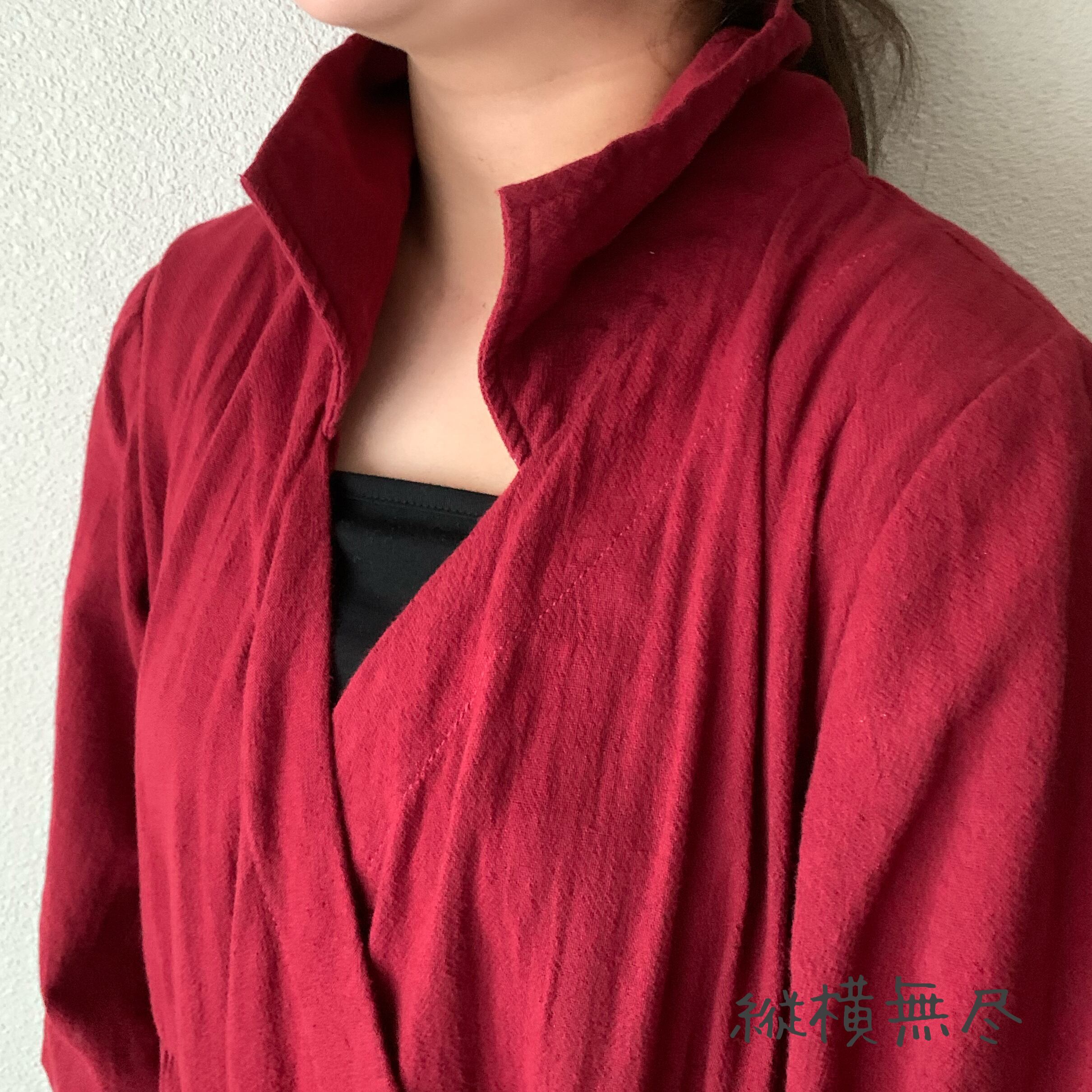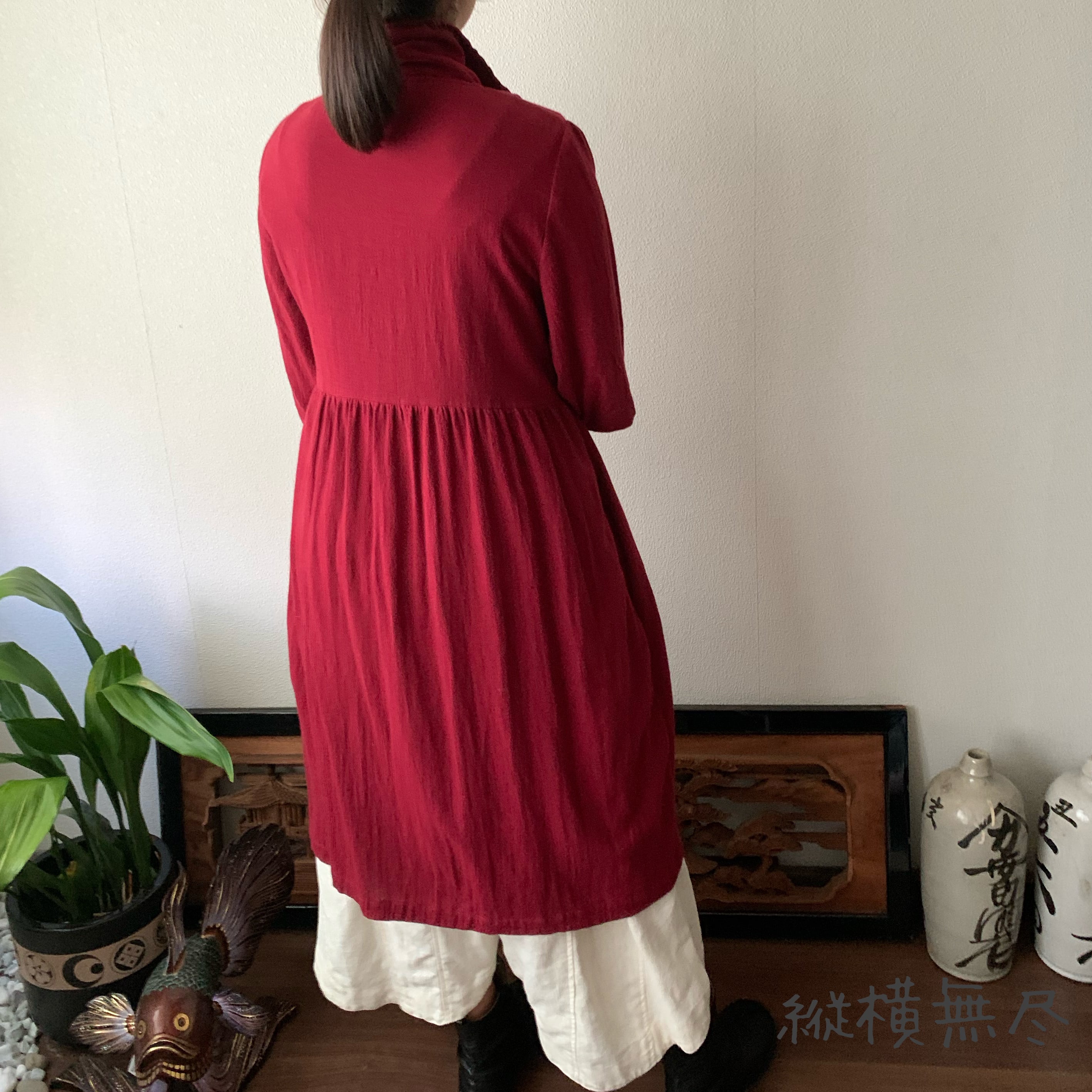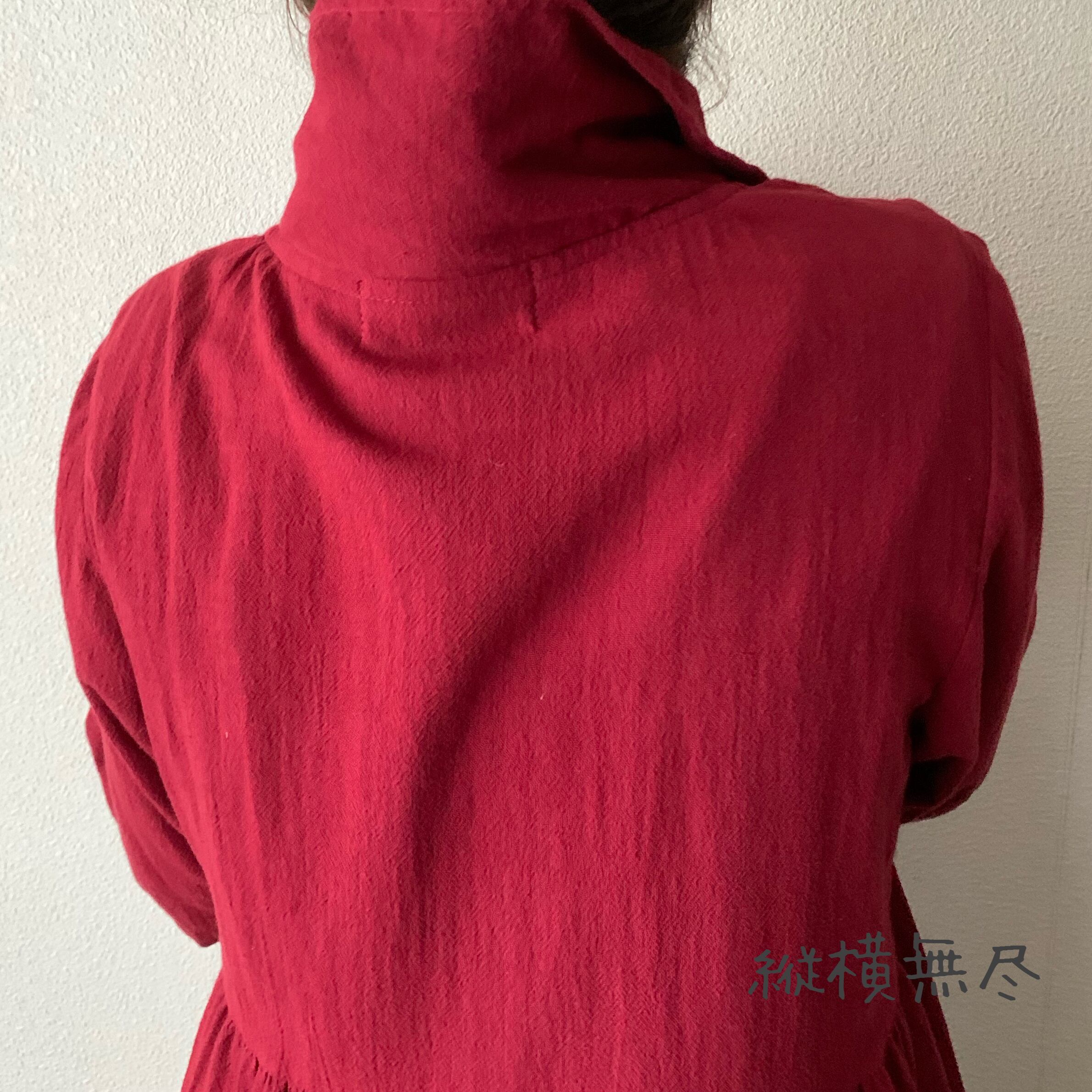 ハイカラーがかっこいい カシュクール前開きワンピース丈コットンブラウス 赤