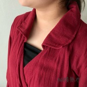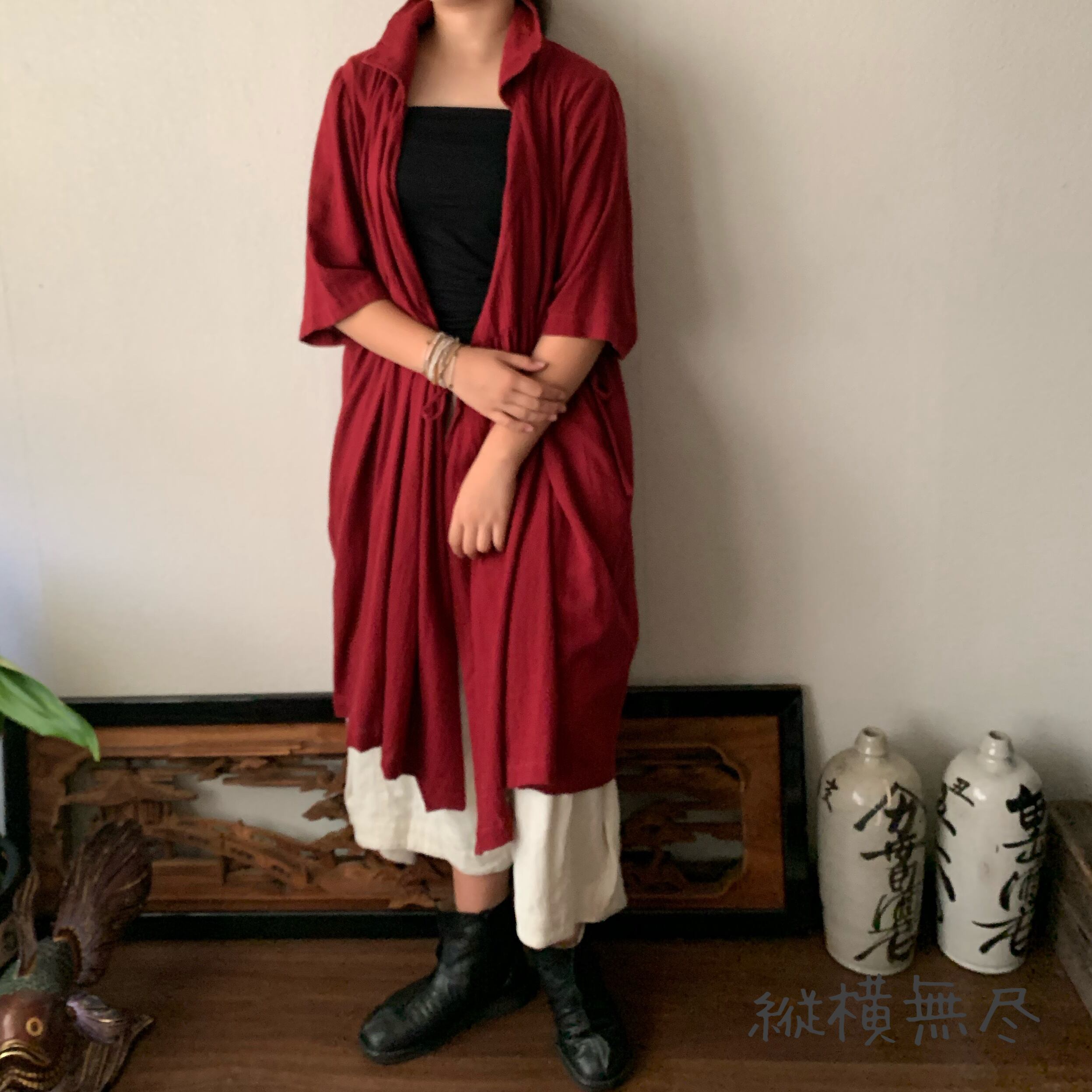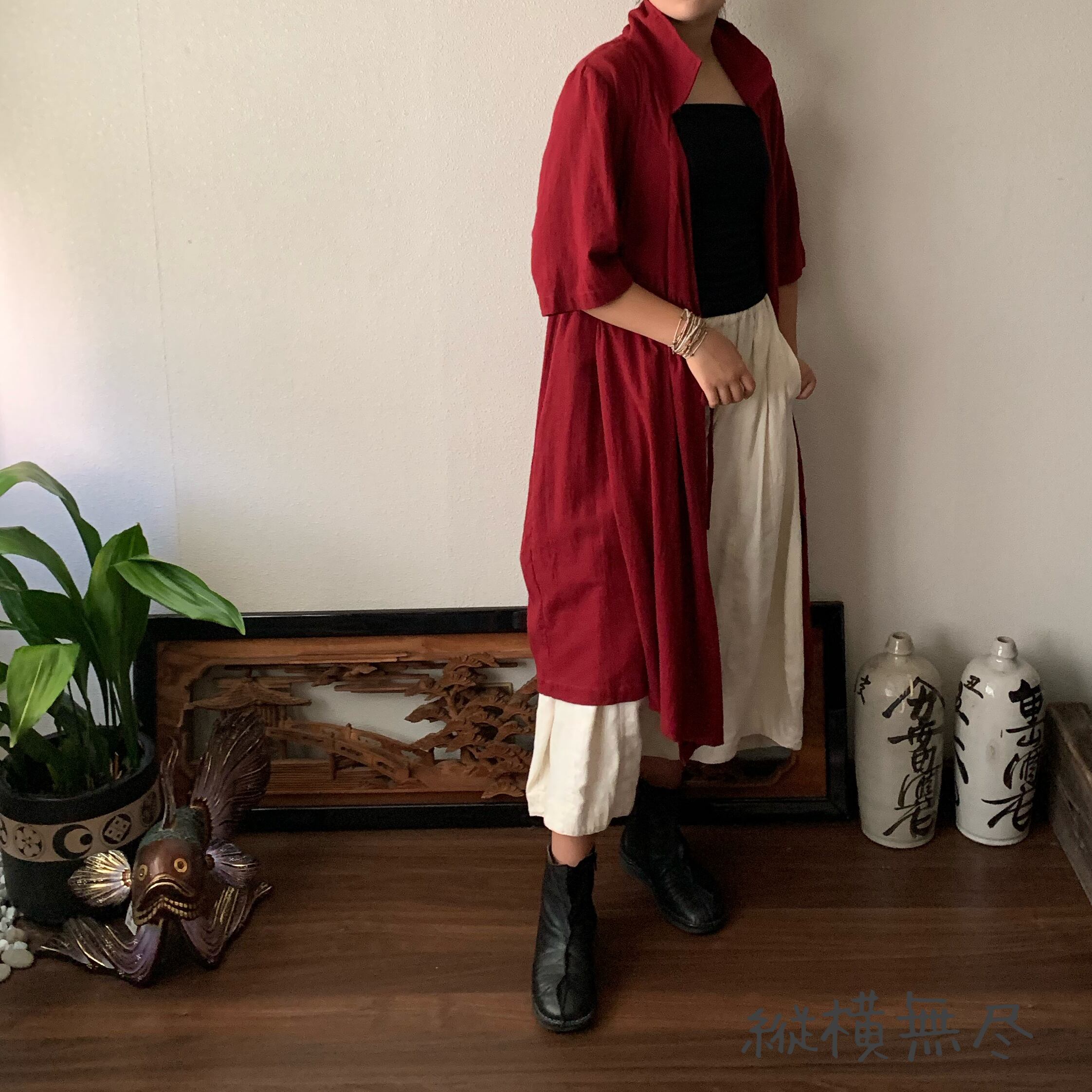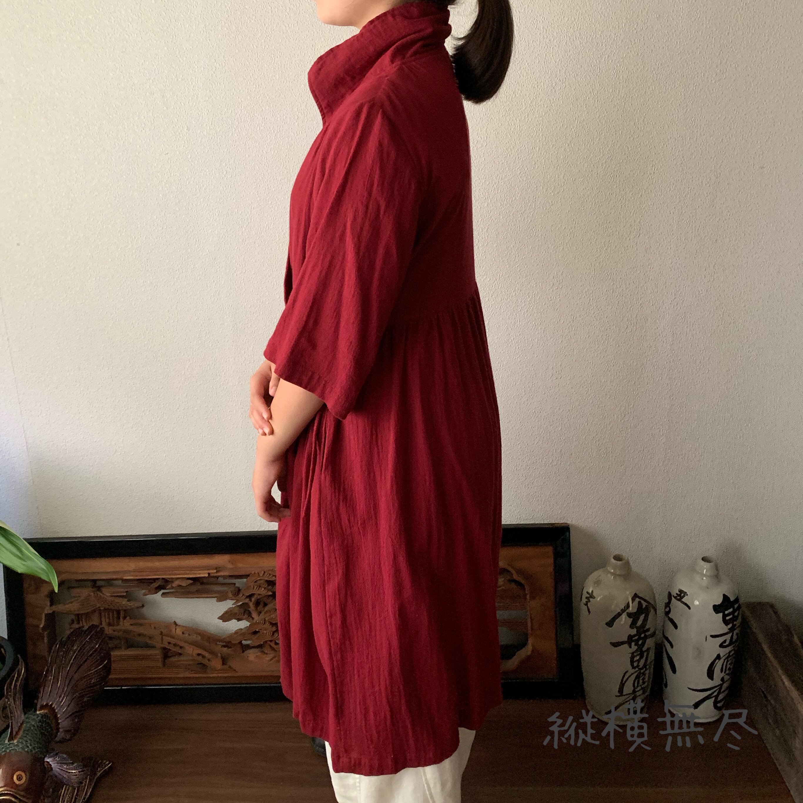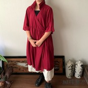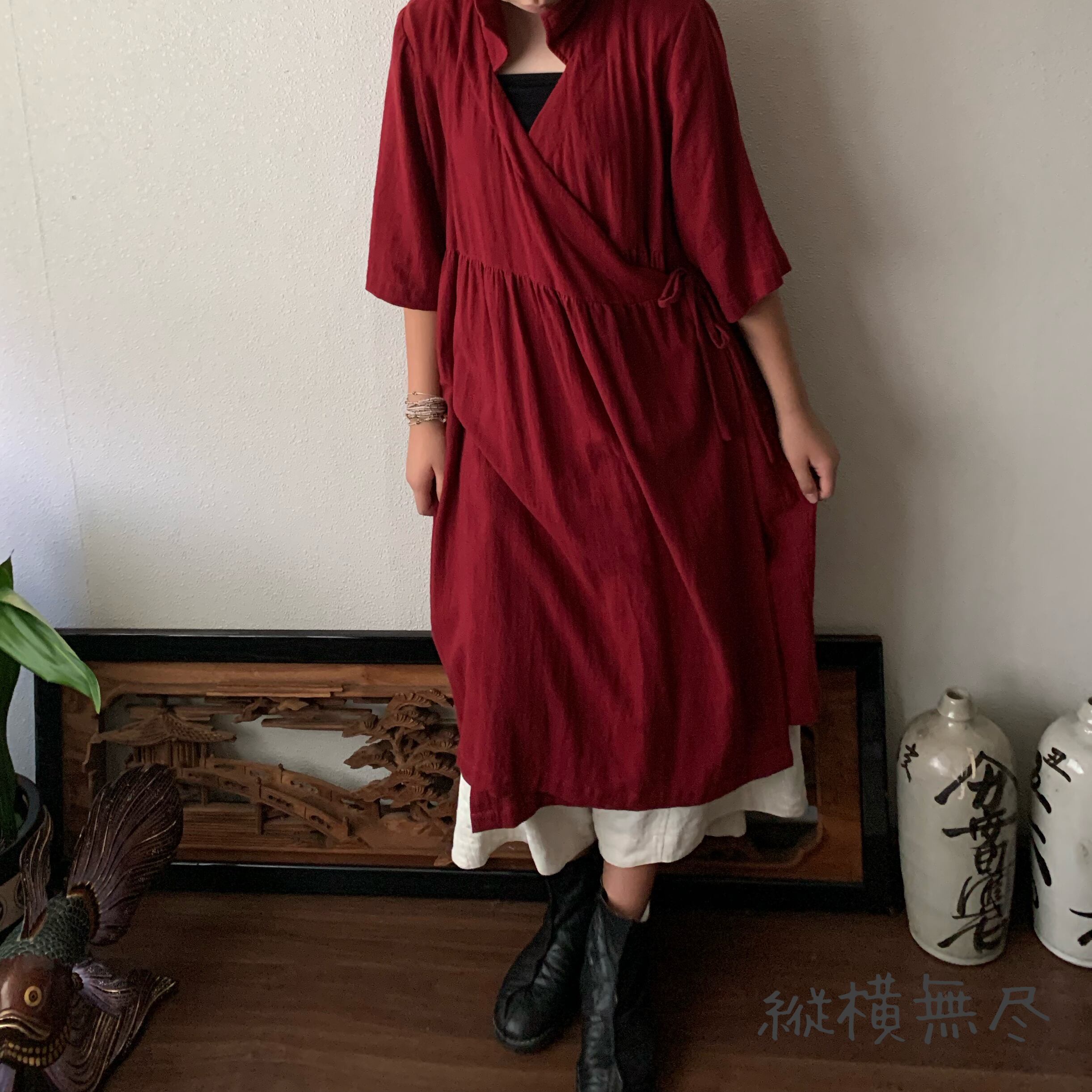 ハイカラーがかっこいい カシュクール前開きワンピース丈コットンブラウス 赤