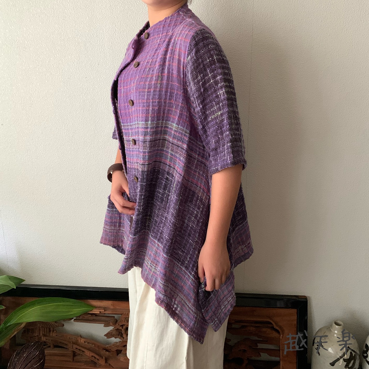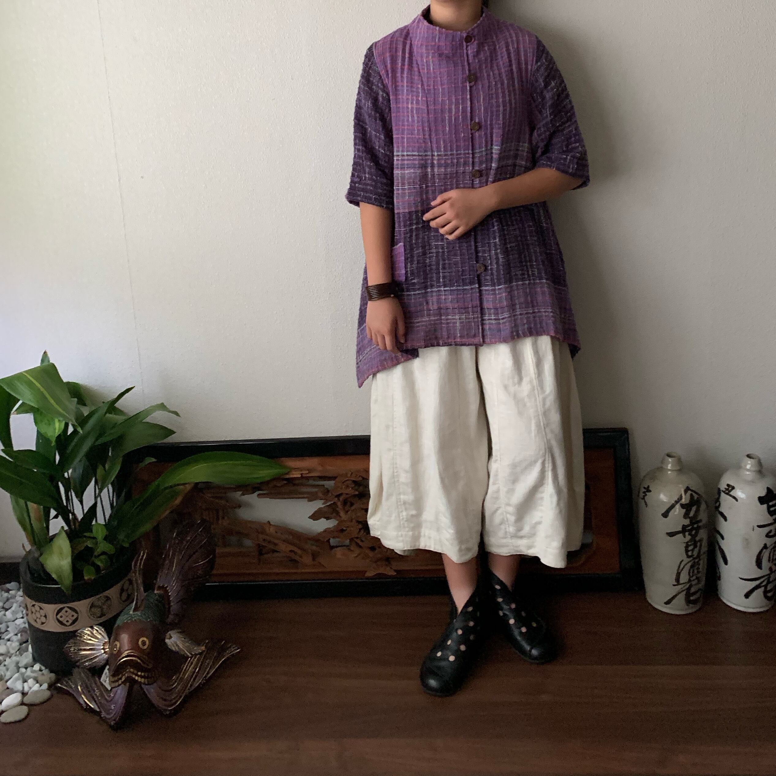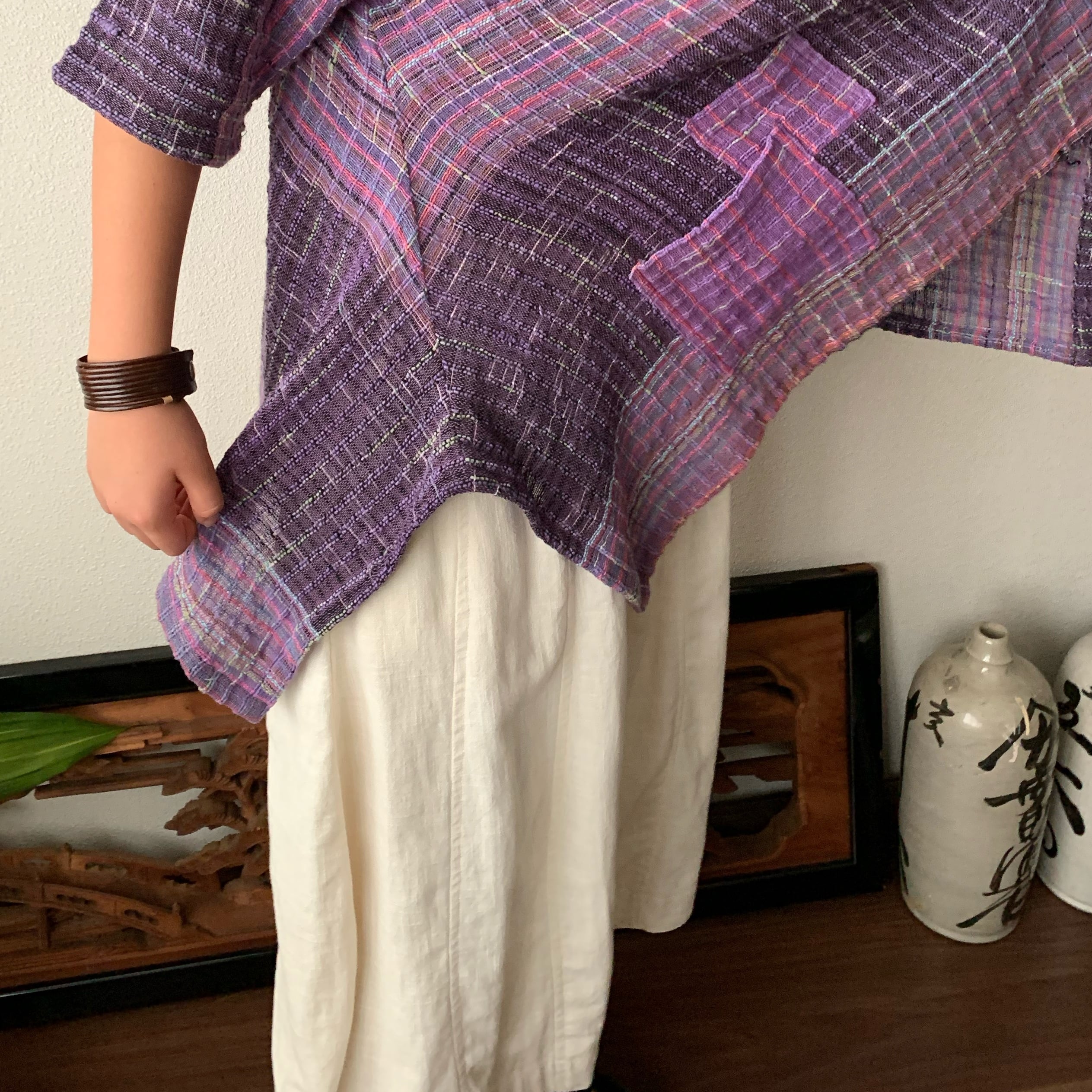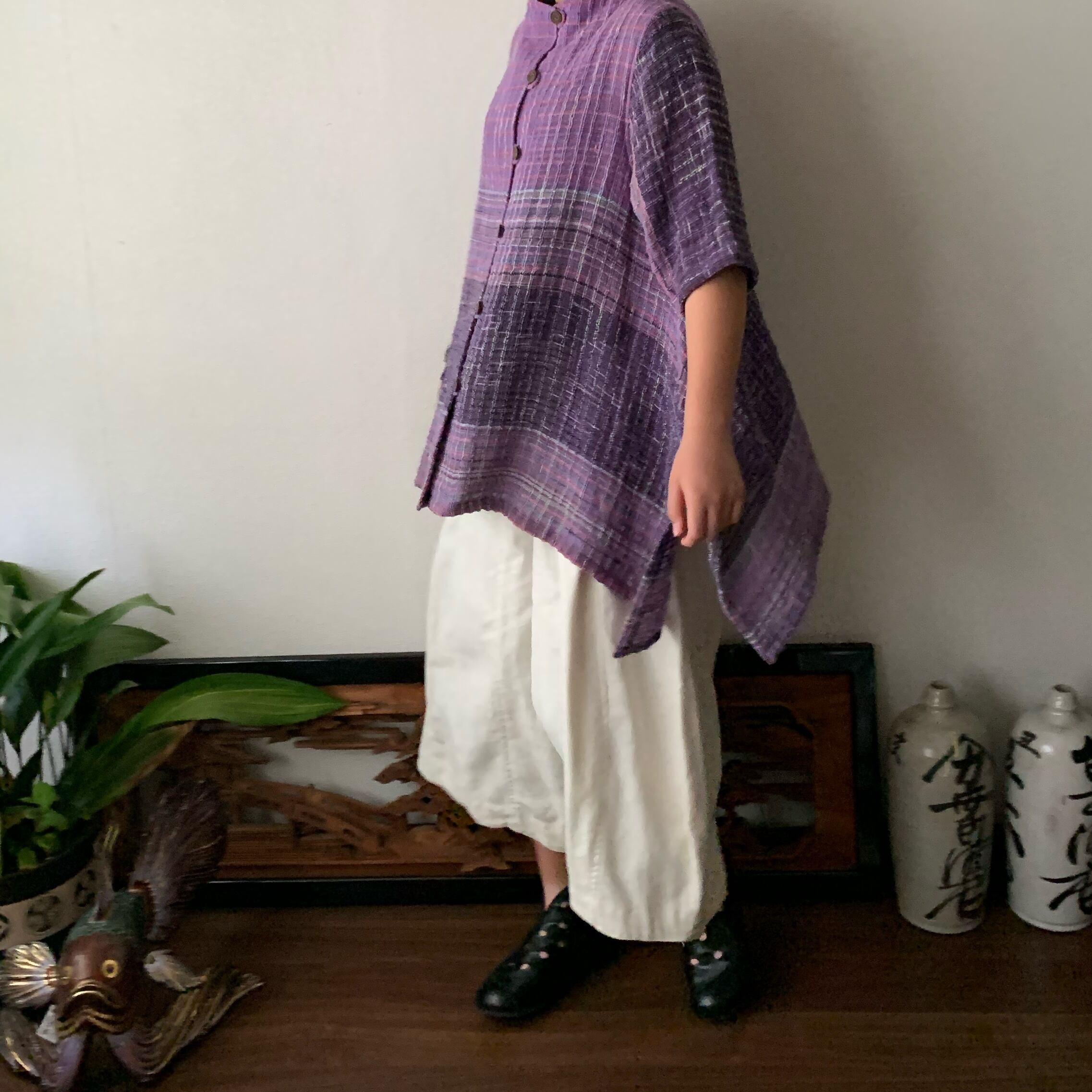 センターもサイドも裾もポケットもアシンメトリーの手織り綿7分袖ブラウス 裾サイドのスリットで躍動感のあるデザインで 紫絣