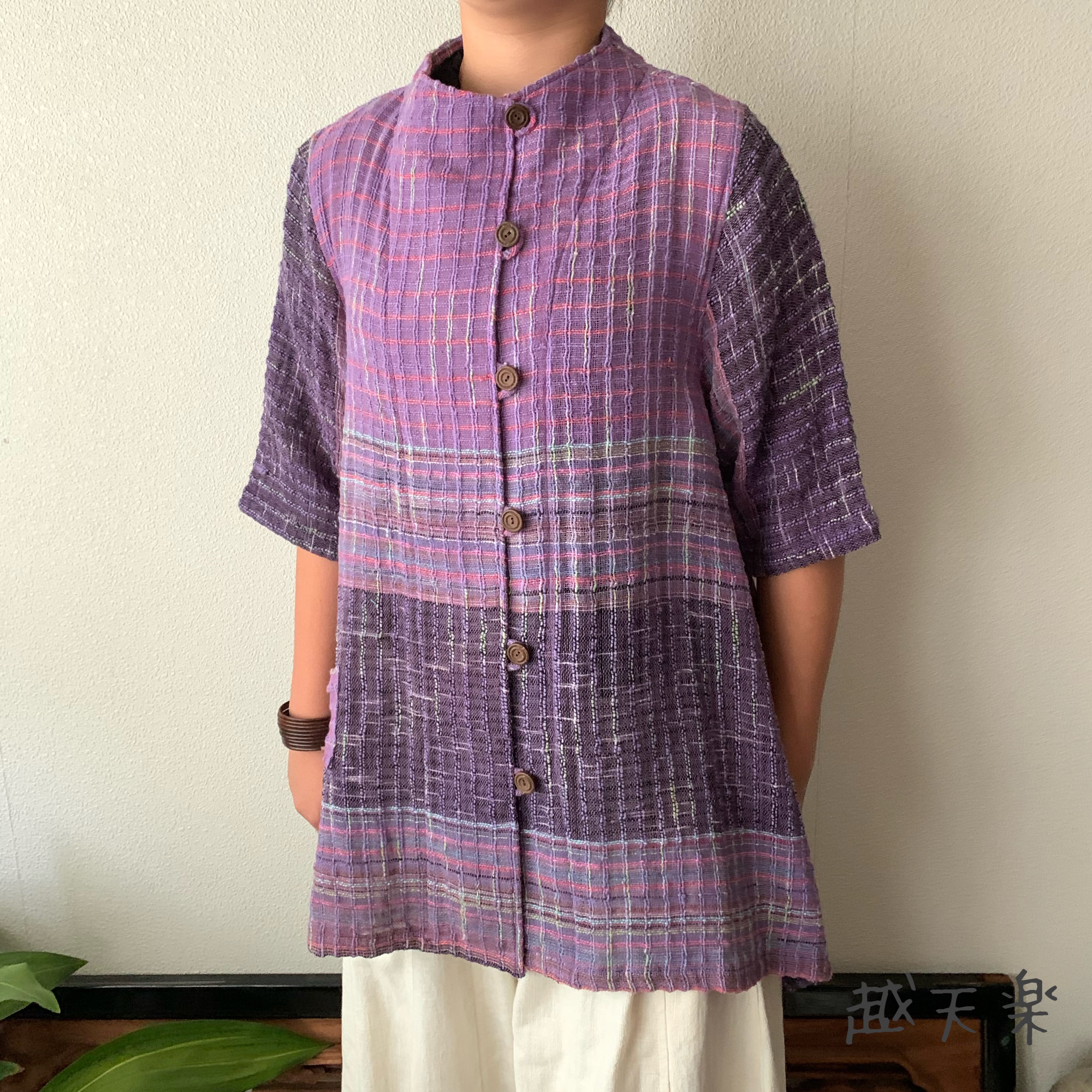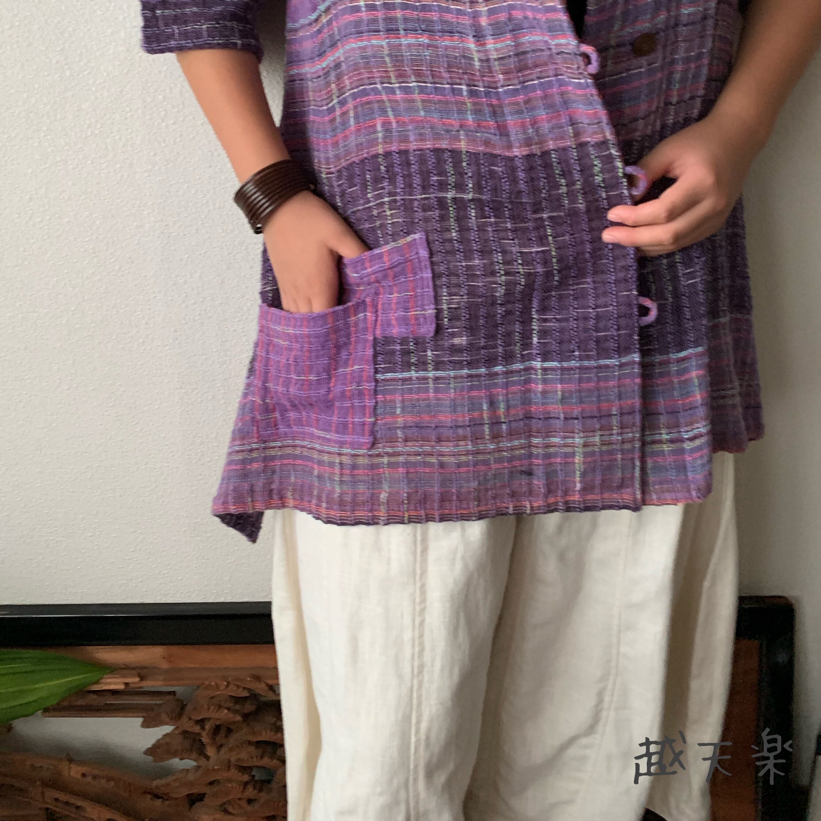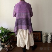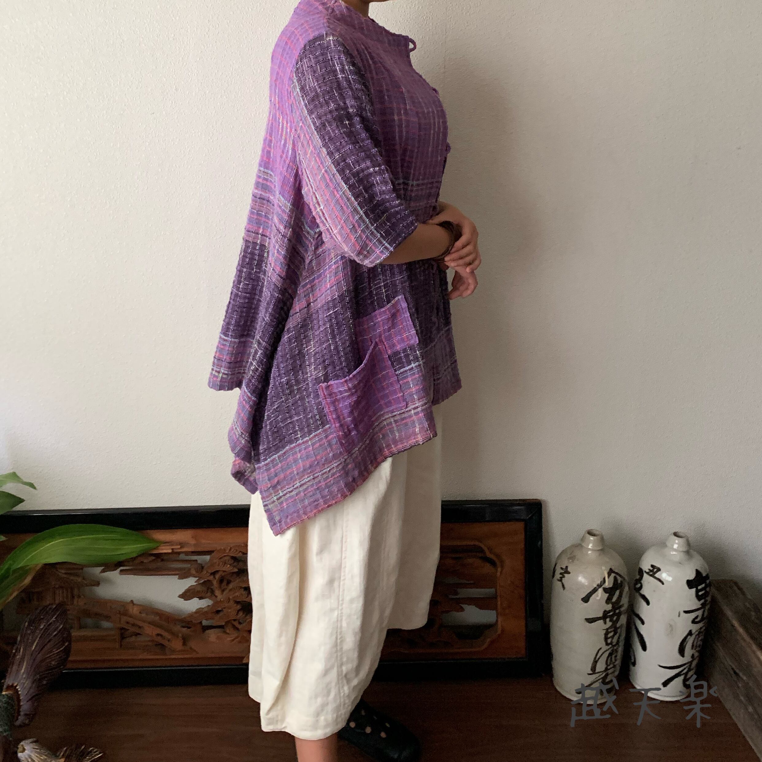 センターもサイドも裾もポケットもアシンメトリーの手織り綿7分袖ブラウス 裾サイドのスリットで躍動感のあるデザインで 紫絣