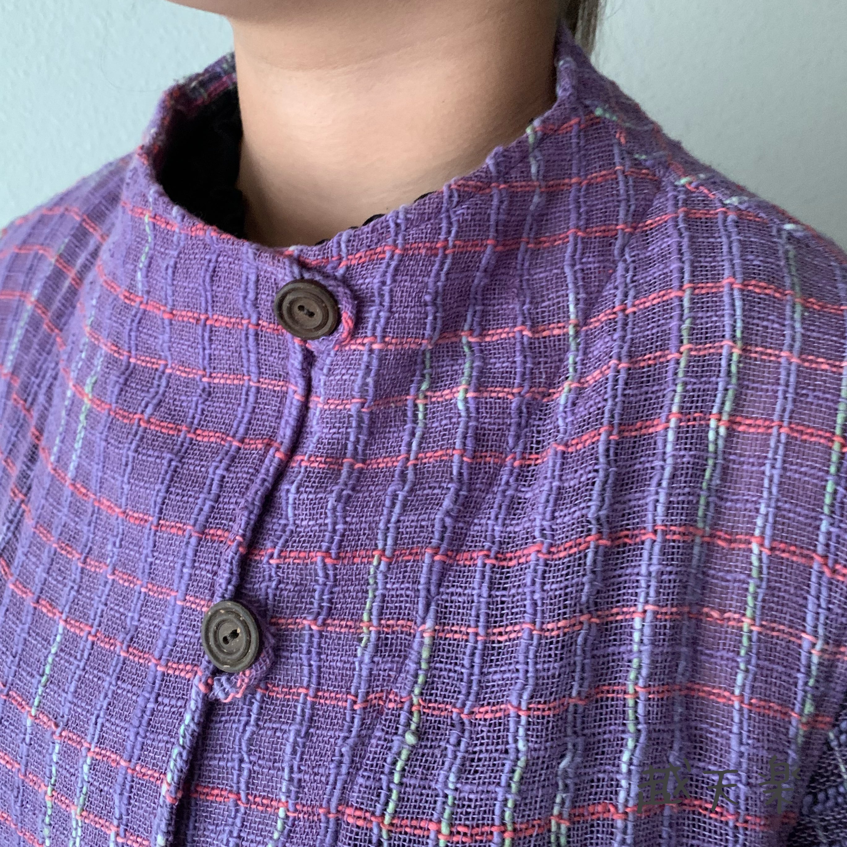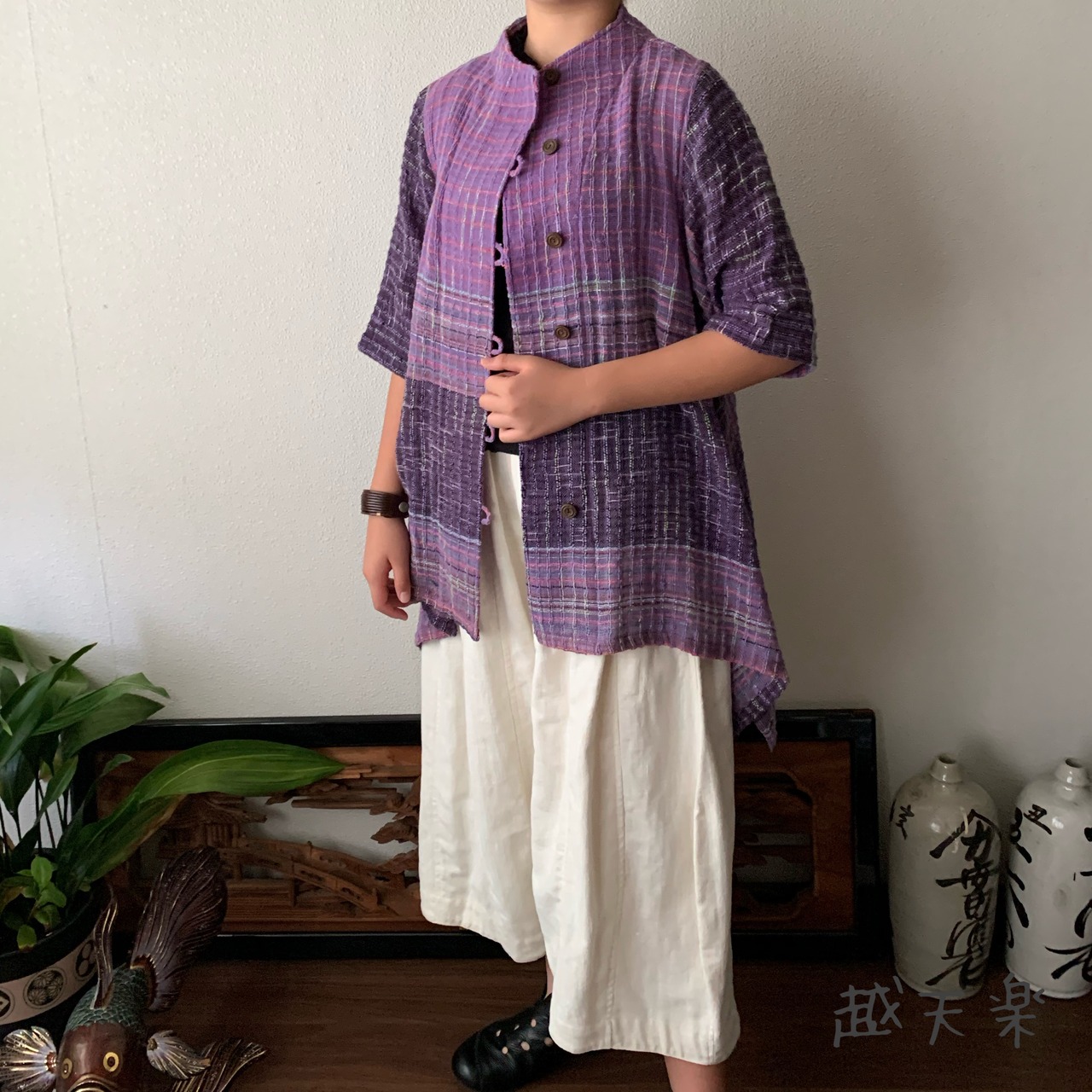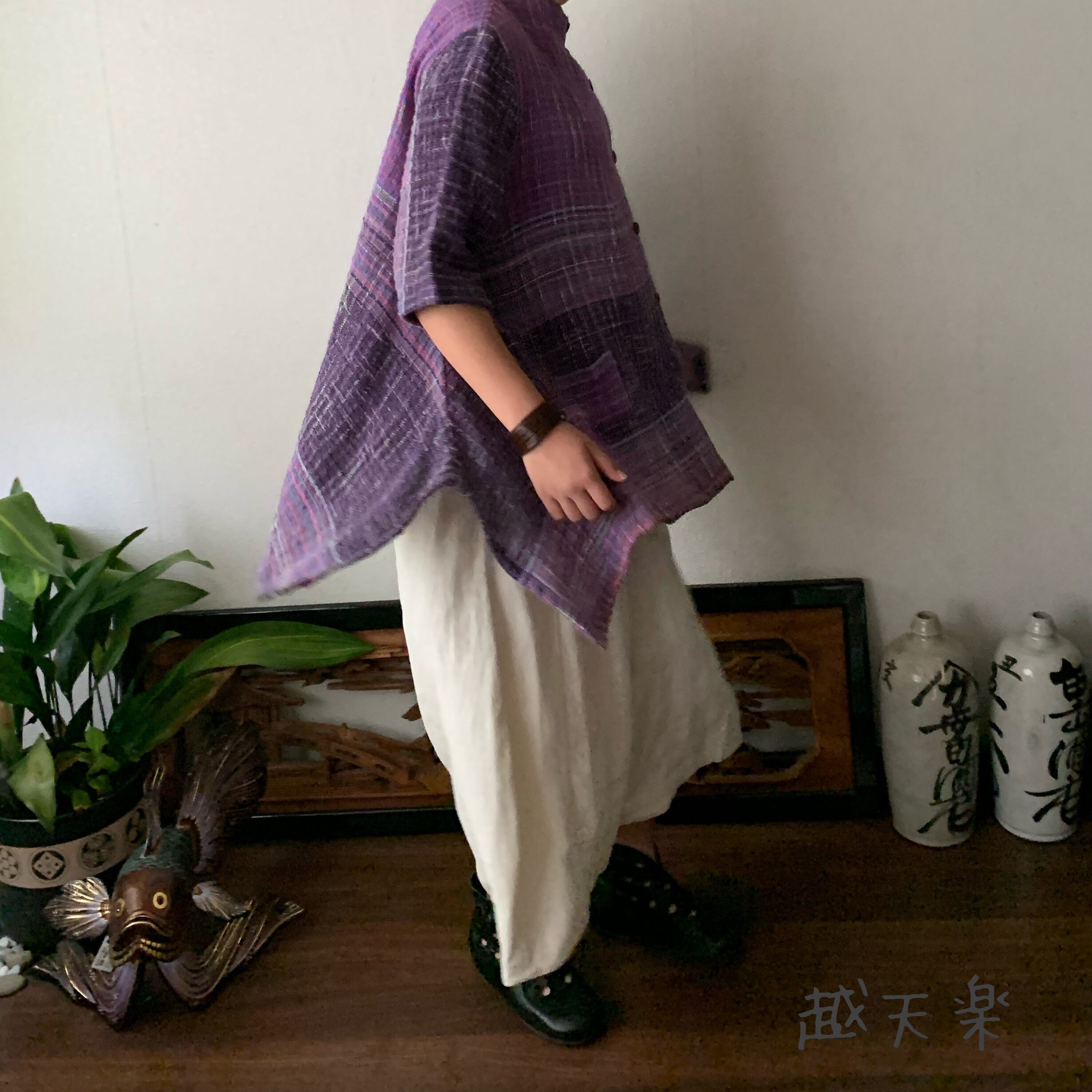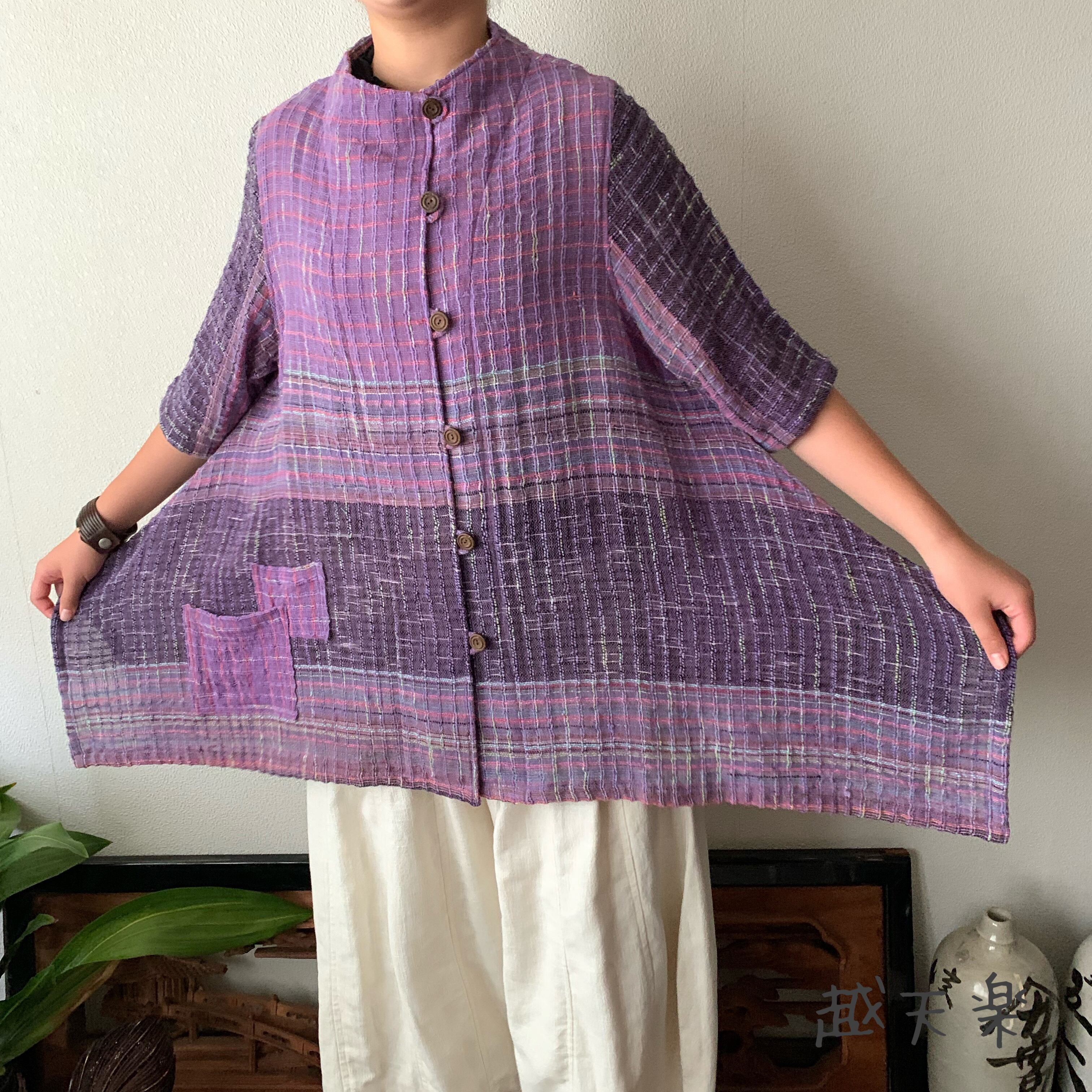 センターもサイドも裾もポケットもアシンメトリーの手織り綿7分袖ブラウス 裾サイドのスリットで躍動感のあるデザインで 紫絣