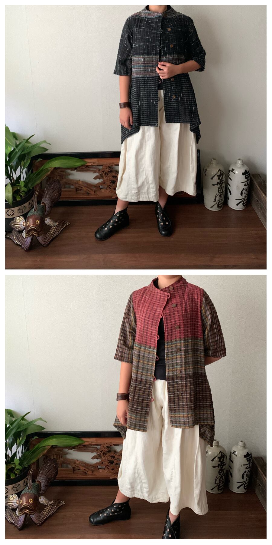 『センターもサイドも裾もポケットもアシンメトリーの手織り綿7分袖ブラウス 裾サイドのスリットで躍動感のあるデザインで』
