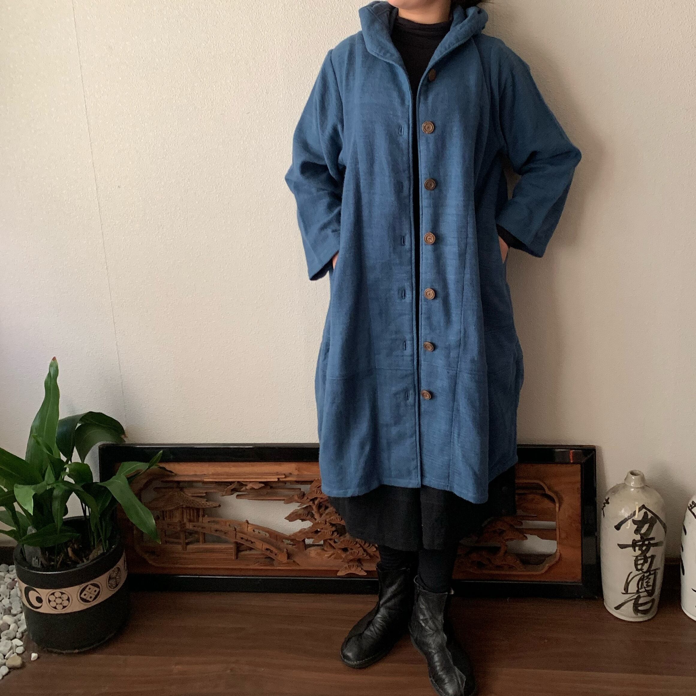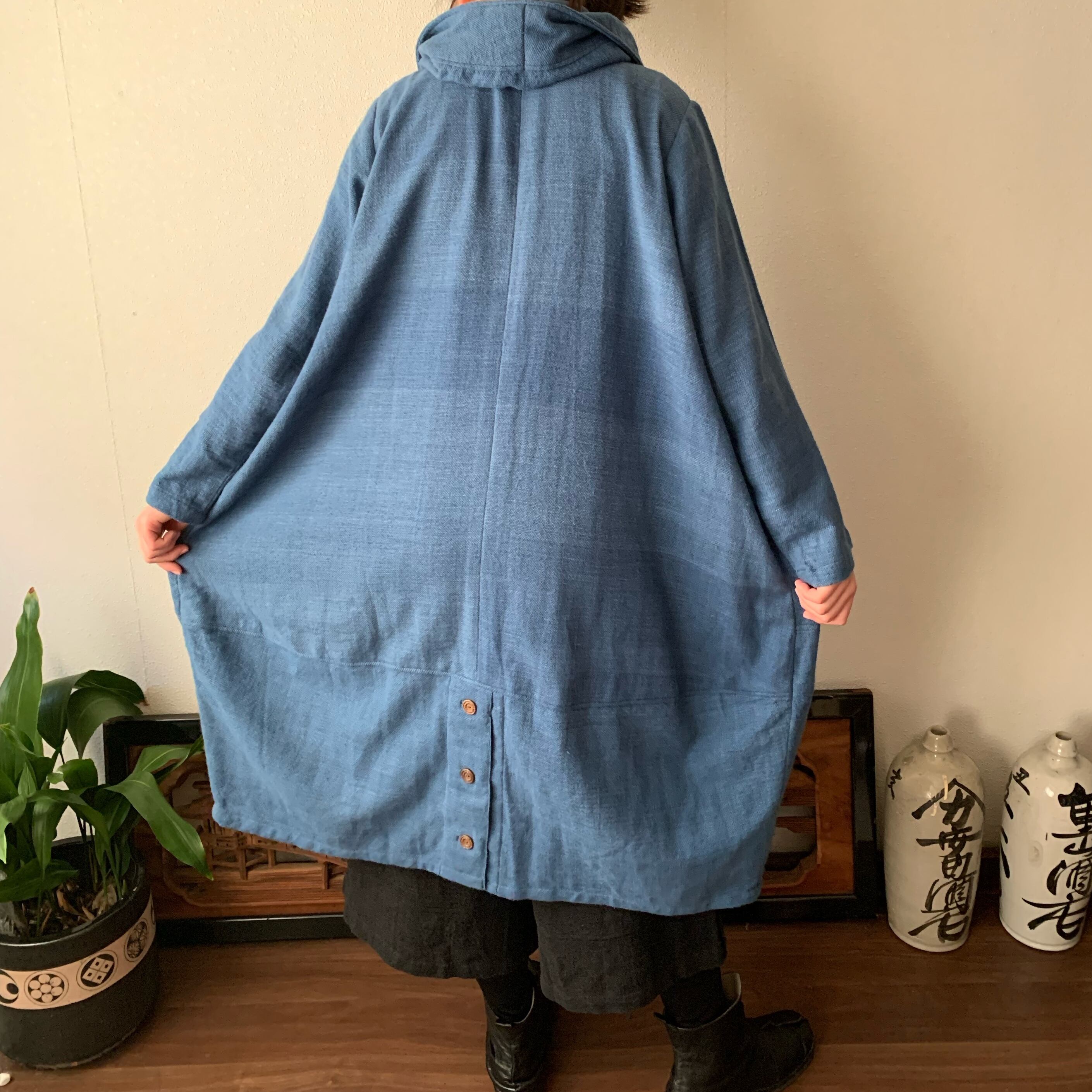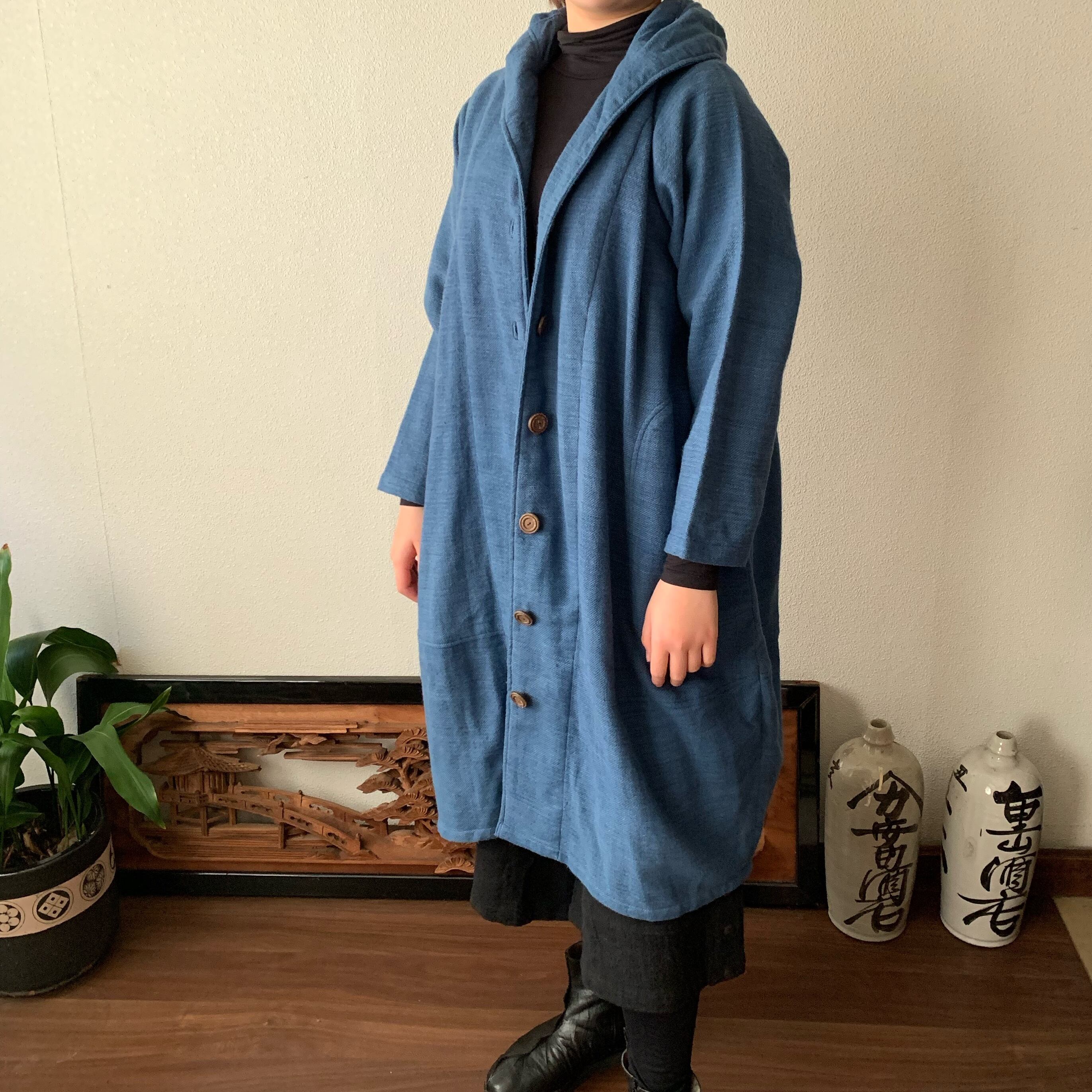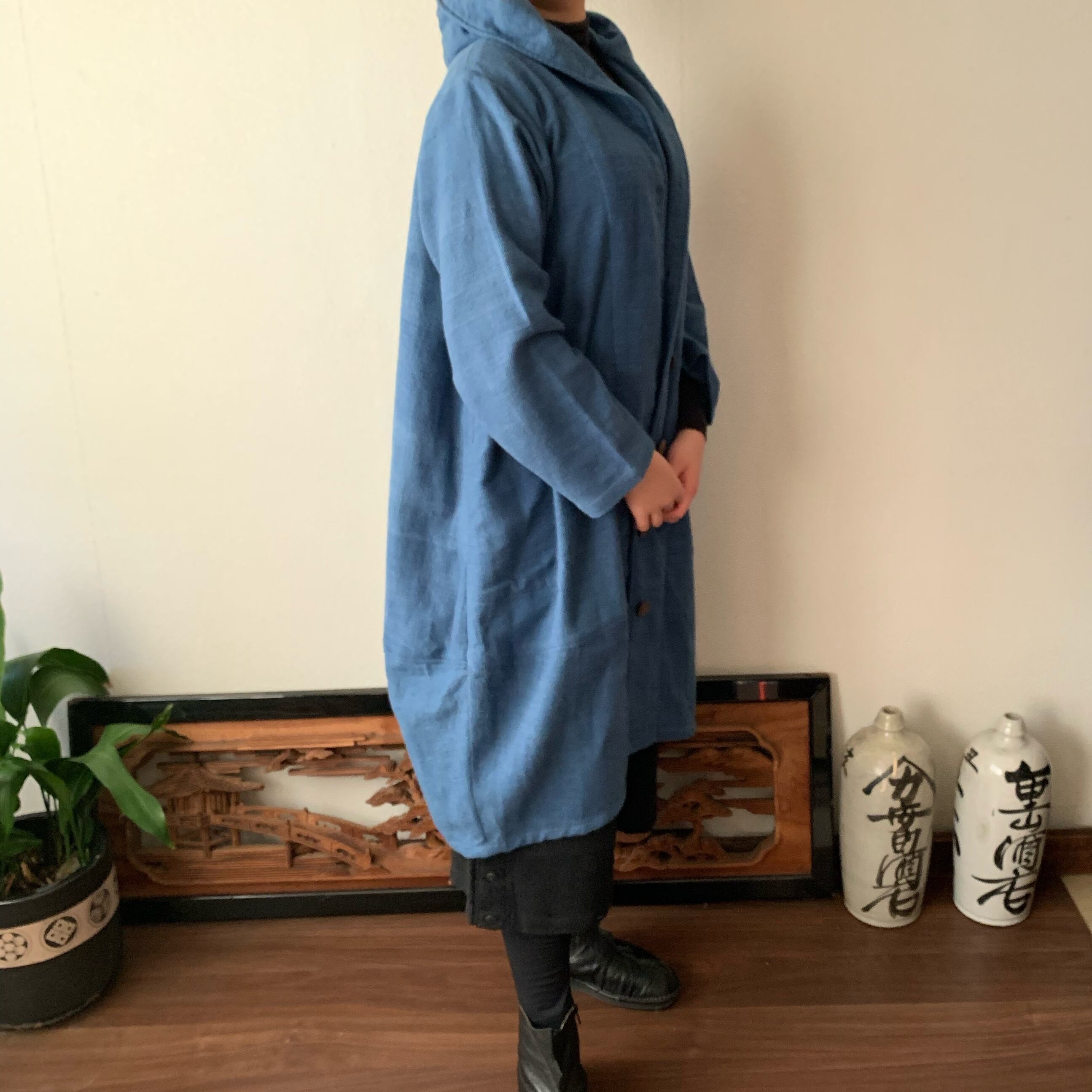 フード風襟の手織り綿バルーンコート 秋冬に、嵐山のお店で一番人気で裾切り替えもキュートなコート 空色(薄いブルー)絣