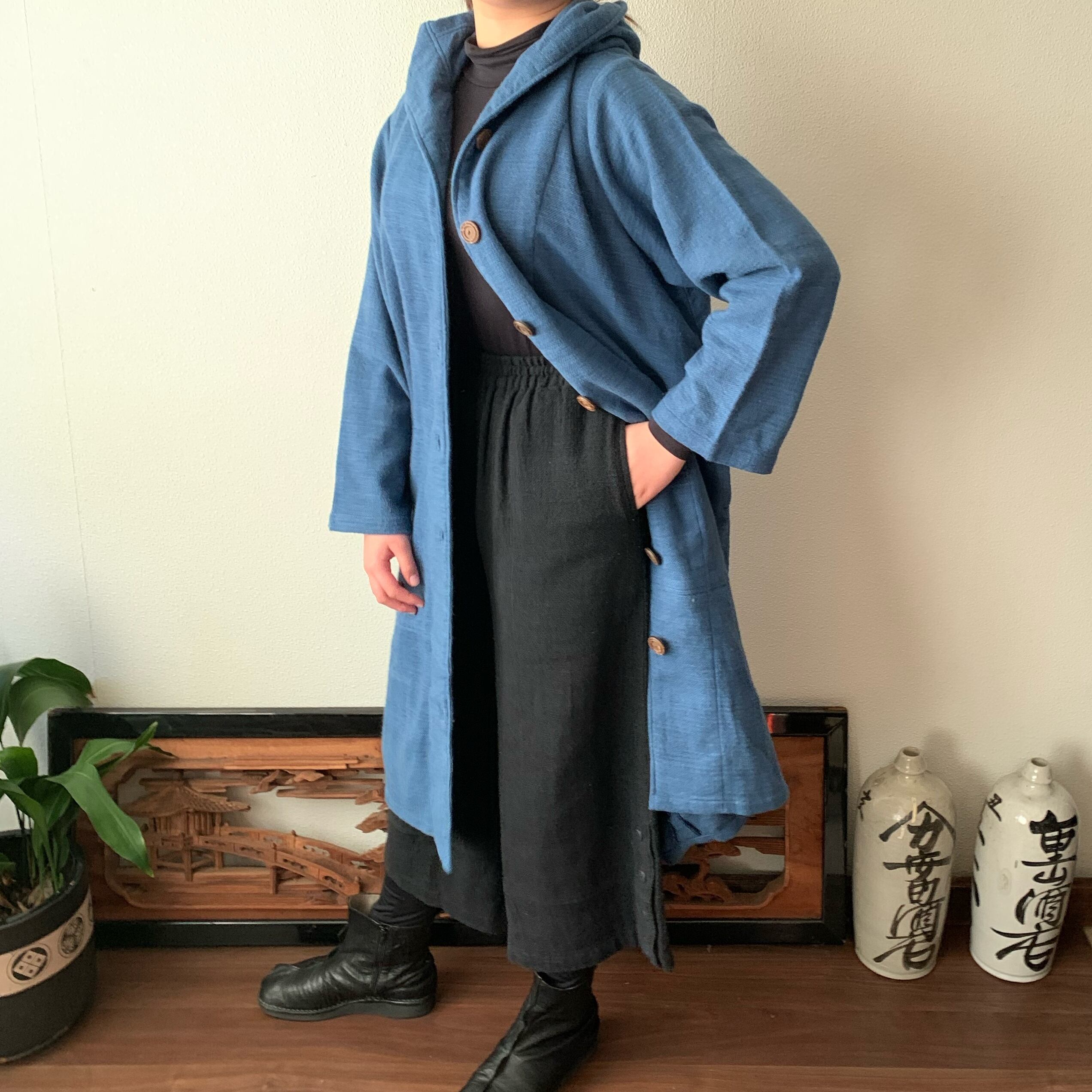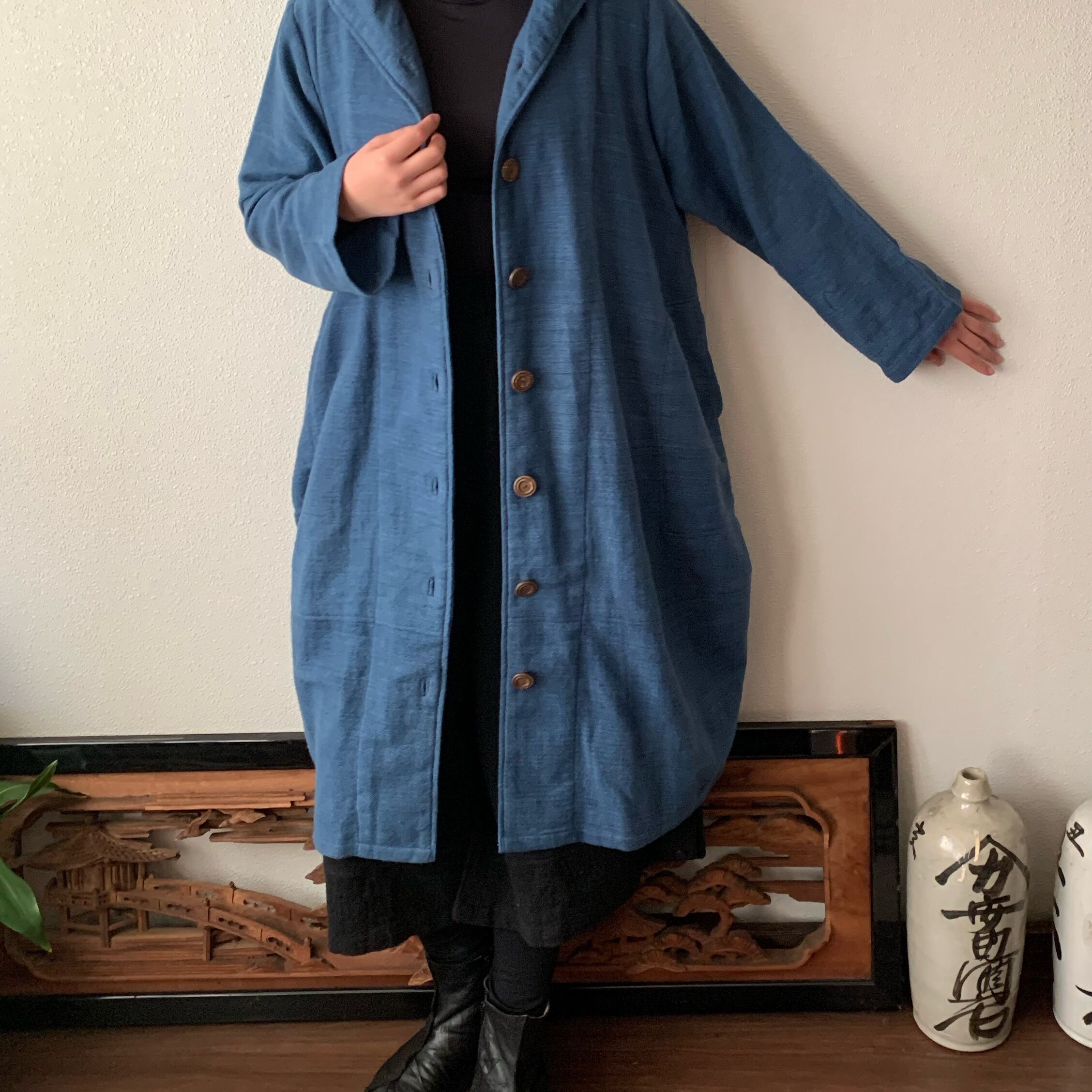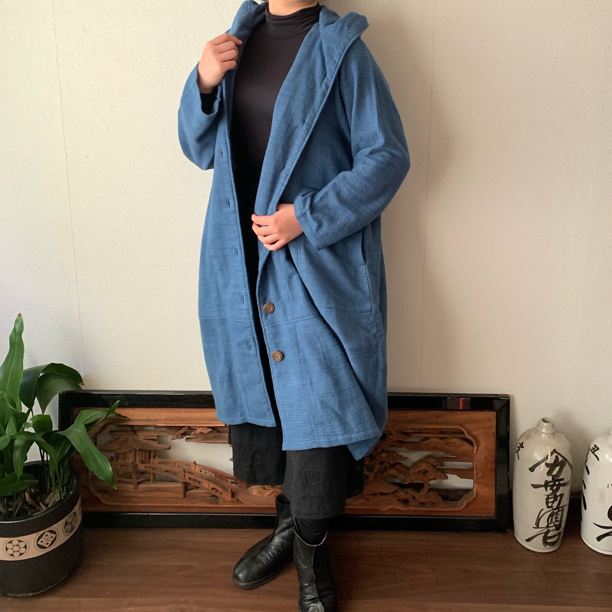 フード風襟の手織り綿バルーンコート 秋冬に、嵐山のお店で一番人気で裾切り替えもキュートなコート 空色(薄いブルー)絣