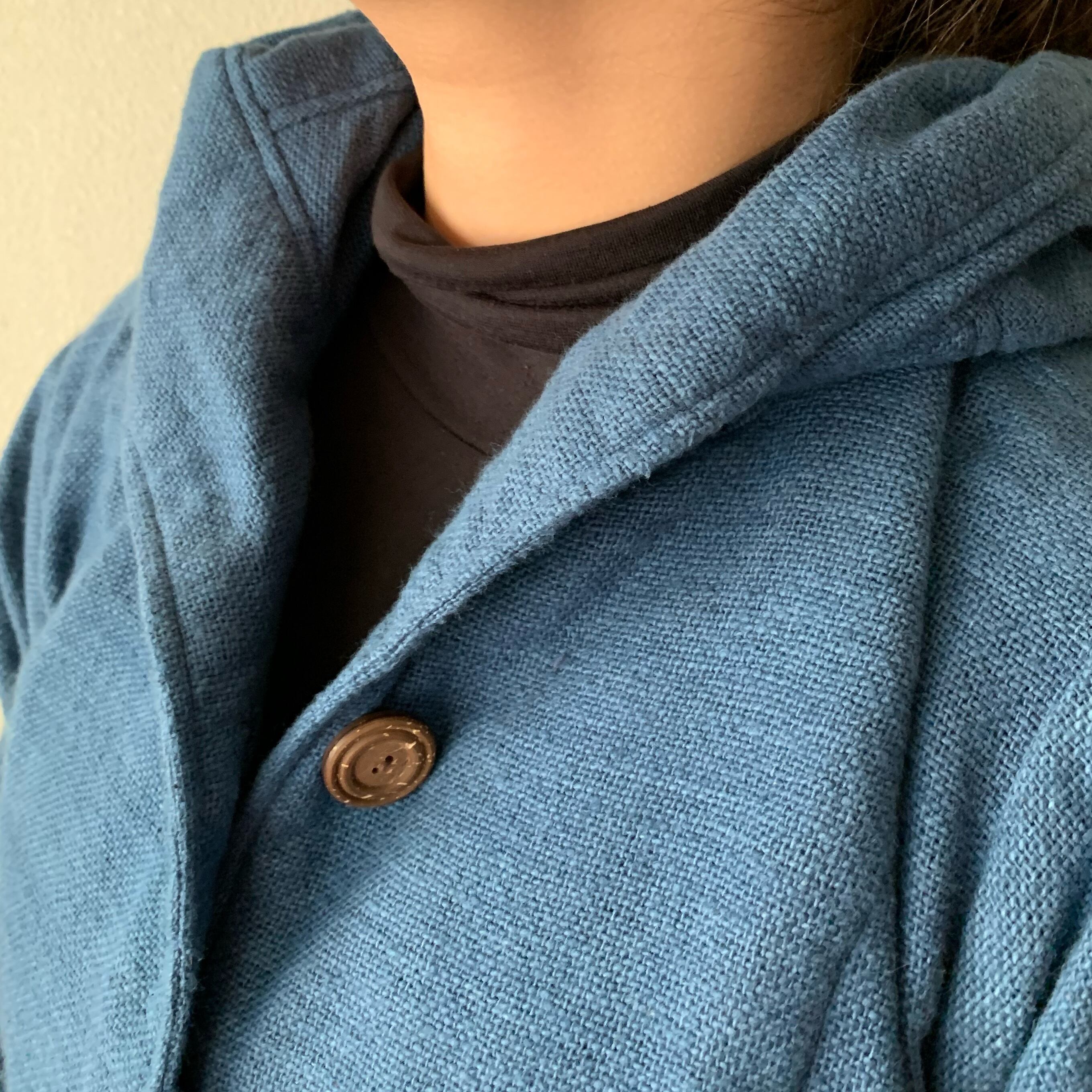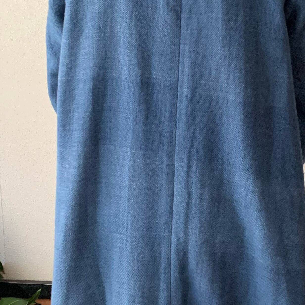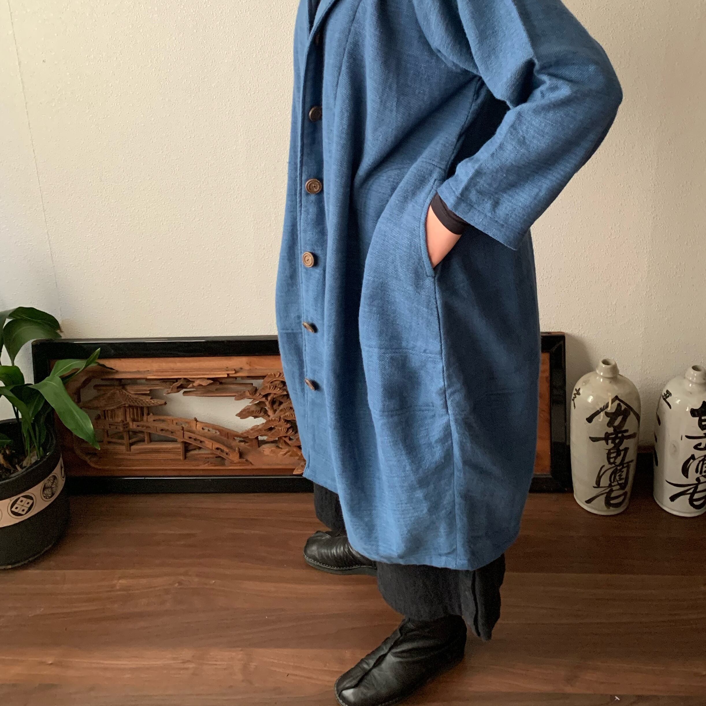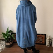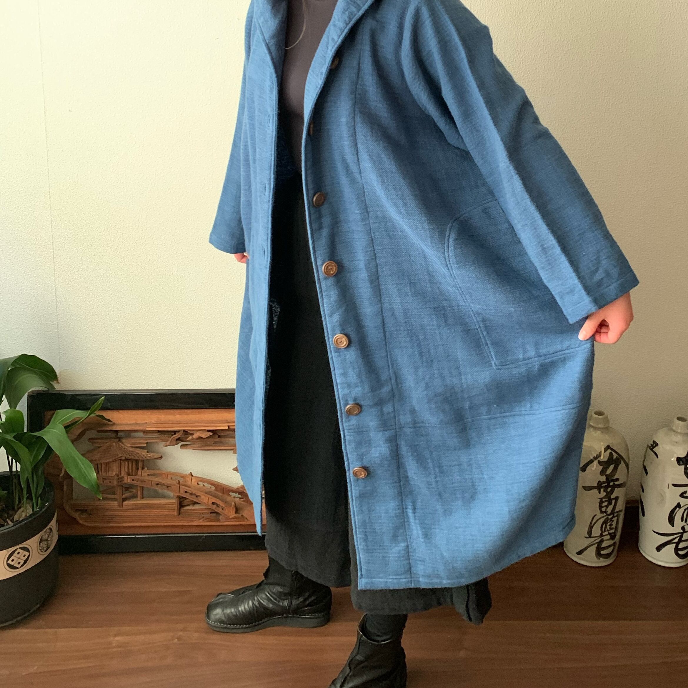フード風襟の手織り綿バルーンコート 秋冬に、嵐山のお店で一番人気で裾切り替えもキュートなコート 空色(薄いブルー)絣