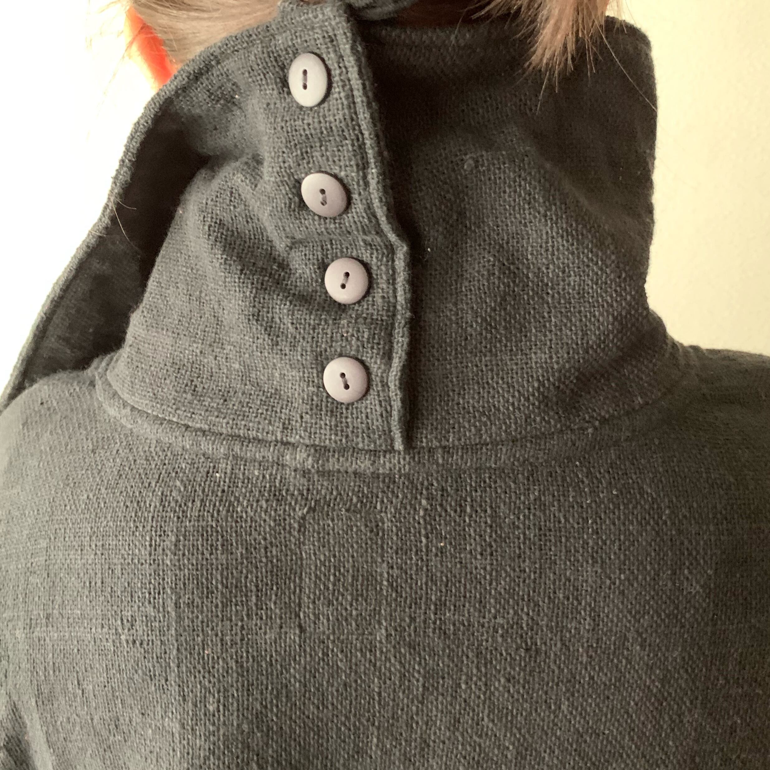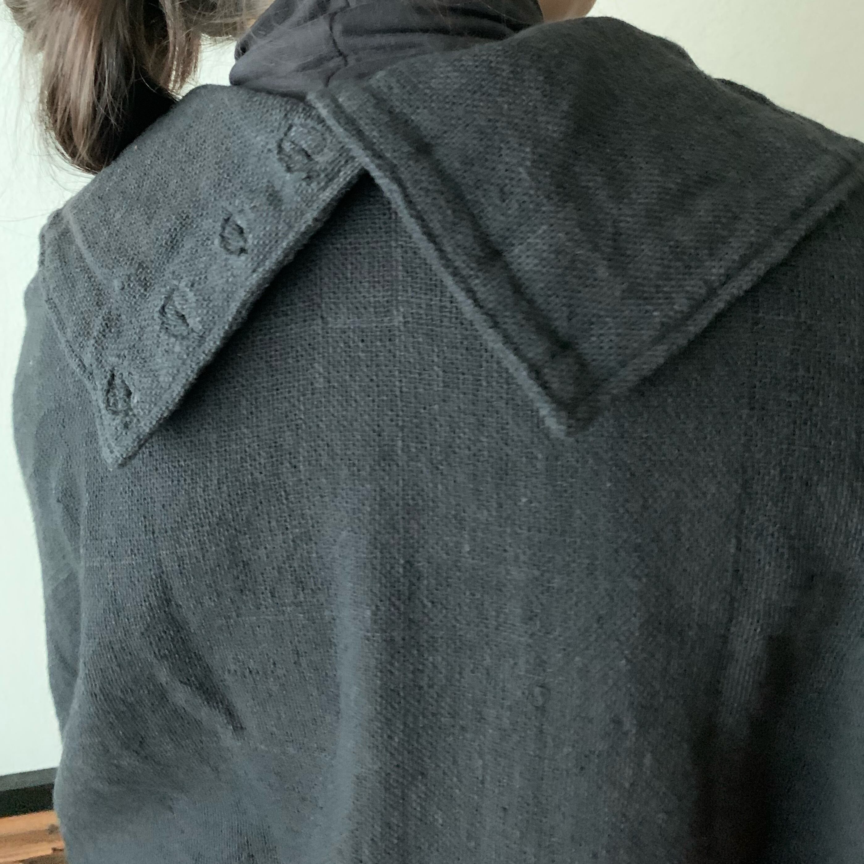 もちろん越天楽は後ろ姿にも手を抜きません。襟の後ろ部分には4つボタンを付けて襟を立てたときはよりモードっぽさを際立たせ、ボタンを外して折るとカジュアルなスタイルに変わります。