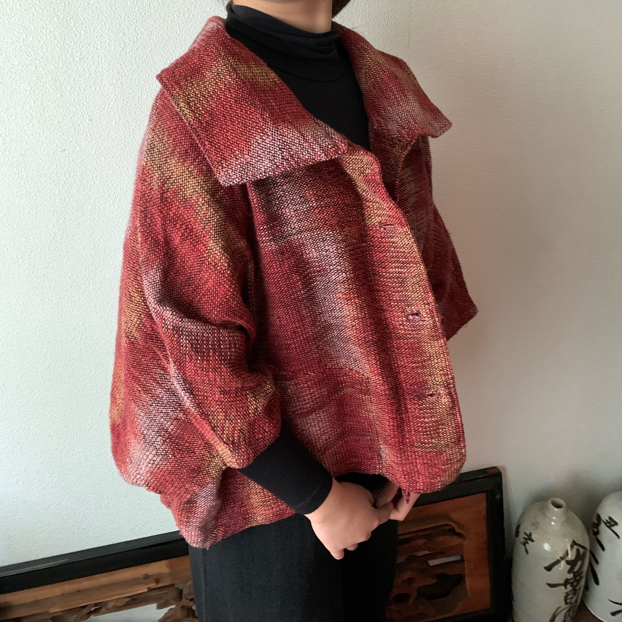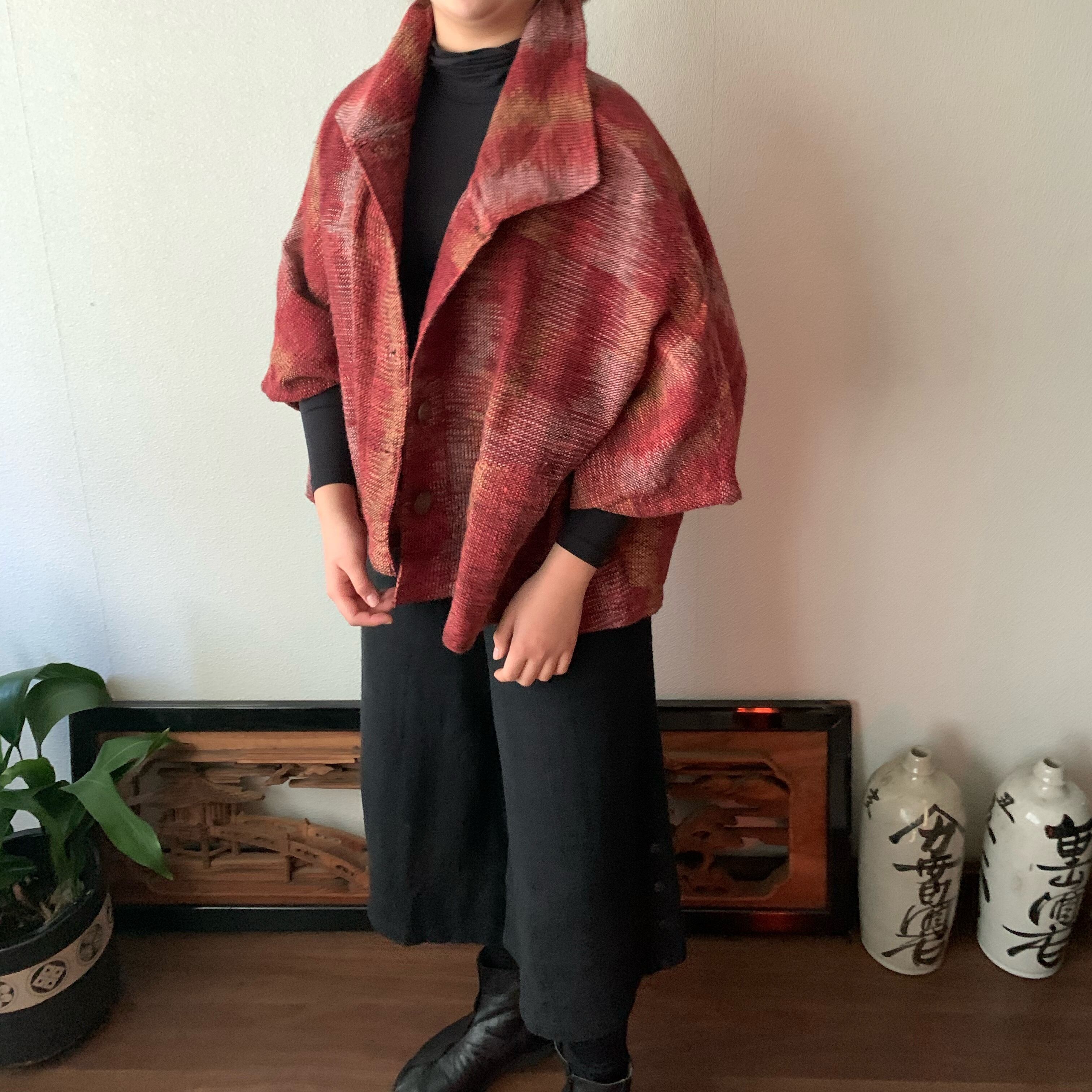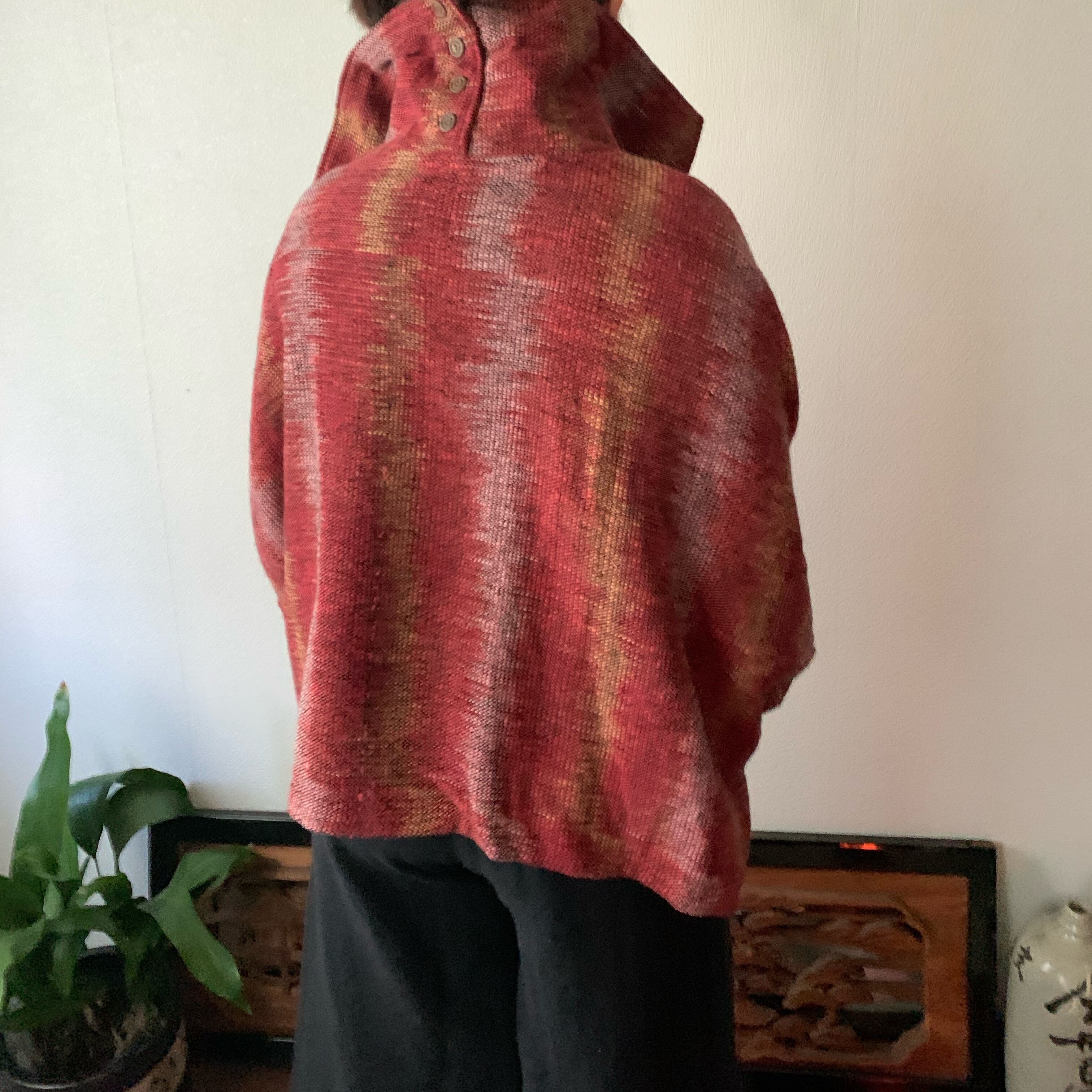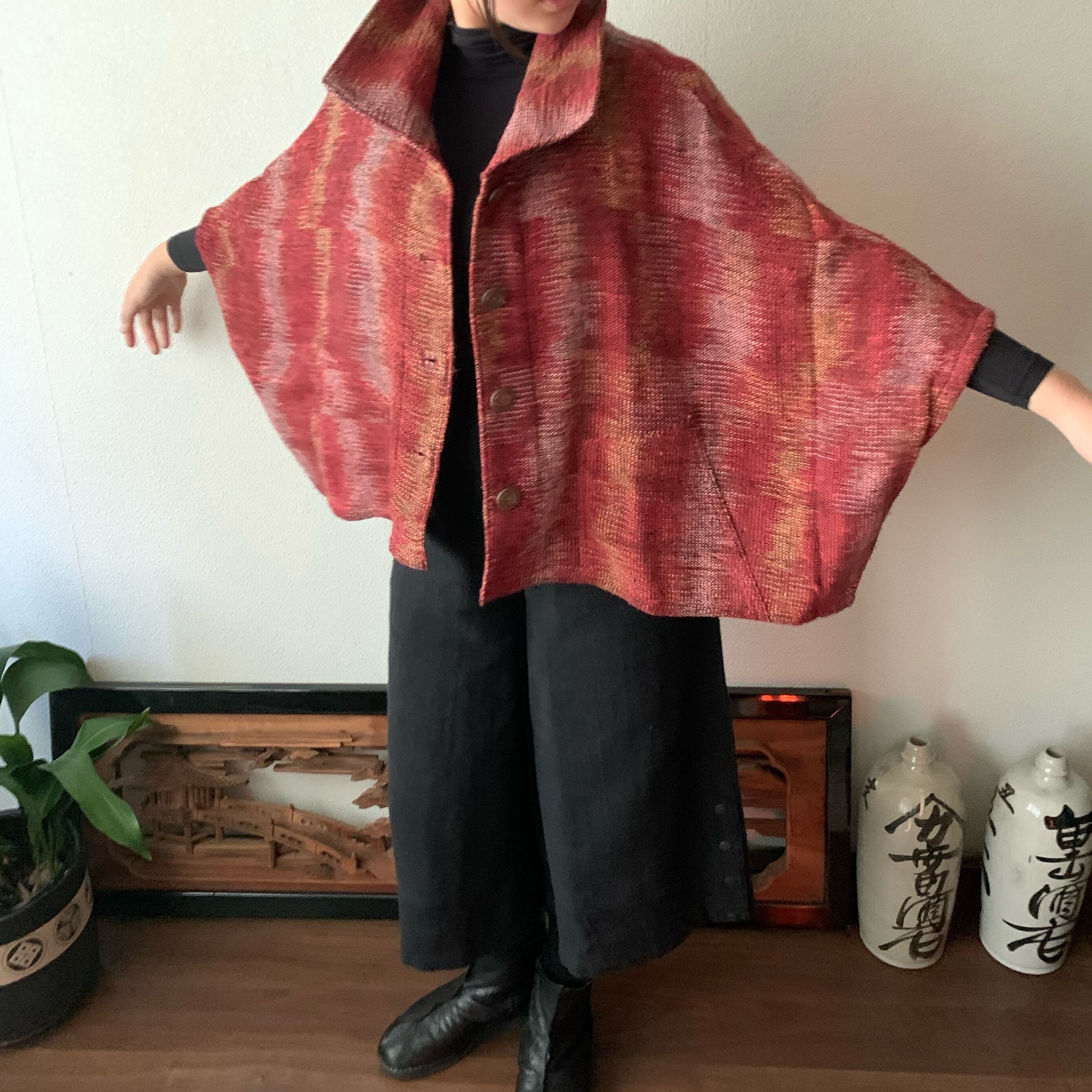 さっと羽織るだけで雰囲気の出るケープ風手織り綿ブラウス 袖なしワイドなのに着ると絶妙のかっこいい落ち感がスパイス 金赤絣