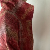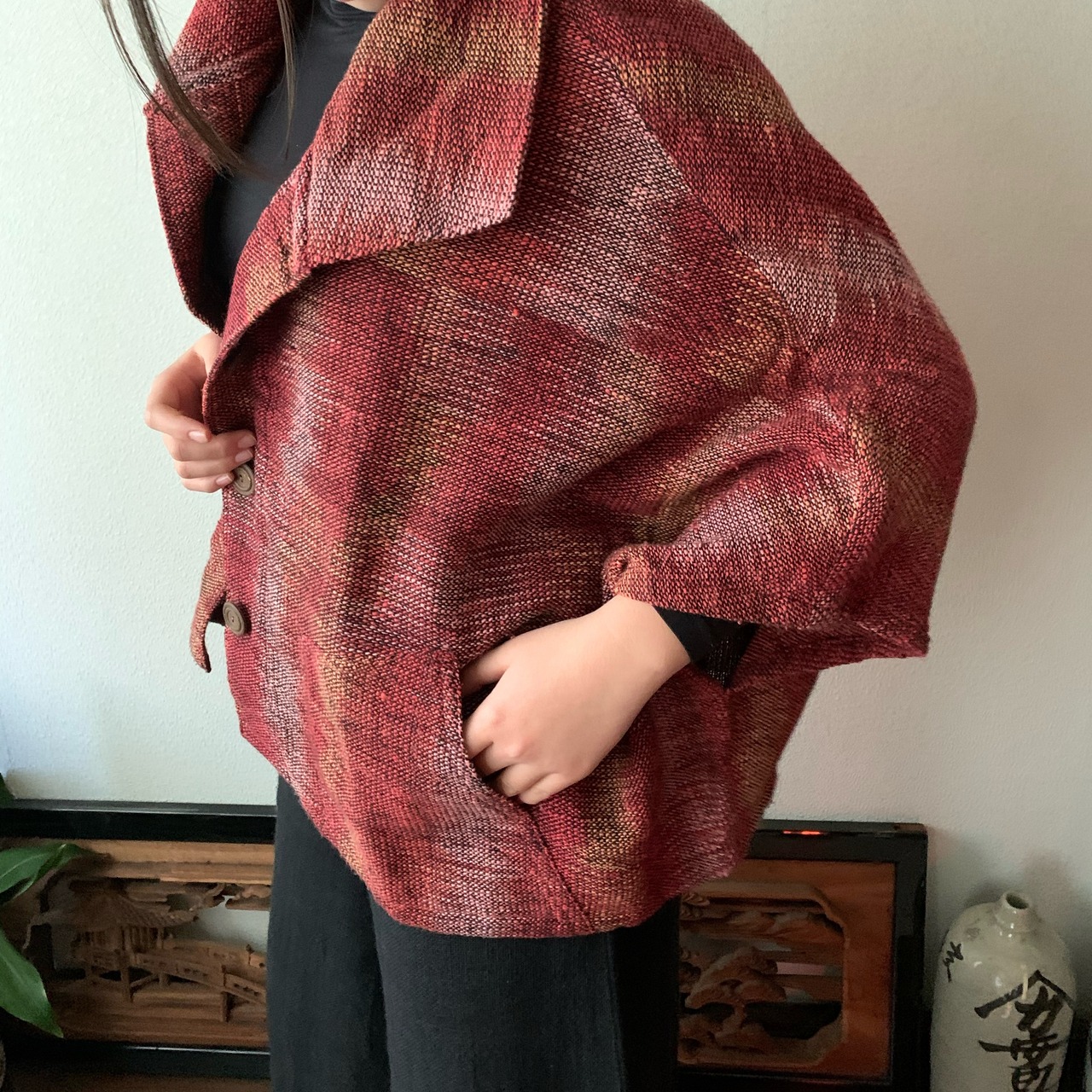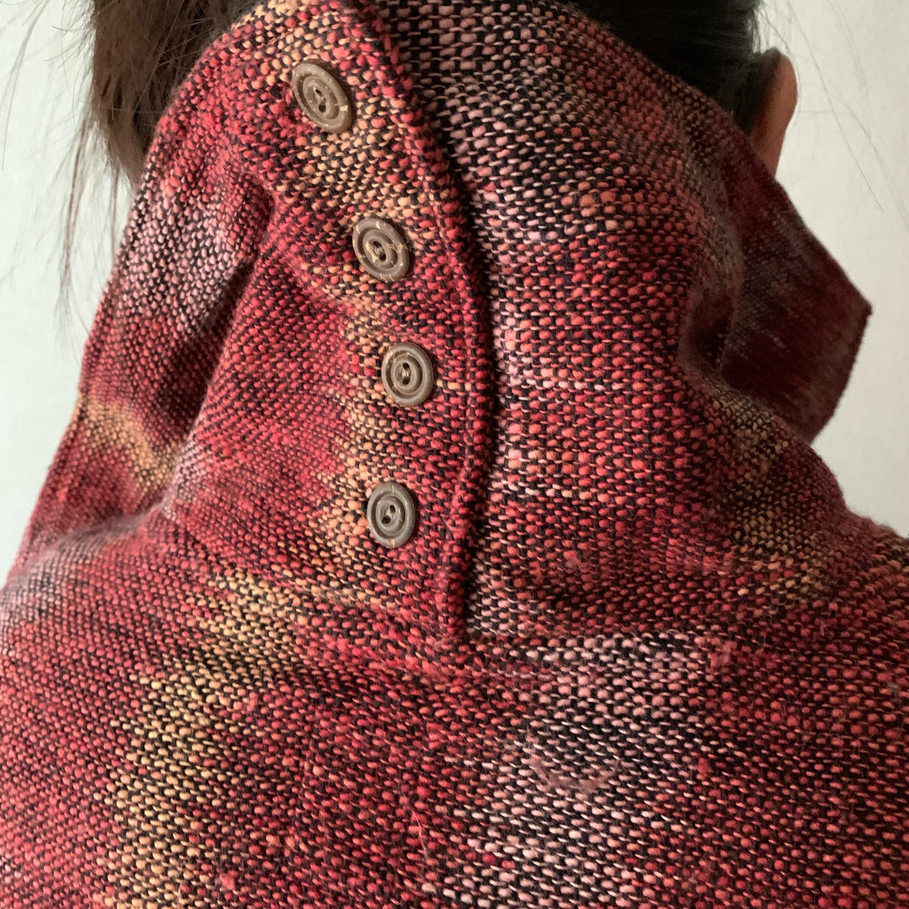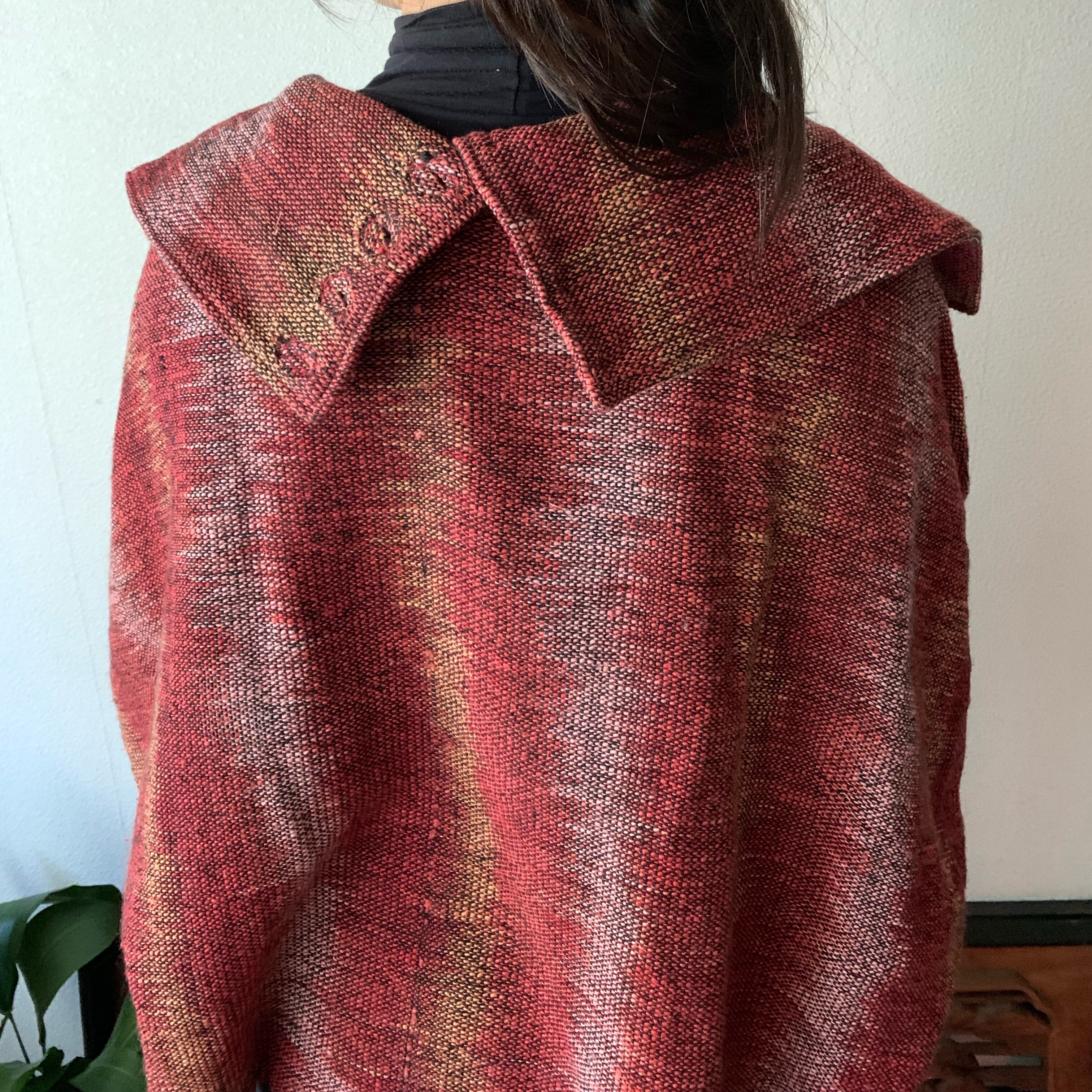 さっと羽織るだけで雰囲気の出るケープ風手織り綿ブラウス 袖なしワイドなのに着ると絶妙のかっこいい落ち感がスパイス 金赤絣