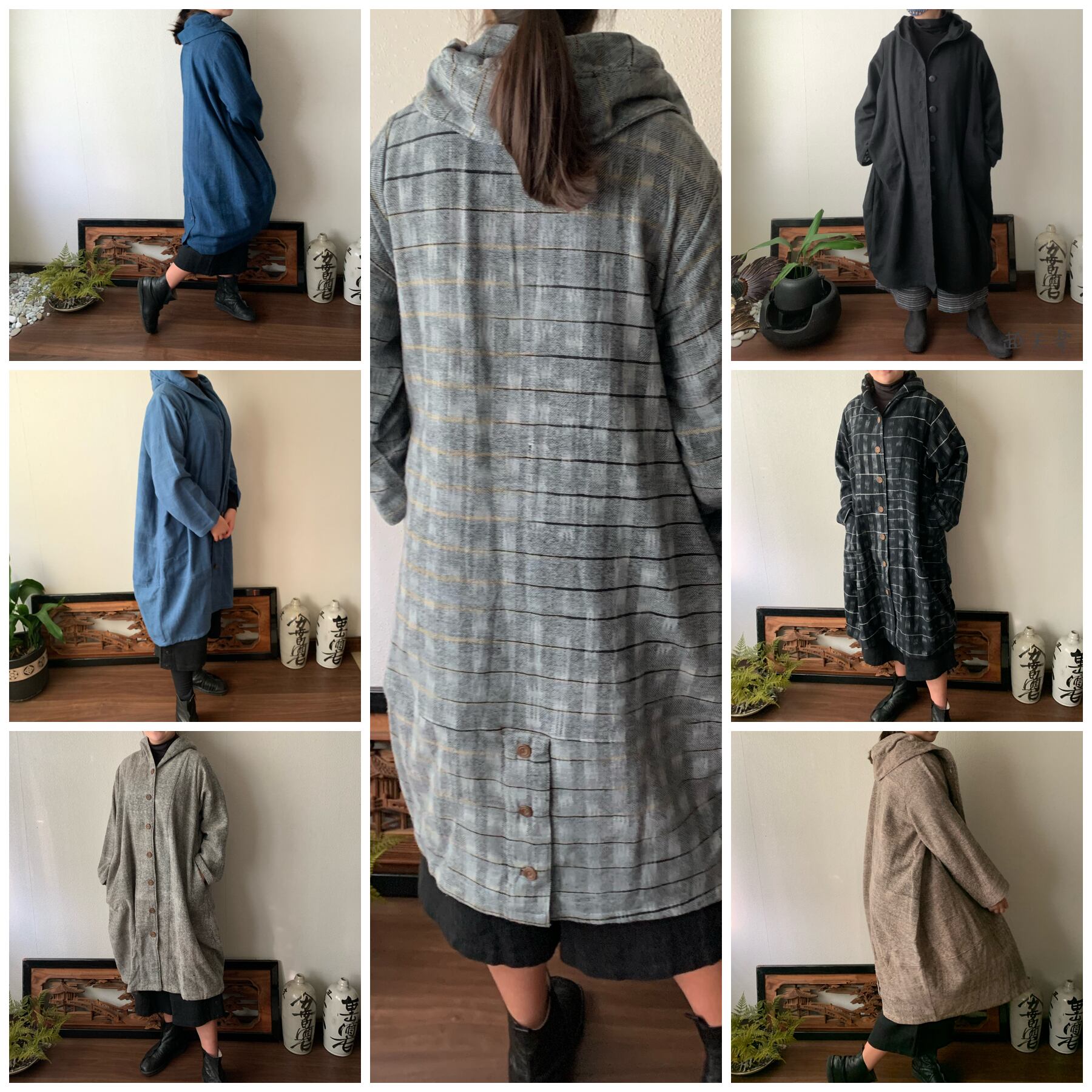 『フード風襟の手織り綿バルーンコート 秋冬に嵐山のお店で一番人気で裾切り替えもキュートなコート』