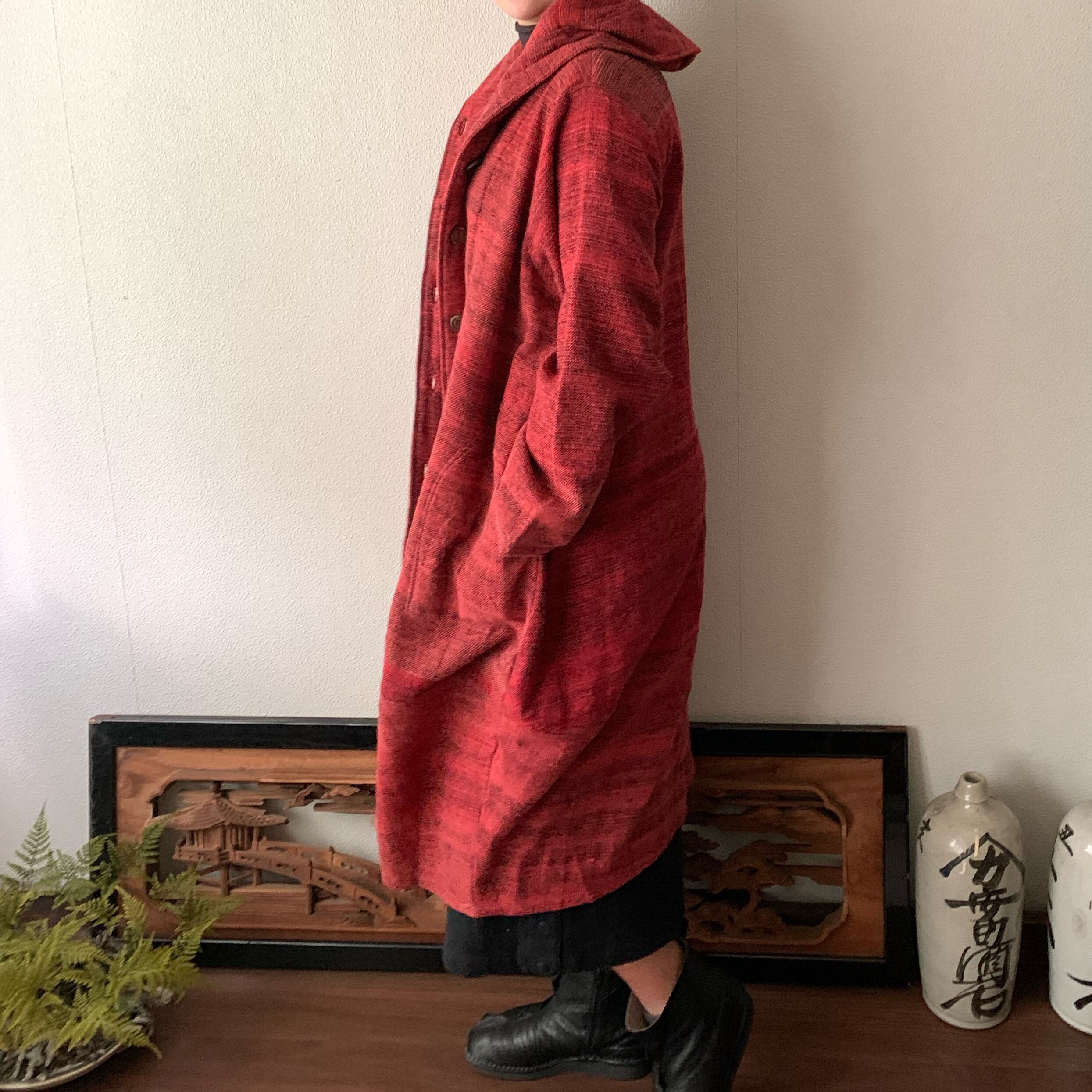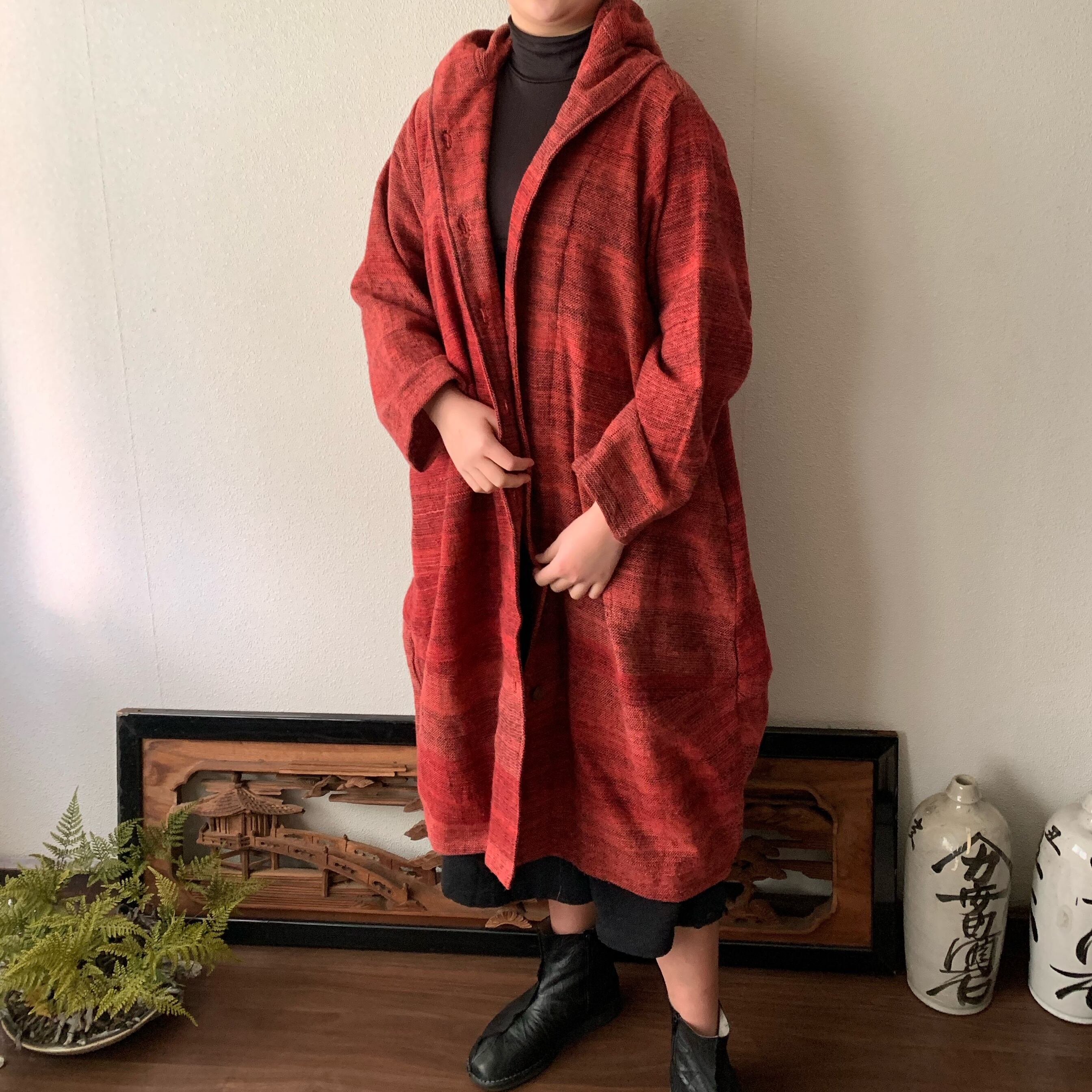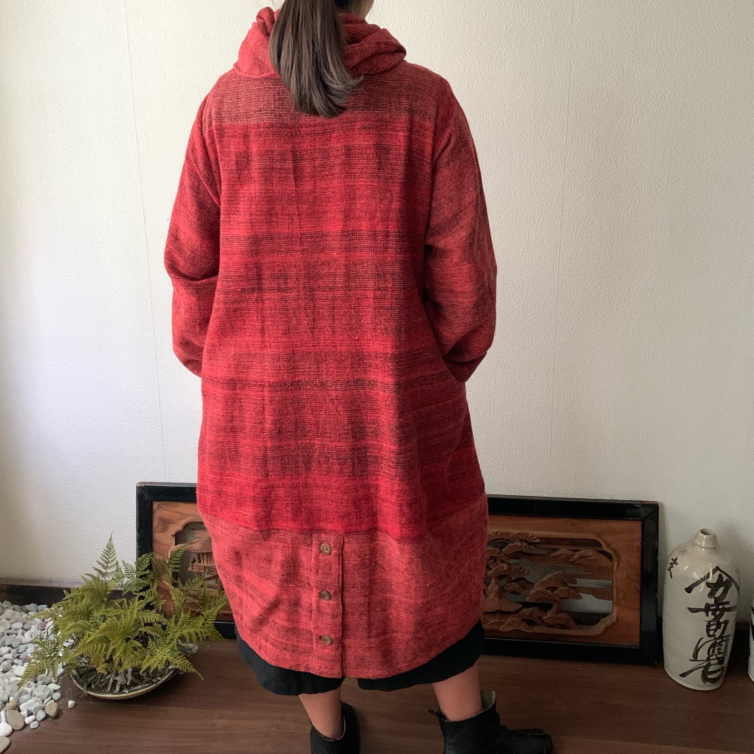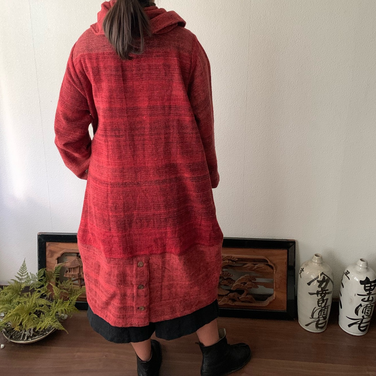 フード風襟の手織り綿バルーンコート 秋冬に、嵐山のお店で一番人気で裾切り替えもキュートなコート 赤絣
