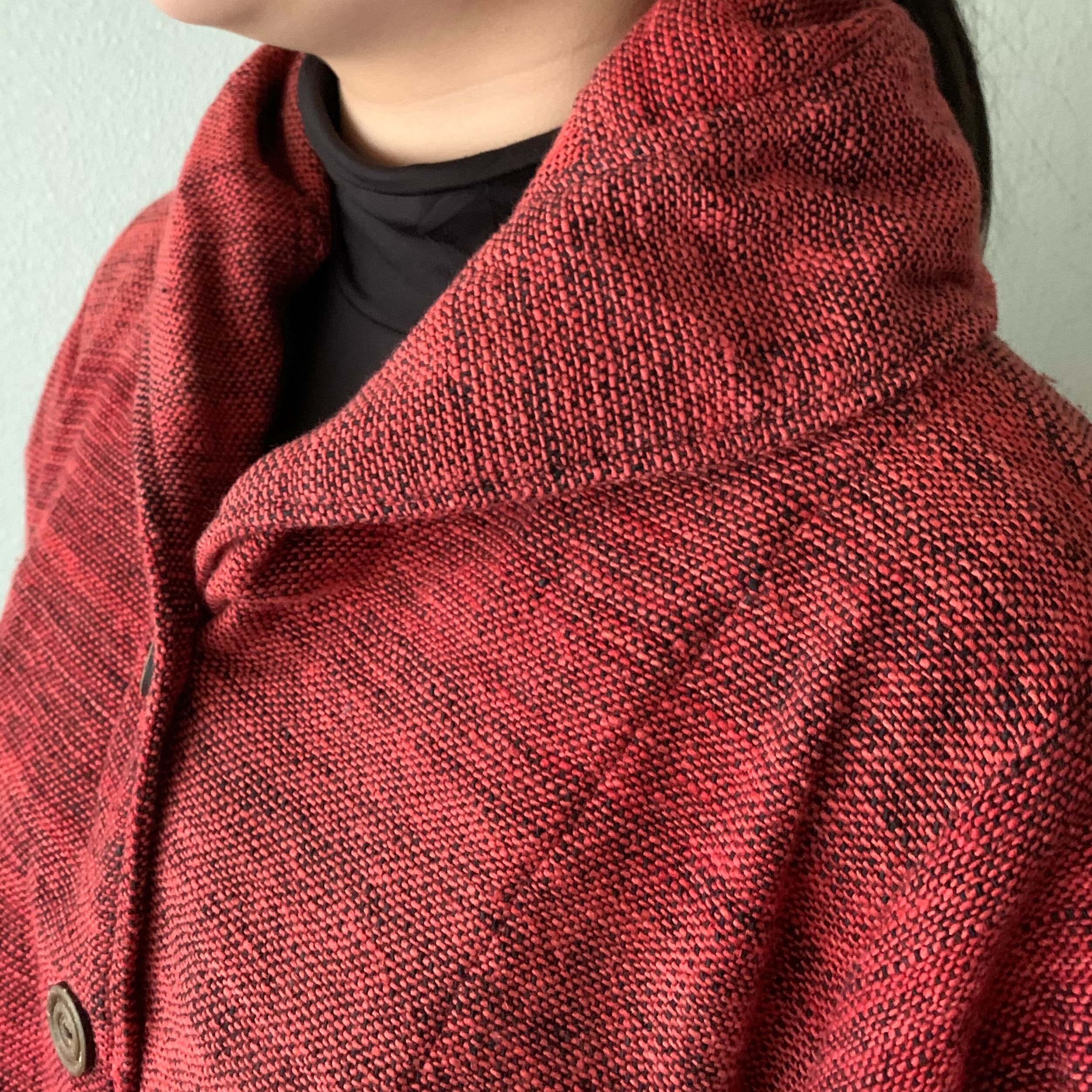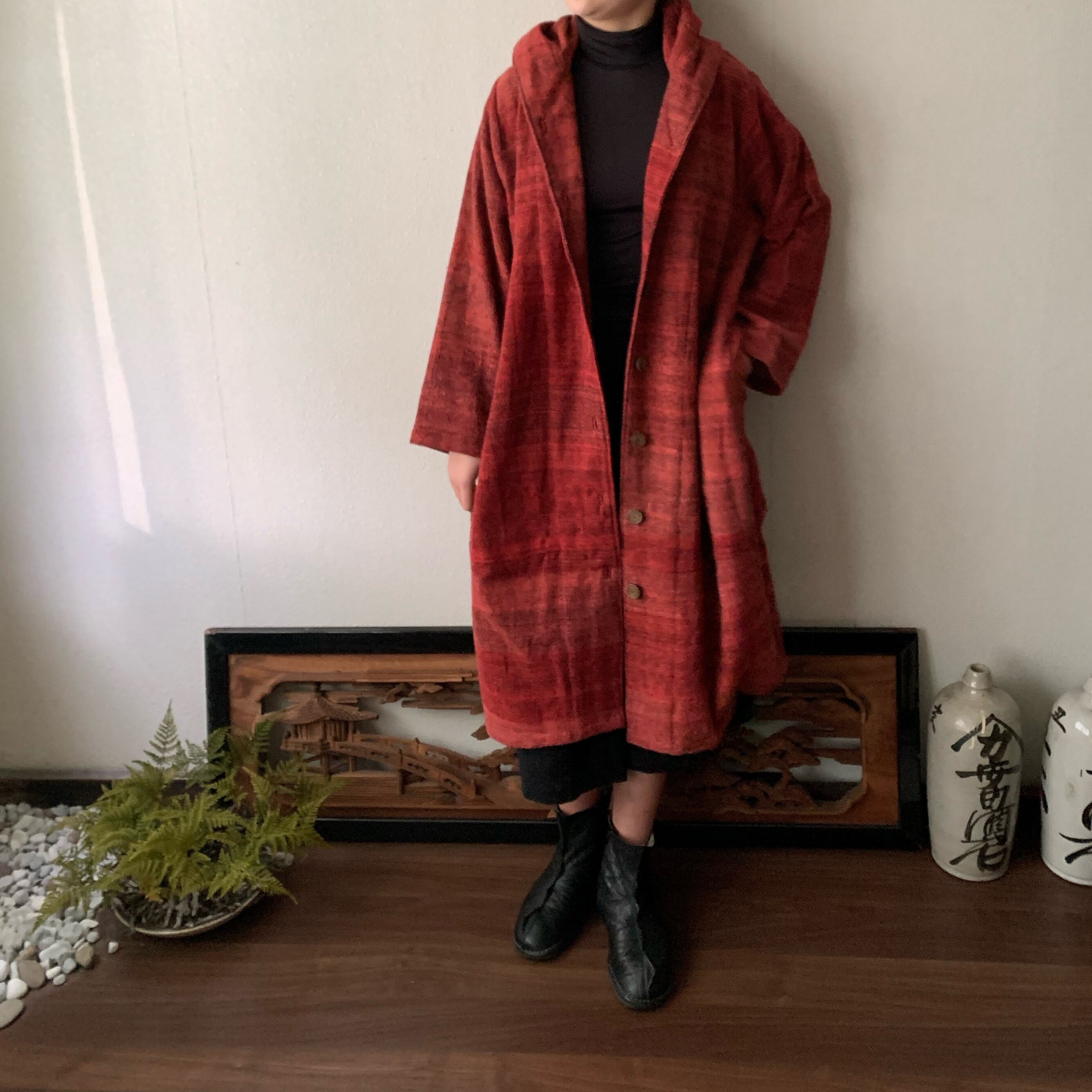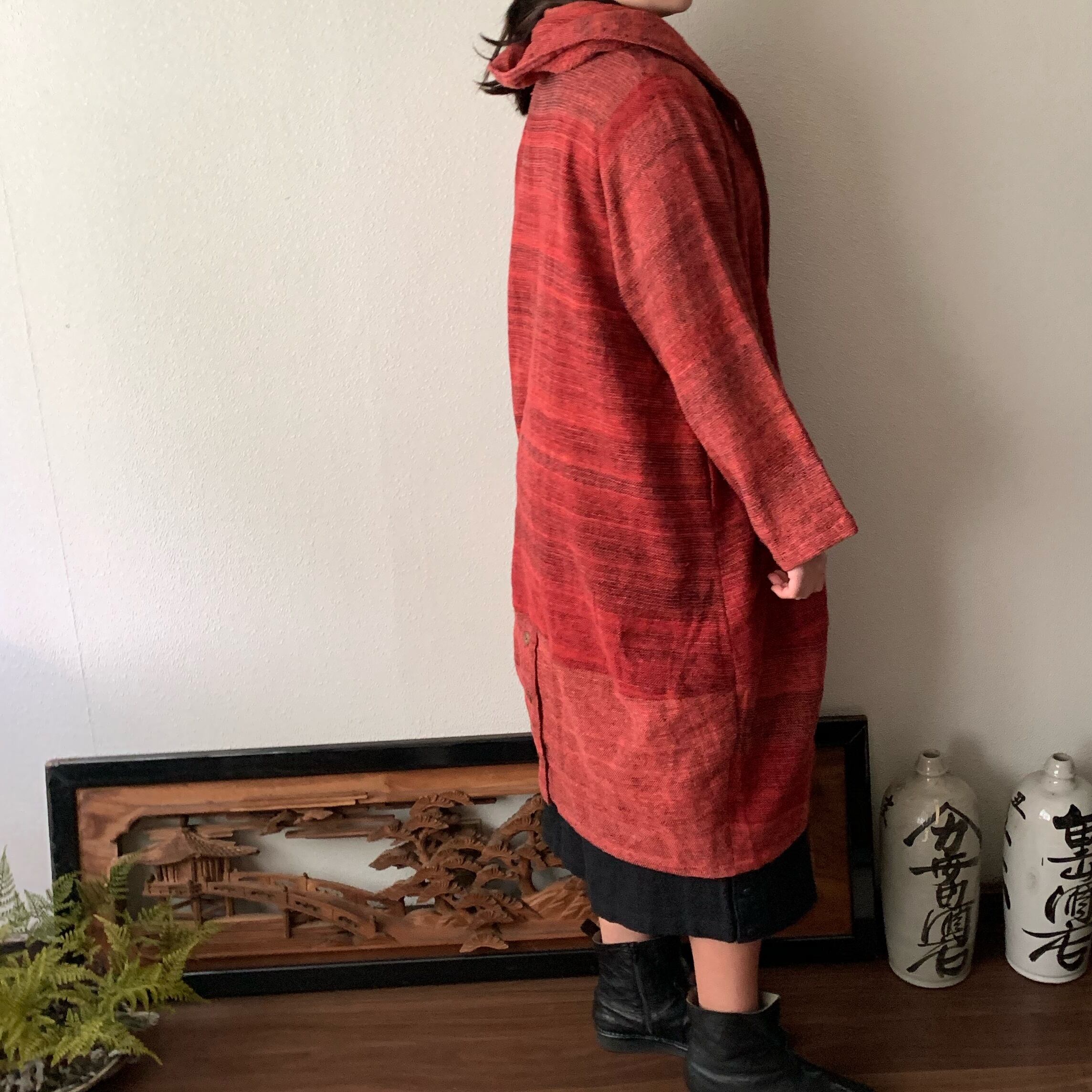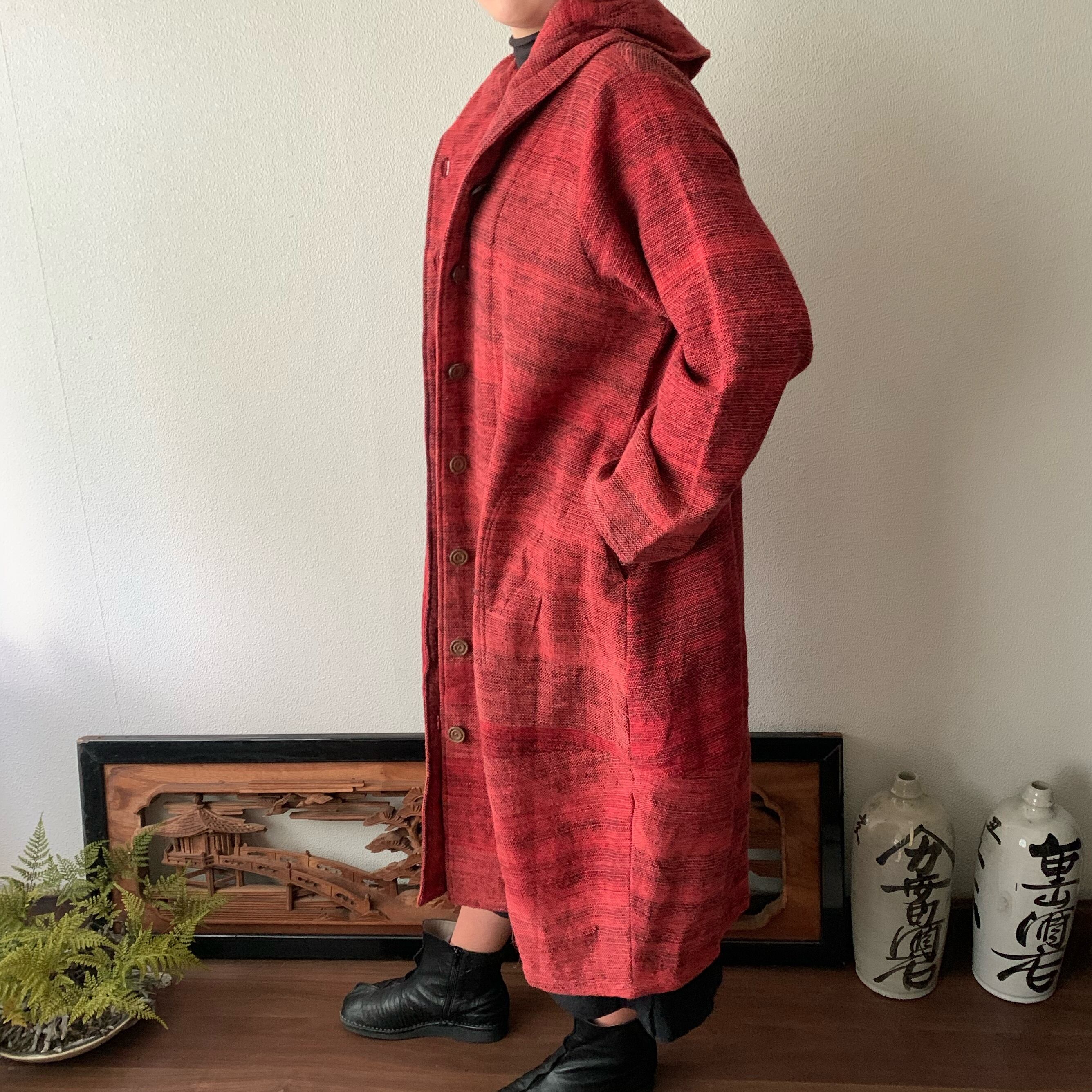 フード風襟の手織り綿バルーンコート 秋冬に、嵐山のお店で一番人気で裾切り替えもキュートなコート 赤絣
