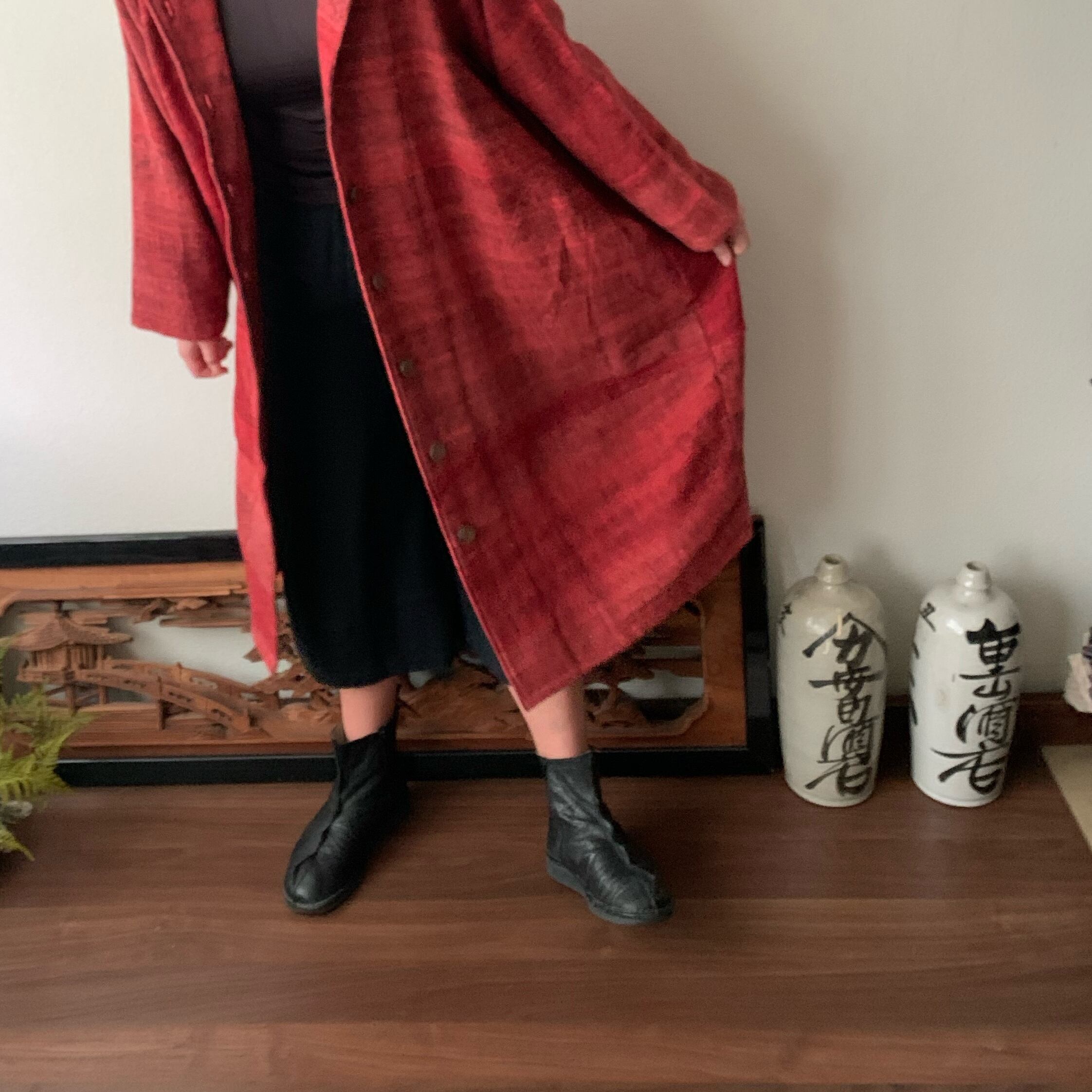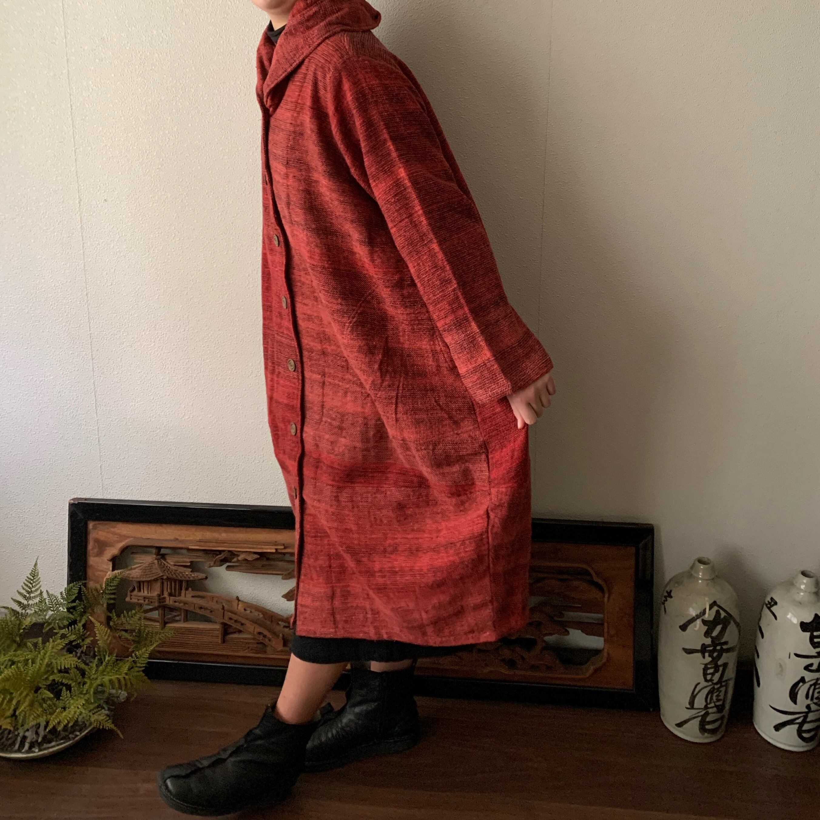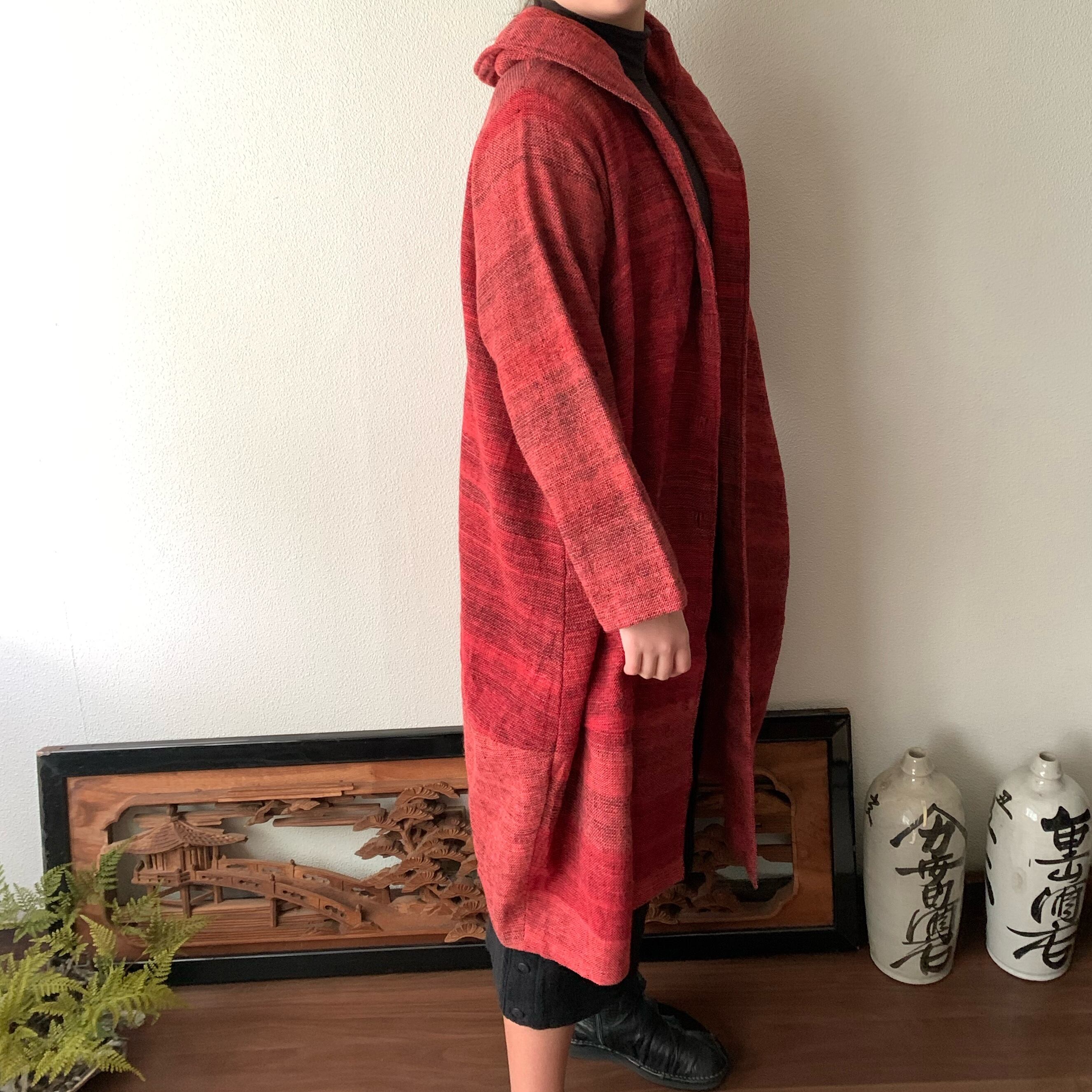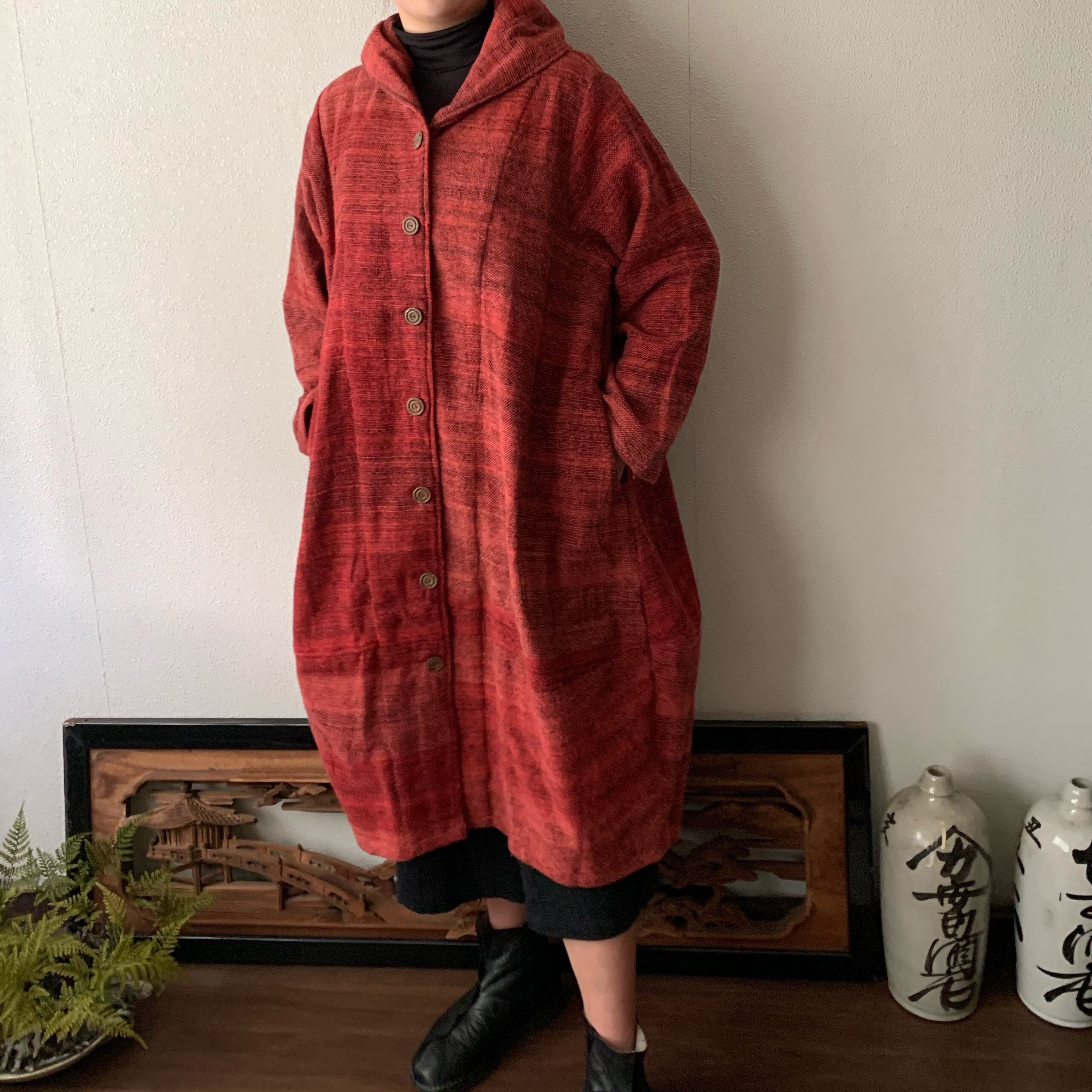 フード風襟の手織り綿バルーンコート 秋冬に、嵐山のお店で一番人気で裾切り替えもキュートなコート 赤絣