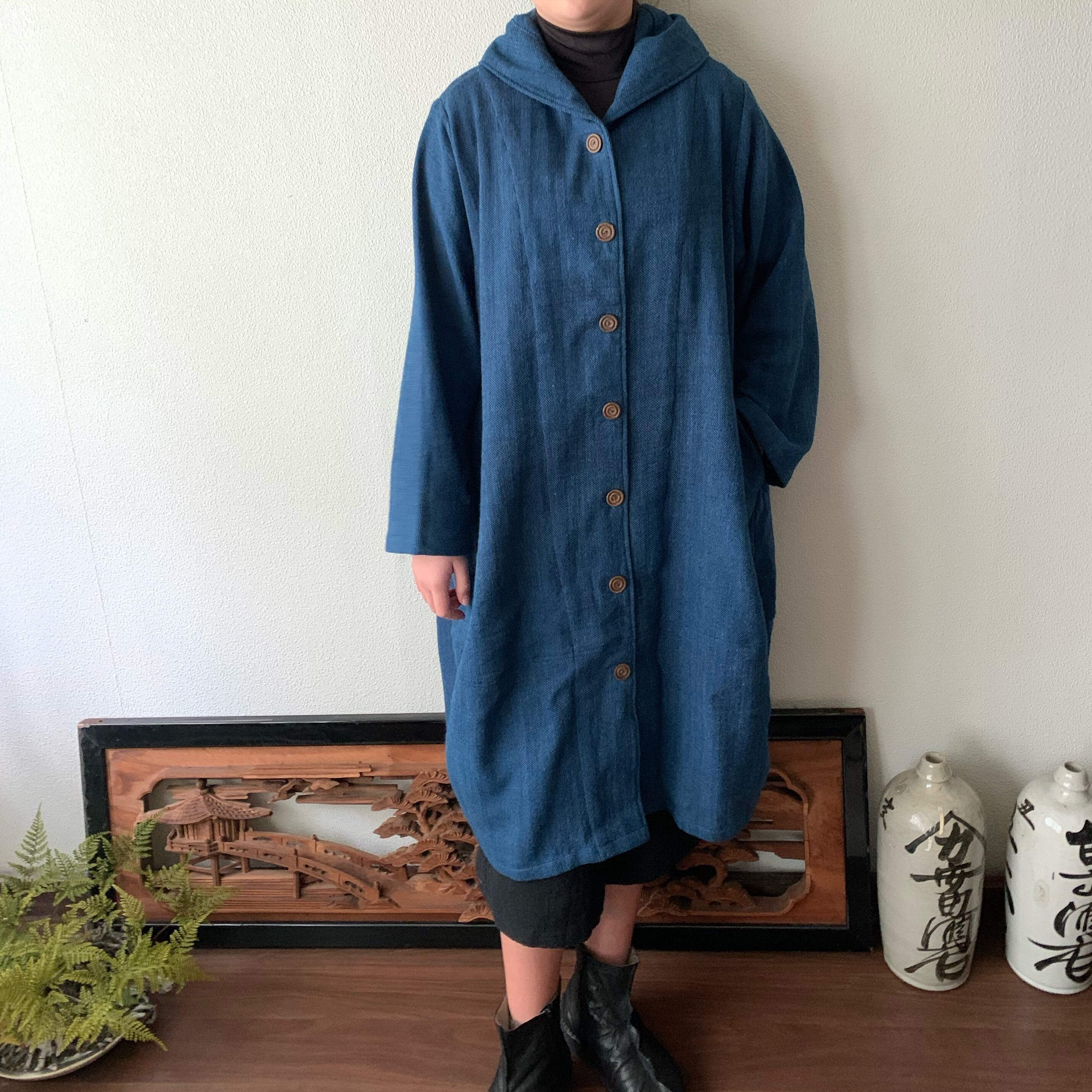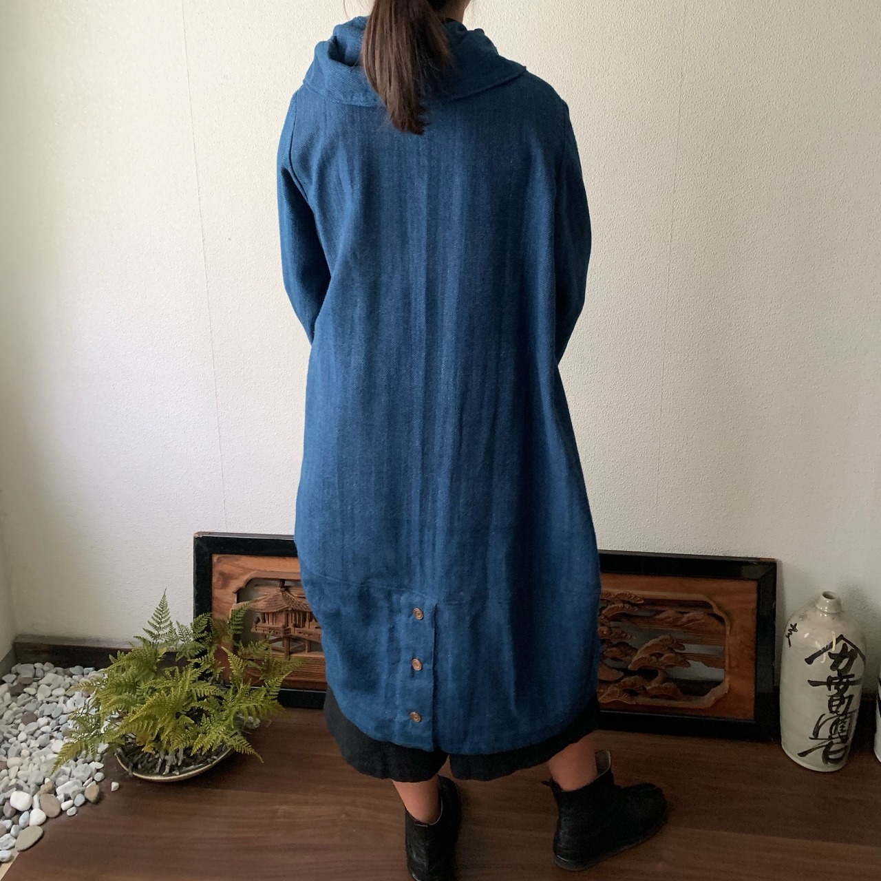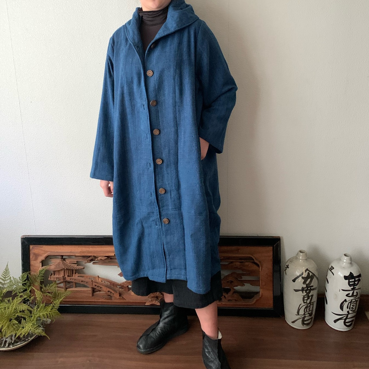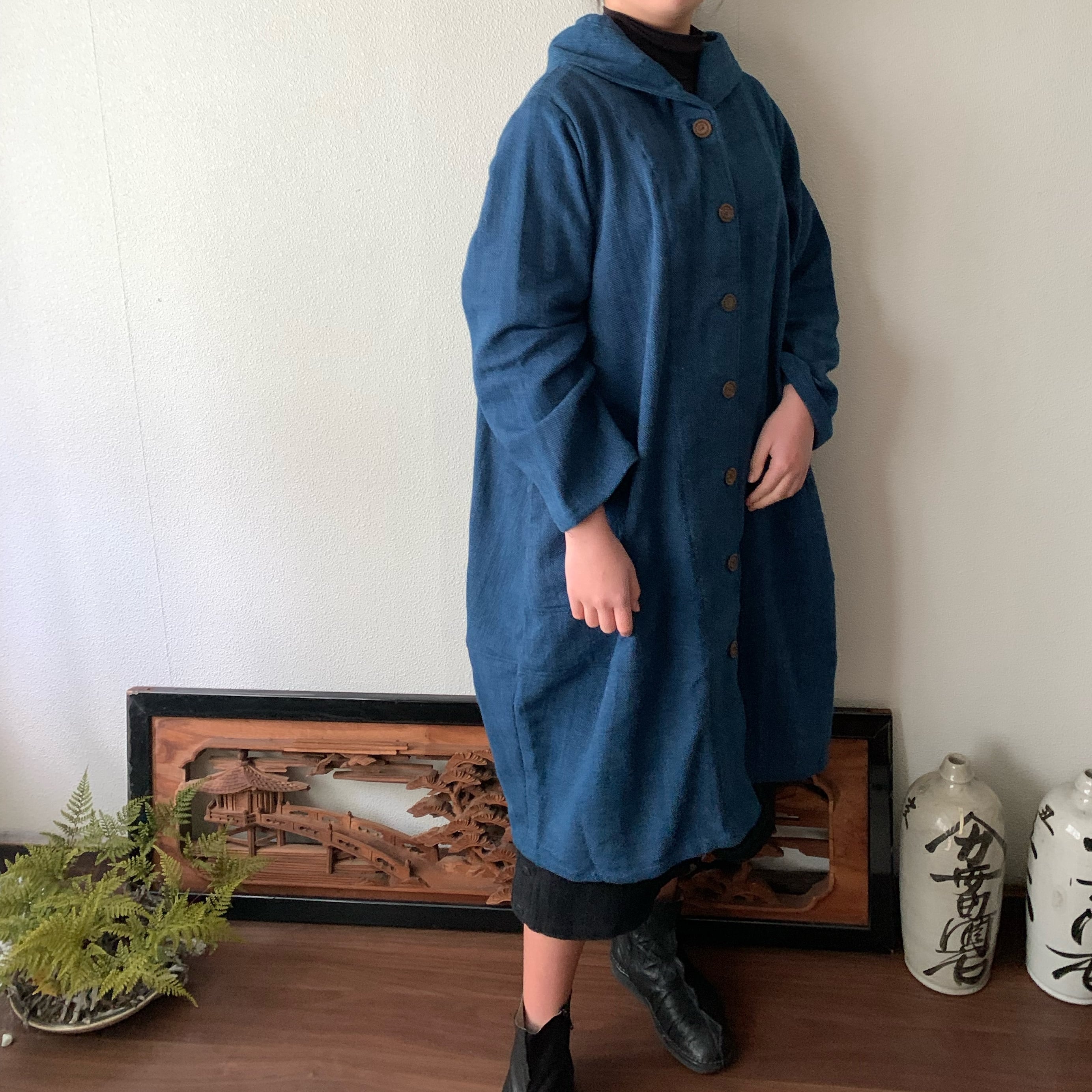 フード風襟の手織り綿バルーンコート 秋冬に、嵐山のお店で一番人気で裾切り替えもキュートなコート 青絣