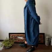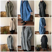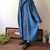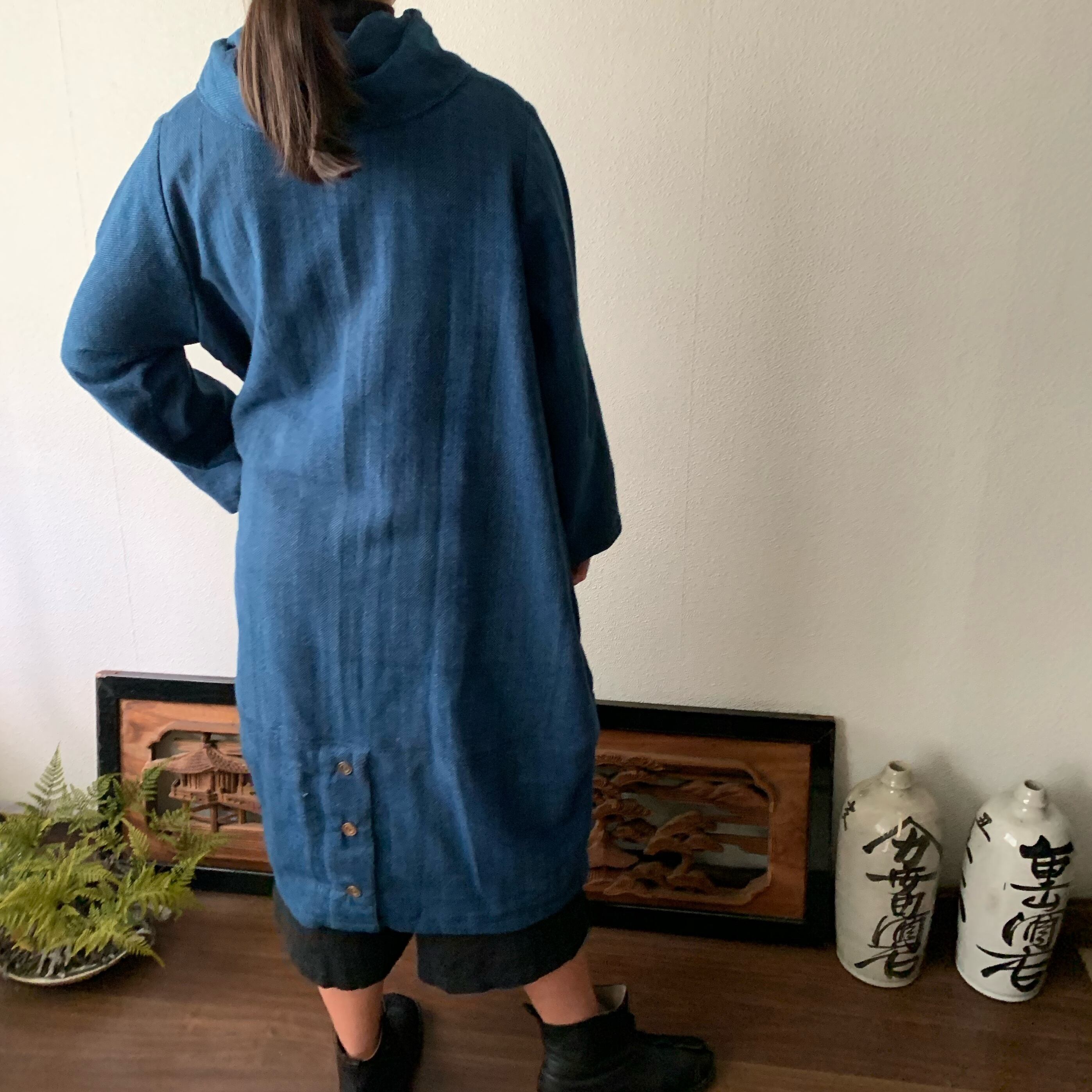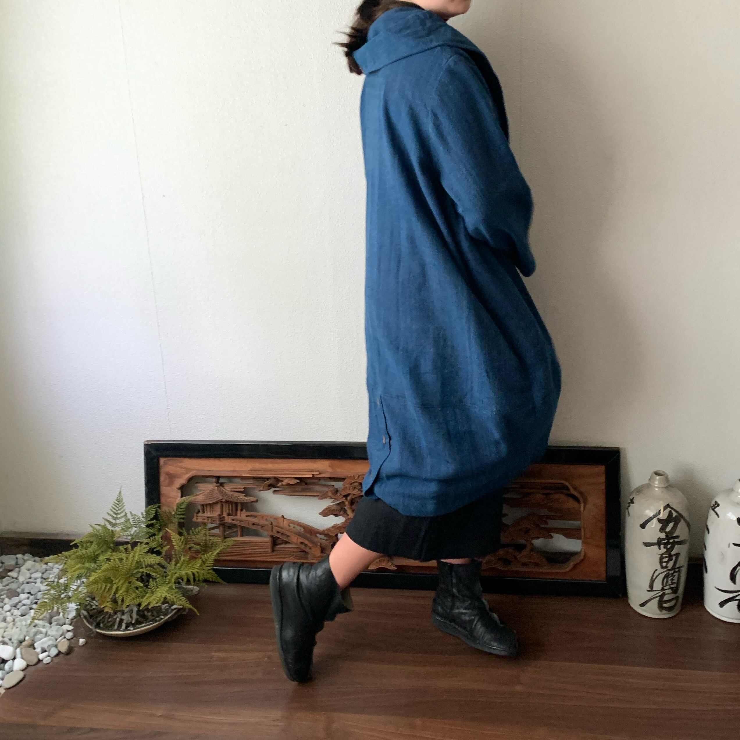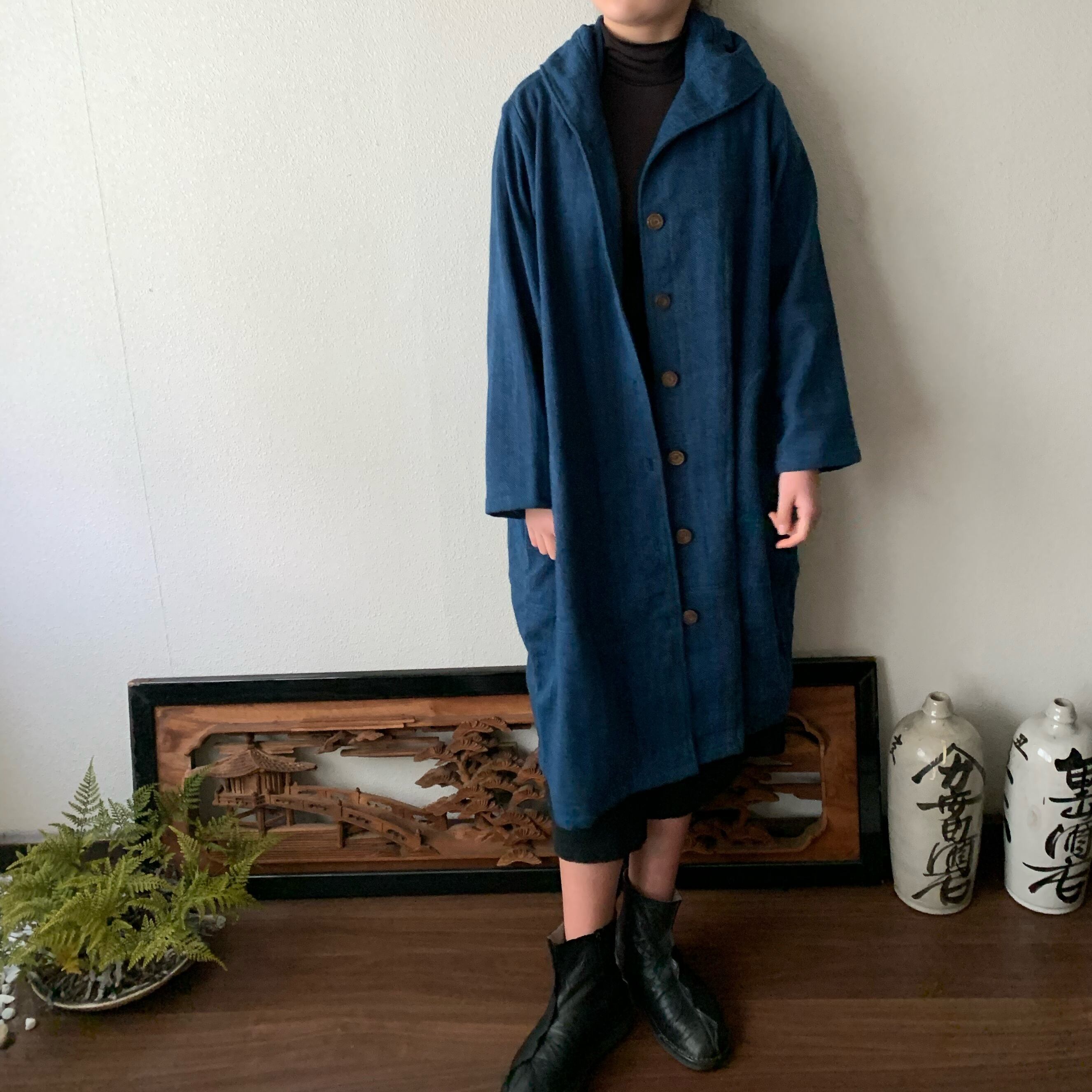 フード風襟の手織り綿バルーンコート 秋冬に、嵐山のお店で一番人気で裾切り替えもキュートなコート 青絣
