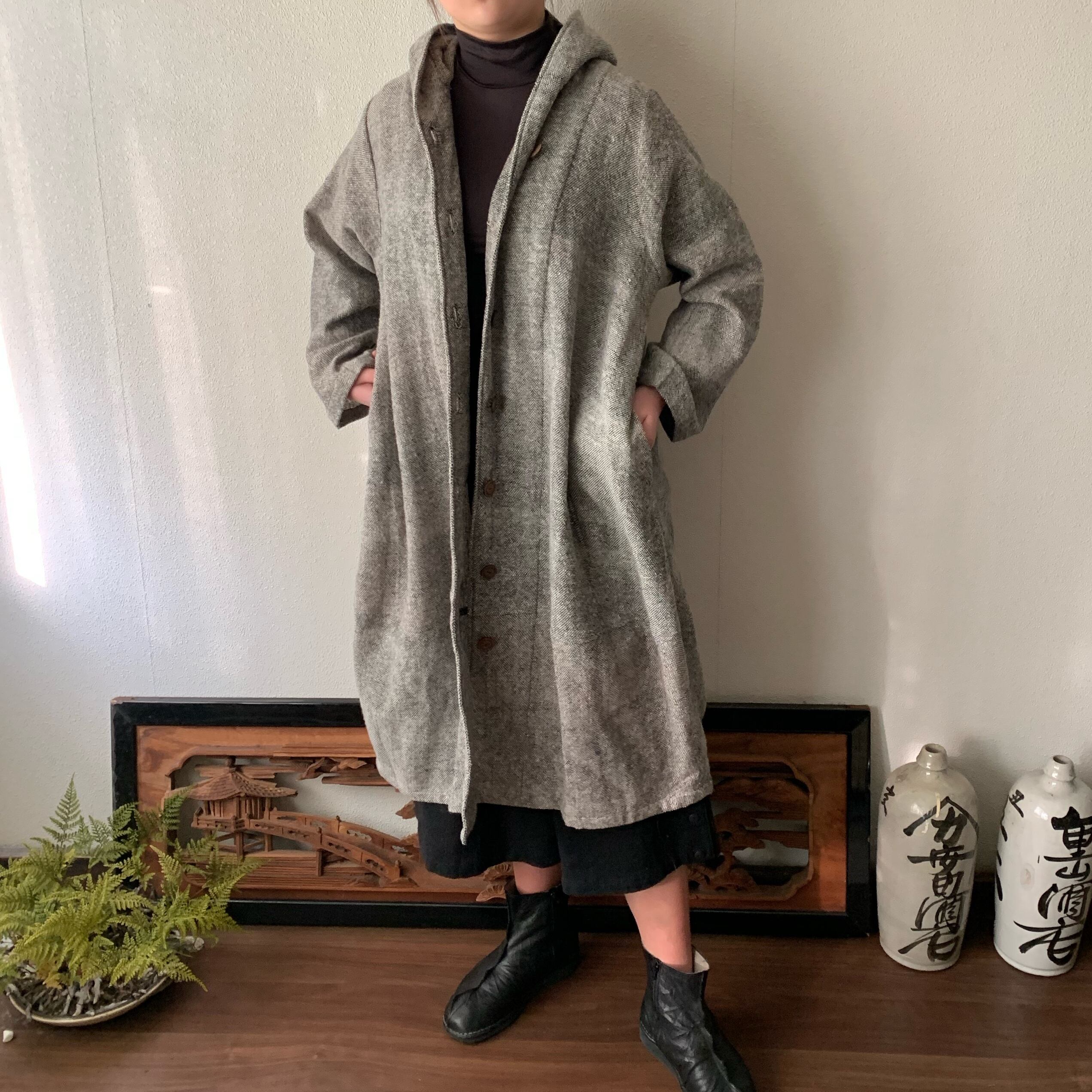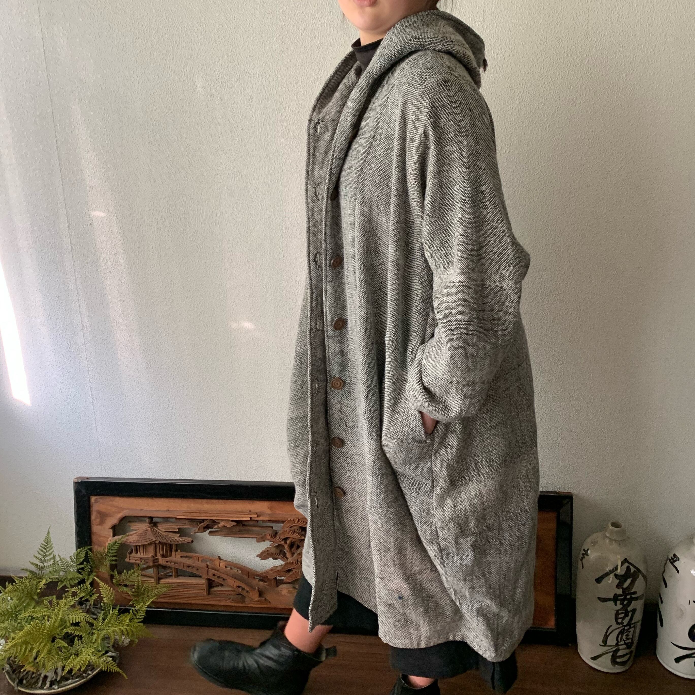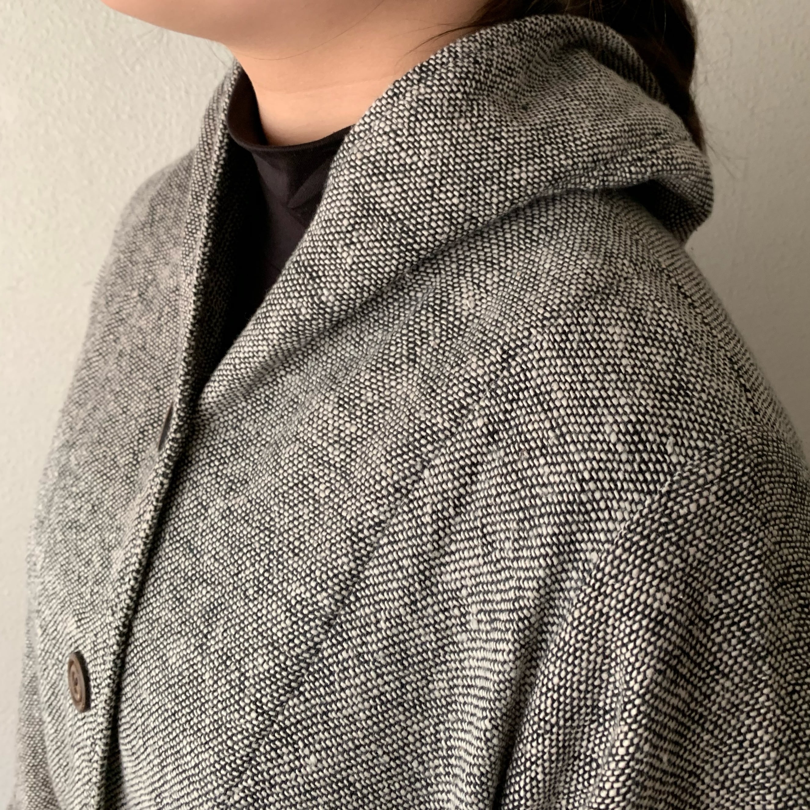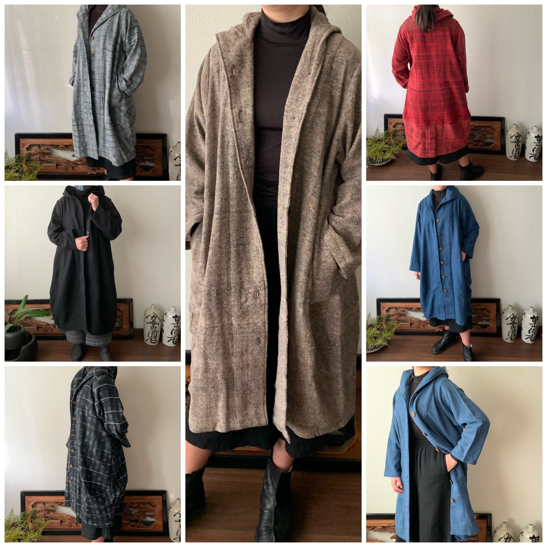 『フード風襟の手織り綿バルーンコート 秋冬に、嵐山のお店で一番人気で裾切り替えもキュートなコート』