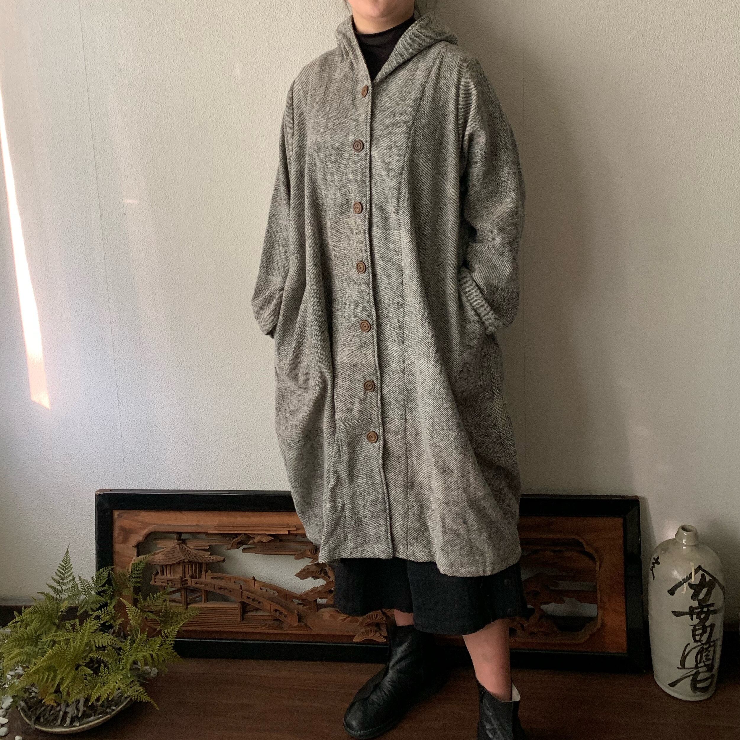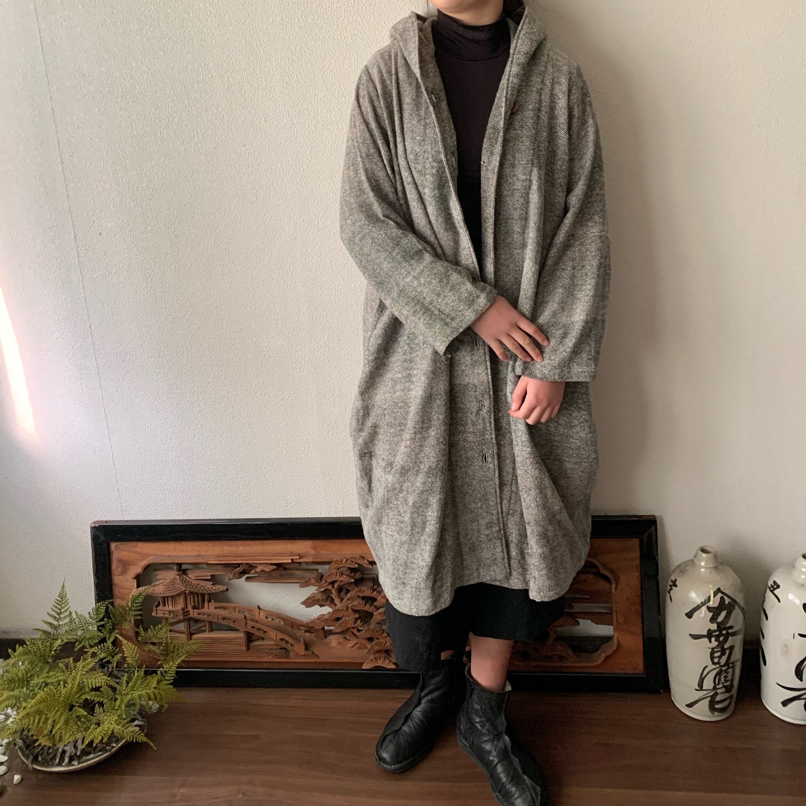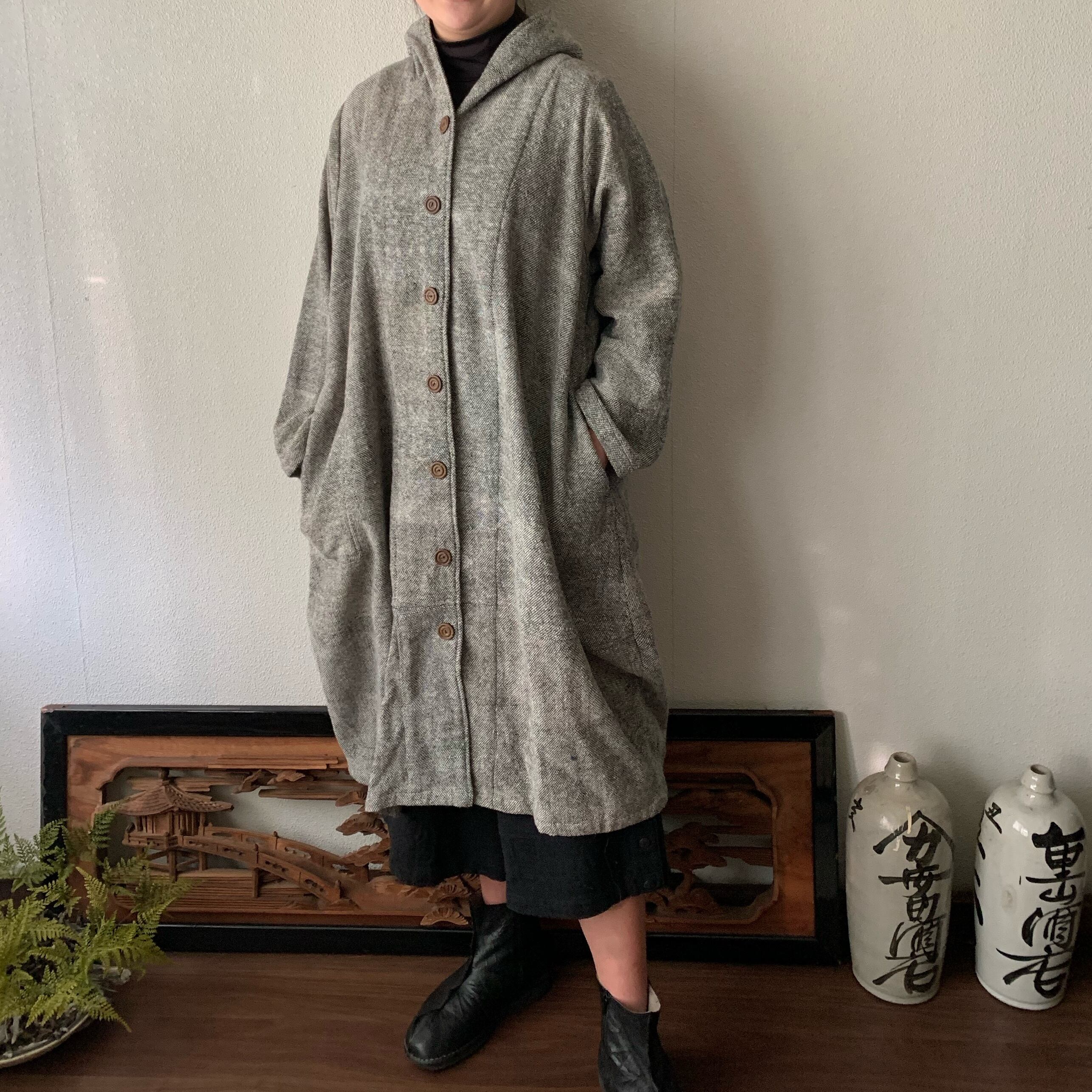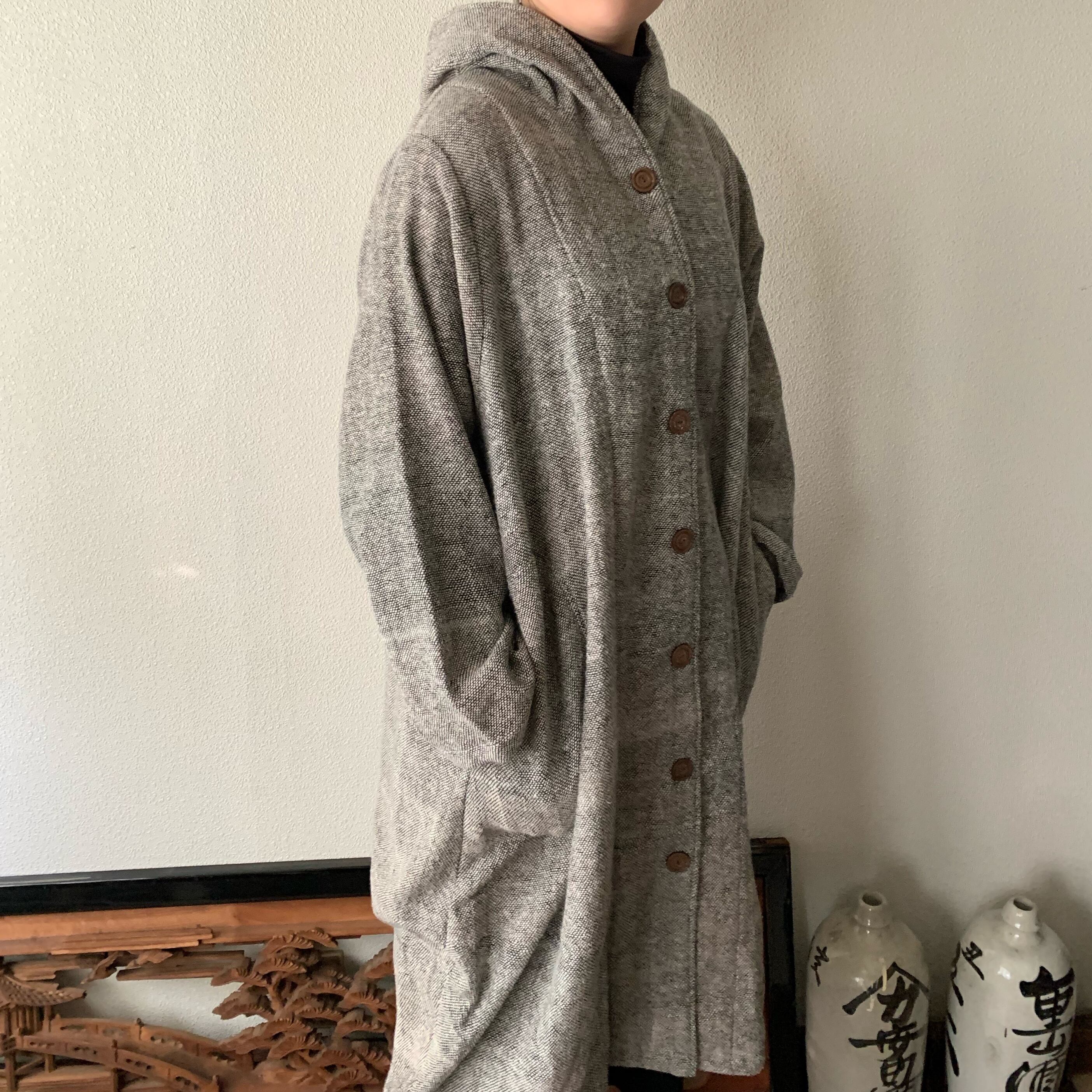 『フード風襟の手織り綿バルーンコート 秋冬に、嵐山のお店で一番人気で裾切り替えもキュートなコート』