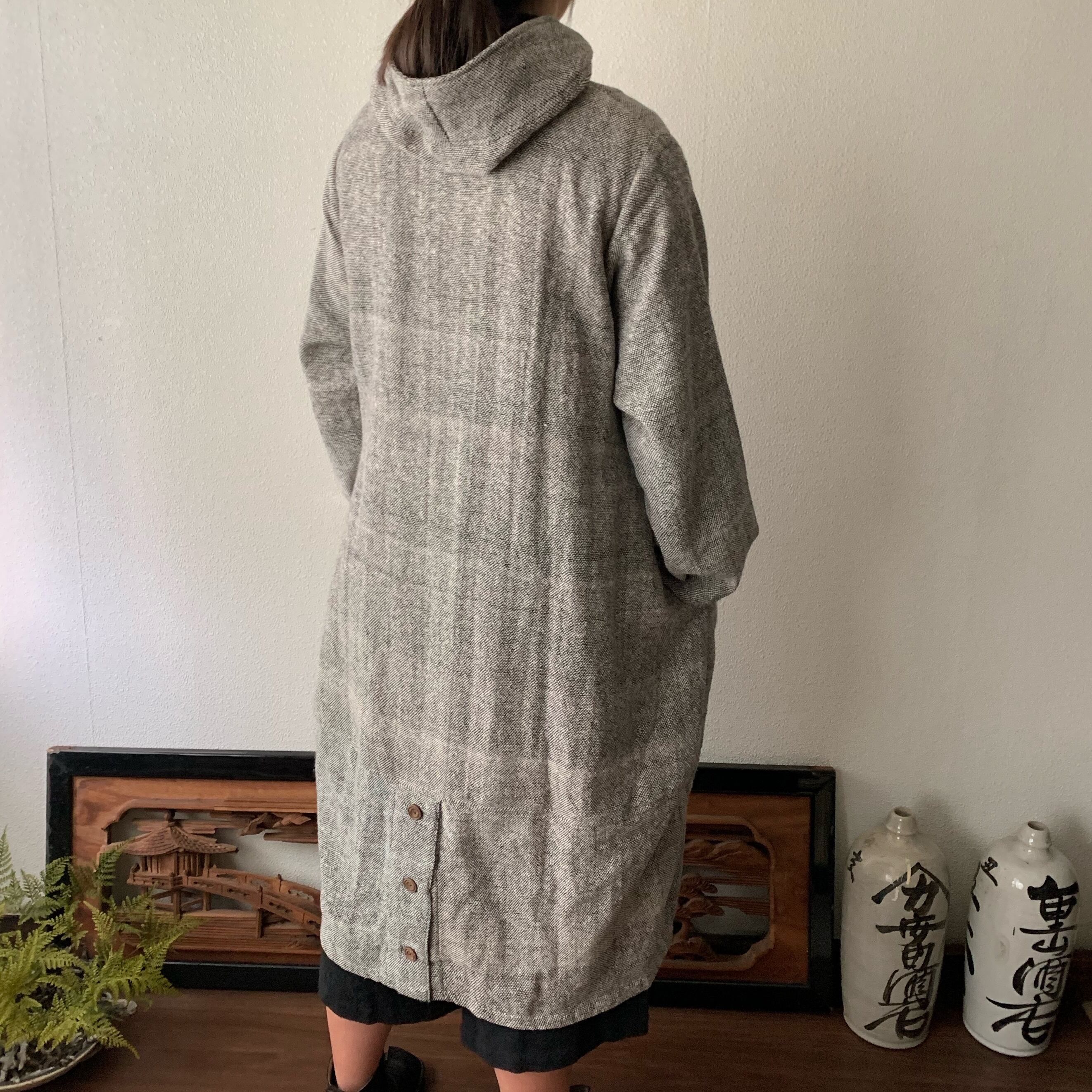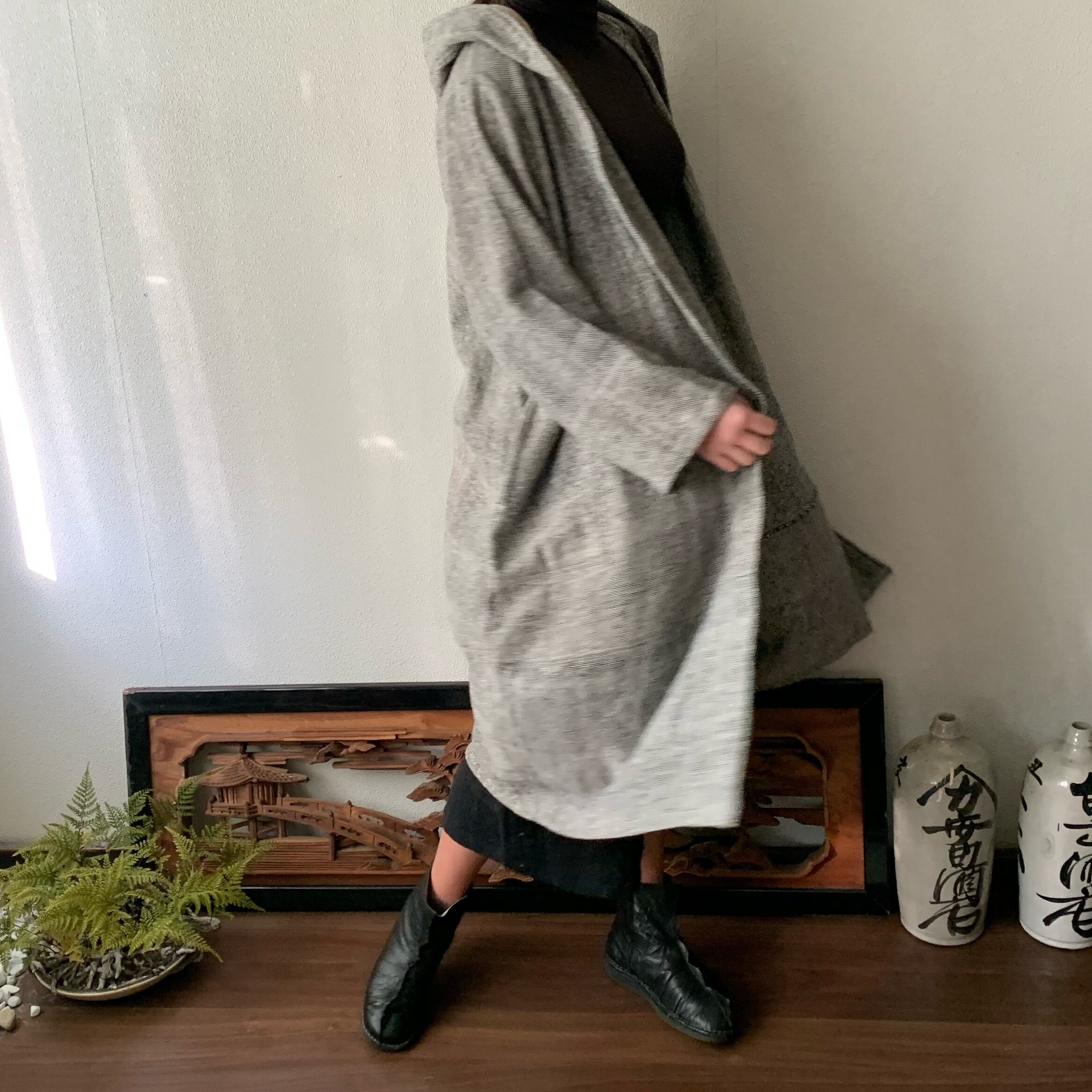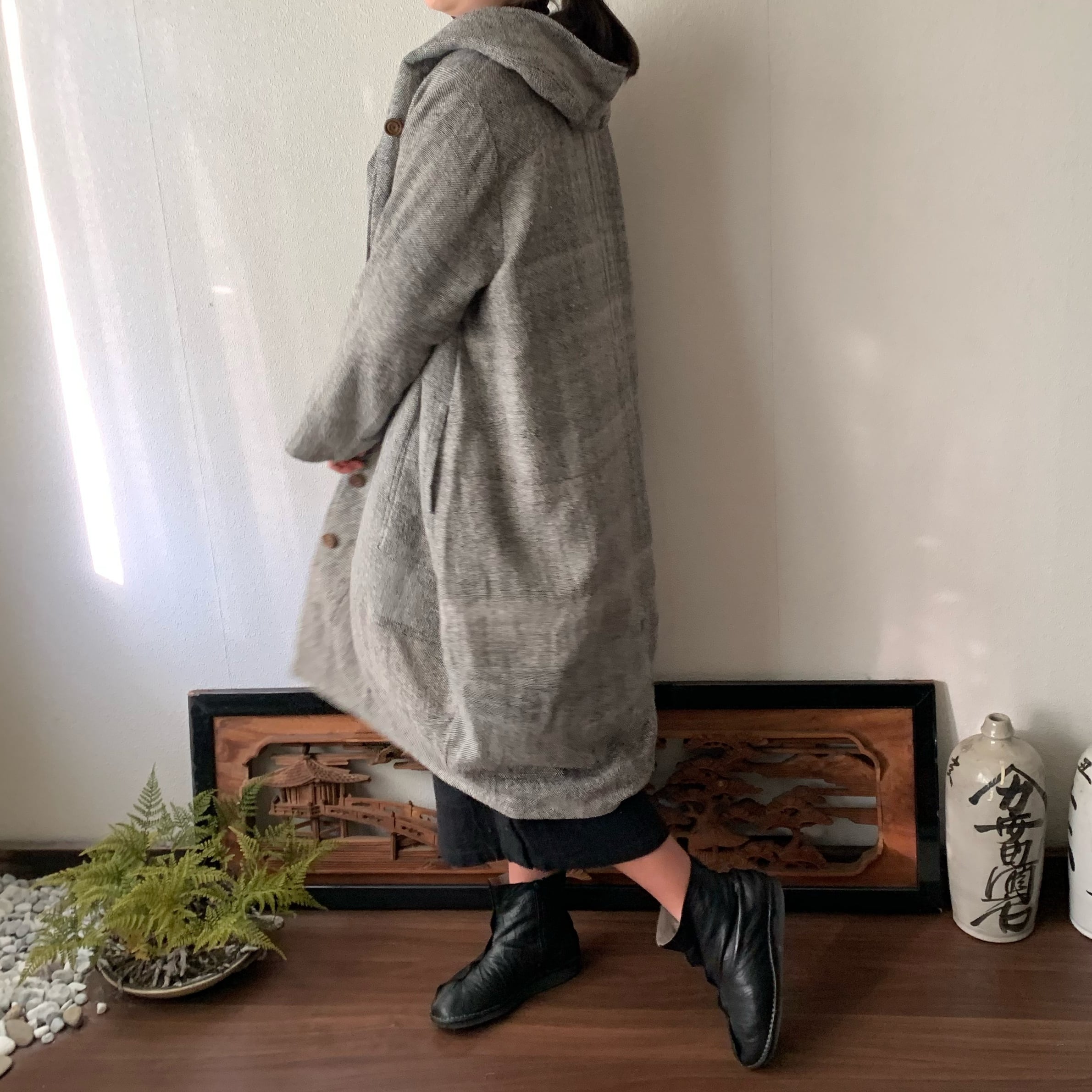 フード風襟の手織り綿バルーンコート 秋冬に、嵐山のお店で一番人気で裾切り替えもキュートなコート 白グレイ絣