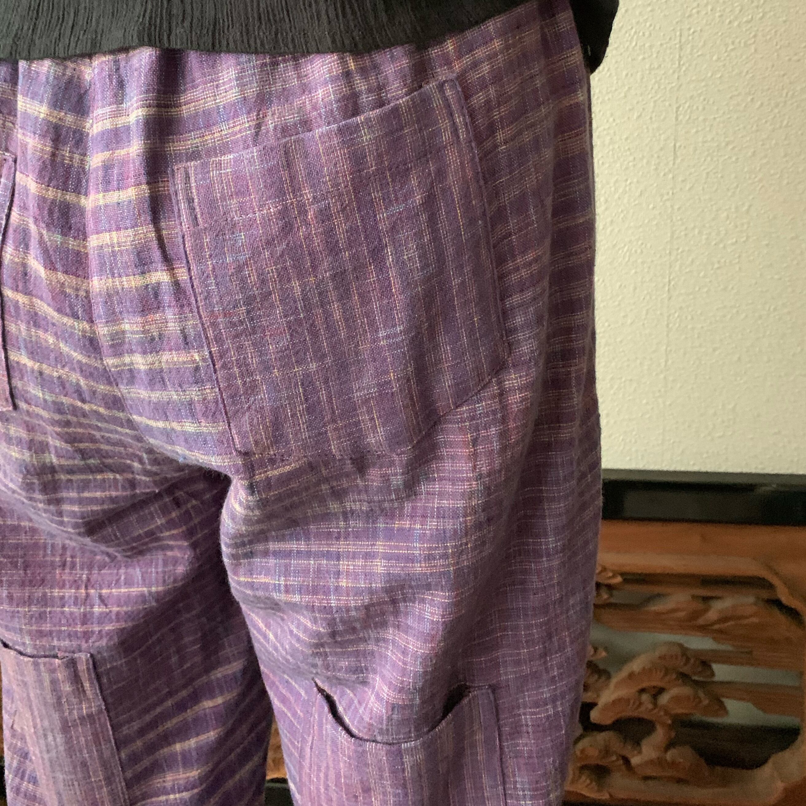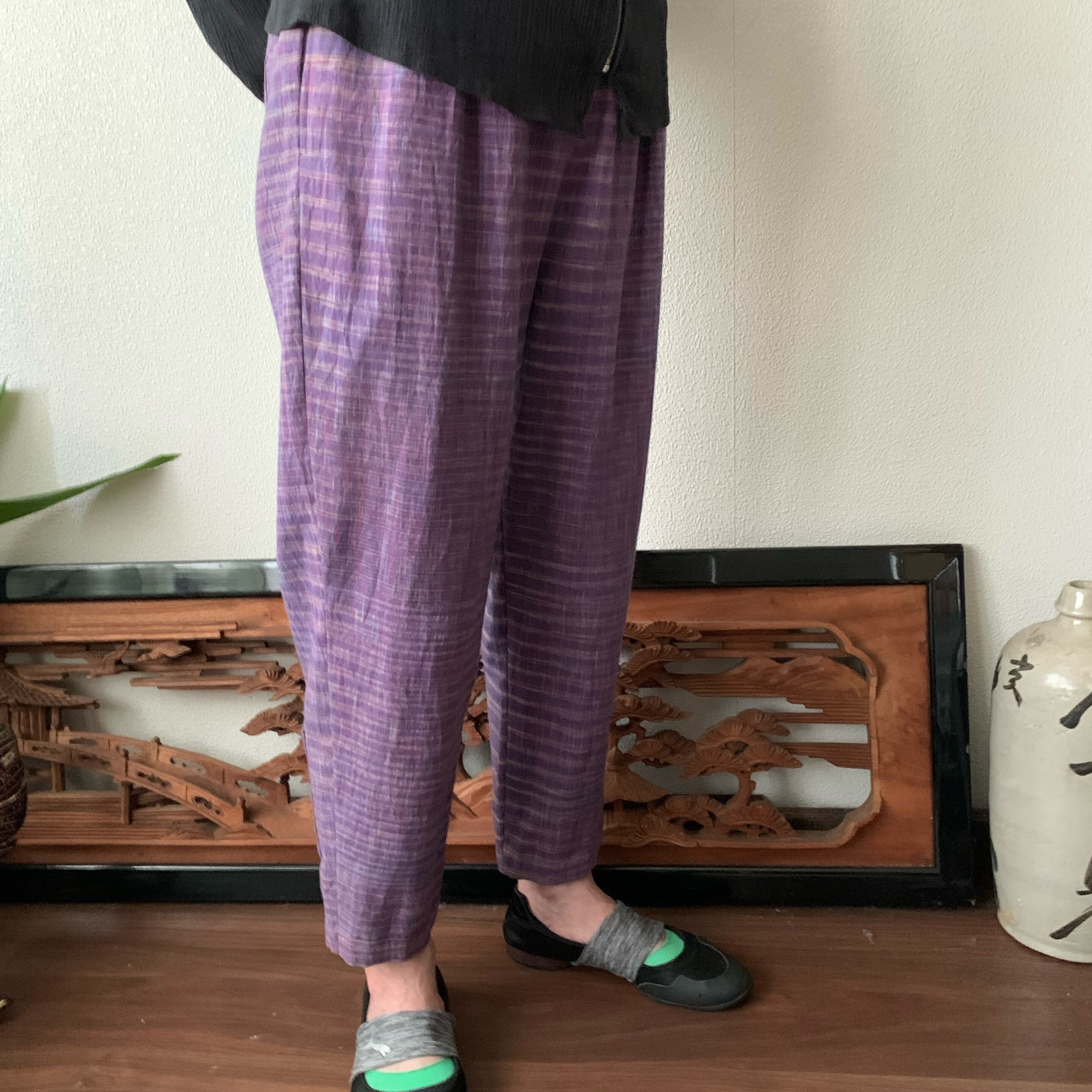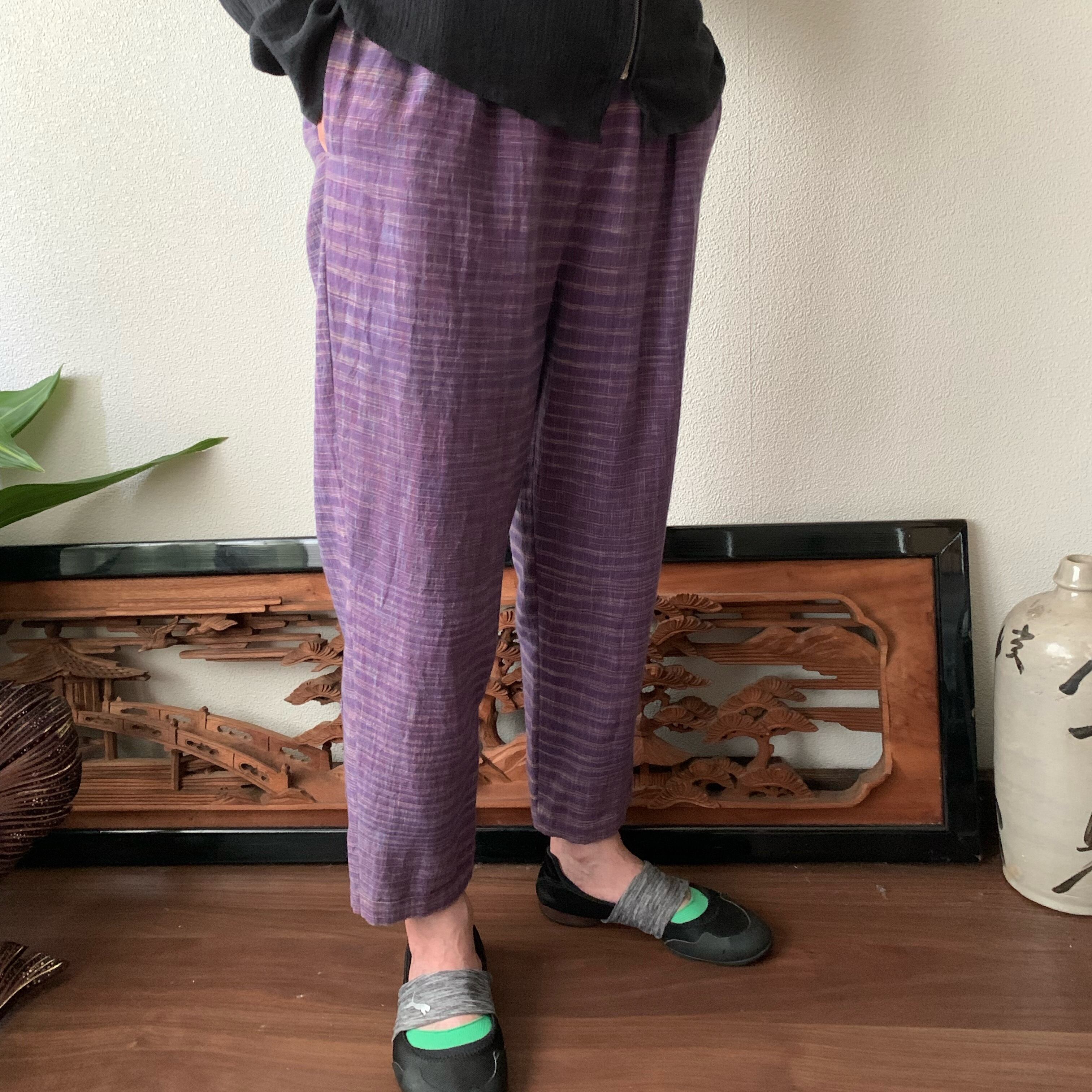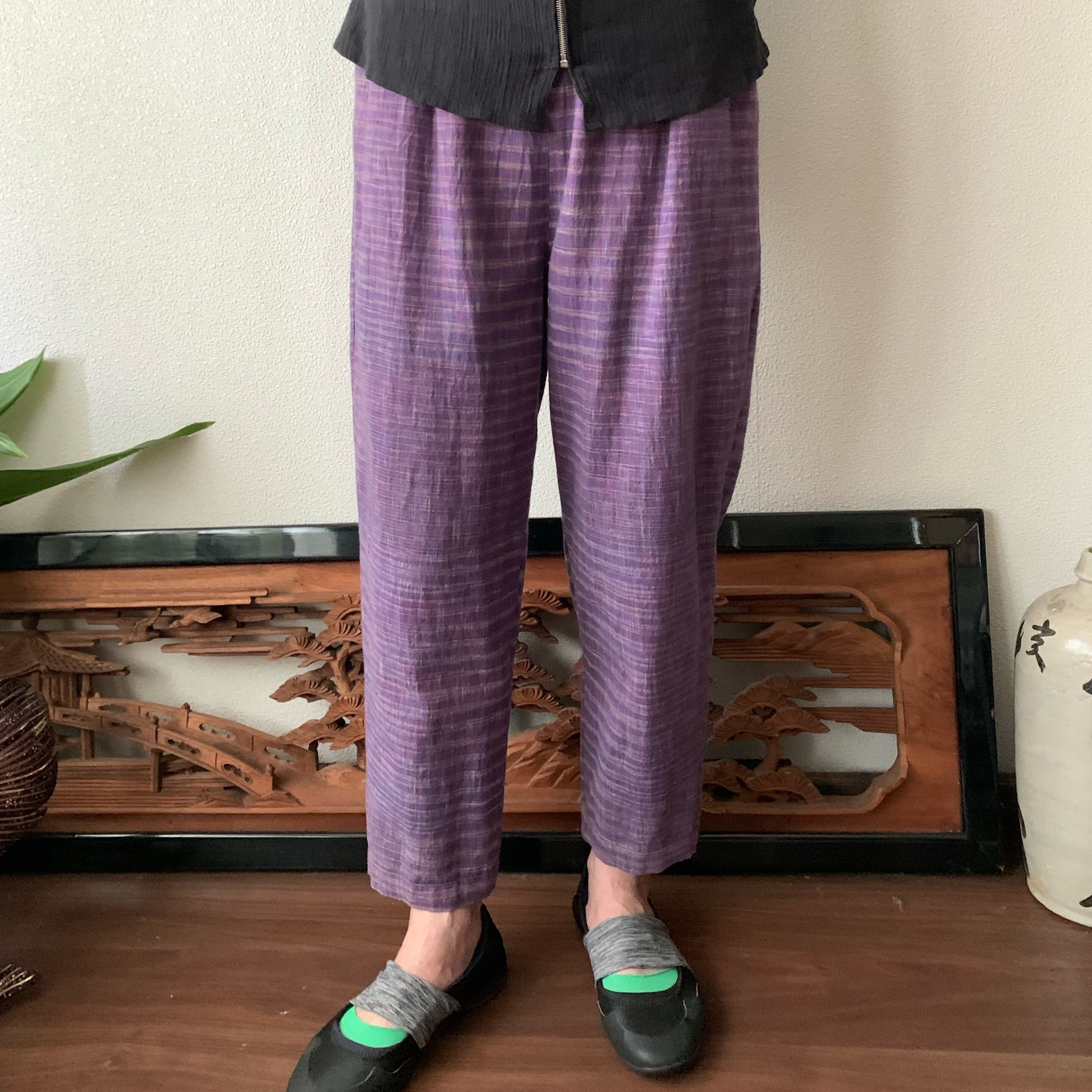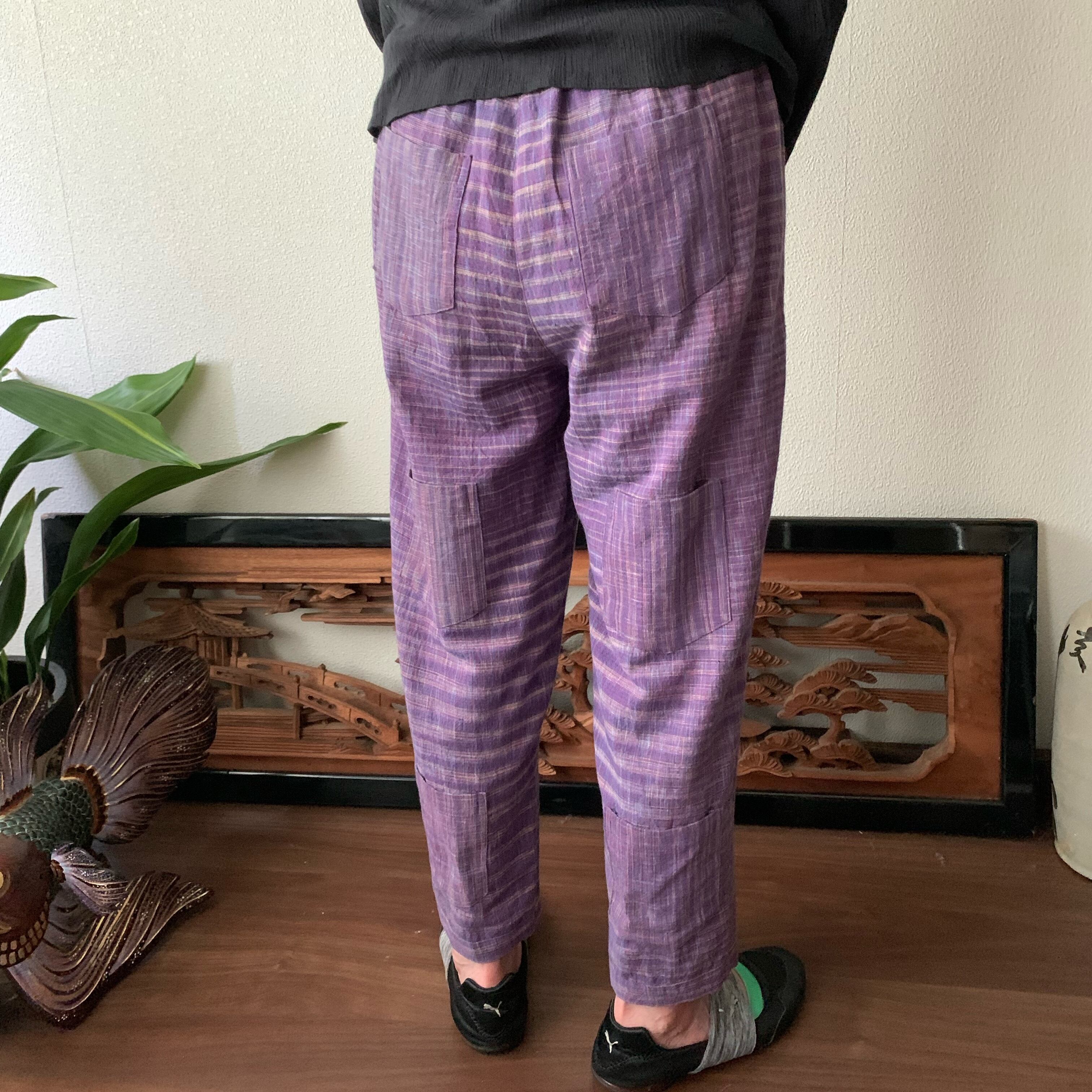 シンプル!いえいえ後ろはポケット縦3つですっきりです手織り綿テーパードパンツ 紫絣