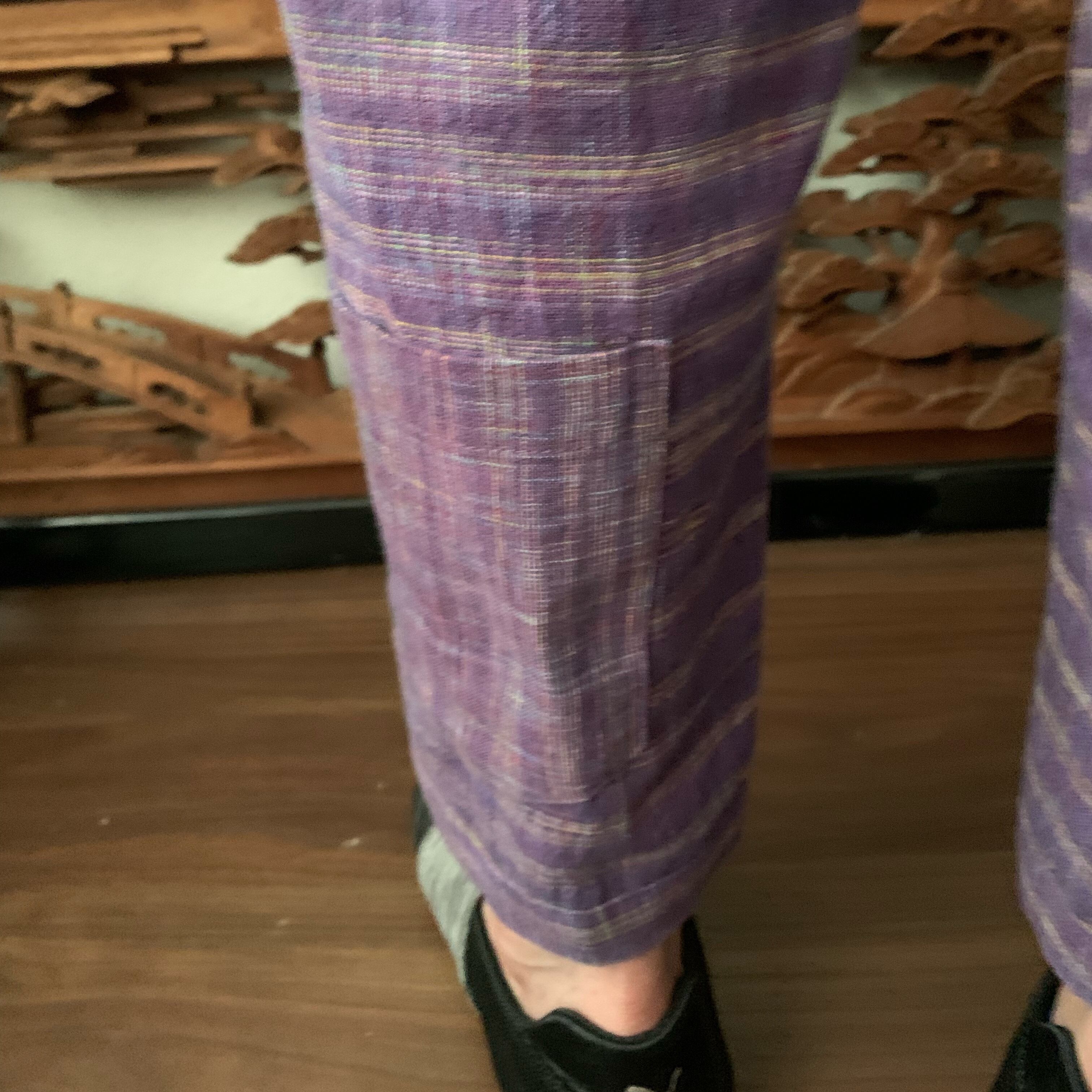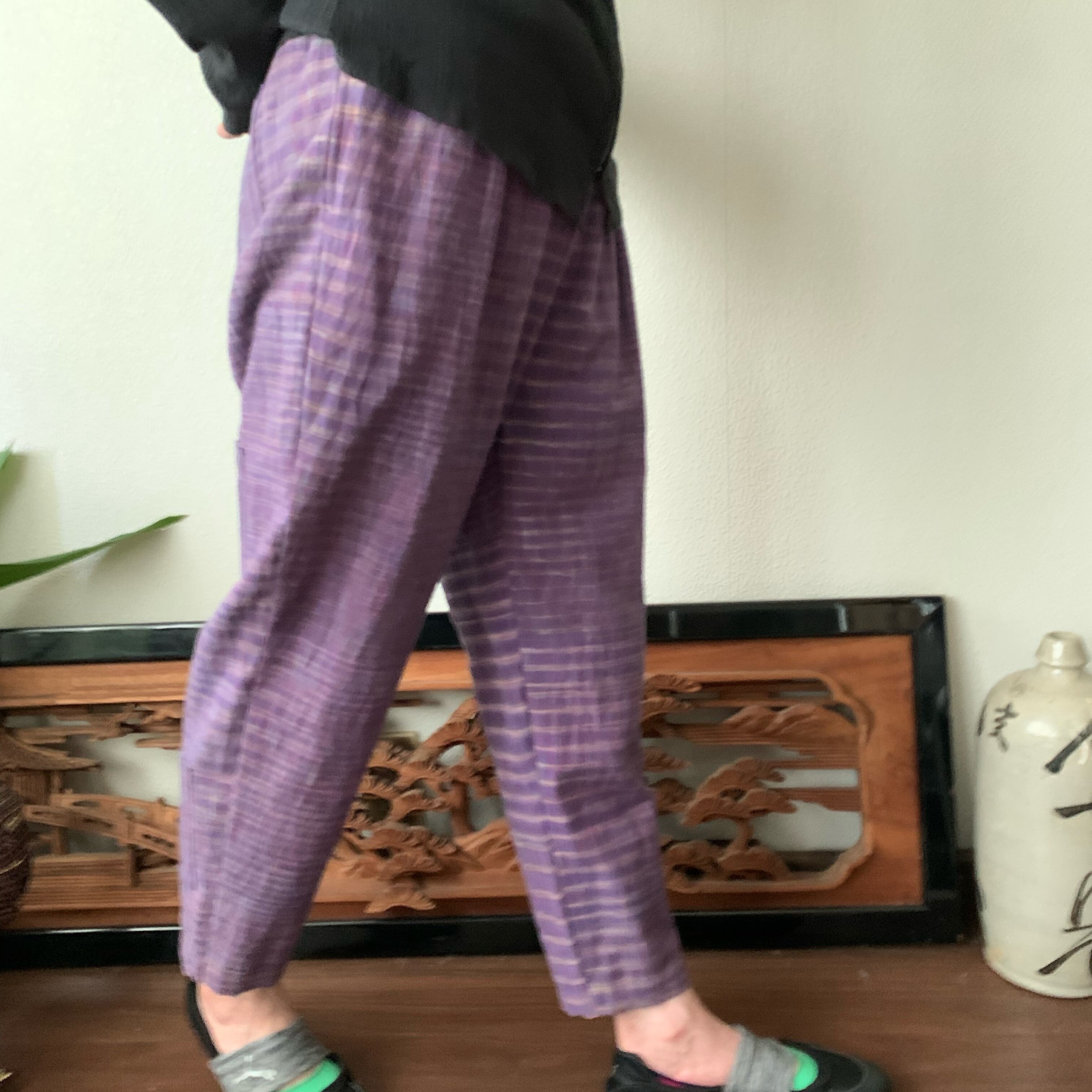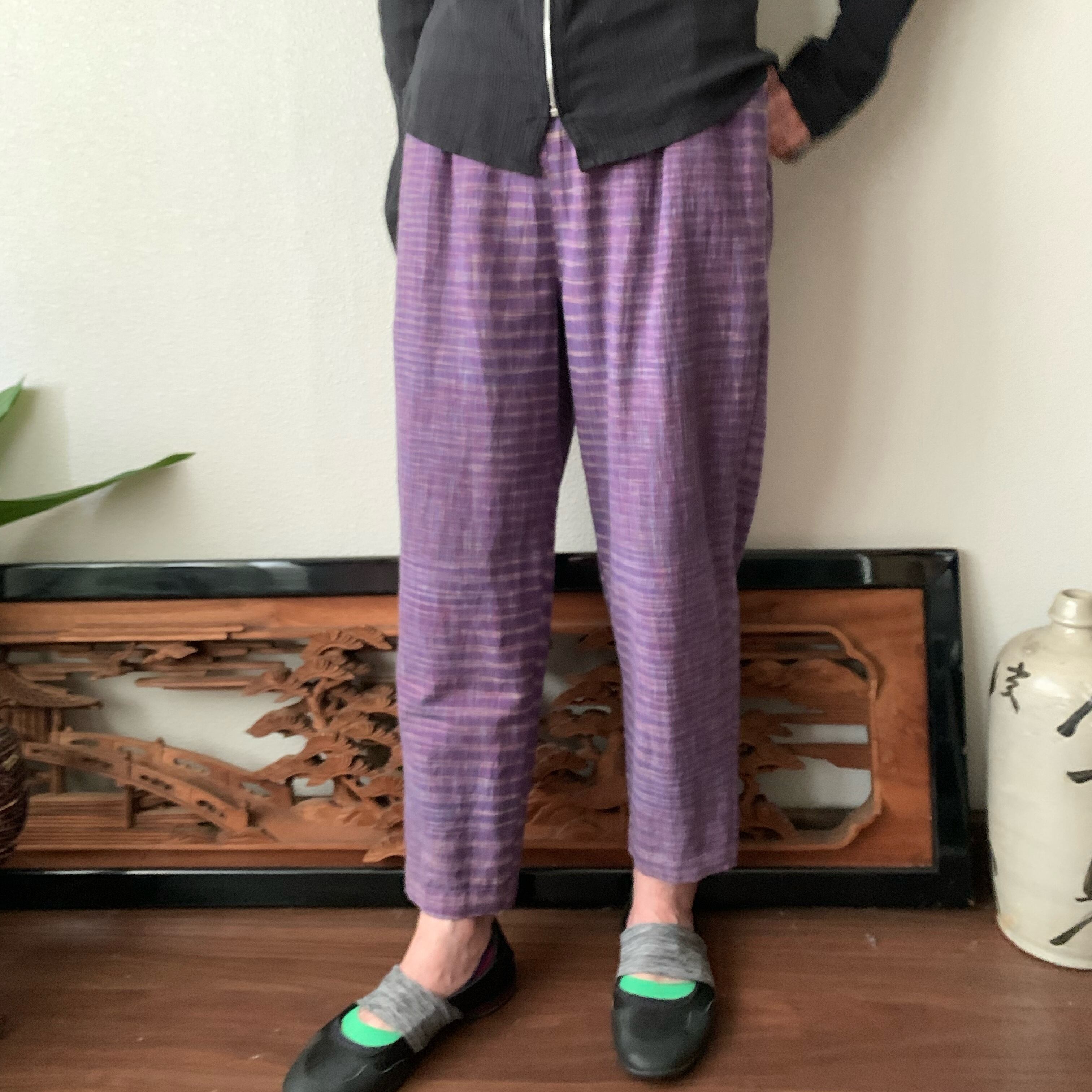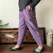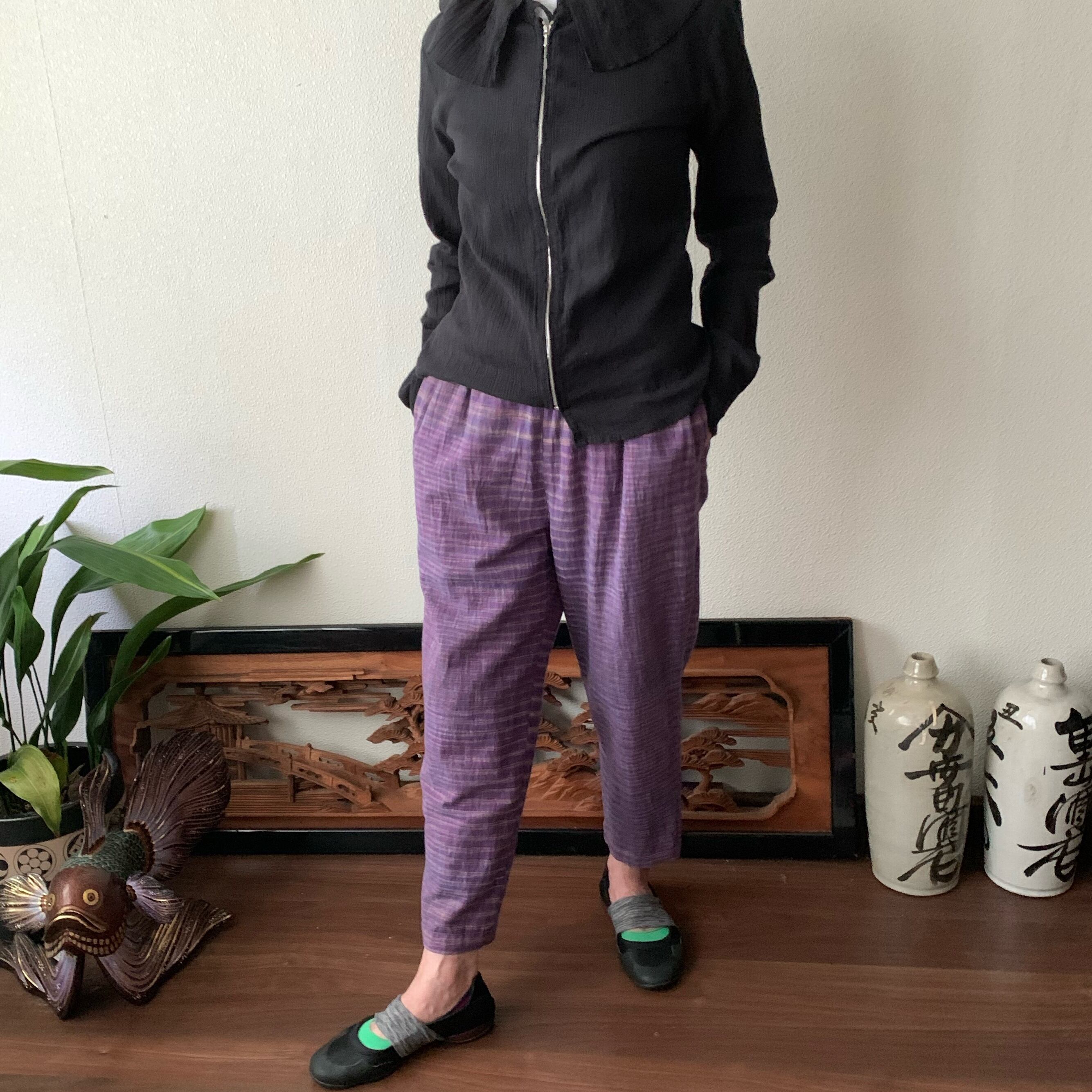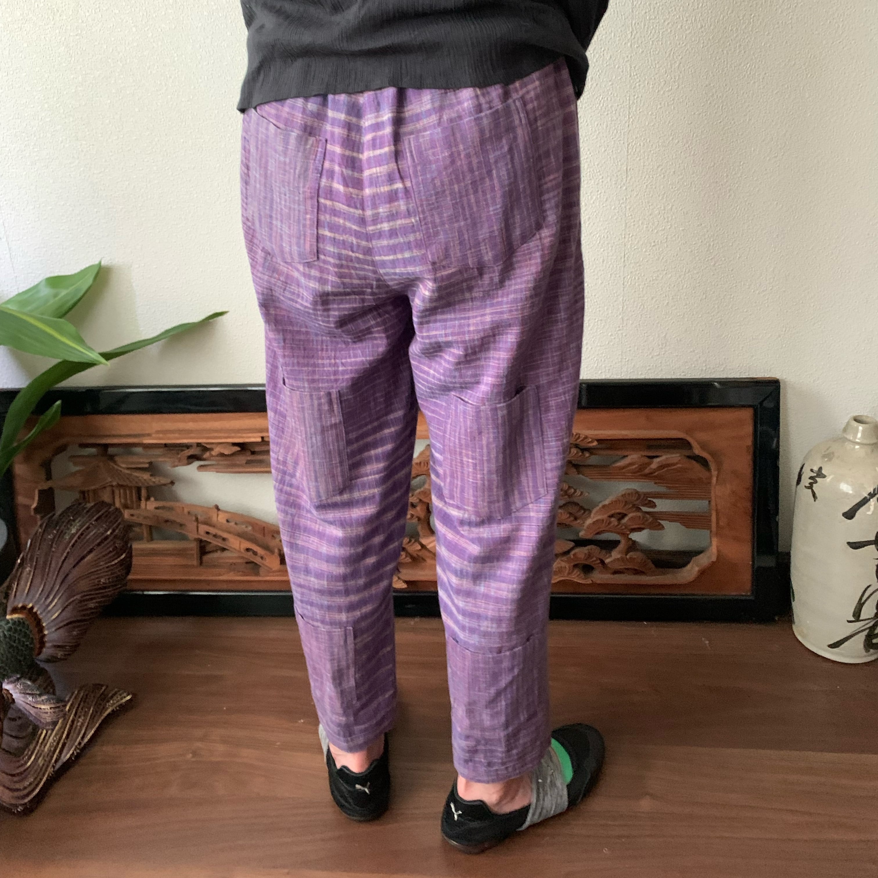 シンプル!いえいえ後ろはポケット縦3つですっきりです手織り綿テーパードパンツ 紫絣