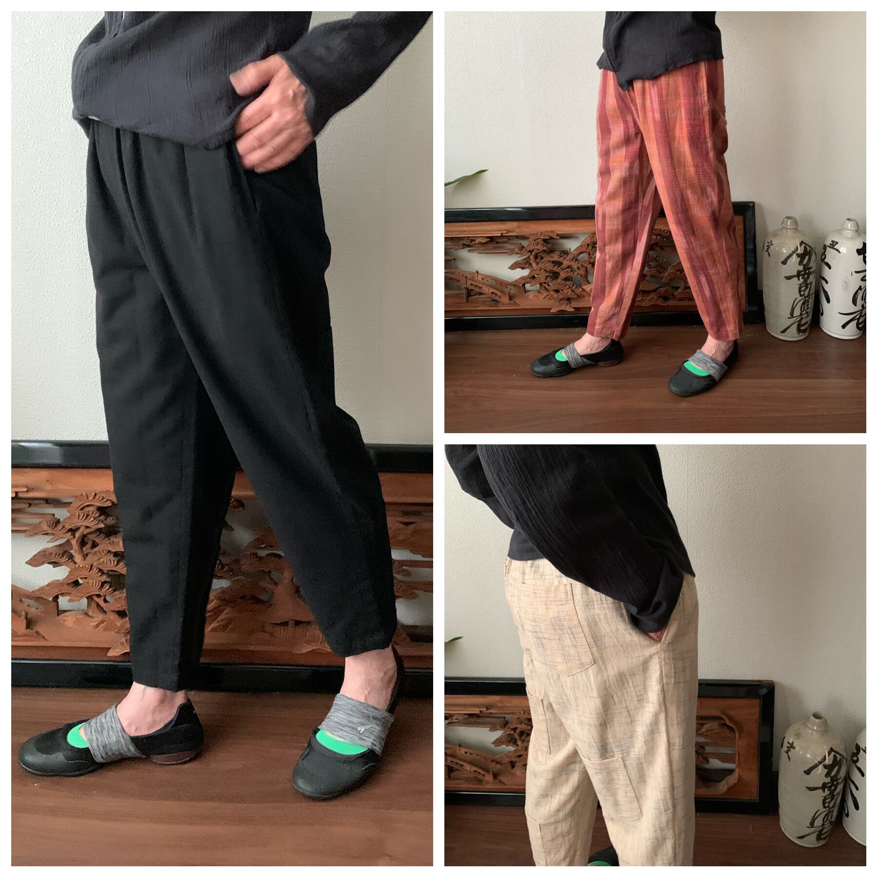 越天楽では珍しいテーパード型(裾に向かって細くなっていいきます。太ももは少しゆったりしています)のパンツです。