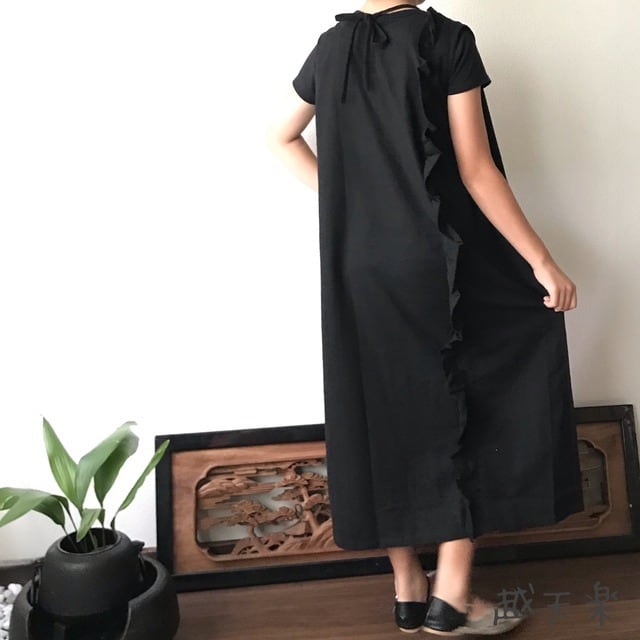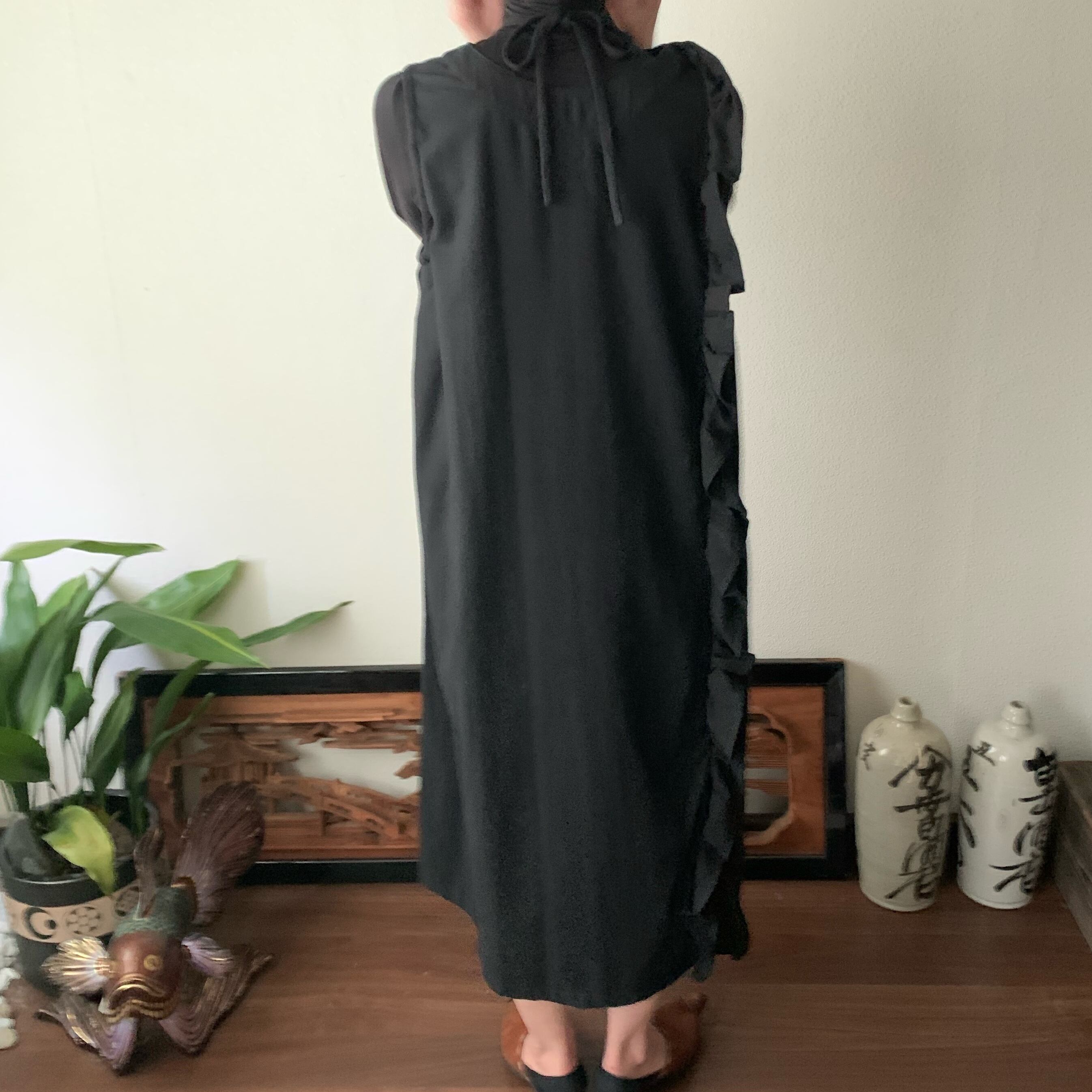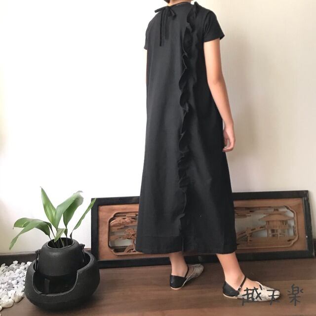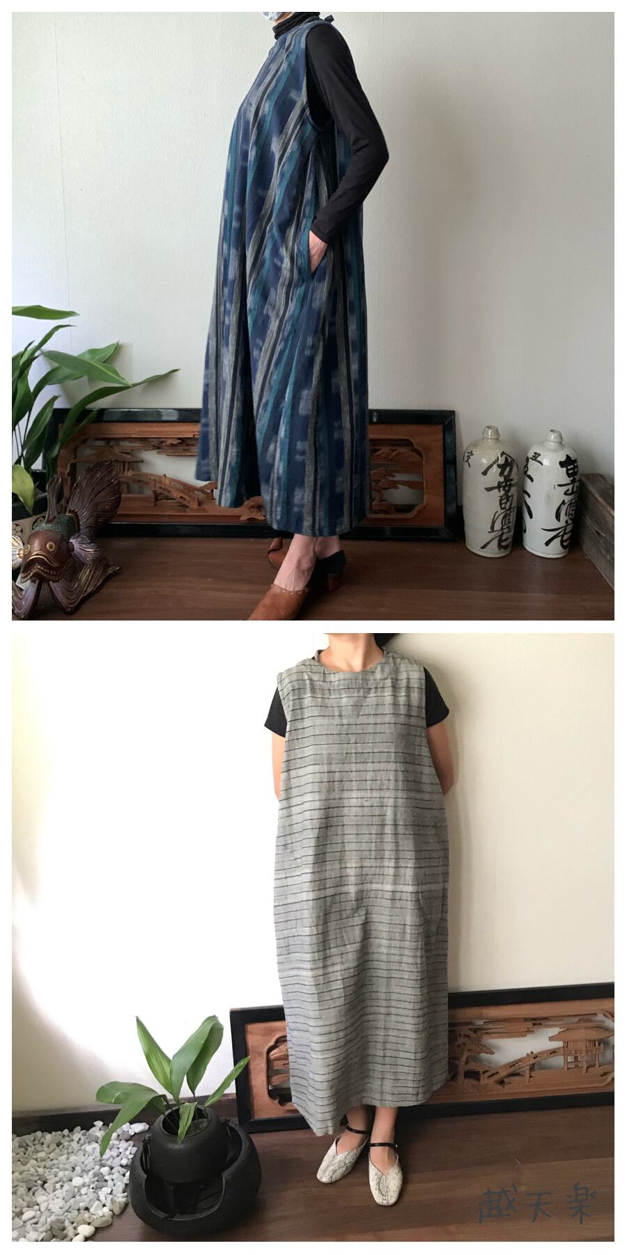 前から見ると何の変哲もないシンプルな手織り綿のワンピースですが、後ろを見ると右半分の上から下に人魚姫のようなフリルがあって、越天楽らしいバックシャンのワンピースです。