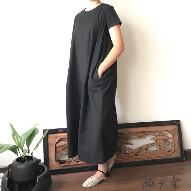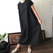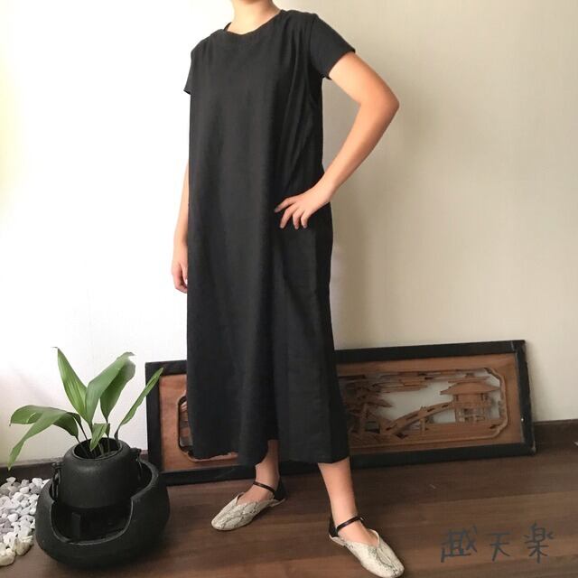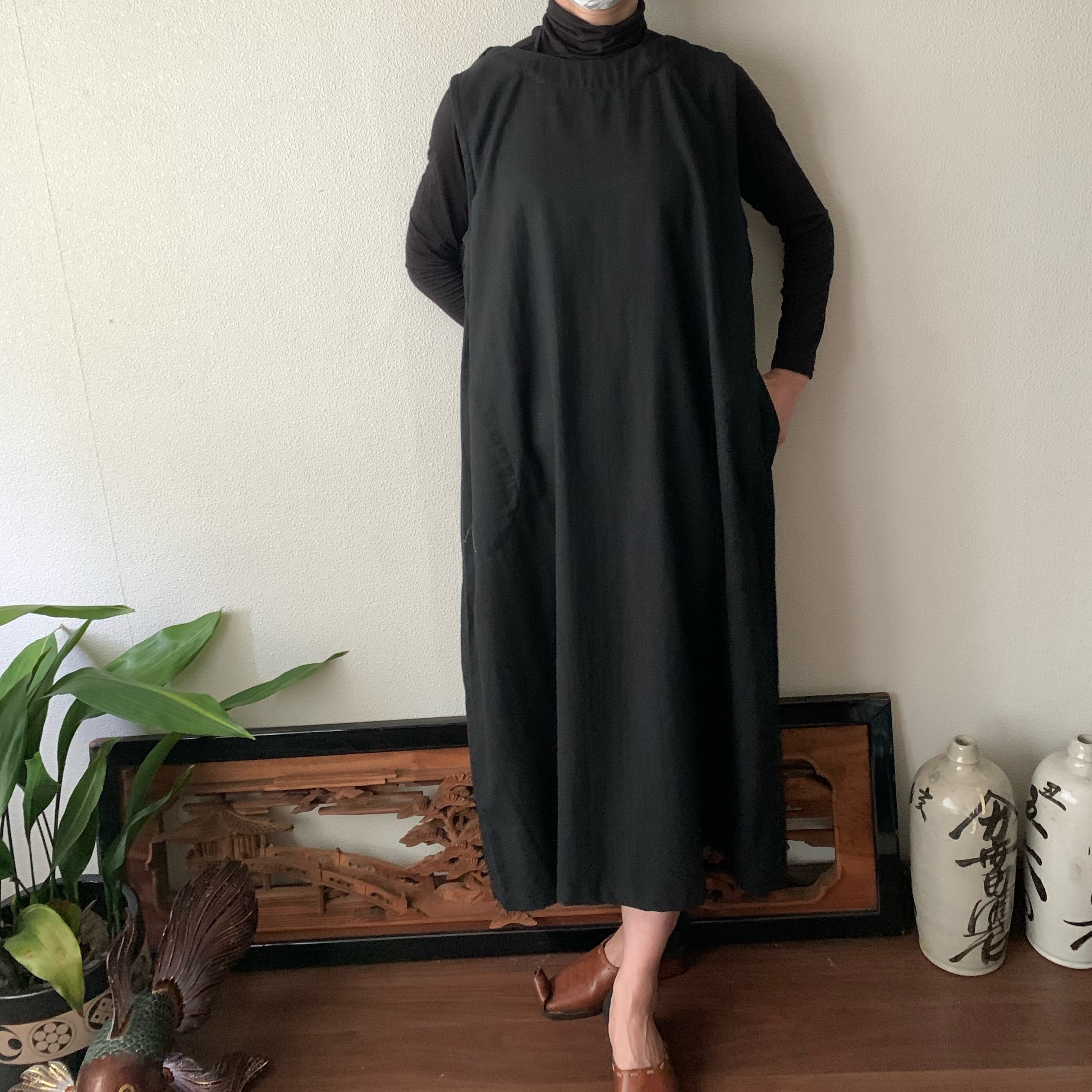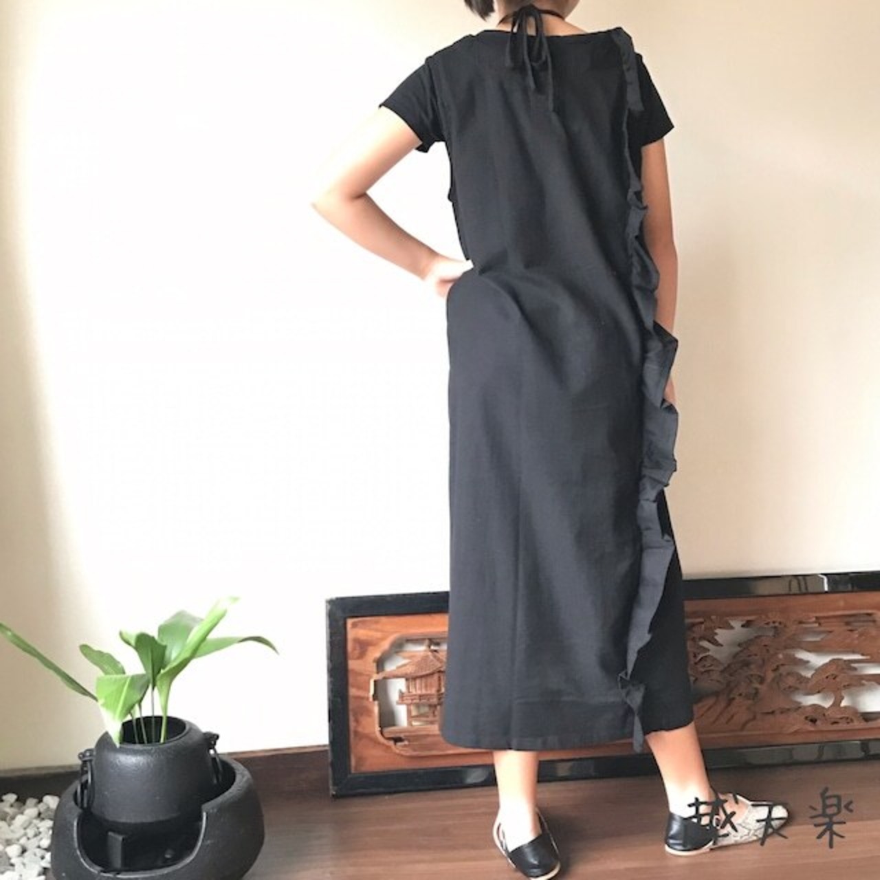 前から見ると何の変哲もないシンプルな手織り綿のワンピースですが、後ろを見ると右半分の上から下に人魚姫のようなフリルがあって、越天楽らしいバックシャンのワンピースです。