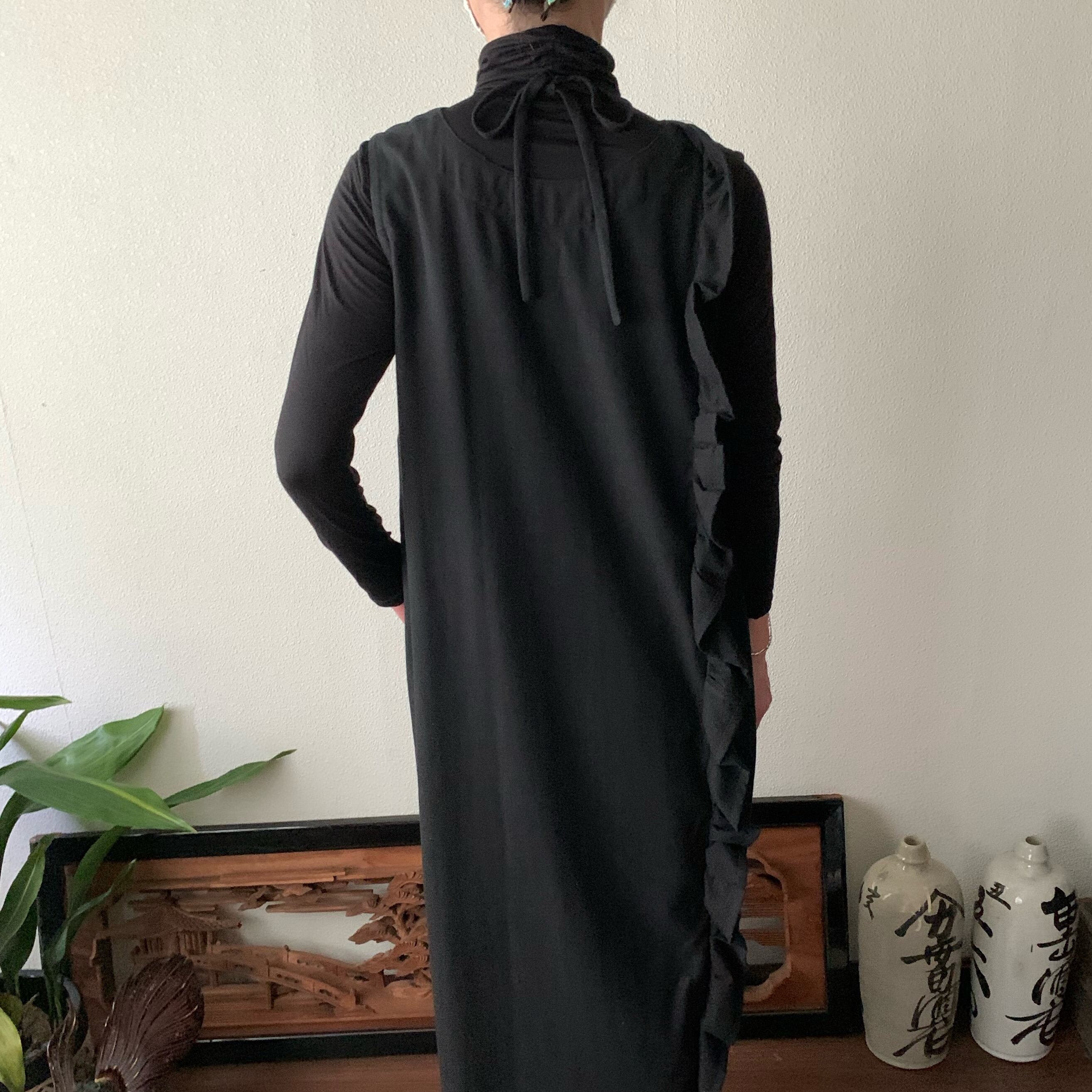 『ロング丈のシンプルノースリーブの前部分、上下の走る波フリルとネック紐リボンの後ろ部分がエレガントなバックシャン手織り綿ワンピース』