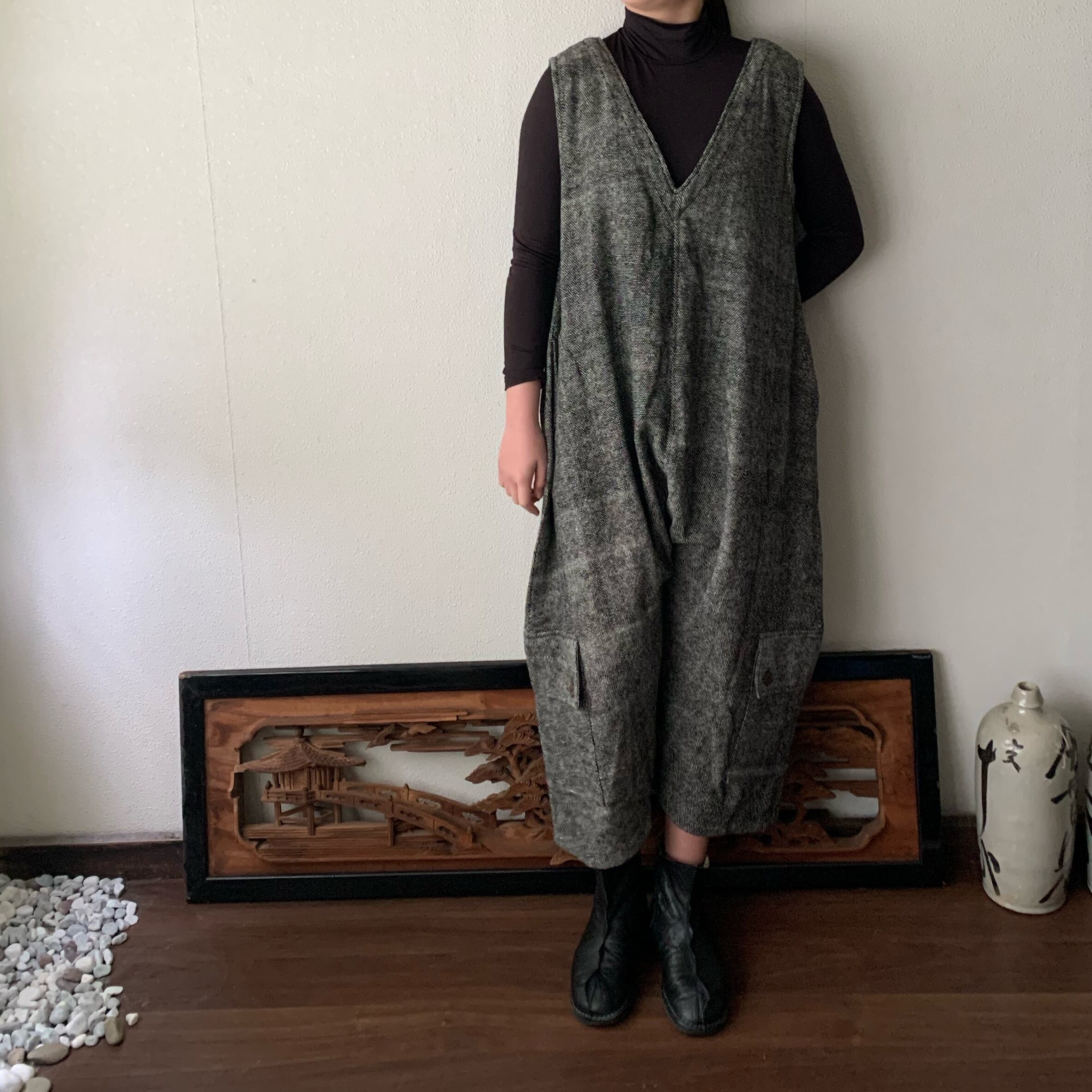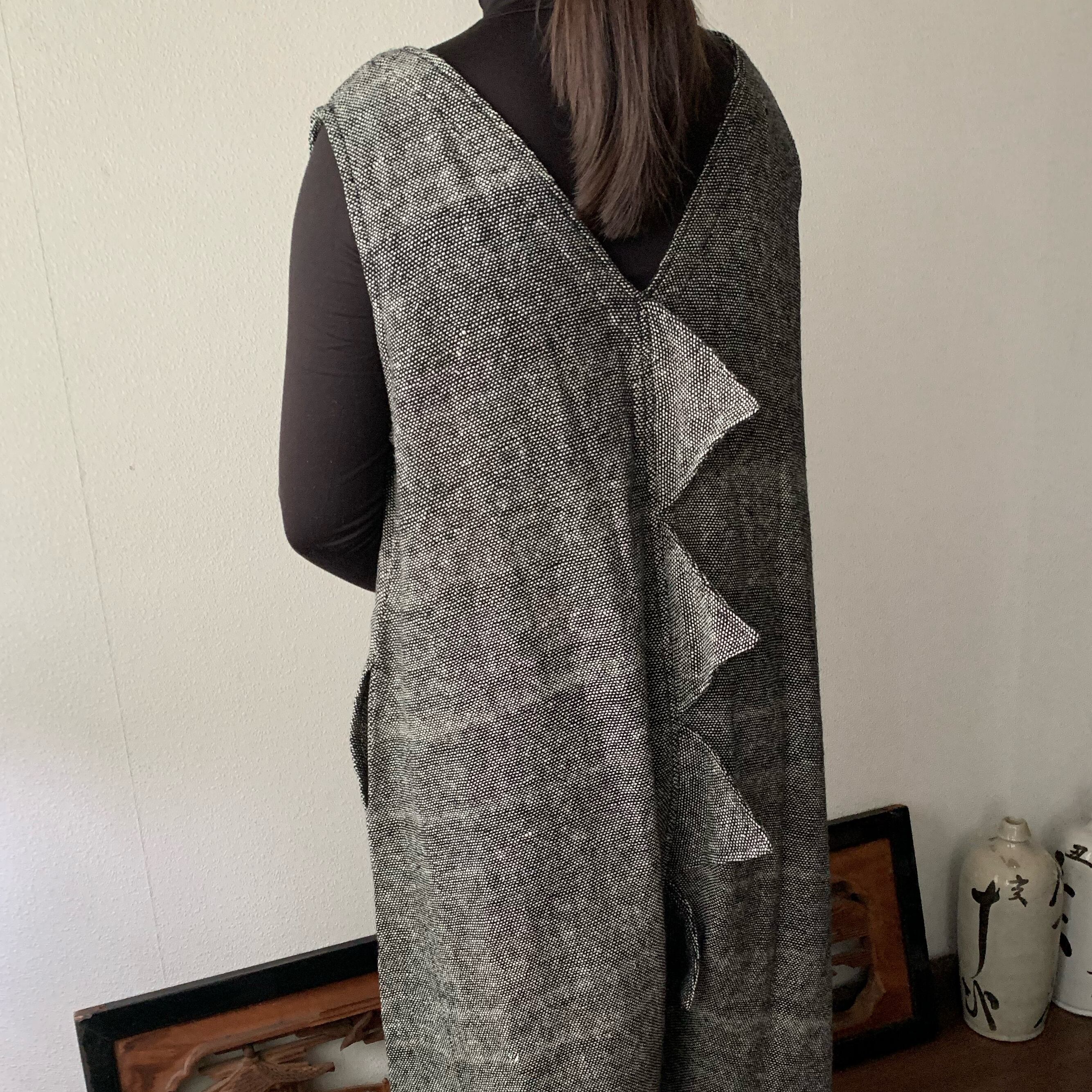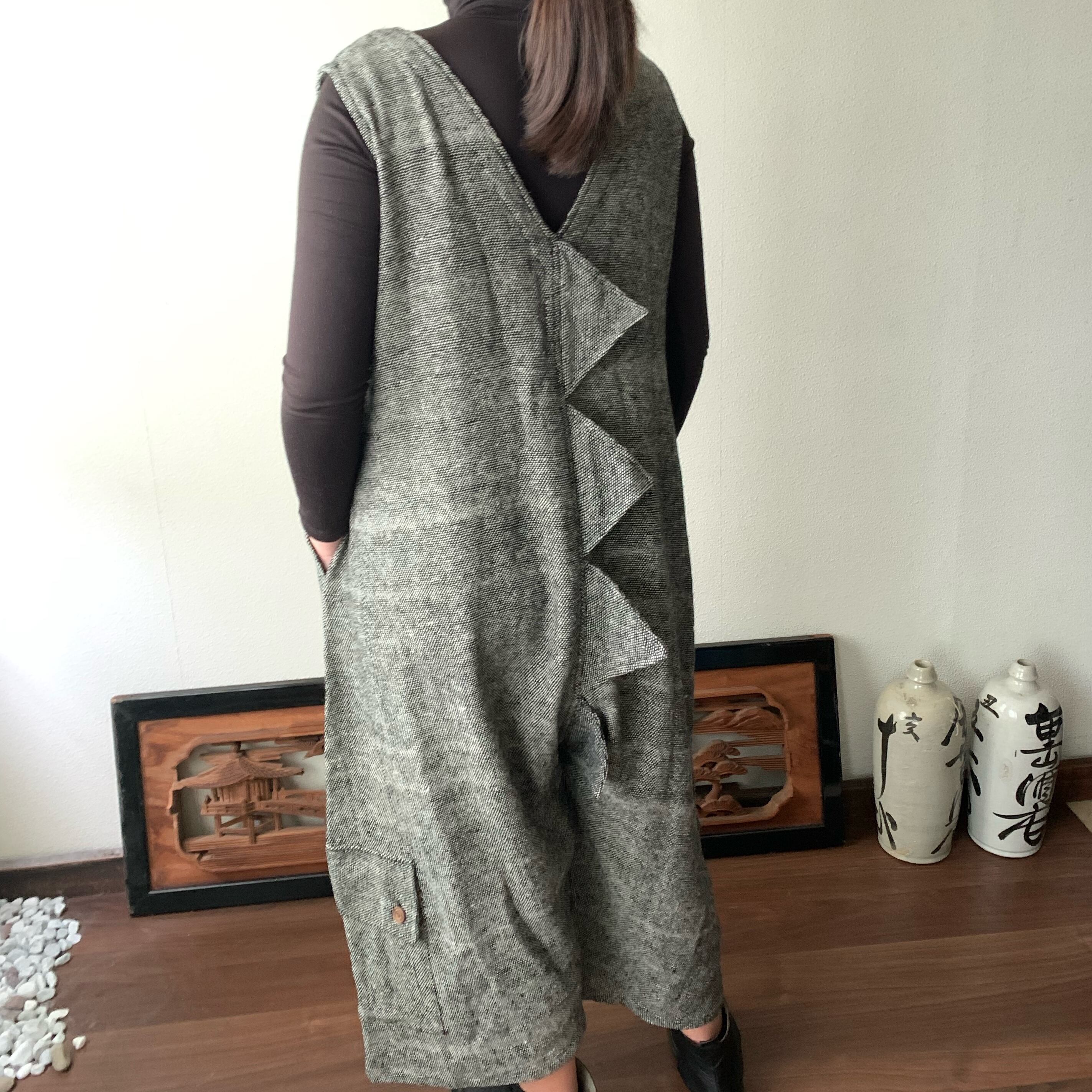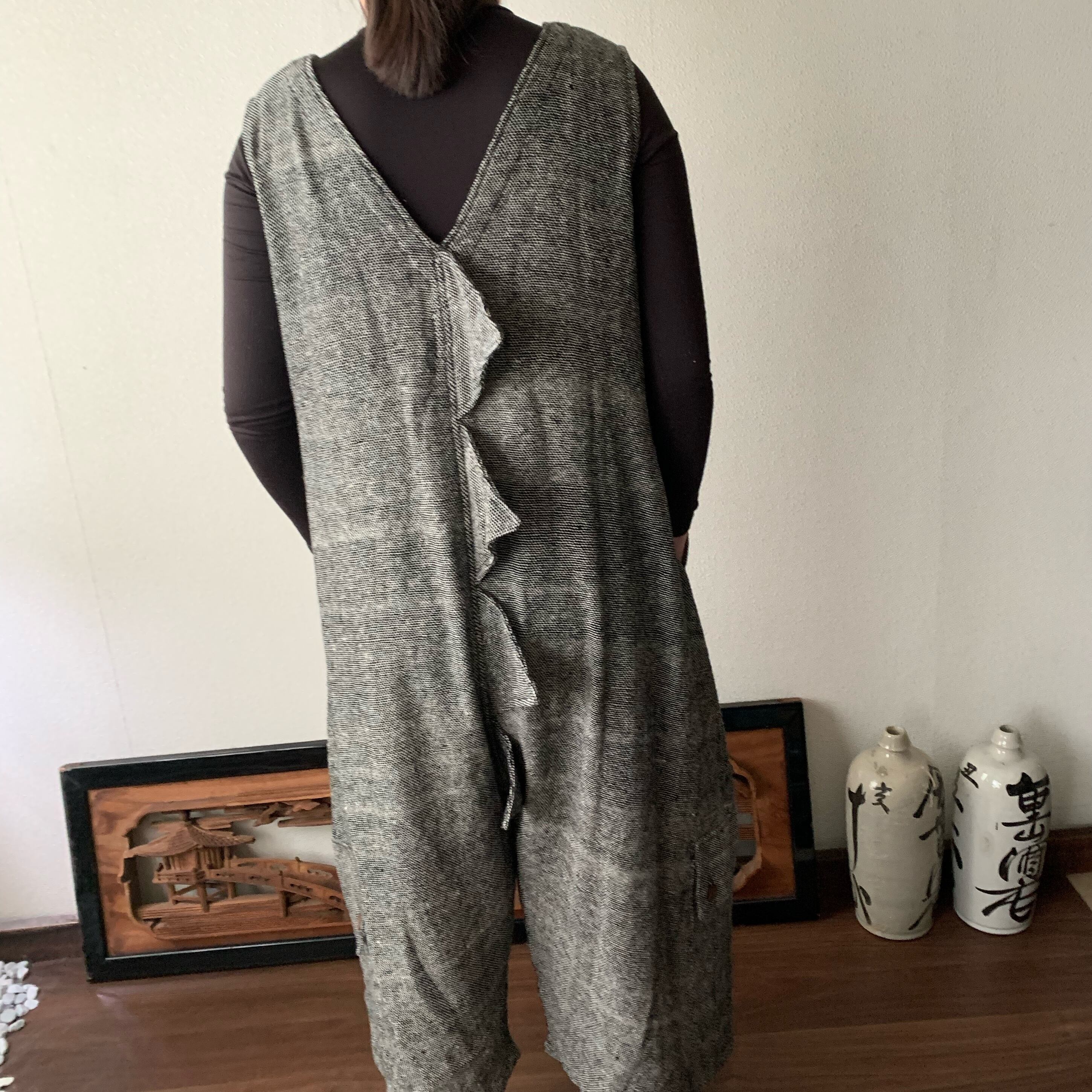えっ。?ゆったり手織り綿サロペットだけどバックに恐竜の背びれ? 遊び心たっぷりで思わず後ろを向きたくなる グレイ絣