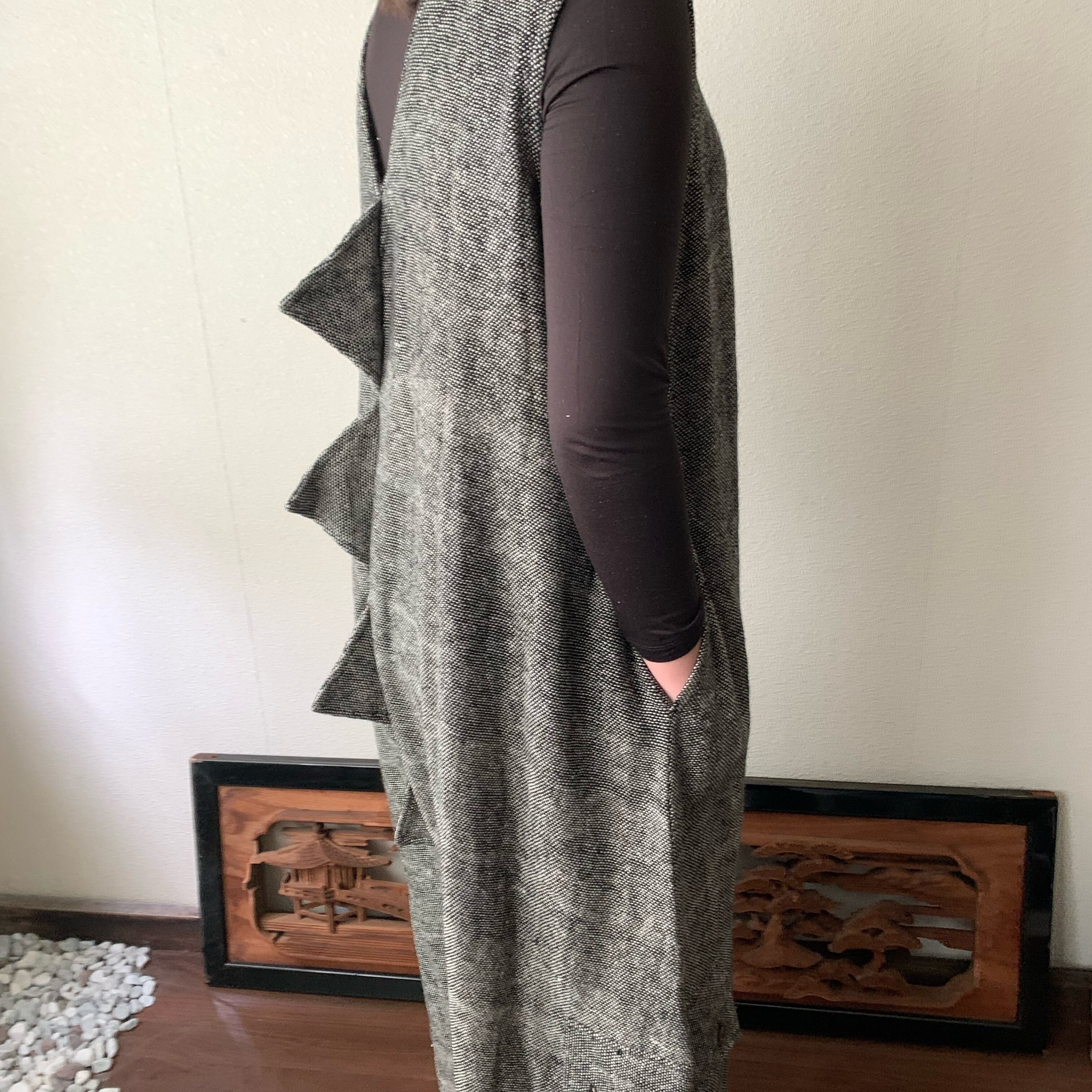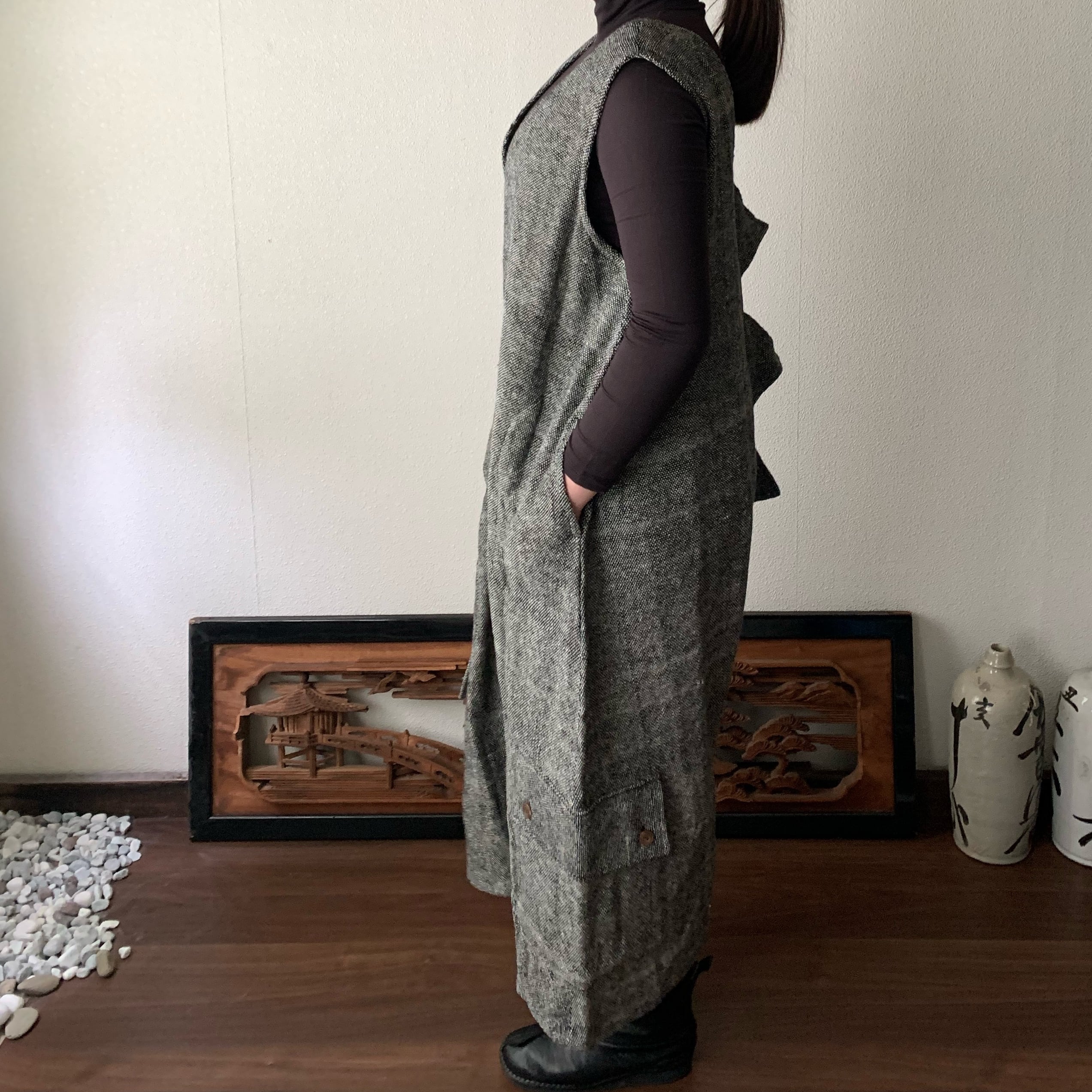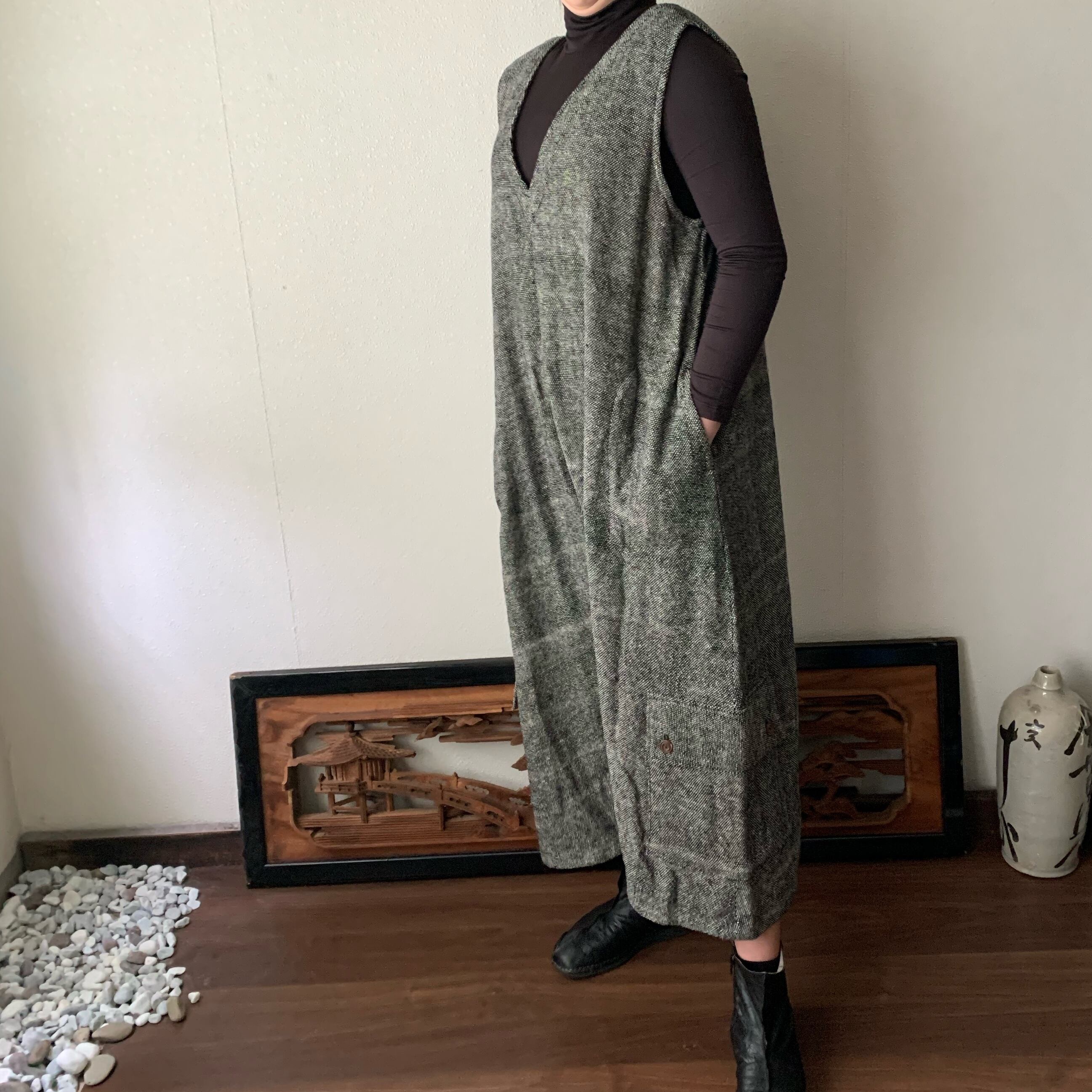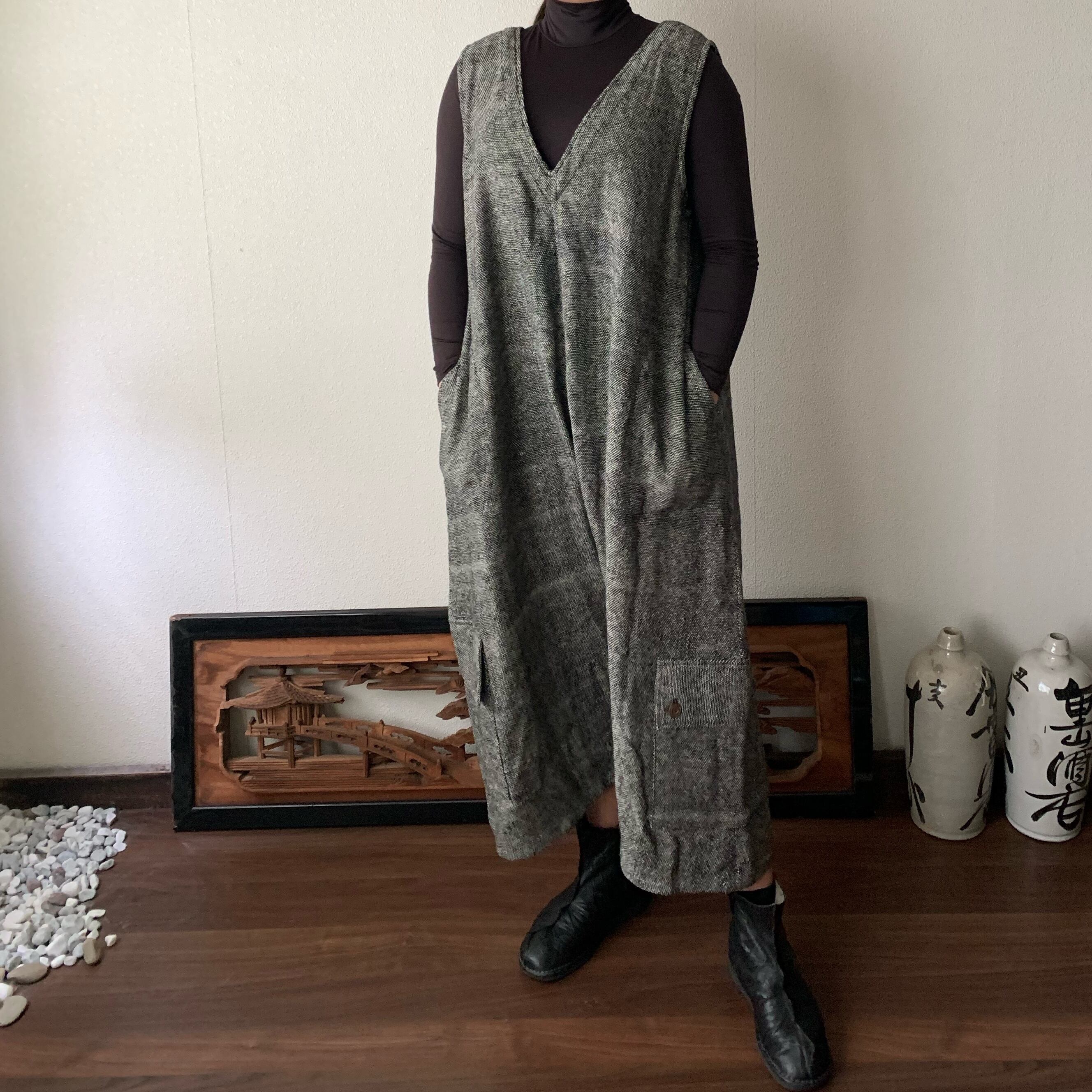 えっ。?ゆったり手織り綿サロペットだけどバックに恐竜の背びれ? 遊び心たっぷりで思わず後ろを向きたくなる グレイ絣