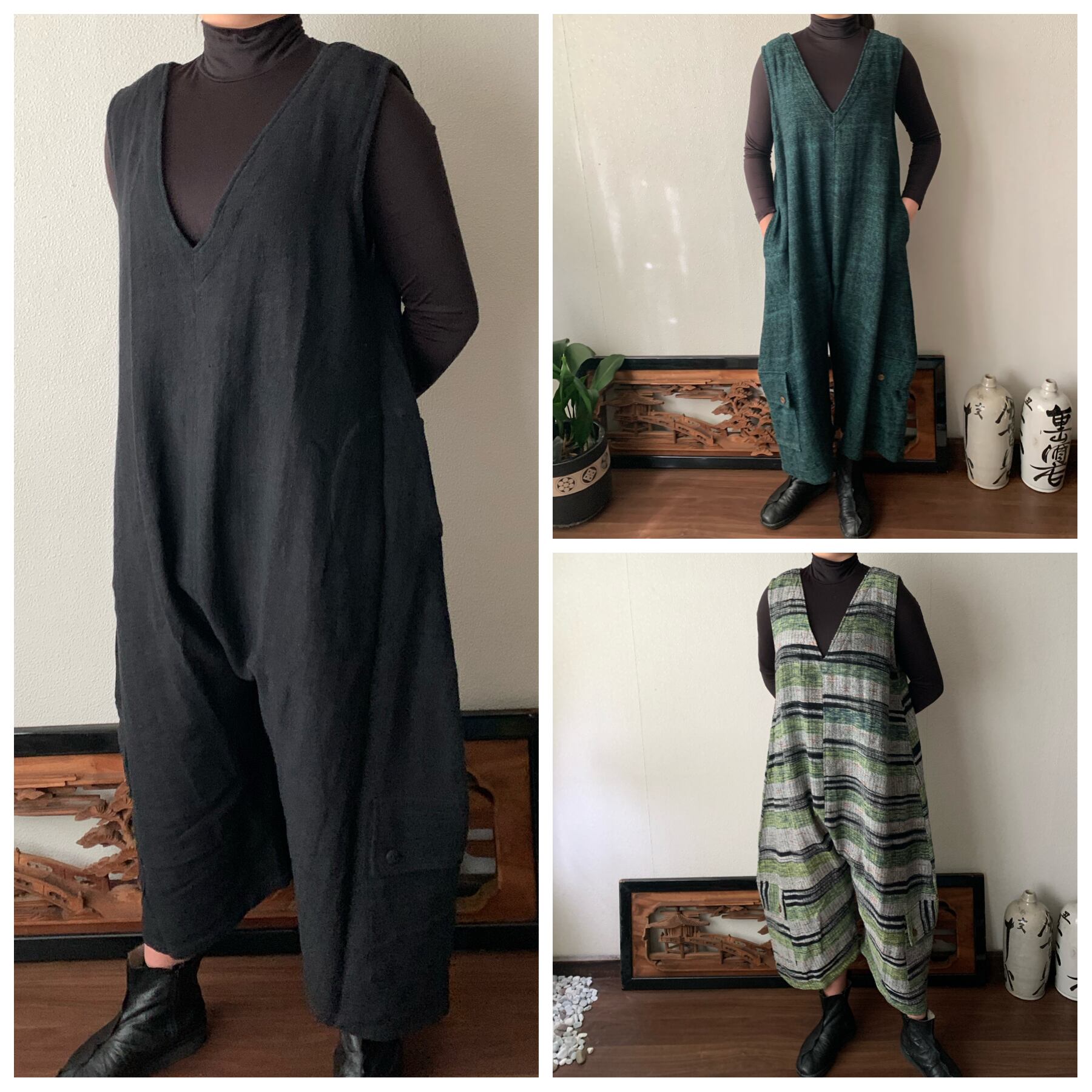 ゆったりと長めの丈ですっきり着こなせる手織り綿のサロペットです。