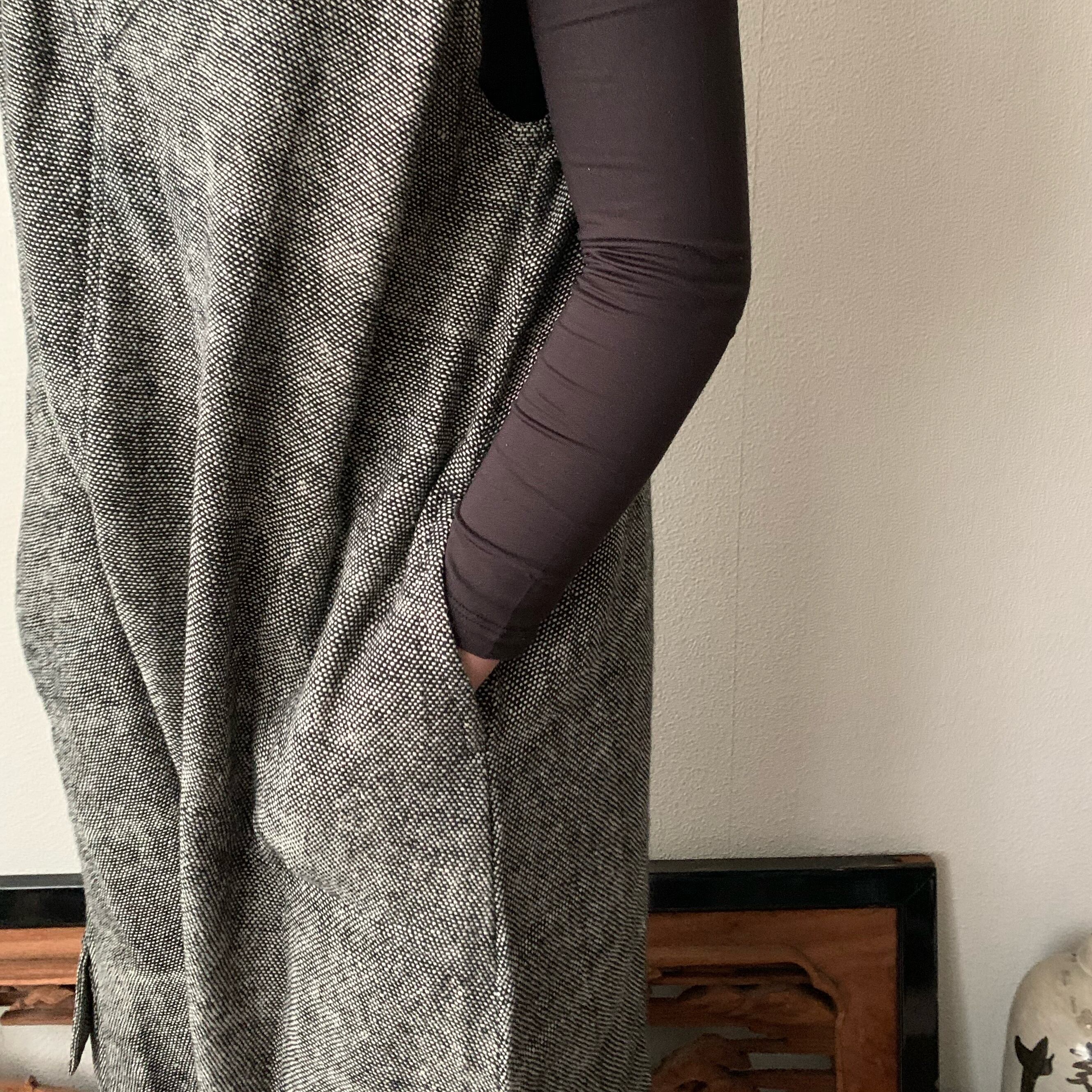 ゆったりと身巾を取り両裾にデザインポケットをつけています。