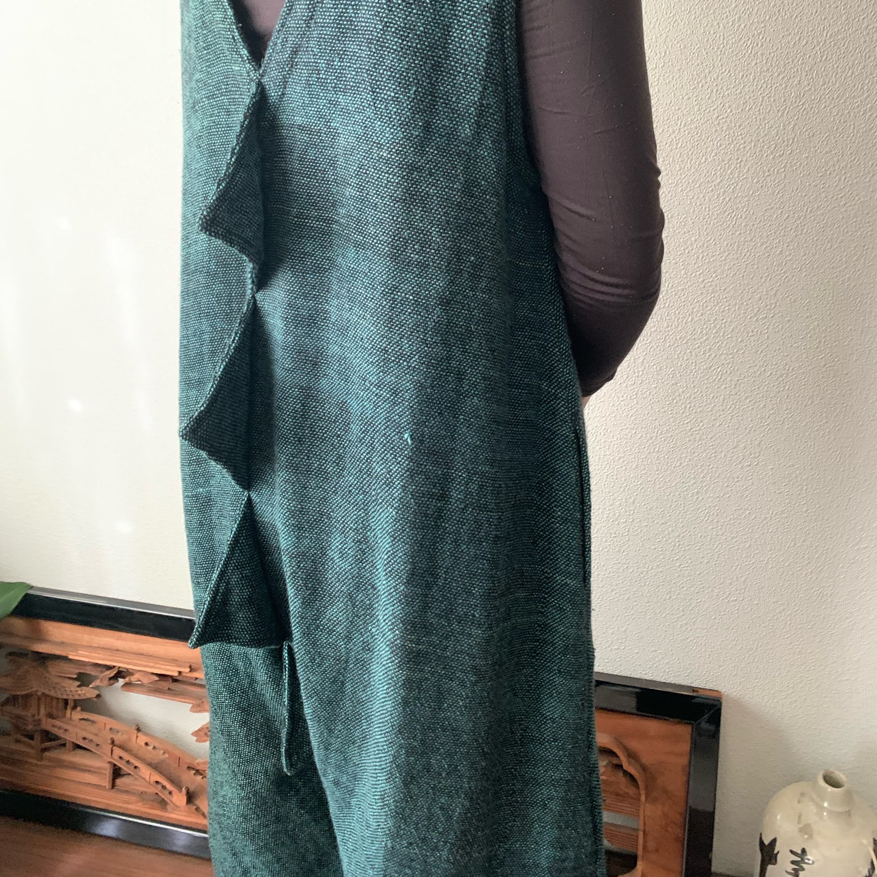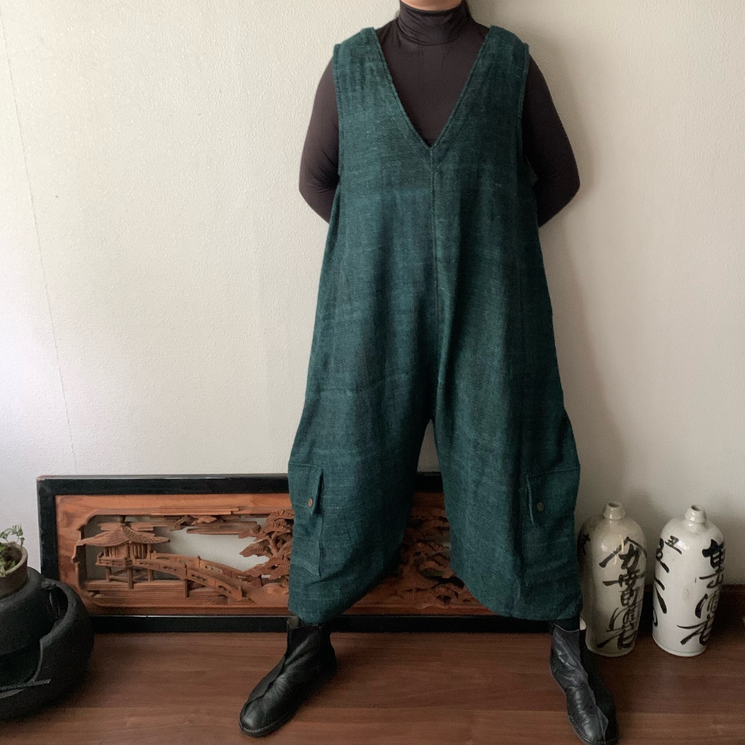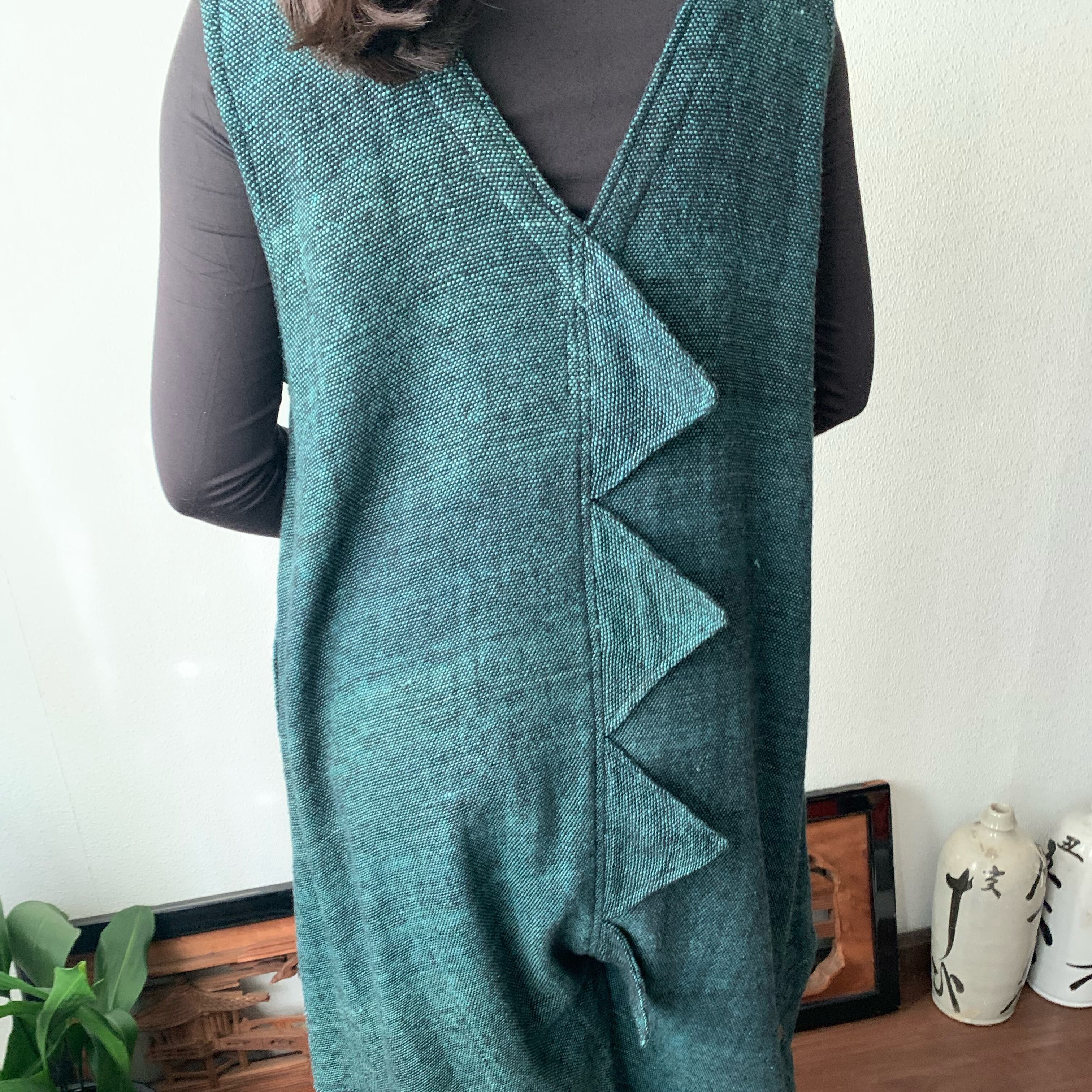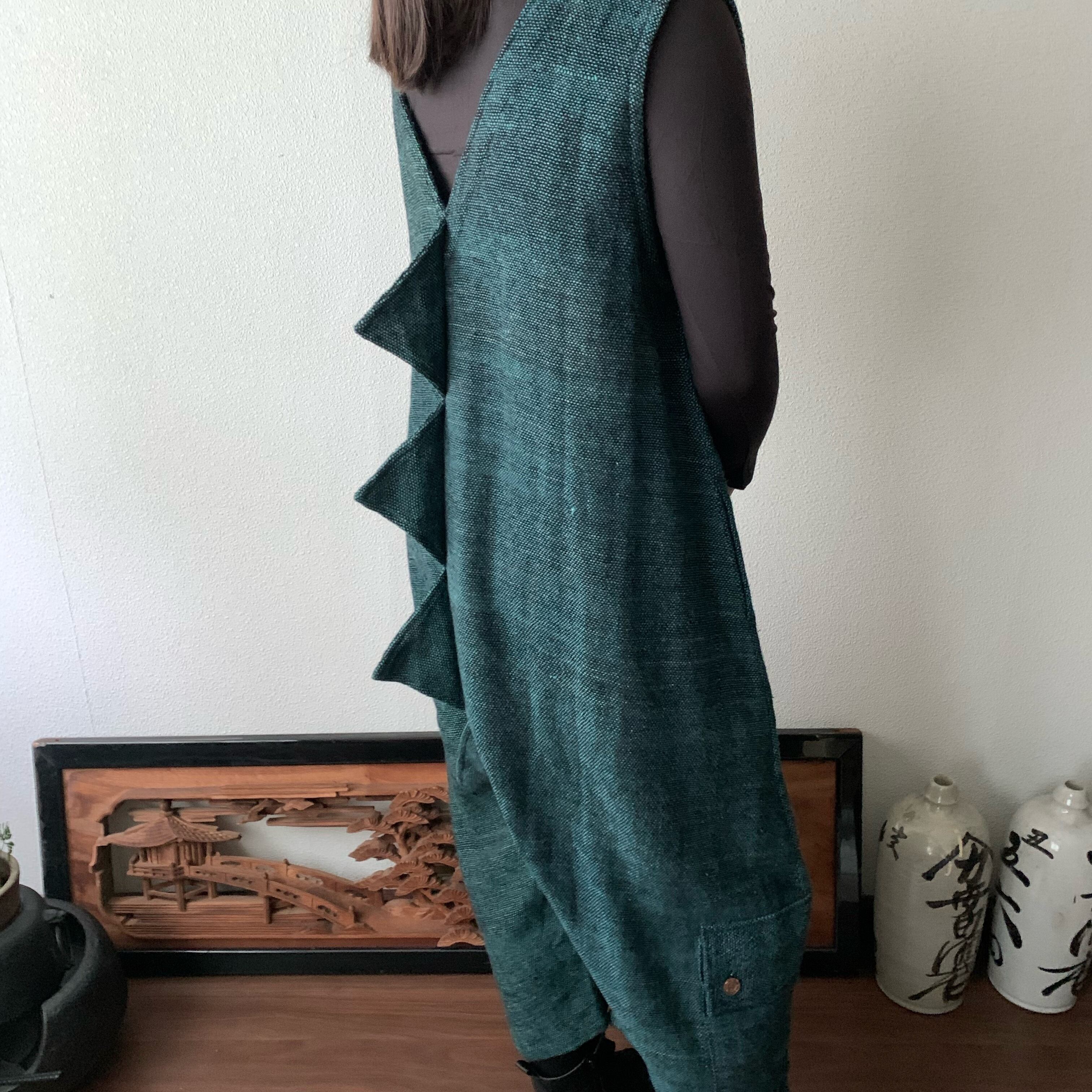 えっ。?ゆったり手織り綿サロペットだけどバックに恐竜の背びれ? 遊び心たっぷりで思わず後ろを向きたくなる 深緑絣